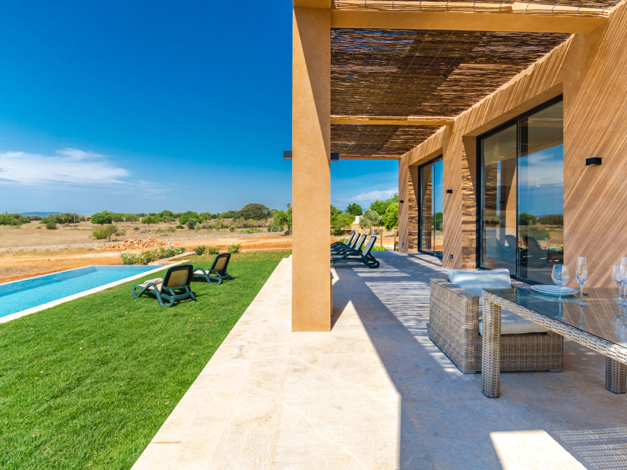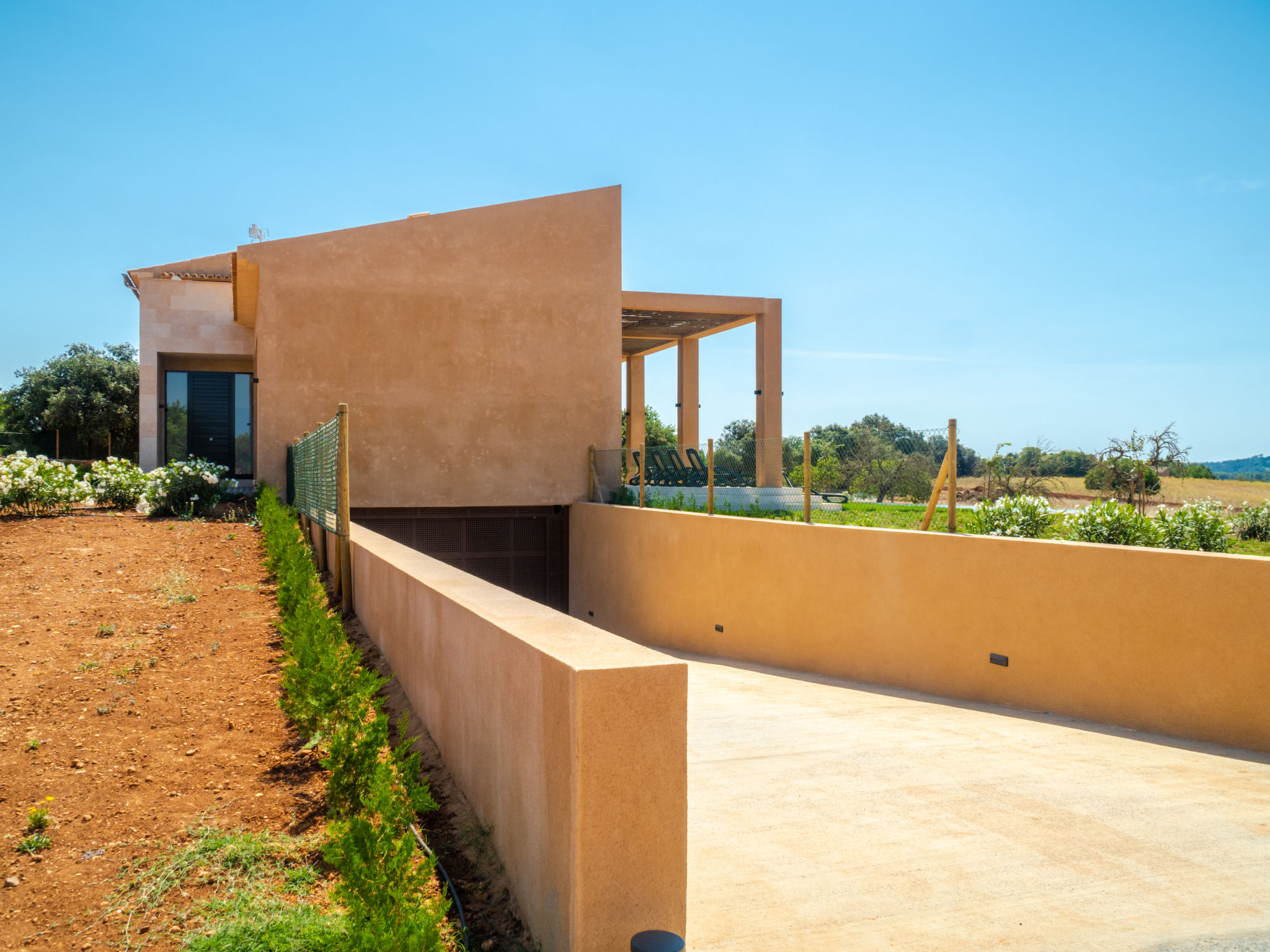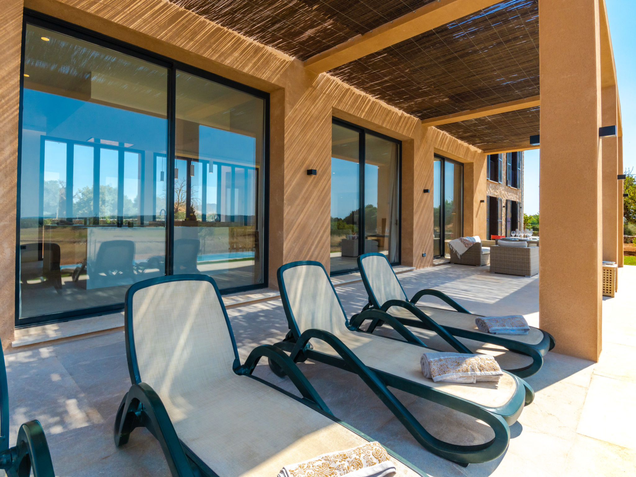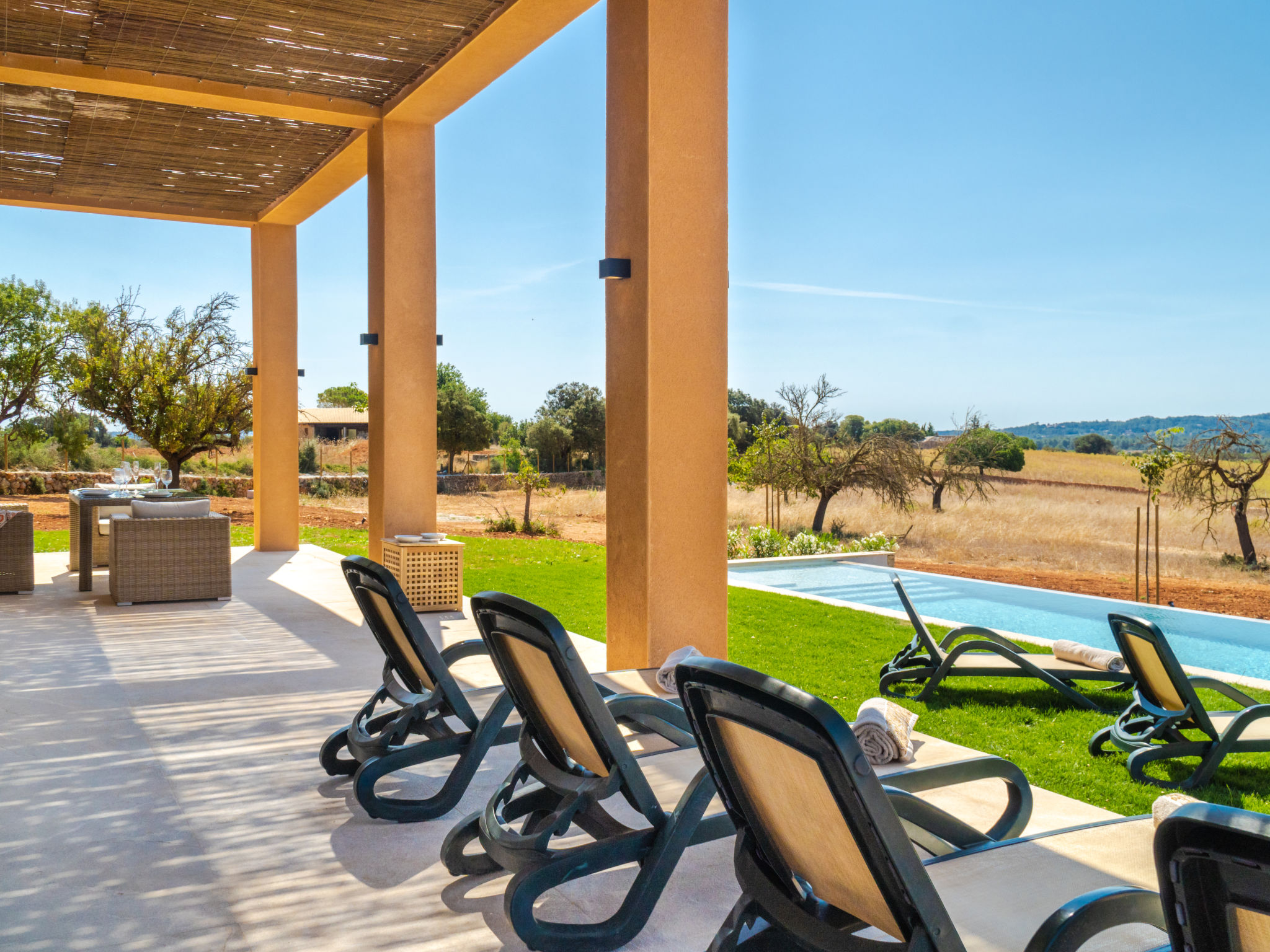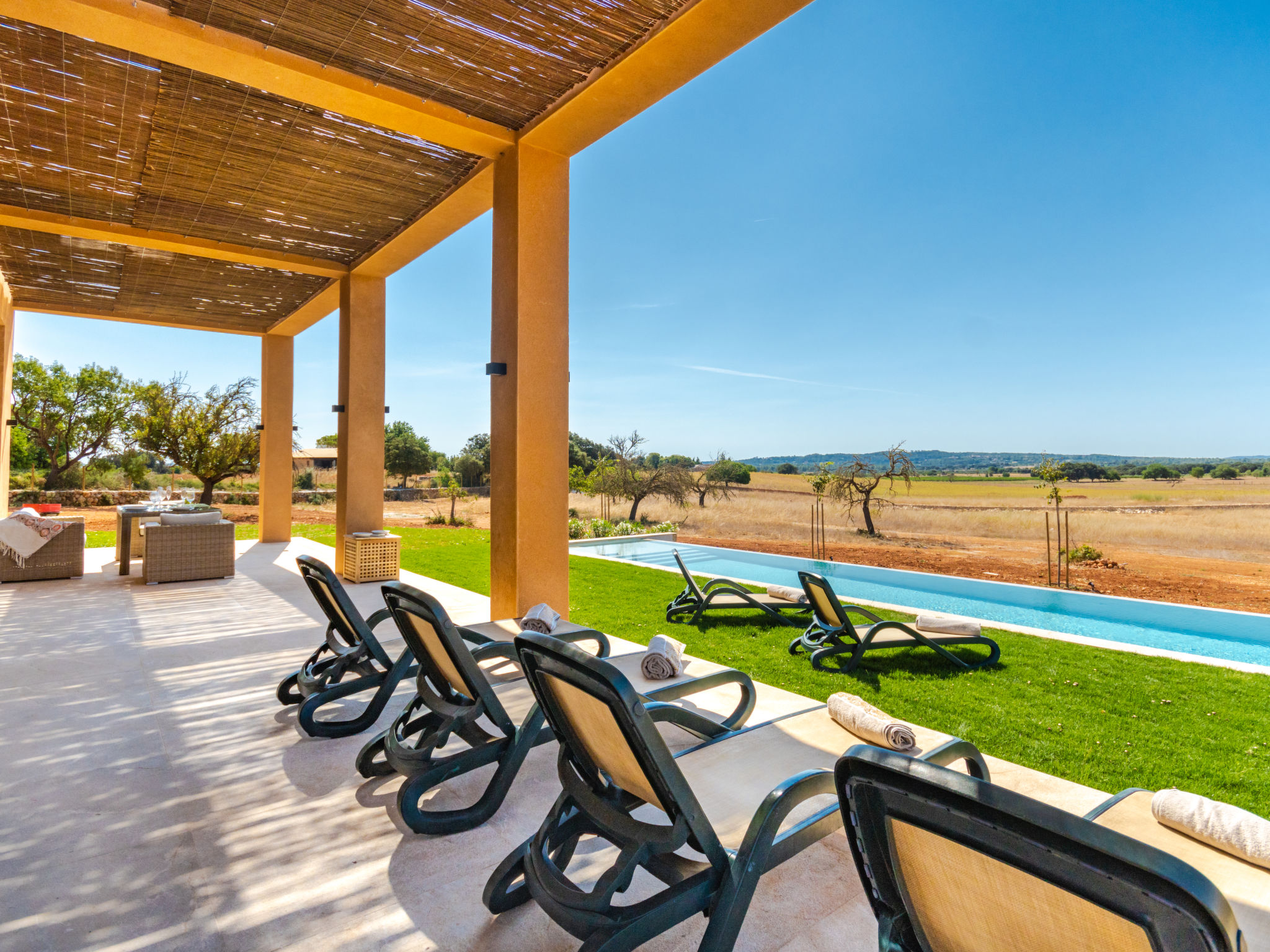 Sehr grosse, sehr moderne Villa "Can Navarro", auf 2 Stockwerken, umgeben von Feldern und Weinbergen. Ausserhalb des Ortes, 4.5 km vom Zentrum von Inca, ruhige, sonnige Lage, 500 m vom Waldrand, 25 km vom Meer, 25 km vom Strand, im Grünen. Zur Alleinbenutzung: naturbelassenes Grundstück, Garten mit Rasen und Pflanzen, Wiese, Schwimmbad eckig (14 x 4 m, 160 cm tief, 01.01.-31.12.) mit Salzelektrolyse-Reinigungssystem. Aussendusche, Sitzplatz, Laube, Pergola, Gartenmöbel, Grill. Im Hause: Internetzugang, Wireless LAN, Einstellraum für Fahrräder, Zentralheizung, Klimaanlage, Waschmaschine, Trockenraum. 100 m lange holprige Zufahrt bis zum Haus. Parkplatz beim Haus auf dem Grundstück. Einkaufsgeschäft 4.5 km, Lebensmittelgeschäft 4.5 km, Supermarkt 4.5 km, Einkaufszentrum 15 km, Restaurant 4 km, Bar 3.8 km, Bäckerei 4.2 km, Zentrum zu Fuss in 60 Minuten erreichbar, Bushaltestelle 4 km, Bahnstation 4.8 km, Fähre 26 km, Sandstrand "Playa de Muro - Port Alcudia" 25 km, Steinstrand "Alcúdia" 26 km. Sporthafen 25 km, Jacht-Hafen 25 km, Golfplatz (18 Loch) 29 km. Nahe gelegene Sehenswürdigkeiten: Sineu, Costitx, Sencelles, Llubí, Inca, Mallorca Fashion Outlet & Cinemas 20 km, Ruta Arqueológica Costitx, Lluc-Escorca. Serra Tramuntana, Observatorio Astronómico Costitx. Bitte beachten: Fahrzeug empfohlen. Geeignet für Familien, geeignet für Senioren. Objekt geeignet für 8 Erwachsene Jugendgruppen nur auf Anfrage. Flugplatz 55 km vom Haus. In diesem Haus sind weitere Ferienwohnungen mietbar. Ferienwohnung Ref. ES8200.137.1 befindet sich auf dem gleichen Grundstück. In dieser Anlage zusätzlich mietbar: 1 Haus.