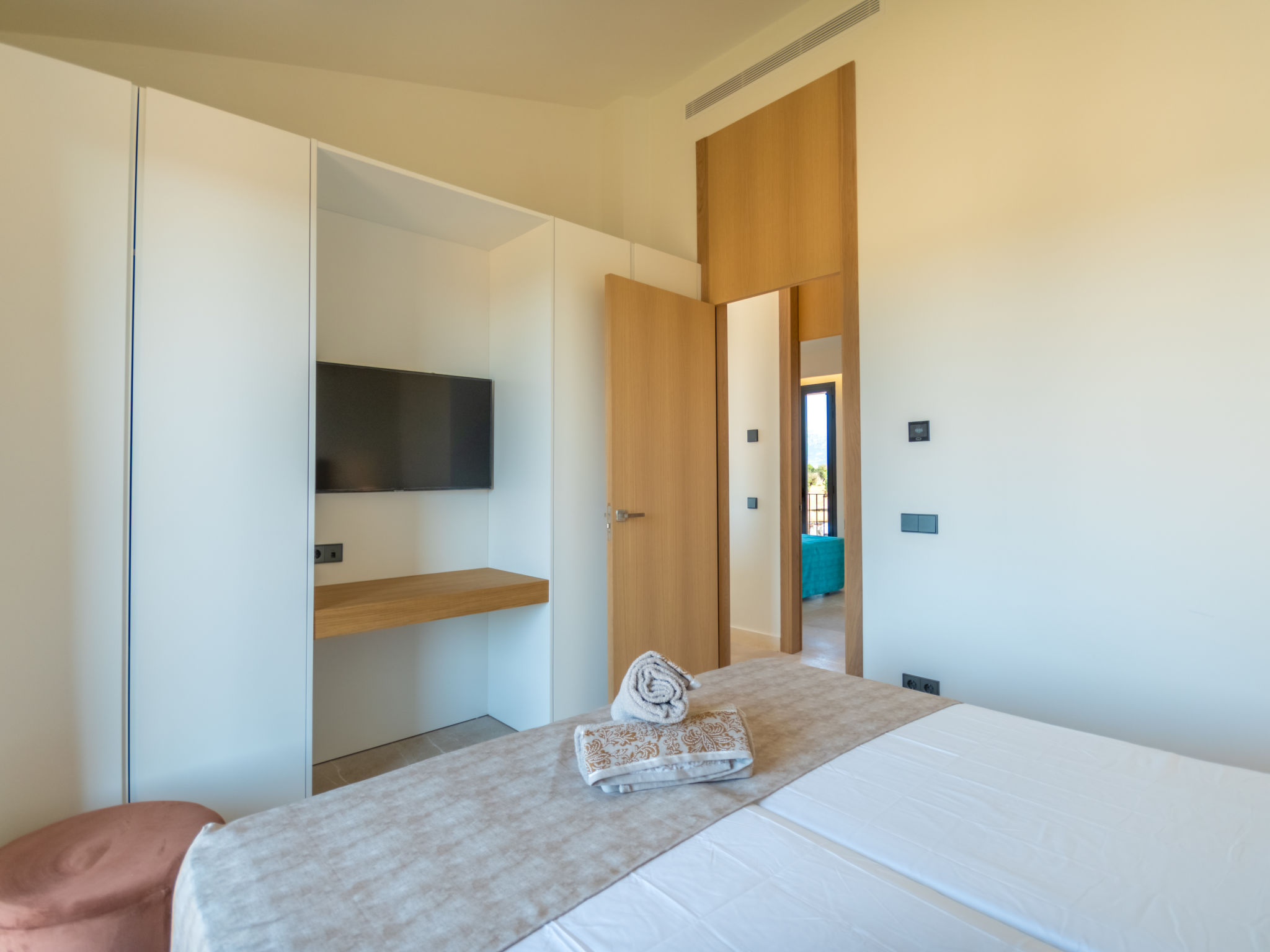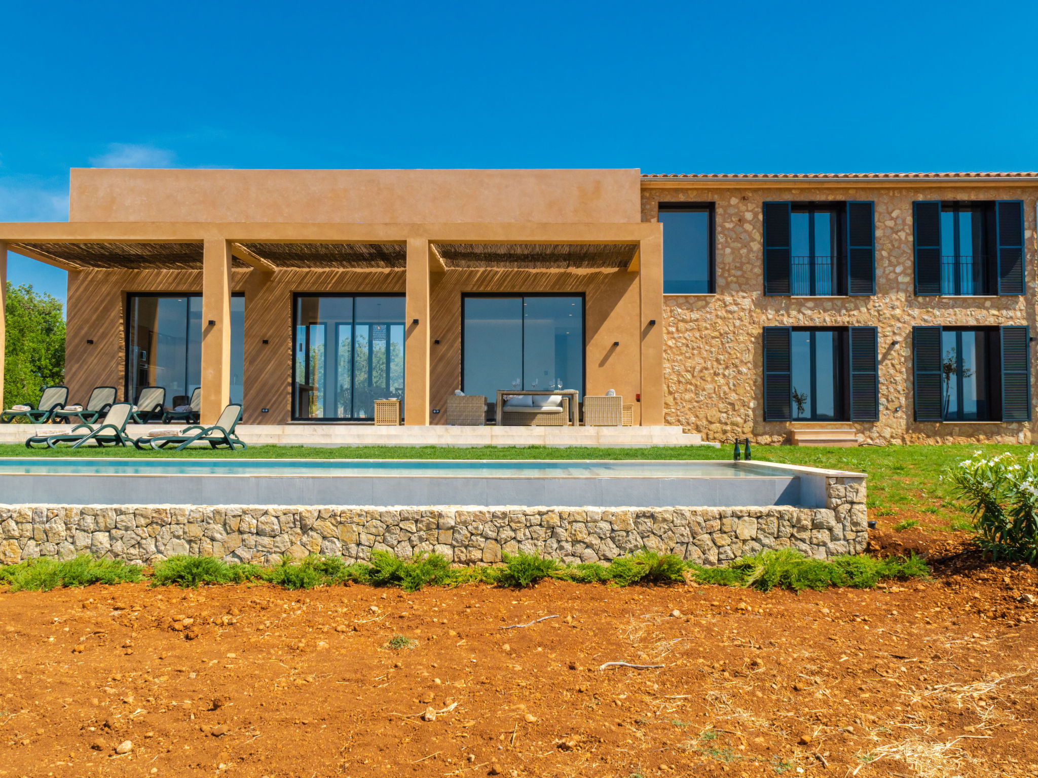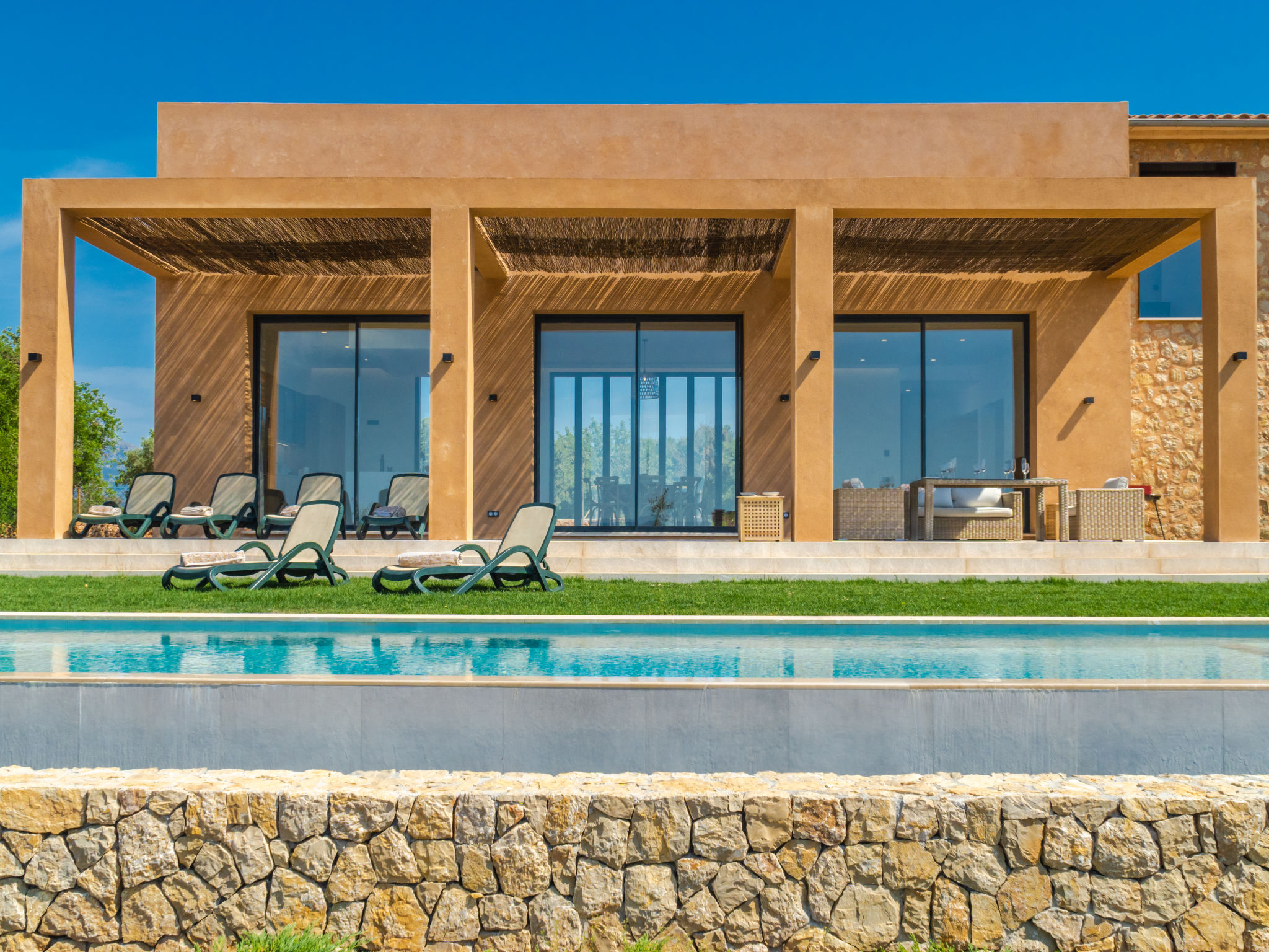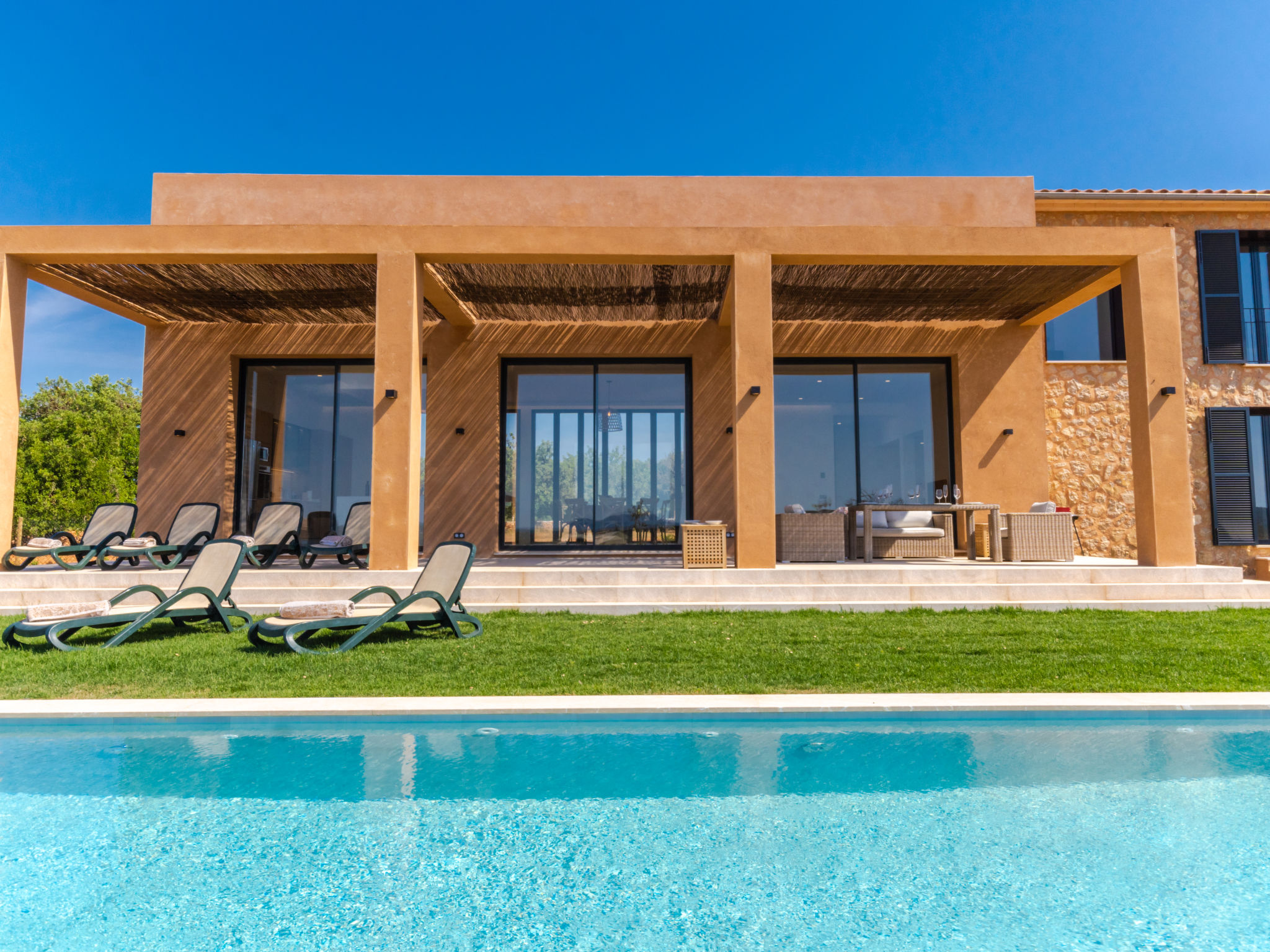 Sehr grosse, sehr moderne Villa "Can Navarro", auf 2 Stockwerken, umgeben von Feldern und Weinbergen. Ausserhalb des Ortes, 4.5 km vom Zentrum von Inca, ruhige, sonnige Lage, 500 m vom Waldrand, 25 km vom Meer, 25 km vom Strand, im Grünen. Zur Alleinbenutzung: naturbelassenes Grundstück, Garten mit Rasen und Pflanzen, Wiese, Schwimmbad eckig (14 x 4 m, 160 cm tief, 01.01.-31.12.) mit Salzelektrolyse-Reinigungssystem. Aussendusche, Sitzplatz, Laube, Pergola, Gartenmöbel, Grill. Im Hause: Internetzugang, Wireless LAN, Einstellraum für Fahrräder, Zentralheizung, Klimaanlage, Waschmaschine, Trockenraum. 100 m lange holprige Zufahrt bis zum Haus. Parkplatz beim Haus auf dem Grundstück. Einkaufsgeschäft 4.5 km, Lebensmittelgeschäft 4.5 km, Supermarkt 4.5 km, Einkaufszentrum 15 km, Restaurant 4 km, Bar 3.8 km, Bäckerei 4.2 km, Zentrum zu Fuss in 60 Minuten erreichbar, Bushaltestelle 4 km, Bahnstation 4.8 km, Fähre 26 km, Sandstrand "Playa de Muro - Port Alcudia" 25 km, Steinstrand "Alcúdia" 26 km. Sporthafen 25 km, Jacht-Hafen 25 km, Golfplatz (18 Loch) 29 km. Nahe gelegene Sehenswürdigkeiten: Sineu, Costitx, Sencelles, Llubí, Inca, Mallorca Fashion Outlet & Cinemas 20 km, Ruta Arqueológica Costitx, Lluc-Escorca. Serra Tramuntana, Observatorio Astronómico Costitx. Bitte beachten: Fahrzeug empfohlen. Geeignet für Familien, geeignet für Senioren. Objekt geeignet für 8 Erwachsene Jugendgruppen nur auf Anfrage. Flugplatz 55 km vom Haus. In diesem Haus sind weitere Ferienwohnungen mietbar. Ferienwohnung Ref. ES8200.137.1 befindet sich auf dem gleichen Grundstück. In dieser Anlage zusätzlich mietbar: 1 Haus.