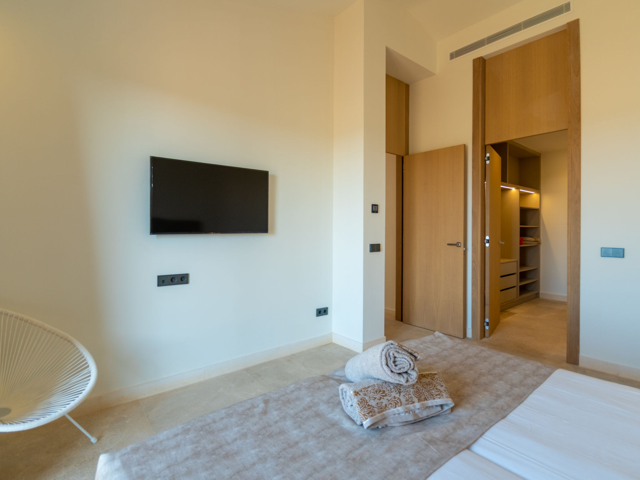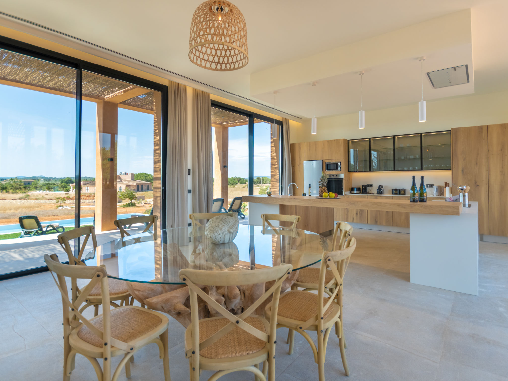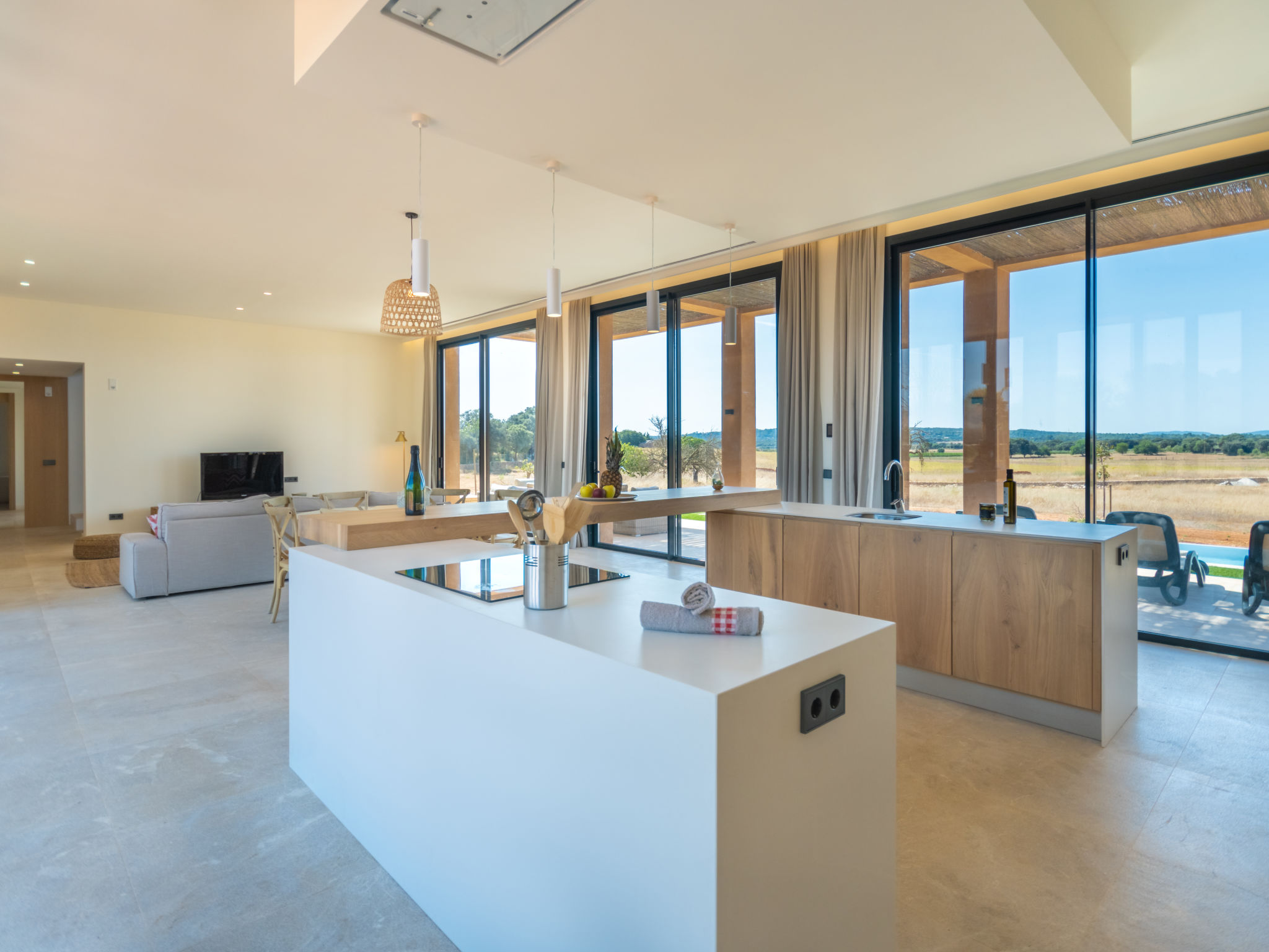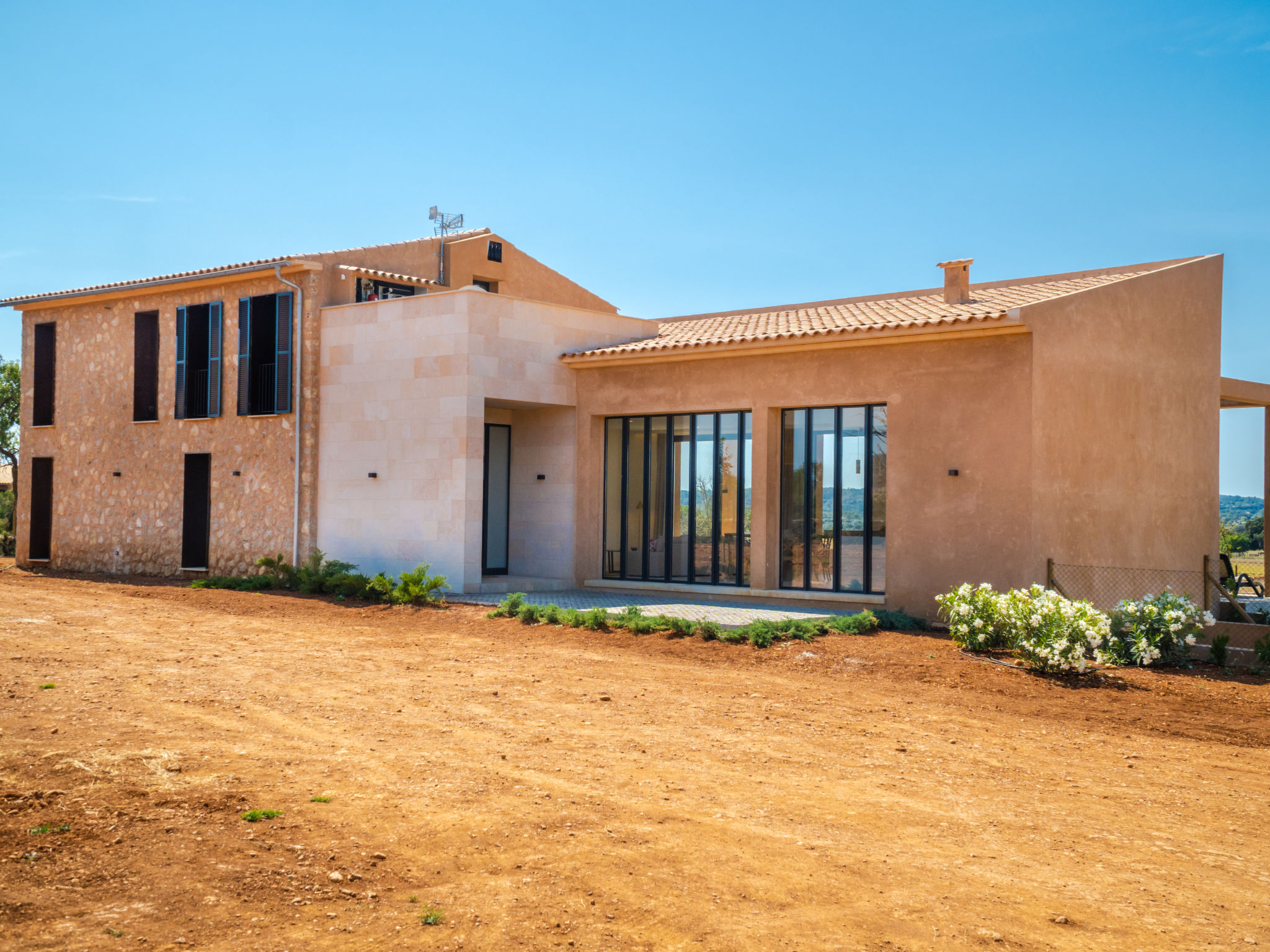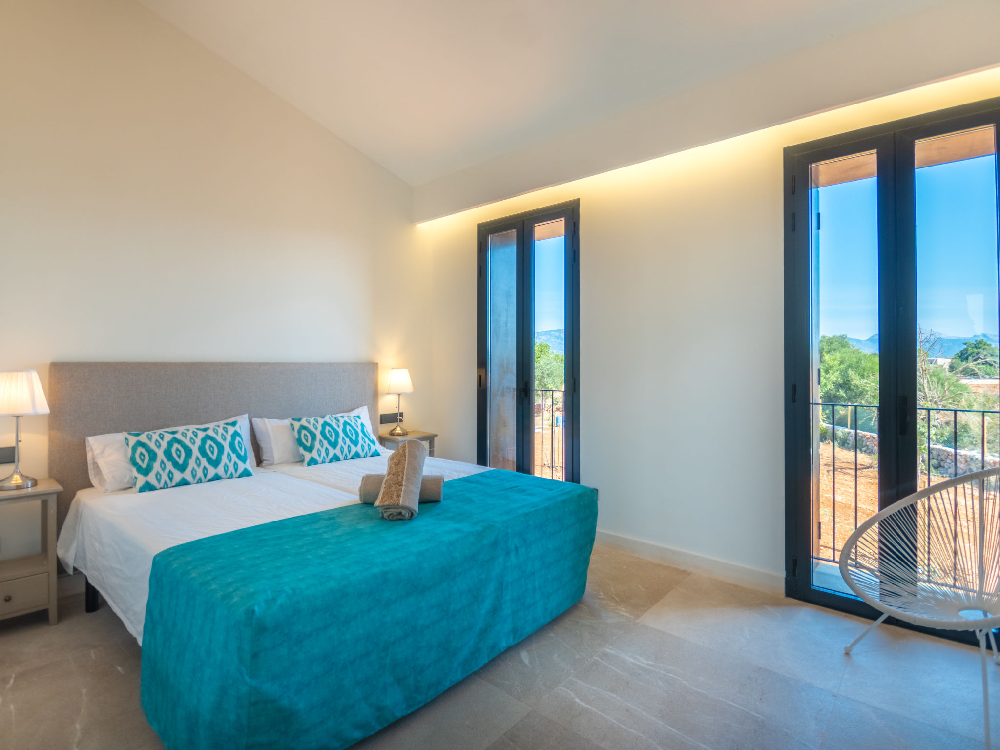 Sehr grosse, sehr moderne Villa "Can Navarro", auf 2 Stockwerken, umgeben von Feldern und Weinbergen. Ausserhalb des Ortes, 4.5 km vom Zentrum von Inca, ruhige, sonnige Lage, 500 m vom Waldrand, 25 km vom Meer, 25 km vom Strand, im Grünen. Zur Alleinbenutzung: naturbelassenes Grundstück, Garten mit Rasen und Pflanzen, Wiese, Schwimmbad eckig (14 x 4 m, 160 cm tief, 01.01.-31.12.) mit Salzelektrolyse-Reinigungssystem. Aussendusche, Sitzplatz, Laube, Pergola, Gartenmöbel, Grill. Im Hause: Internetzugang, Wireless LAN, Einstellraum für Fahrräder, Zentralheizung, Klimaanlage, Waschmaschine, Trockenraum. 100 m lange holprige Zufahrt bis zum Haus. Parkplatz beim Haus auf dem Grundstück. Einkaufsgeschäft 4.5 km, Lebensmittelgeschäft 4.5 km, Supermarkt 4.5 km, Einkaufszentrum 15 km, Restaurant 4 km, Bar 3.8 km, Bäckerei 4.2 km, Zentrum zu Fuss in 60 Minuten erreichbar, Bushaltestelle 4 km, Bahnstation 4.8 km, Fähre 26 km, Sandstrand "Playa de Muro - Port Alcudia" 25 km, Steinstrand "Alcúdia" 26 km. Sporthafen 25 km, Jacht-Hafen 25 km, Golfplatz (18 Loch) 29 km. Nahe gelegene Sehenswürdigkeiten: Sineu, Costitx, Sencelles, Llubí, Inca, Mallorca Fashion Outlet & Cinemas 20 km, Ruta Arqueológica Costitx, Lluc-Escorca. Serra Tramuntana, Observatorio Astronómico Costitx. Bitte beachten: Fahrzeug empfohlen. Geeignet für Familien, geeignet für Senioren. Objekt geeignet für 8 Erwachsene Jugendgruppen nur auf Anfrage. Flugplatz 55 km vom Haus. In diesem Haus sind weitere Ferienwohnungen mietbar. Ferienwohnung Ref. ES8200.137.1 befindet sich auf dem gleichen Grundstück. In dieser Anlage zusätzlich mietbar: 1 Haus.