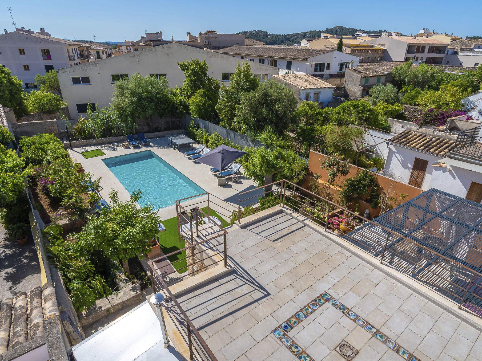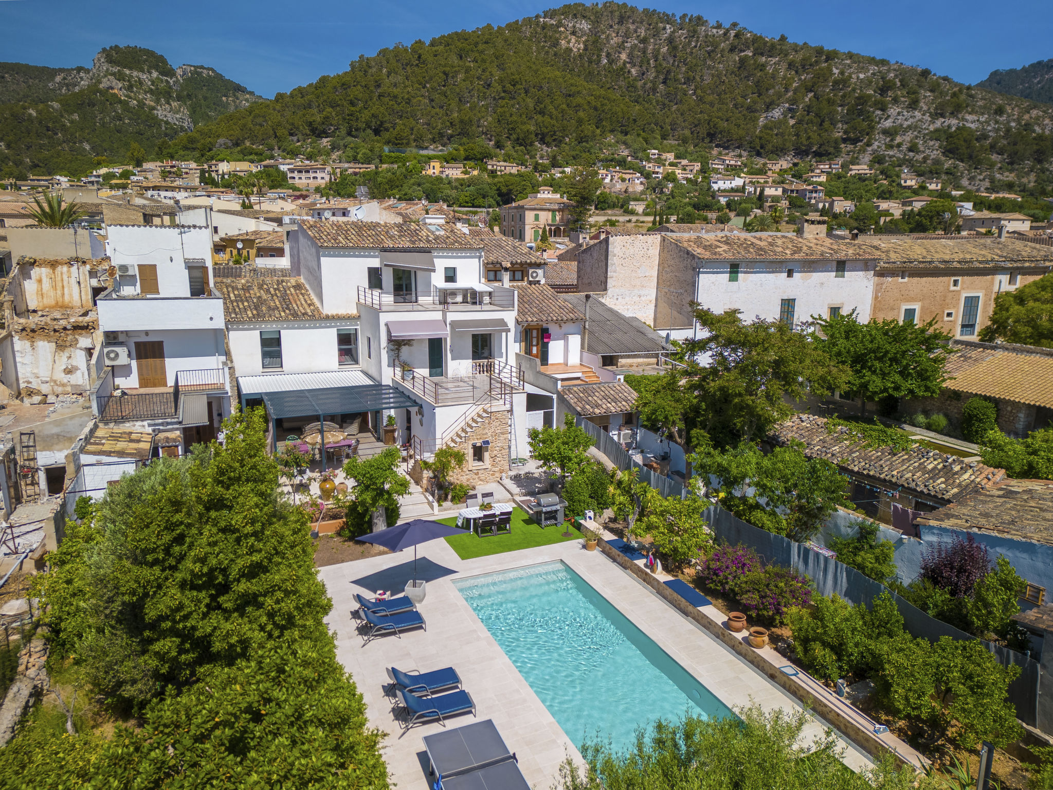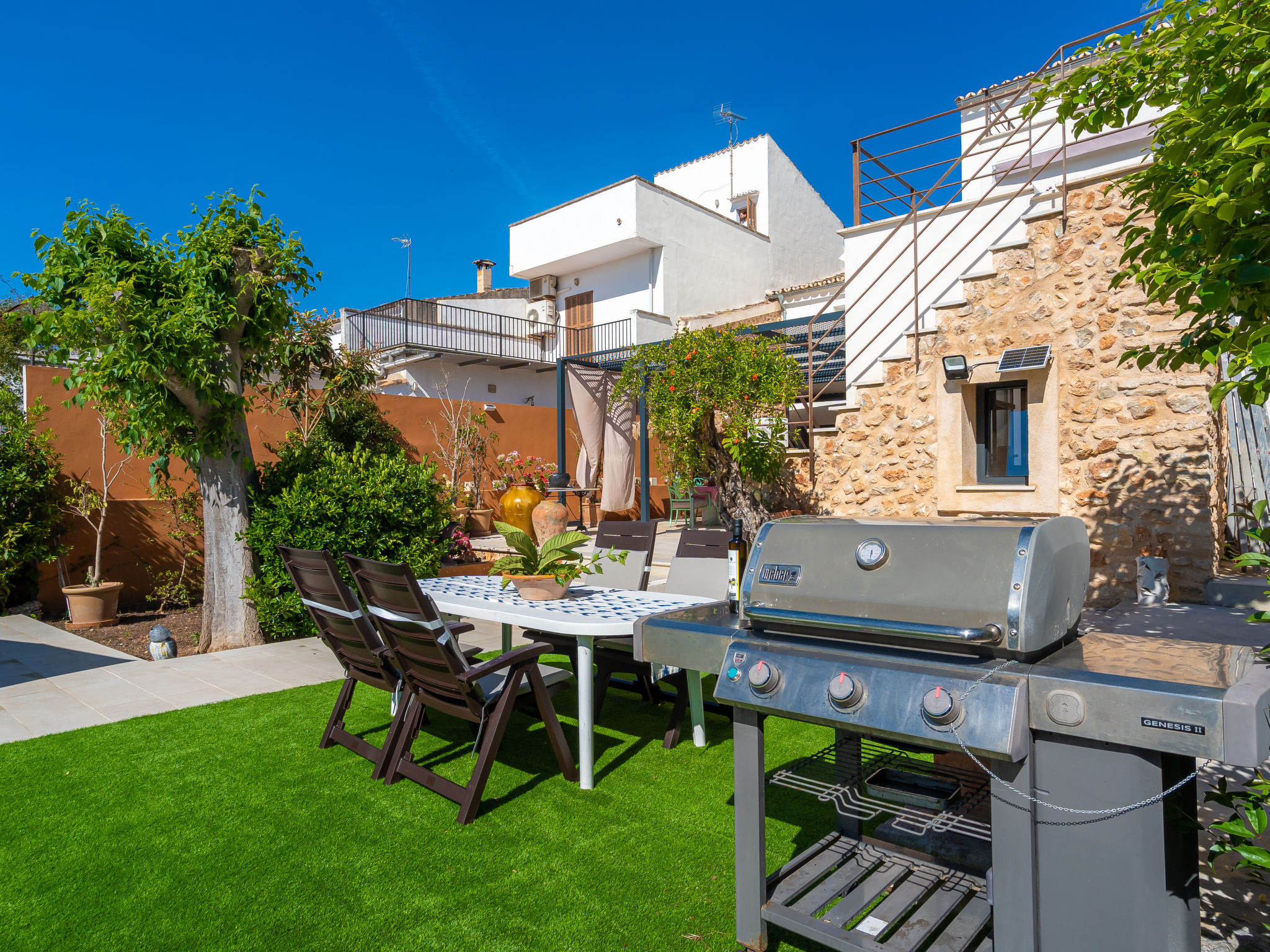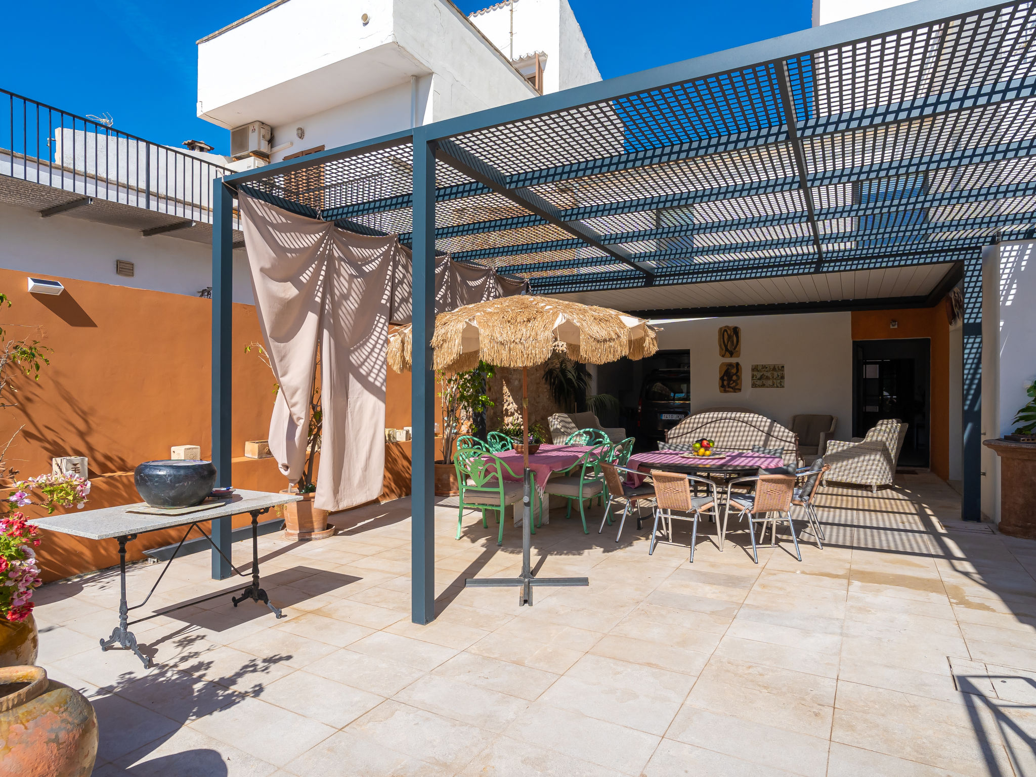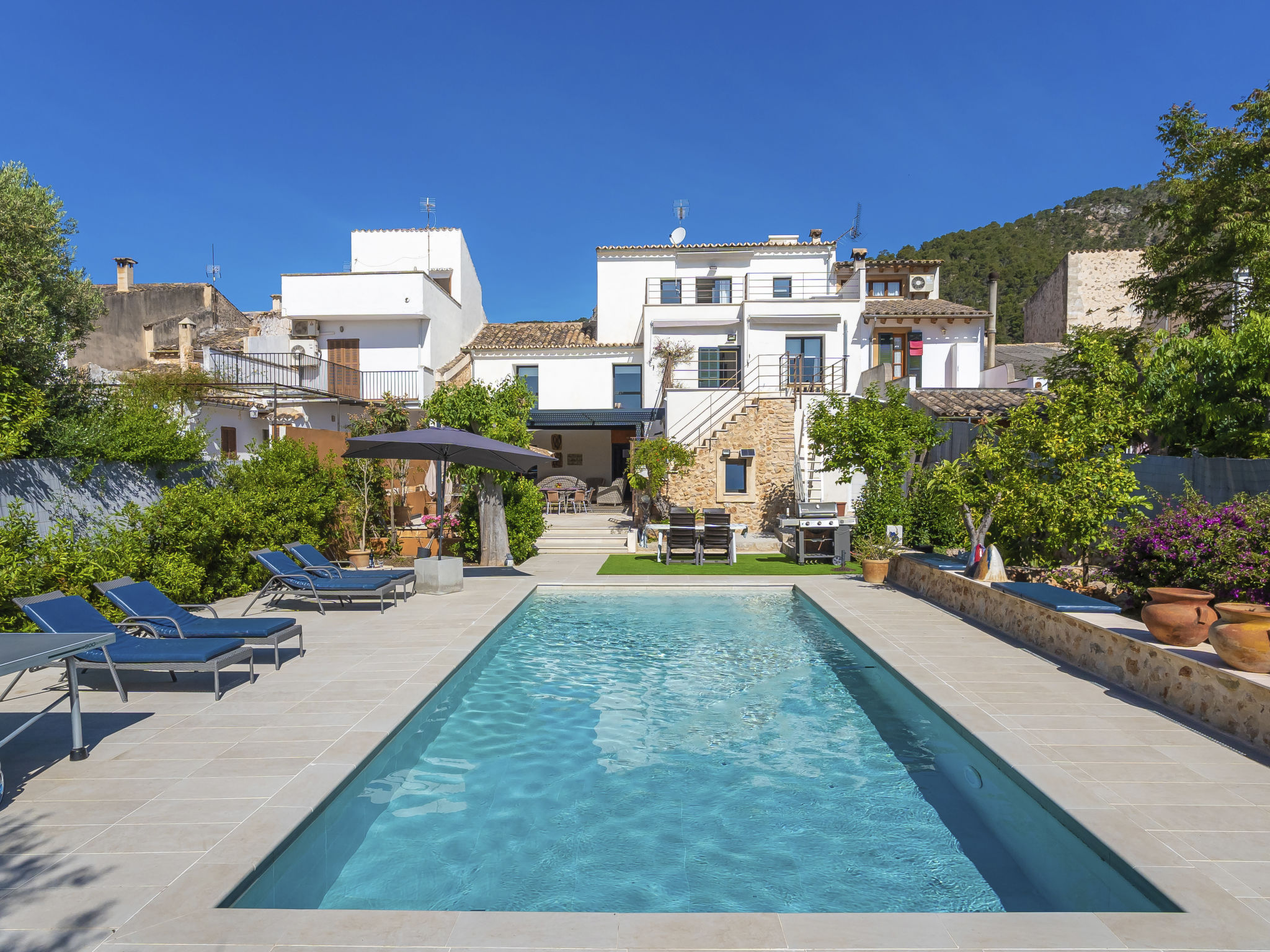11-Zimmer-Reihenhaus 360 m2 auf 3 Stockwerken. Modern und geschmackvoll eingerichtet: Eingang. Wohnzimmer mit Klimaanlage und Warmluftheizung. Esszimmer mit Esstisch, Klimaanlage und Warmluftheizung. Ausgang zur Terrasse. 1 Zimmer mit 2 Betten (90 cm, Länge 200 cm), Klimaanlage und Warmluftheizung. Offene Küche (Backofen, Geschirrspüler, 3 Glaskeramikherd Platten, Toaster, Wasserkocher, Mikrowelle, elektrische Kaffeemaschine) mit kleinem Esstisch, Küchenblock. Ausgang zur Terrasse. Dusche/WC. Obergeschoss: Wohnzimmer mit Sat-TV und Digital-TV. 1 Zimmer mit 1 franz. Bett (1 x 140 cm, Länge 200 cm), Klimaanlage und Warmluftheizung. 1 Zimmer mit 1 Doppelbett (1 x 180 cm, Länge 200 cm), Klimaanlage und Warmluftheizung. Ausgang zum Balkon. 1 Zimmer mit 1 Doppelbett (1 x 180 cm, Länge 200 cm), Klimaanlage und Warmluftheizung. 1 Zimmer mit 1 Doppelbett (1 x 180 cm, Länge 200 cm), Klimaanlage und Warmluftheizung. 1 Zimmer mit 2 Betten (90 cm, Länge 200 cm), Klimaanlage und Warmluftheizung. 3 Duschen/WC. 2. Obergeschoss: 1 Zimmer mit 1 Doppelbett (1 x 180 cm, Länge 200 cm), Klimaanlage und Warmluftheizung. Wohnzimmer mit Sat-TV und Digital-TV. Dusche/WC. Grosse Terrasse 50 m2. Terrassenmöbel, Gartengrill (mobil), Liegestühle. Schöne Sicht auf die Berge und die Ortschaft. Zur Verfügung: Waschmaschine, Wäschetrockner, Kinderhochstuhl, Babybett bis 2 Jahre (extra), Haartrockner. Internet (Wireless LAN, gratis). Garage auf dem Grundstück (2 Autos). Bitte beachten: Nichtraucher-Haus. L12E11630