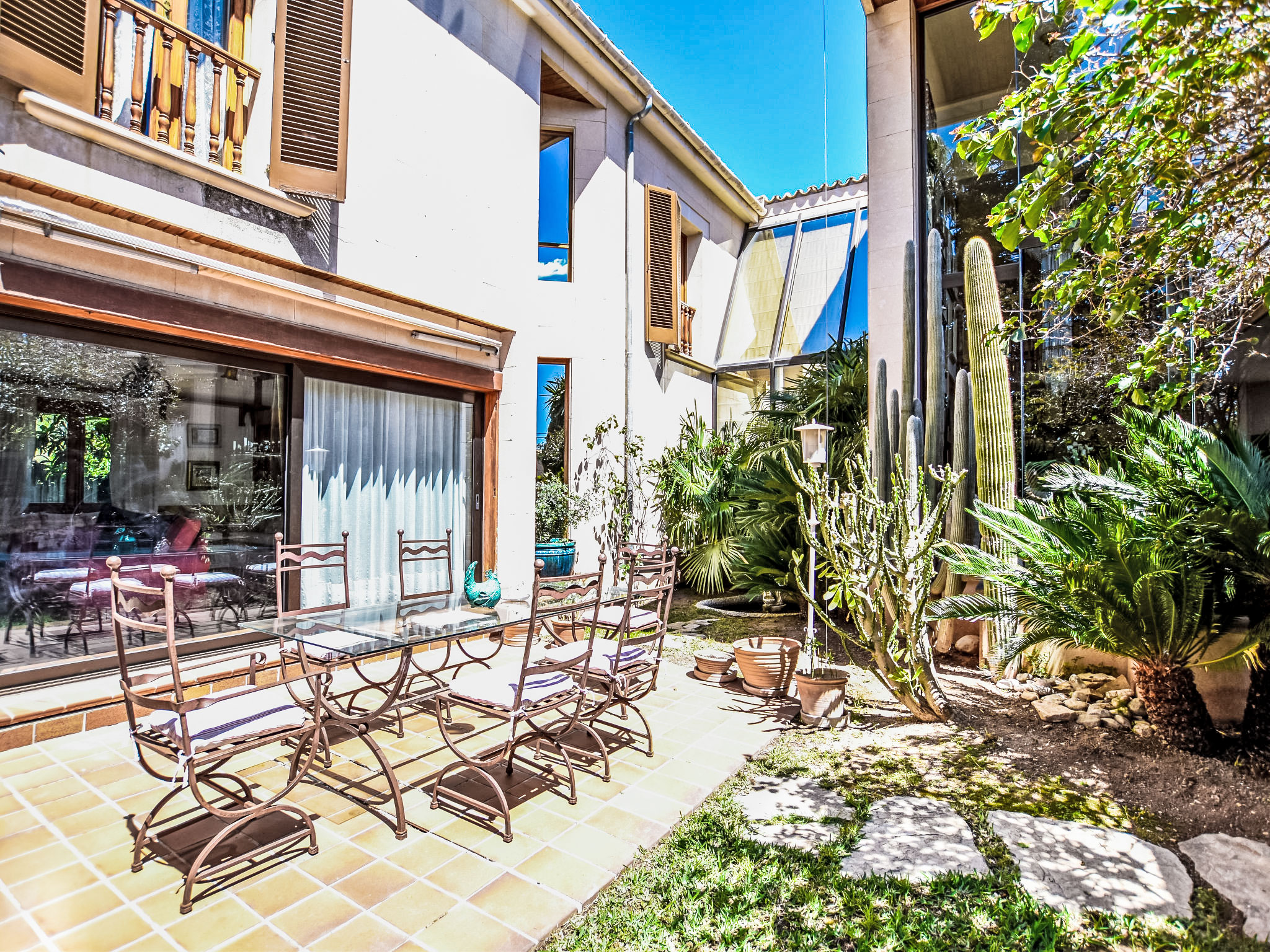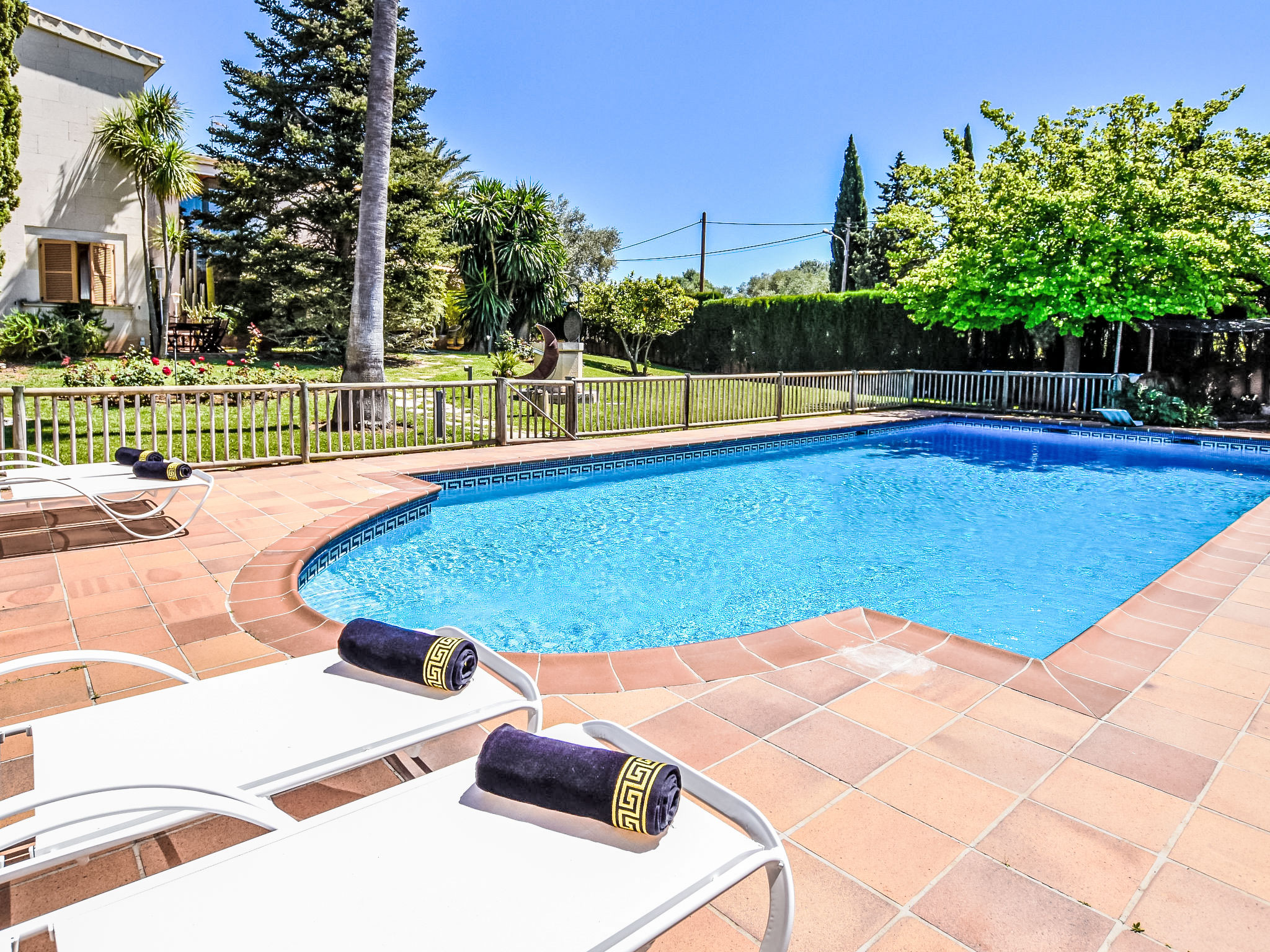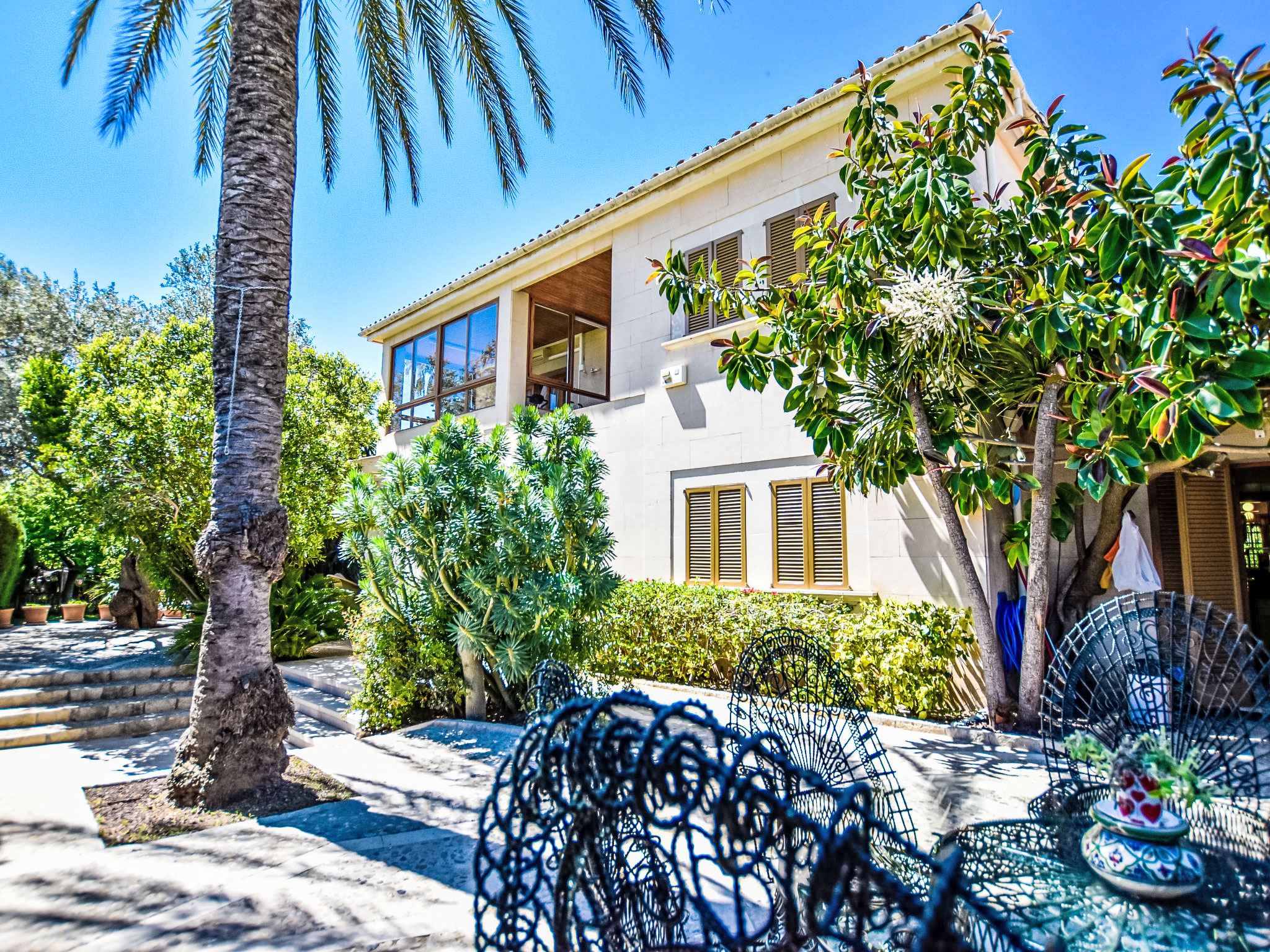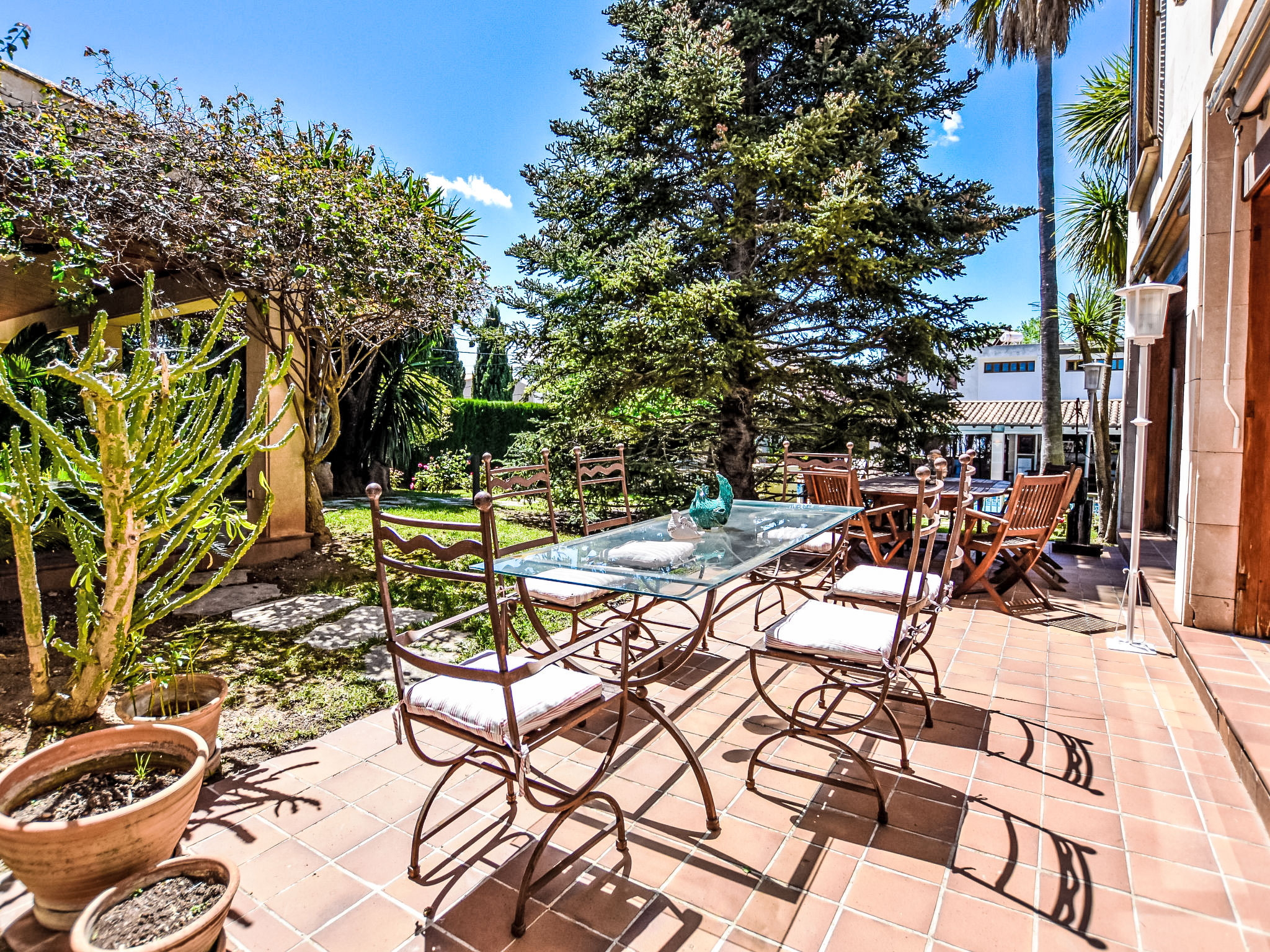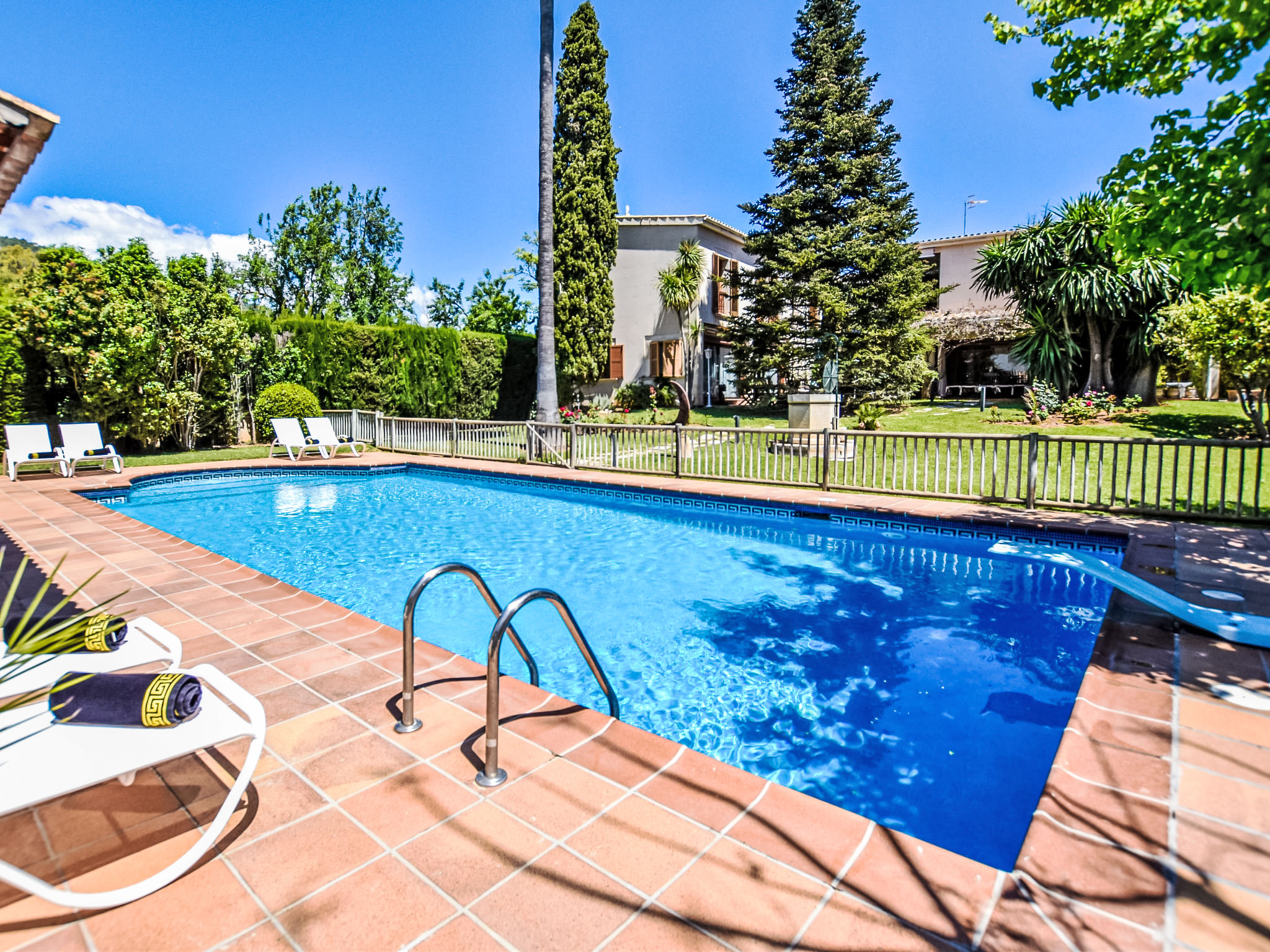 "Can Joan", 9-Zimmer-Villa 450 m2 auf 2 Stockwerken. Objekt geeignet für 10 Erwachsene. Geräumig und hell, sehr komfortabel und geschmackvoll eingerichtet: offenes grosses Wohnzimmer mit Schiebetür, Panoramafenster. Ausgang zum Garten. Grosses Esszimmer mit Esstisch. Grosses Wohnzimmer mit Schiebetür, Panoramafenster mit Esstisch, Sat-TV und Flachbildschirm. Ausgang zum Gartensitzplatz. Salon mit Panoramafenster mit Sat-TV, Klimaanlage und Warmluftheizung. 1 grosses Doppelzimmer mit Panoramafenster mit 1 franz. Bett. Wohnküche (Backofen, Geschirrspüler, 3 Glaskeramikherd Platten, Toaster, Wasserkocher, Mikrowelle, Tiefkühler, elektrische Kaffeemaschine) mit Esstisch, Klimaanlage und Warmluftheizung. Ausgang zur Terrasse. Bad/WC, Bad/Dusche/WC. Obergeschoss: 1 grosses Doppelzimmer mit Panoramafenster begehbarer Kleiderschrank mit 1 Doppelbett, Bad/Dusche/WC, TV, Flachbildschirm, Klimaanlage, Ventilator und Warmluftheizung. 2 grosse Doppelzimmer mit Panoramafenster, jedes Zimmer mit 1 franz. Bett, Klimaanlage und Warmluftheizung. 1 Doppelzimmer mit Panoramafenster mit 2 Betten (90 cm), Klimaanlage und Warmluftheizung. Bad/Dusche/WC, Doppelwaschbecken mit Eckbadewanne. Komfortable Einrichtung im Landhausstil. Grosser Gartensitzplatz, Rasen. Terrassenmöbel, Gartengrill, Liegestühle (6), Loggia. Sicht auf die Berge und die Ortschaft. Zur Verfügung: Waschmaschine, Wäschetrockner, Bügeleisen, Haartrockner. Internet (Wireless LAN, gratis). Geeignet für Familien. L12E10792