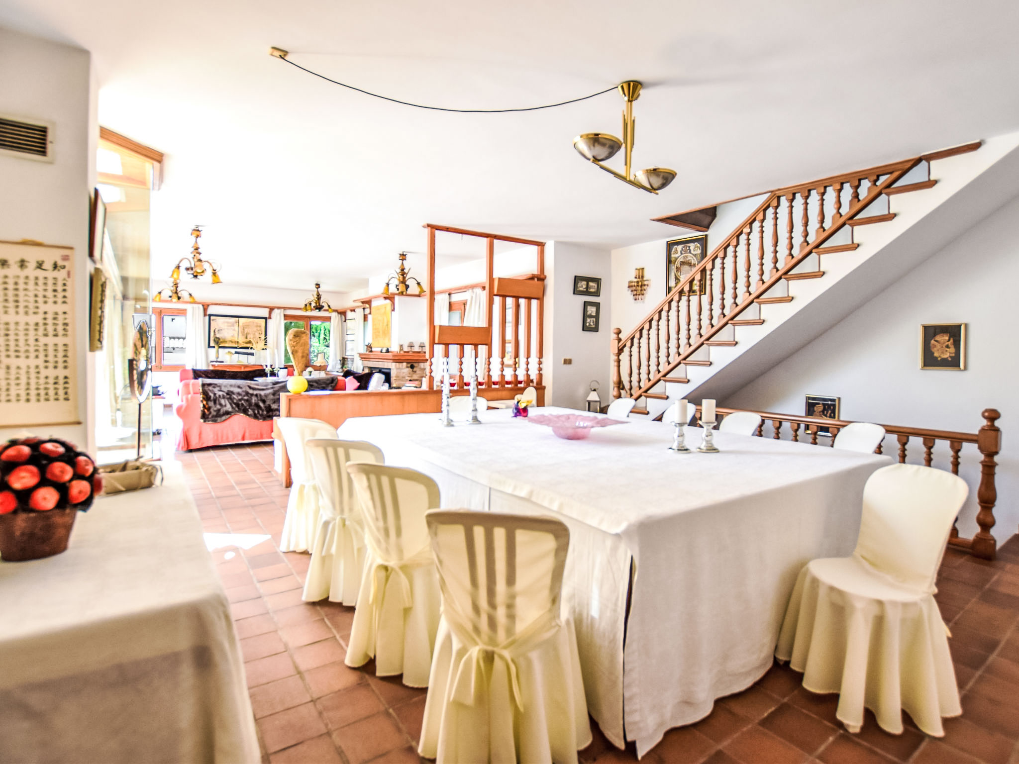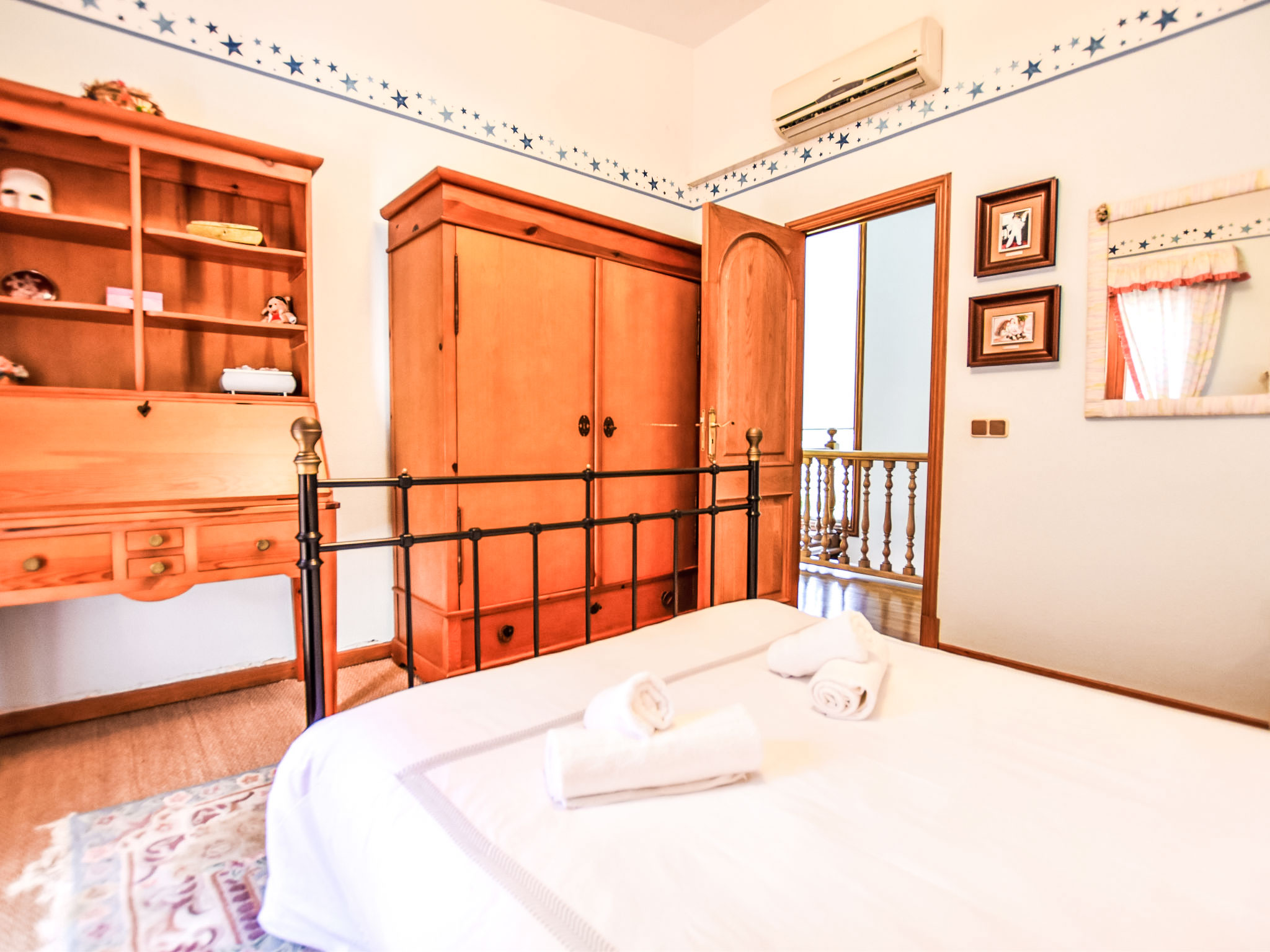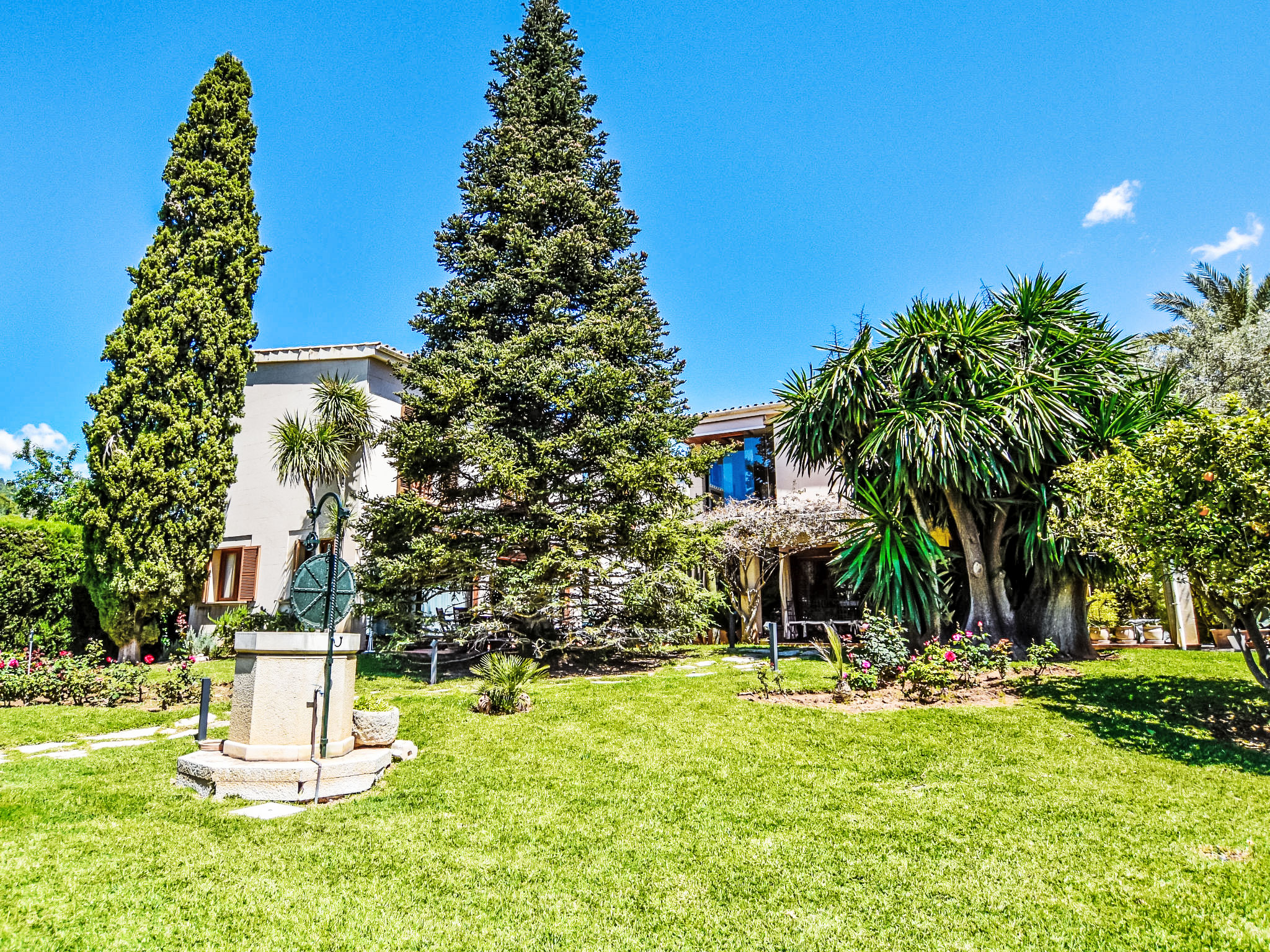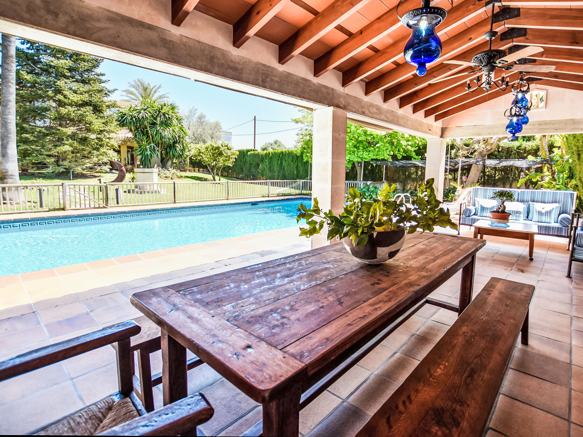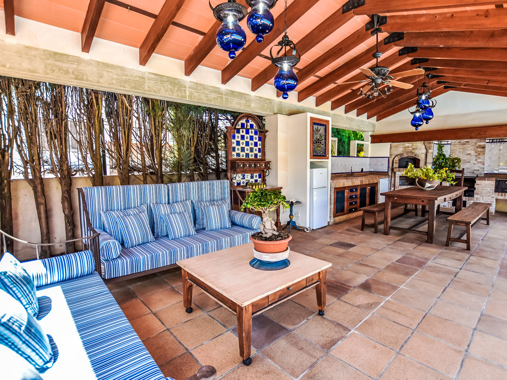 "Can Joan", 9-Zimmer-Villa 450 m2 auf 2 Stockwerken. Objekt geeignet für 10 Erwachsene. Geräumig und hell, sehr komfortabel und geschmackvoll eingerichtet: offenes grosses Wohnzimmer mit Schiebetür, Panoramafenster. Ausgang zum Garten. Grosses Esszimmer mit Esstisch. Grosses Wohnzimmer mit Schiebetür, Panoramafenster mit Esstisch, Sat-TV und Flachbildschirm. Ausgang zum Gartensitzplatz. Salon mit Panoramafenster mit Sat-TV, Klimaanlage und Warmluftheizung. 1 grosses Doppelzimmer mit Panoramafenster mit 1 franz. Bett. Wohnküche (Backofen, Geschirrspüler, 3 Glaskeramikherd Platten, Toaster, Wasserkocher, Mikrowelle, Tiefkühler, elektrische Kaffeemaschine) mit Esstisch, Klimaanlage und Warmluftheizung. Ausgang zur Terrasse. Bad/WC, Bad/Dusche/WC. Obergeschoss: 1 grosses Doppelzimmer mit Panoramafenster begehbarer Kleiderschrank mit 1 Doppelbett, Bad/Dusche/WC, TV, Flachbildschirm, Klimaanlage, Ventilator und Warmluftheizung. 2 grosse Doppelzimmer mit Panoramafenster, jedes Zimmer mit 1 franz. Bett, Klimaanlage und Warmluftheizung. 1 Doppelzimmer mit Panoramafenster mit 2 Betten (90 cm), Klimaanlage und Warmluftheizung. Bad/Dusche/WC, Doppelwaschbecken mit Eckbadewanne. Komfortable Einrichtung im Landhausstil. Grosser Gartensitzplatz, Rasen. Terrassenmöbel, Gartengrill, Liegestühle (6), Loggia. Sicht auf die Berge und die Ortschaft. Zur Verfügung: Waschmaschine, Wäschetrockner, Bügeleisen, Haartrockner. Internet (Wireless LAN, gratis). Geeignet für Familien. L12E10792