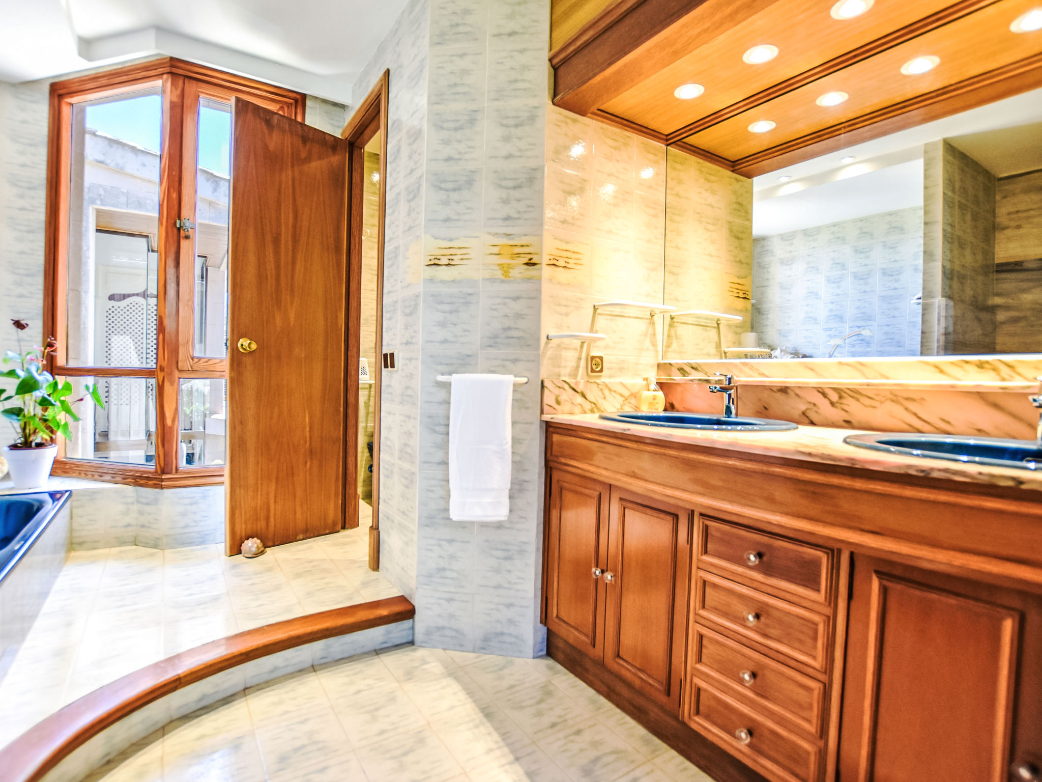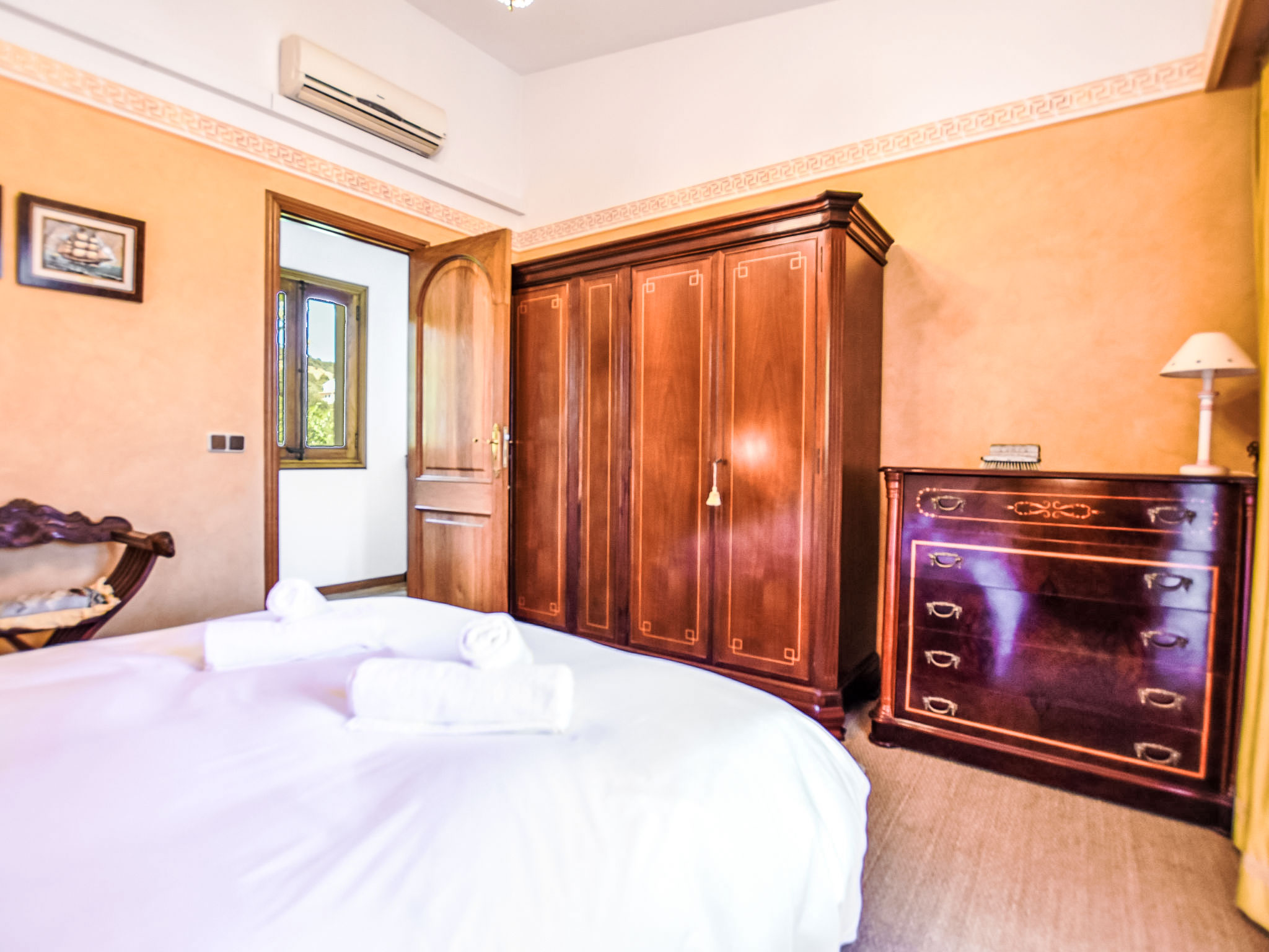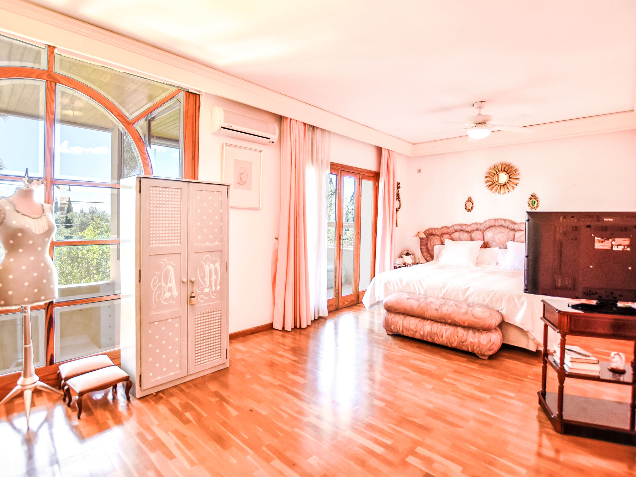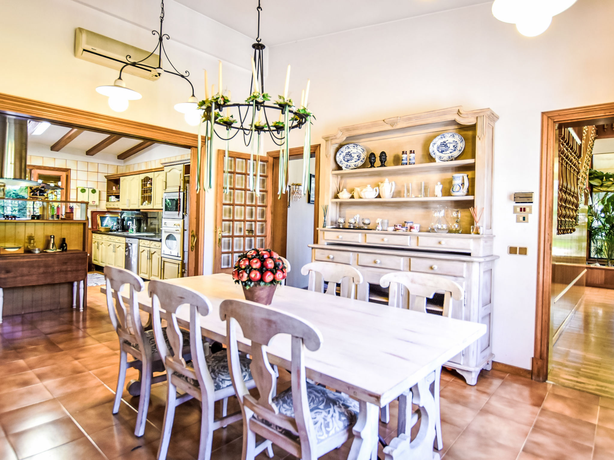 "Can Joan", 9-Zimmer-Villa 450 m2 auf 2 Stockwerken. Objekt geeignet für 10 Erwachsene. Geräumig und hell, sehr komfortabel und geschmackvoll eingerichtet: offenes grosses Wohnzimmer mit Schiebetür, Panoramafenster. Ausgang zum Garten. Grosses Esszimmer mit Esstisch. Grosses Wohnzimmer mit Schiebetür, Panoramafenster mit Esstisch, Sat-TV und Flachbildschirm. Ausgang zum Gartensitzplatz. Salon mit Panoramafenster mit Sat-TV, Klimaanlage und Warmluftheizung. 1 grosses Doppelzimmer mit Panoramafenster mit 1 franz. Bett. Wohnküche (Backofen, Geschirrspüler, 3 Glaskeramikherd Platten, Toaster, Wasserkocher, Mikrowelle, Tiefkühler, elektrische Kaffeemaschine) mit Esstisch, Klimaanlage und Warmluftheizung. Ausgang zur Terrasse. Bad/WC, Bad/Dusche/WC. Obergeschoss: 1 grosses Doppelzimmer mit Panoramafenster begehbarer Kleiderschrank mit 1 Doppelbett, Bad/Dusche/WC, TV, Flachbildschirm, Klimaanlage, Ventilator und Warmluftheizung. 2 grosse Doppelzimmer mit Panoramafenster, jedes Zimmer mit 1 franz. Bett, Klimaanlage und Warmluftheizung. 1 Doppelzimmer mit Panoramafenster mit 2 Betten (90 cm), Klimaanlage und Warmluftheizung. Bad/Dusche/WC, Doppelwaschbecken mit Eckbadewanne. Komfortable Einrichtung im Landhausstil. Grosser Gartensitzplatz, Rasen. Terrassenmöbel, Gartengrill, Liegestühle (6), Loggia. Sicht auf die Berge und die Ortschaft. Zur Verfügung: Waschmaschine, Wäschetrockner, Bügeleisen, Haartrockner. Internet (Wireless LAN, gratis). Geeignet für Familien. L12E10792
