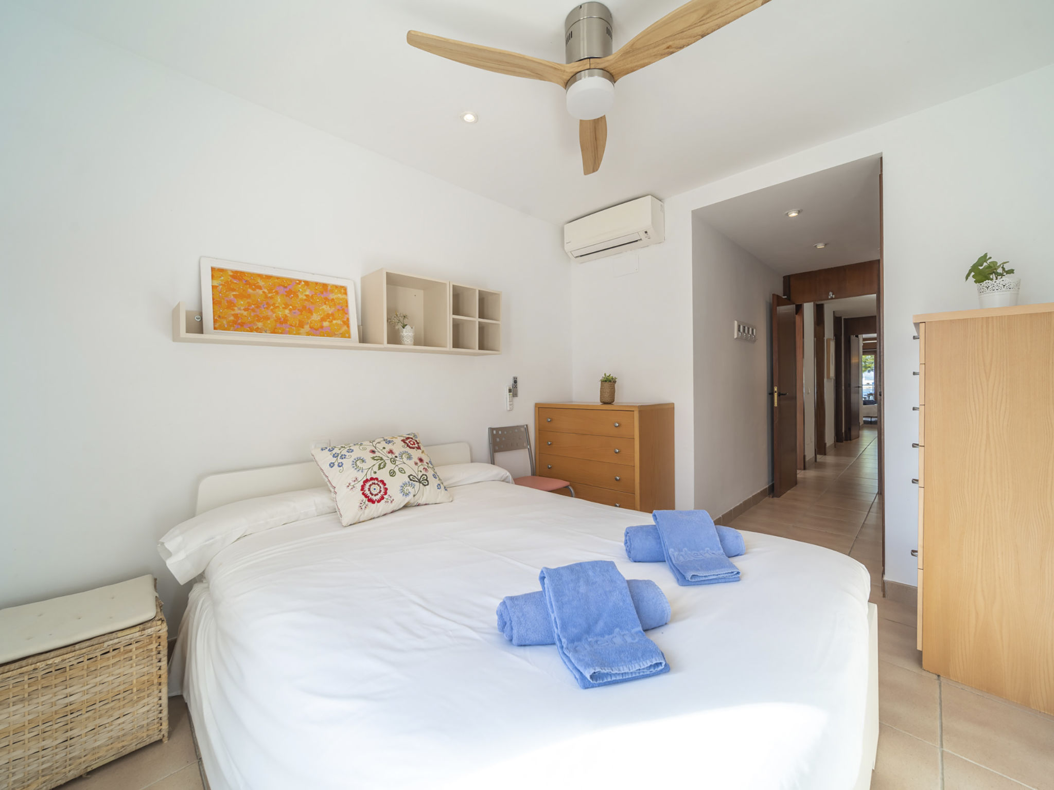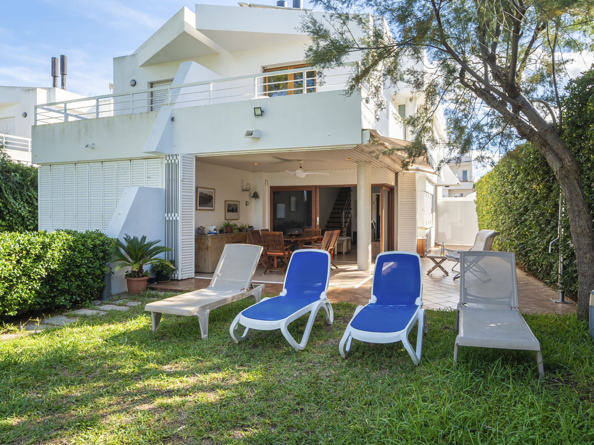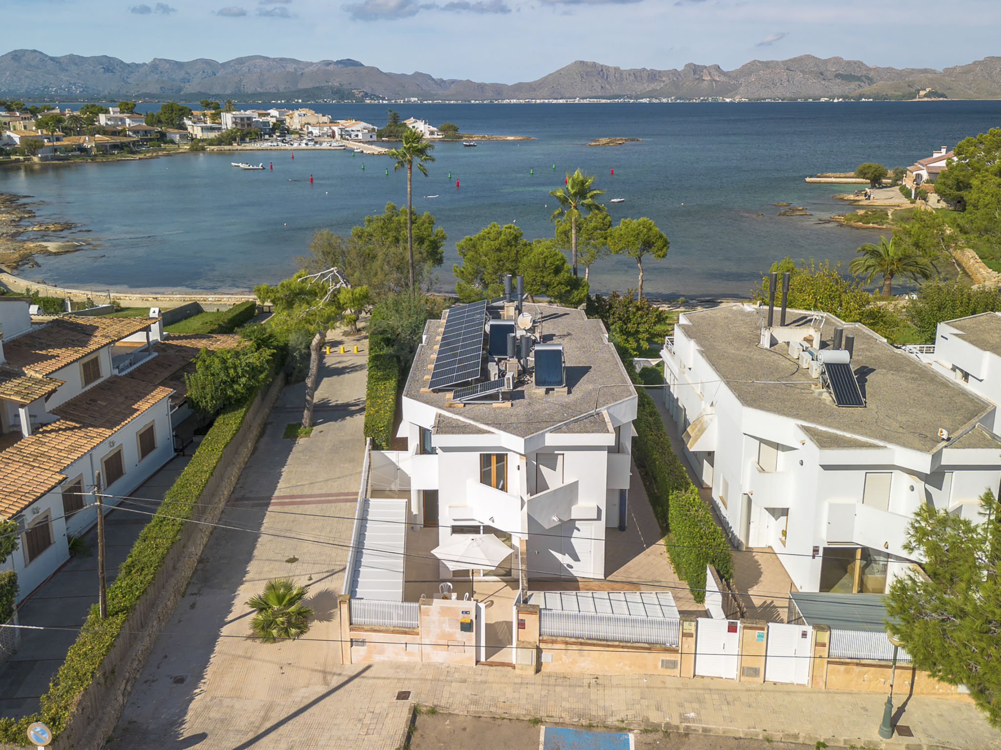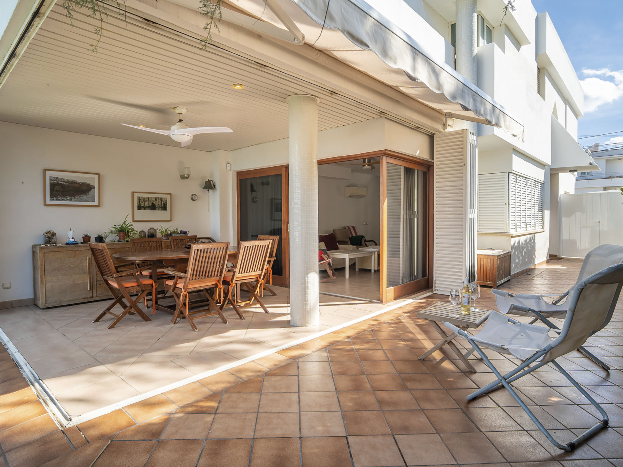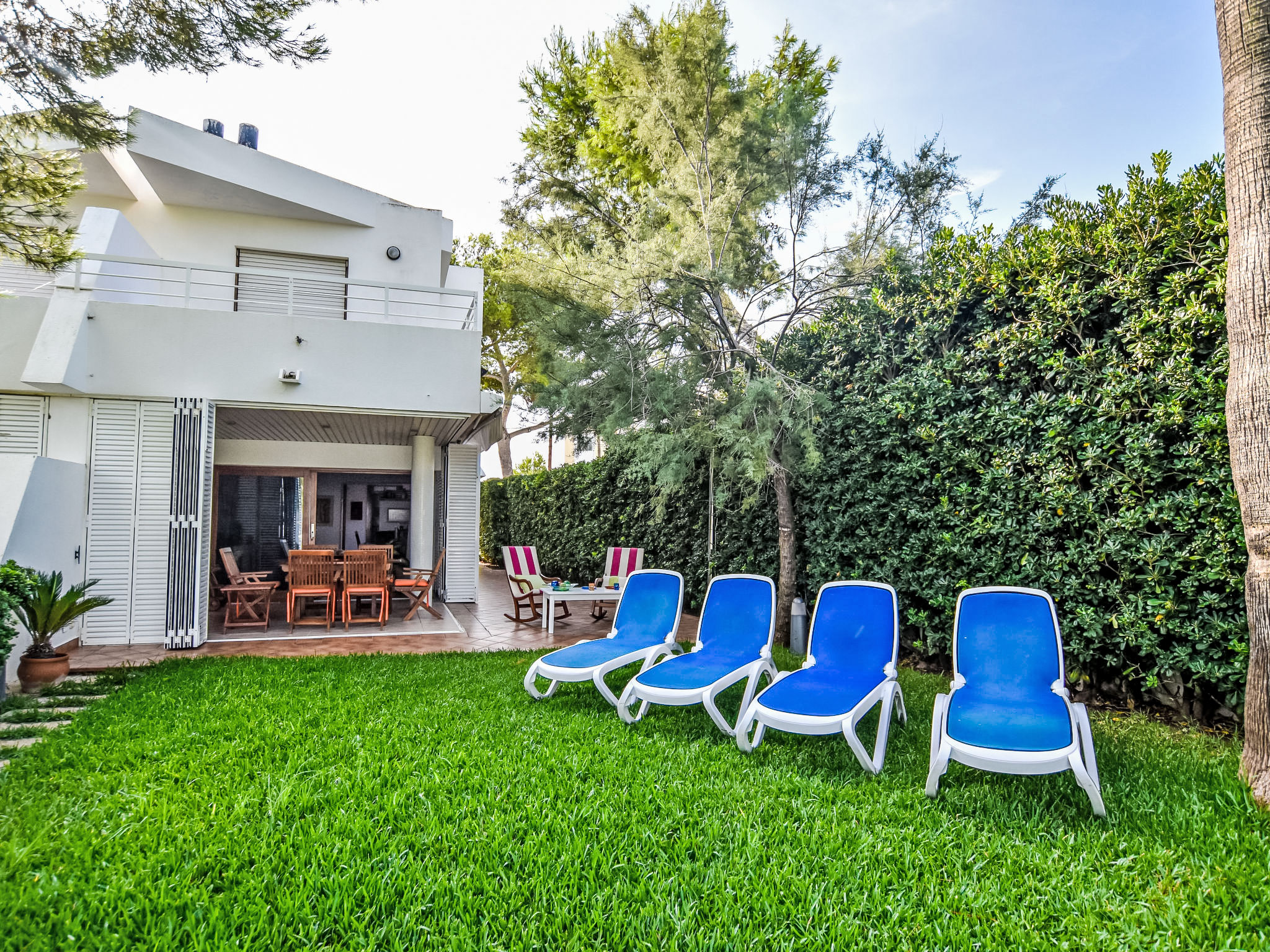 "Es Clot", 5-Zimmer-Doppelhaushälfte 125 m2 auf 2 Stockwerken. Objekt geeignet für 8 Erwachsene. Geräumig und hell, sehr komfortabel und geschmackvoll eingerichtet: grosses Wohn-/Esszimmer mit Schiebetür, Panoramafenster mit Esstisch, Sat-TV, Klimaanlage und Warmluftheizung. Ausgang zum Gartensitzplatz. Küche (Backofen, Geschirrspüler, 3 Glaskeramikherd Platten, Toaster, Wasserkocher, Mikrowelle, Tiefkühler, elektrische Kaffeemaschine) mit Esstisch. Bad/WC. Obergeschoss: 1 grosses Doppelzimmer mit Schiebetür, Panoramafenster mit 1 franz. Bett, Bad/Dusche/WC, Klimaanlage und Warmluftheizung. Ausgang zum Balkon. 1 Doppelzimmer mit Panoramafenster mit 1 x 2 Etagenbetten (90 cm), Klimaanlage und Warmluftheizung. 2 Zimmer mit Panoramafenster, jedes Zimmer mit 1 Ausziehbett (2 Pers. 2 x 90 cm), Klimaanlage und Warmluftheizung. Bad/WC mit Eckbadewanne. Gartensitzplatz, Rasen. Terrassenmöbel, Gartengrill, Liegestühle, Loggia. Herrliche Sicht auf das Meer und die Berge. Zur Verfügung: Waschmaschine, Bügeleisen, Kinderhochstuhl, Babybett, Haartrockner. Internet (Wireless LAN, gratis). Parkplatz (eingezäunt), Garage. Geeignet für Familien. L95E21742