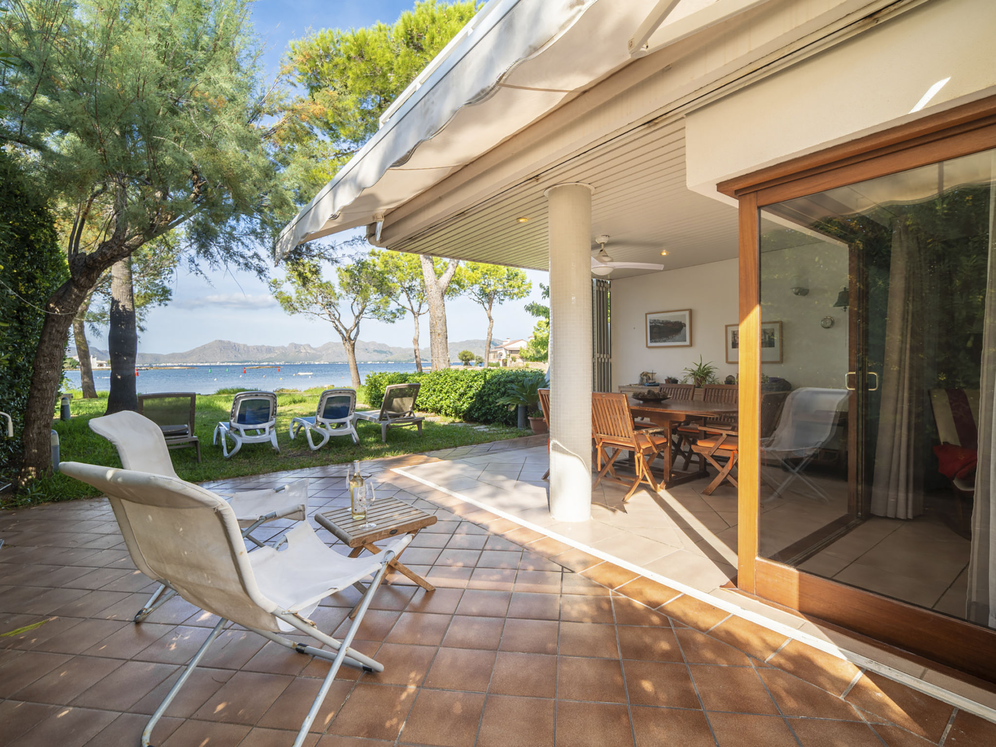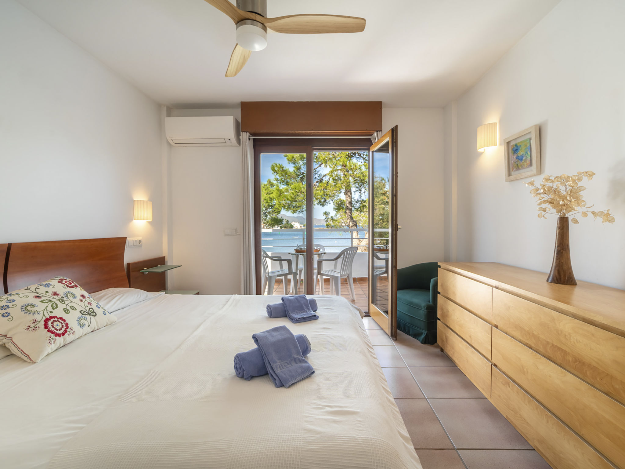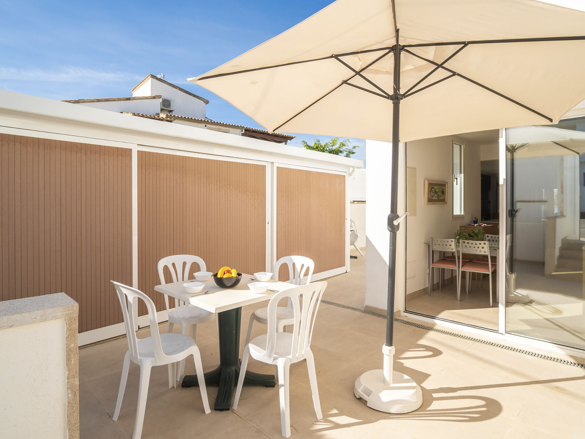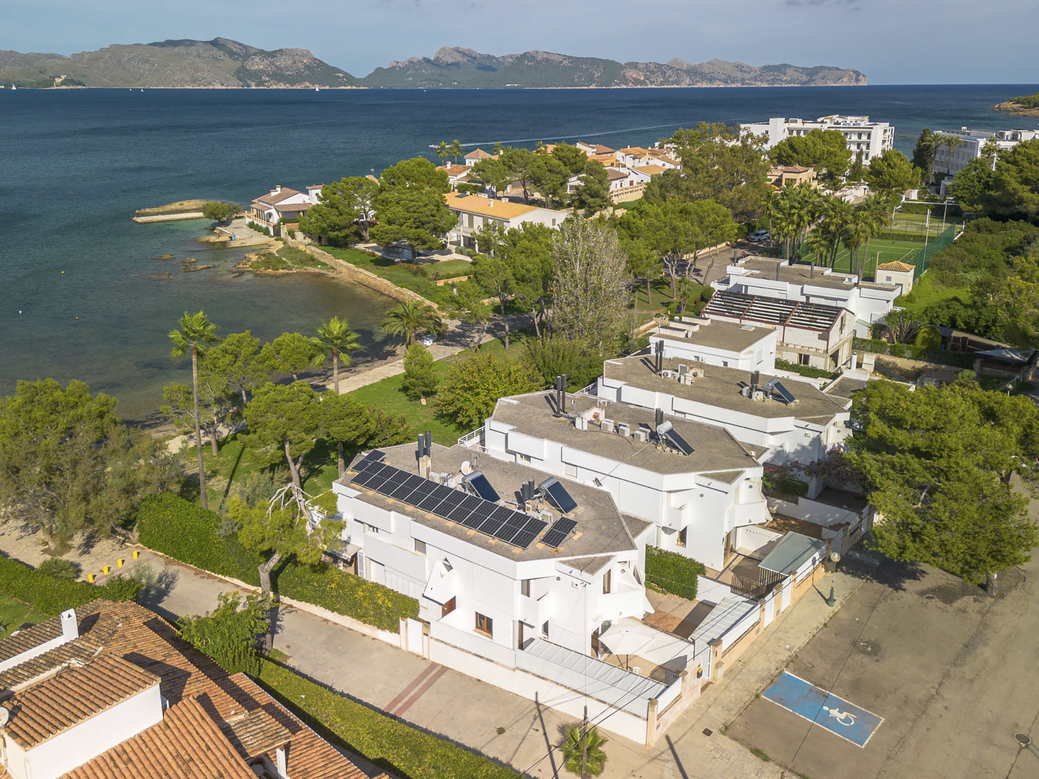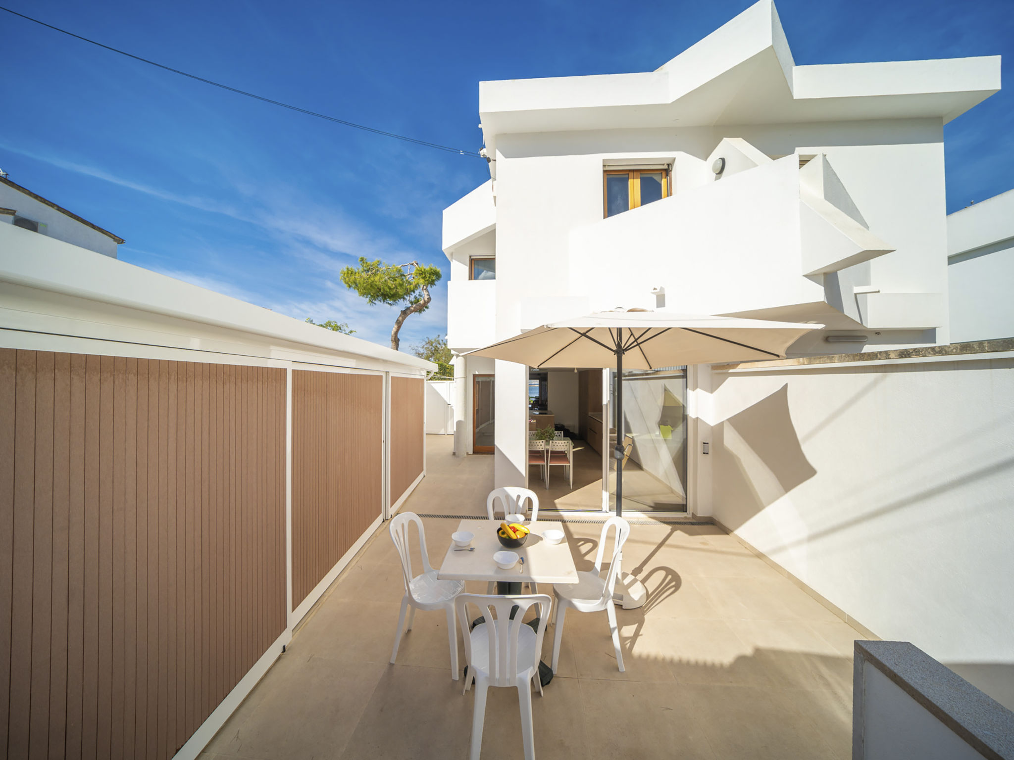 "Es Clot", 5-Zimmer-Doppelhaushälfte 125 m2 auf 2 Stockwerken. Objekt geeignet für 8 Erwachsene. Geräumig und hell, sehr komfortabel und geschmackvoll eingerichtet: grosses Wohn-/Esszimmer mit Schiebetür, Panoramafenster mit Esstisch, Sat-TV, Klimaanlage und Warmluftheizung. Ausgang zum Gartensitzplatz. Küche (Backofen, Geschirrspüler, 3 Glaskeramikherd Platten, Toaster, Wasserkocher, Mikrowelle, Tiefkühler, elektrische Kaffeemaschine) mit Esstisch. Bad/WC. Obergeschoss: 1 grosses Doppelzimmer mit Schiebetür, Panoramafenster mit 1 franz. Bett, Bad/Dusche/WC, Klimaanlage und Warmluftheizung. Ausgang zum Balkon. 1 Doppelzimmer mit Panoramafenster mit 1 x 2 Etagenbetten (90 cm), Klimaanlage und Warmluftheizung. 2 Zimmer mit Panoramafenster, jedes Zimmer mit 1 Ausziehbett (2 Pers. 2 x 90 cm), Klimaanlage und Warmluftheizung. Bad/WC mit Eckbadewanne. Gartensitzplatz, Rasen. Terrassenmöbel, Gartengrill, Liegestühle, Loggia. Herrliche Sicht auf das Meer und die Berge. Zur Verfügung: Waschmaschine, Bügeleisen, Kinderhochstuhl, Babybett, Haartrockner. Internet (Wireless LAN, gratis). Parkplatz (eingezäunt), Garage. Geeignet für Familien. L95E21742