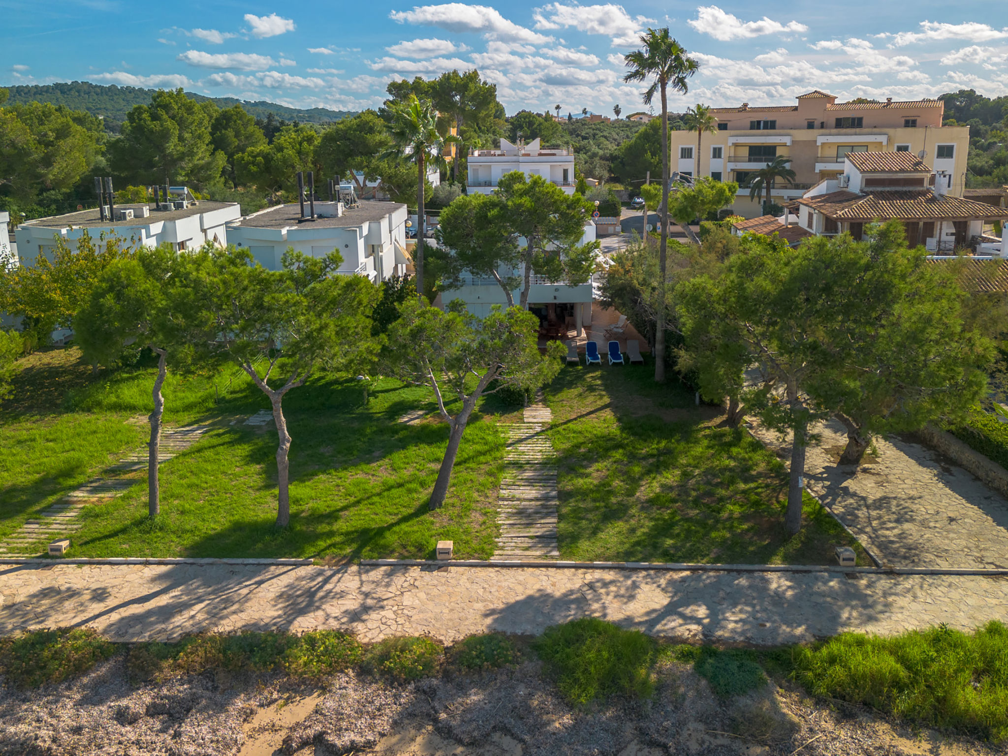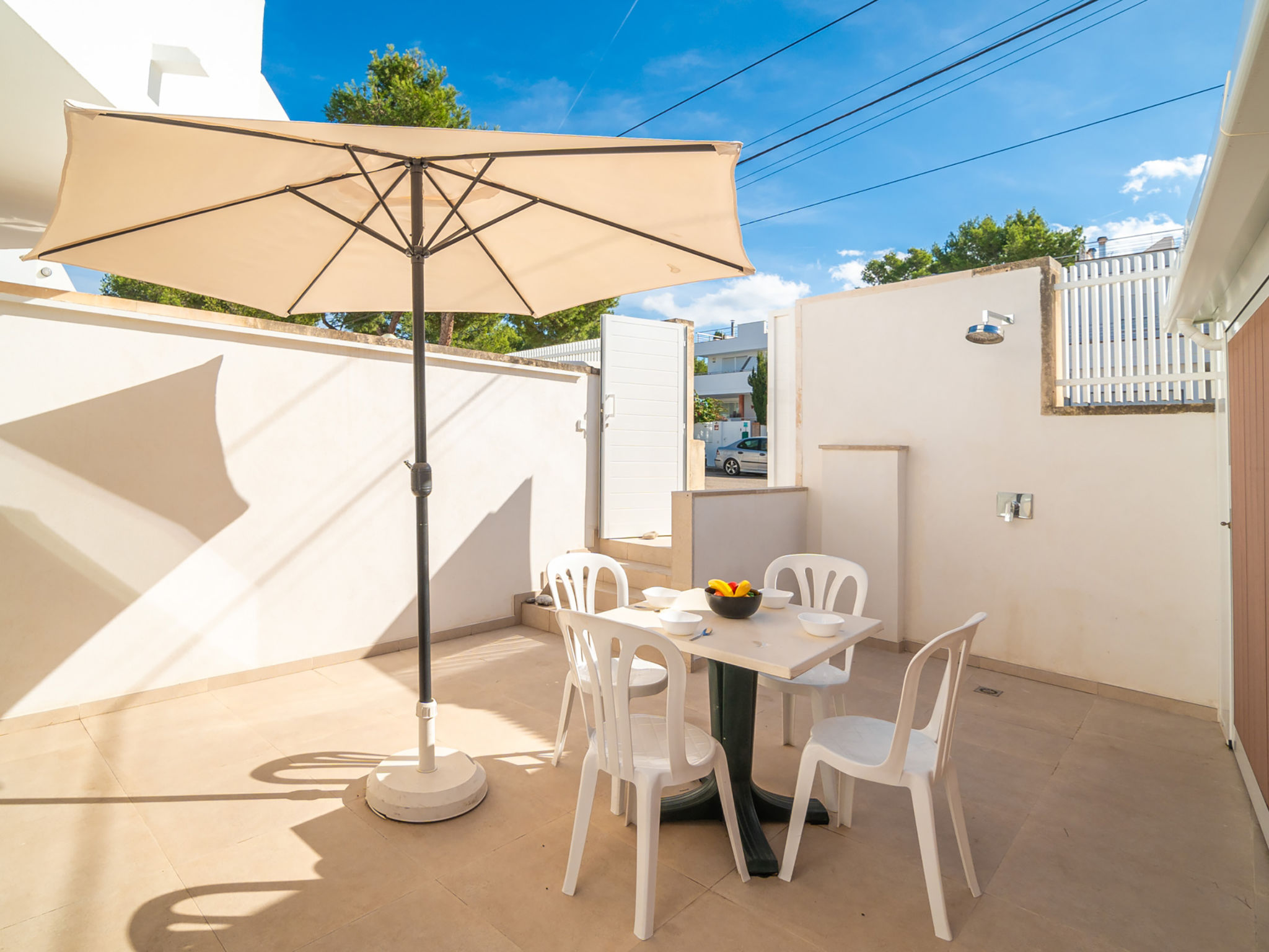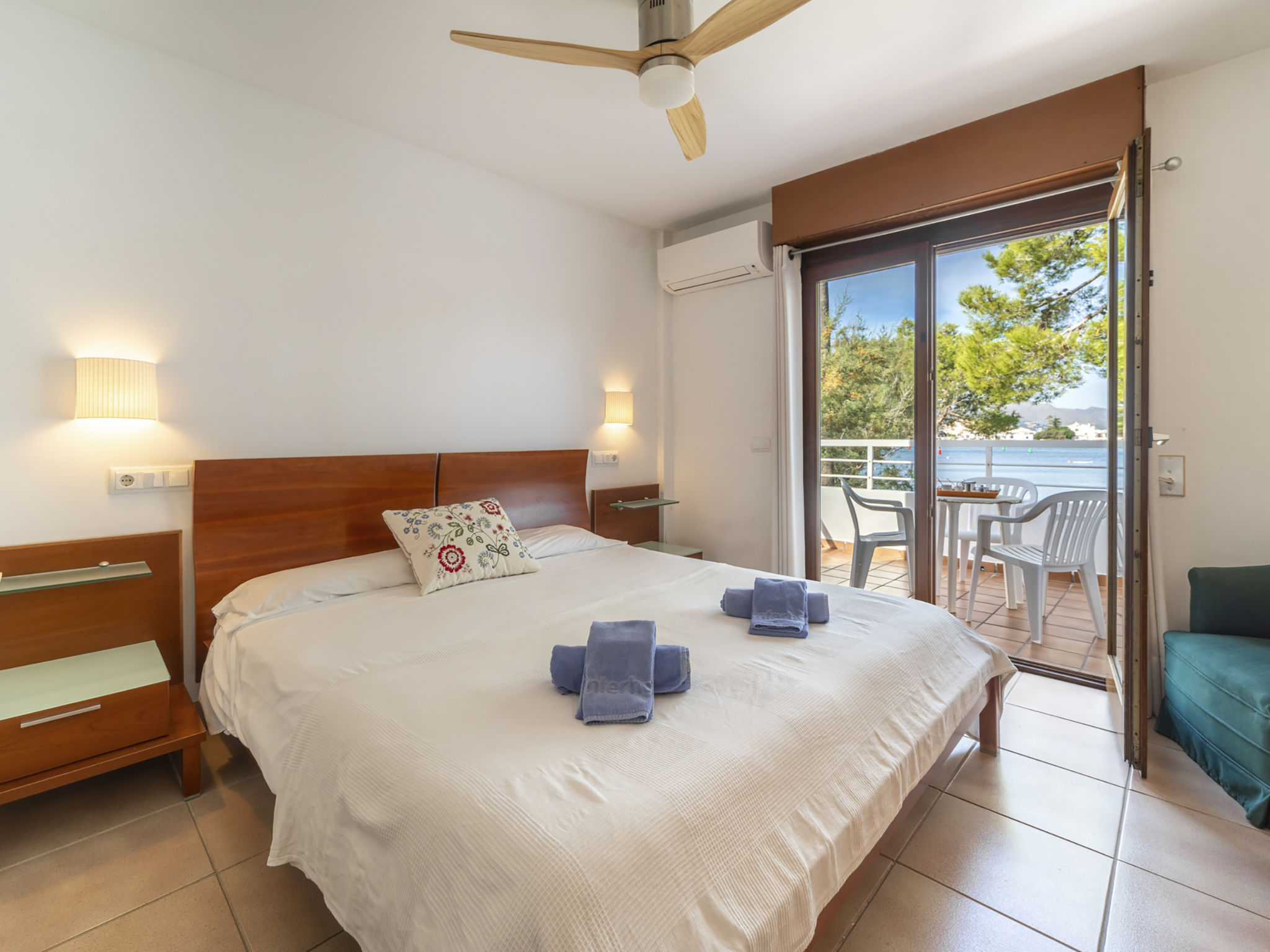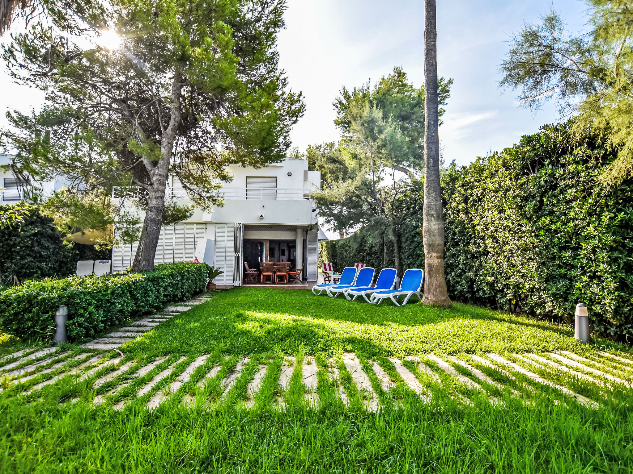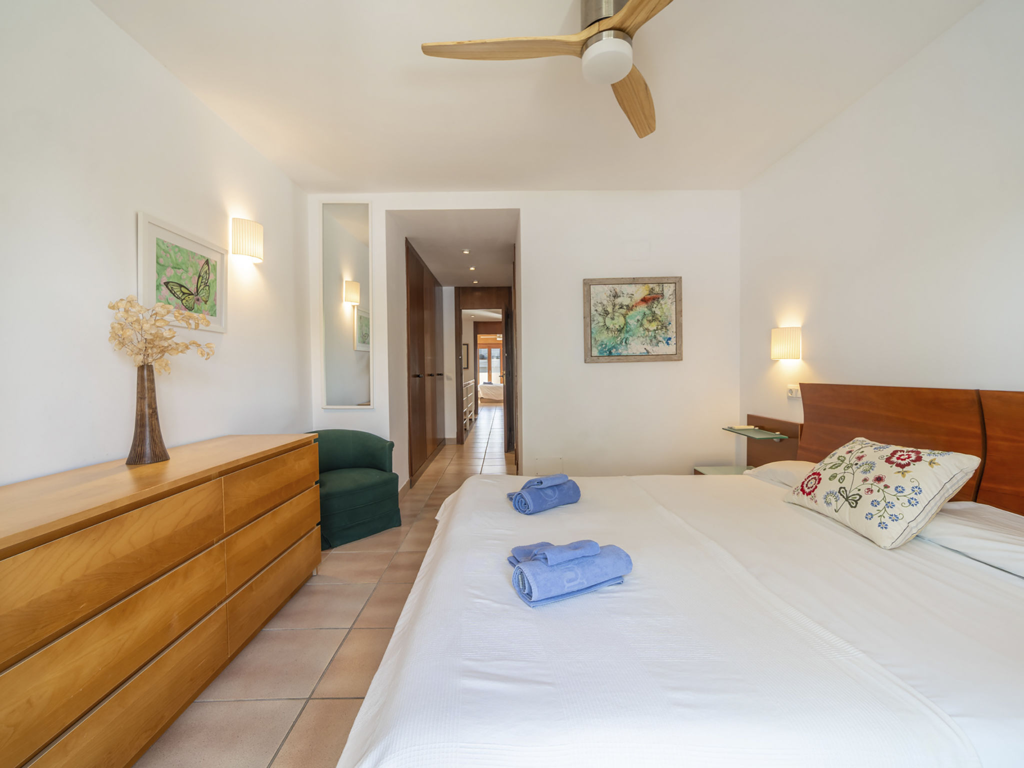 "Es Clot", 5-Zimmer-Doppelhaushälfte 125 m2 auf 2 Stockwerken. Objekt geeignet für 8 Erwachsene. Geräumig und hell, sehr komfortabel und geschmackvoll eingerichtet: grosses Wohn-/Esszimmer mit Schiebetür, Panoramafenster mit Esstisch, Sat-TV, Klimaanlage und Warmluftheizung. Ausgang zum Gartensitzplatz. Küche (Backofen, Geschirrspüler, 3 Glaskeramikherd Platten, Toaster, Wasserkocher, Mikrowelle, Tiefkühler, elektrische Kaffeemaschine) mit Esstisch. Bad/WC. Obergeschoss: 1 grosses Doppelzimmer mit Schiebetür, Panoramafenster mit 1 franz. Bett, Bad/Dusche/WC, Klimaanlage und Warmluftheizung. Ausgang zum Balkon. 1 Doppelzimmer mit Panoramafenster mit 1 x 2 Etagenbetten (90 cm), Klimaanlage und Warmluftheizung. 2 Zimmer mit Panoramafenster, jedes Zimmer mit 1 Ausziehbett (2 Pers. 2 x 90 cm), Klimaanlage und Warmluftheizung. Bad/WC mit Eckbadewanne. Gartensitzplatz, Rasen. Terrassenmöbel, Gartengrill, Liegestühle, Loggia. Herrliche Sicht auf das Meer und die Berge. Zur Verfügung: Waschmaschine, Bügeleisen, Kinderhochstuhl, Babybett, Haartrockner. Internet (Wireless LAN, gratis). Parkplatz (eingezäunt), Garage. Geeignet für Familien. L95E21742