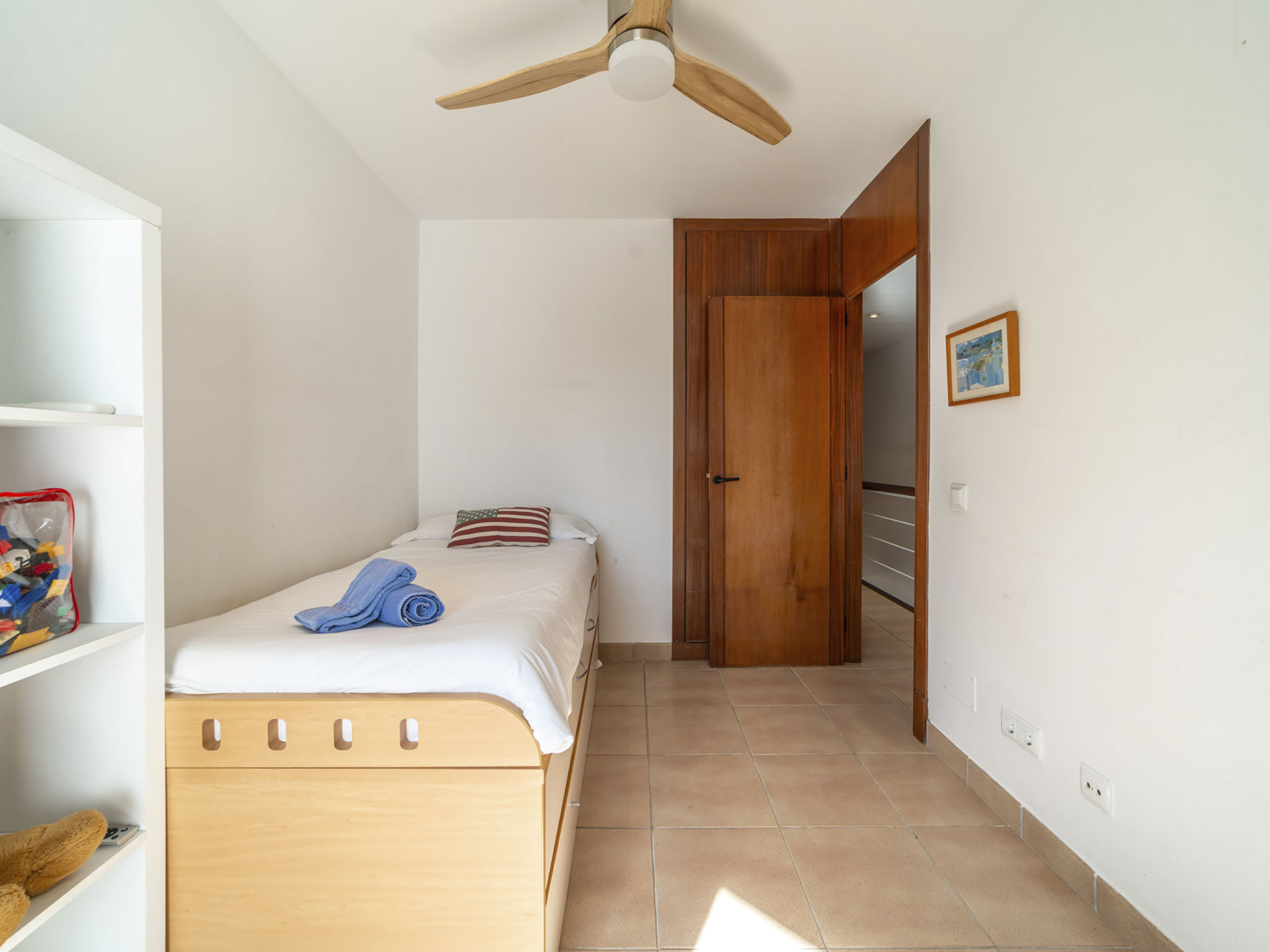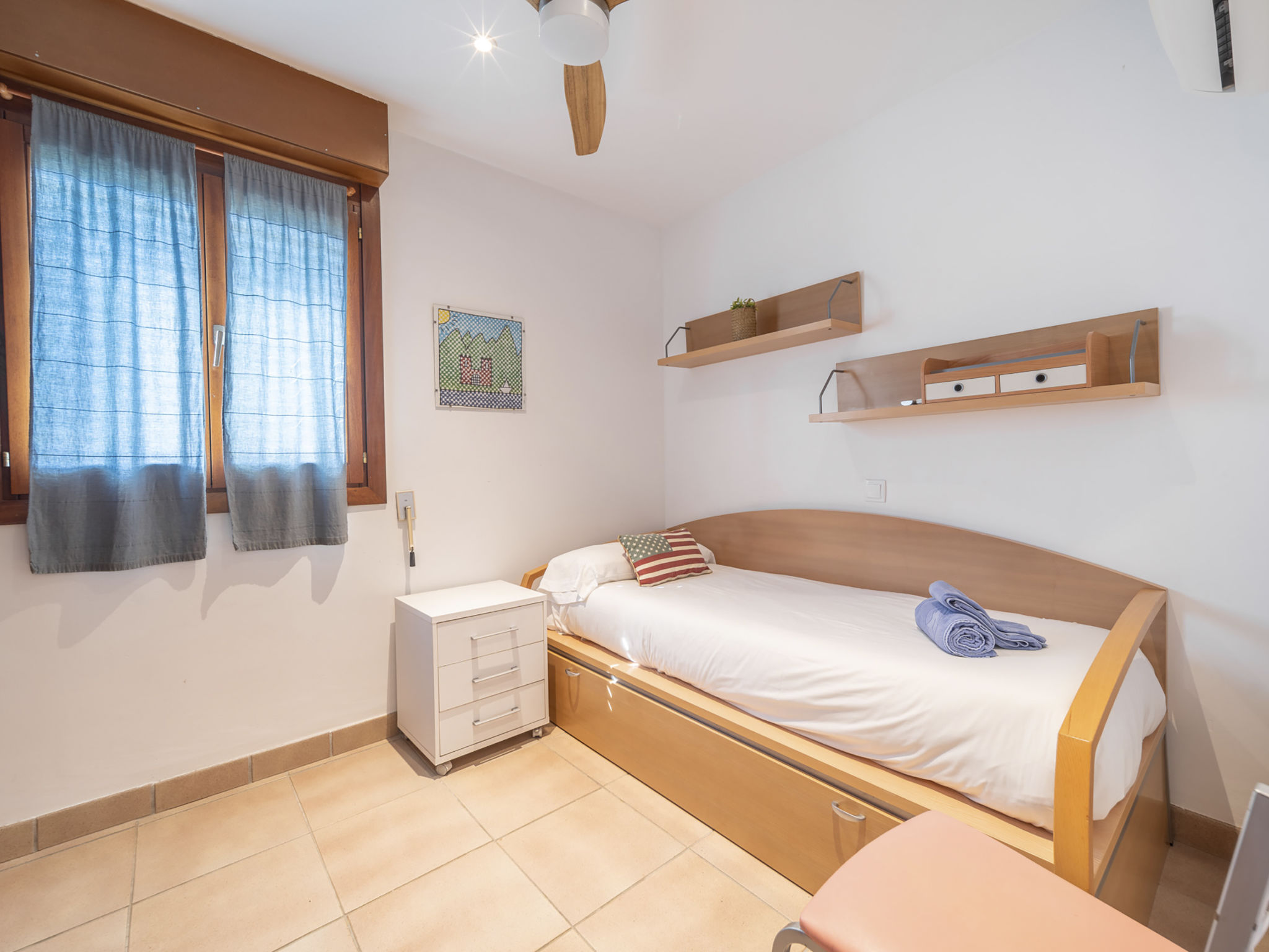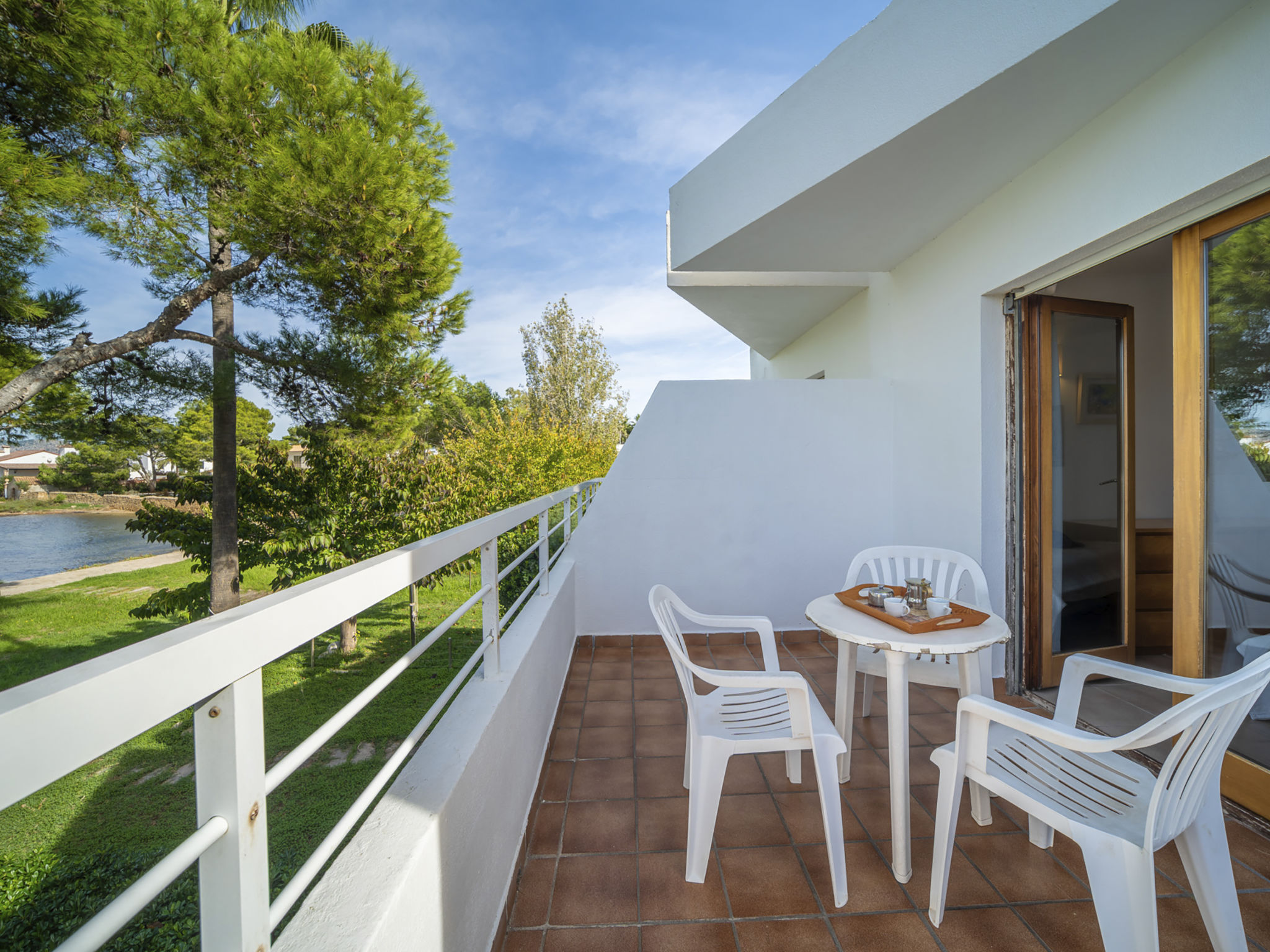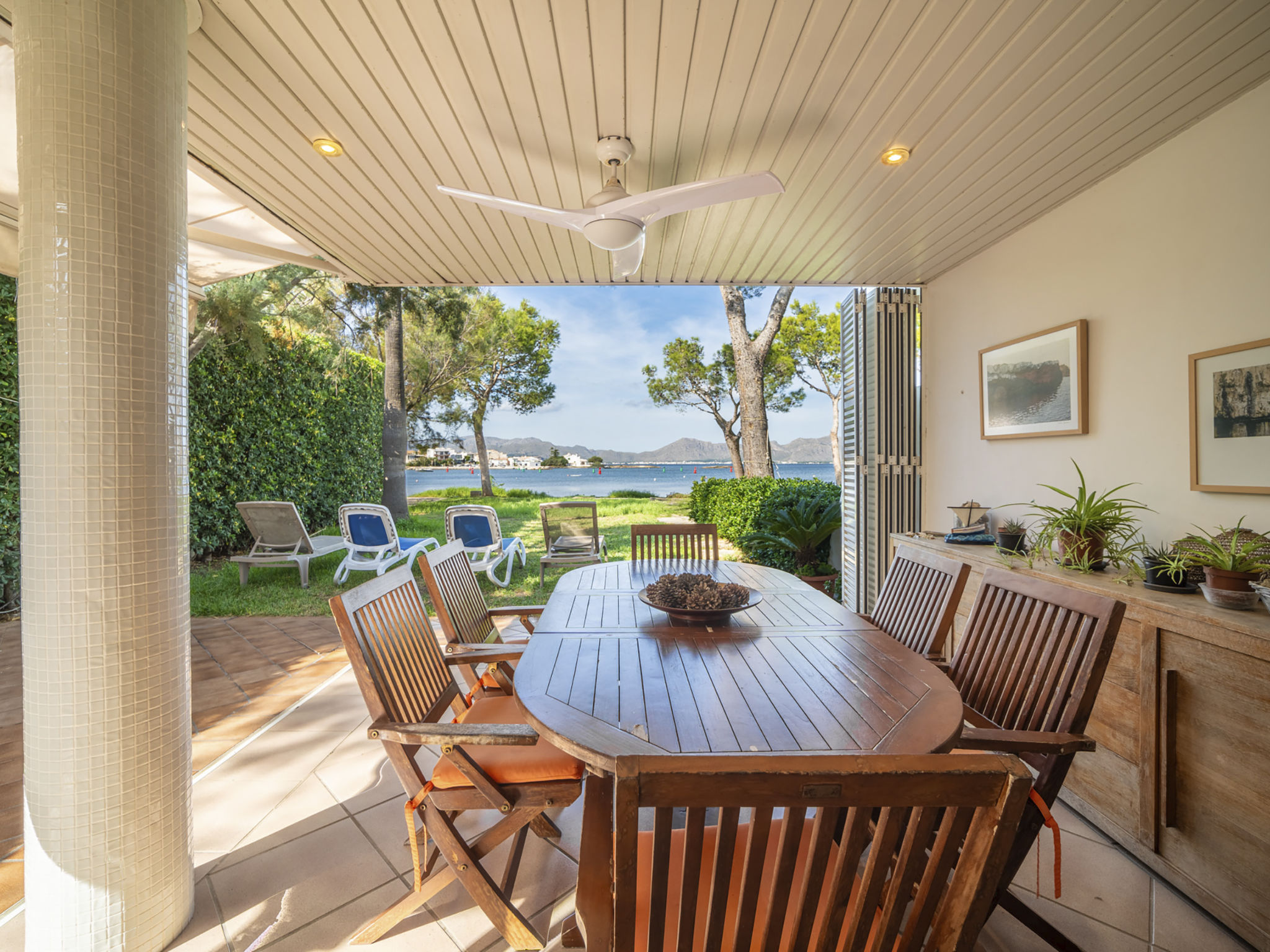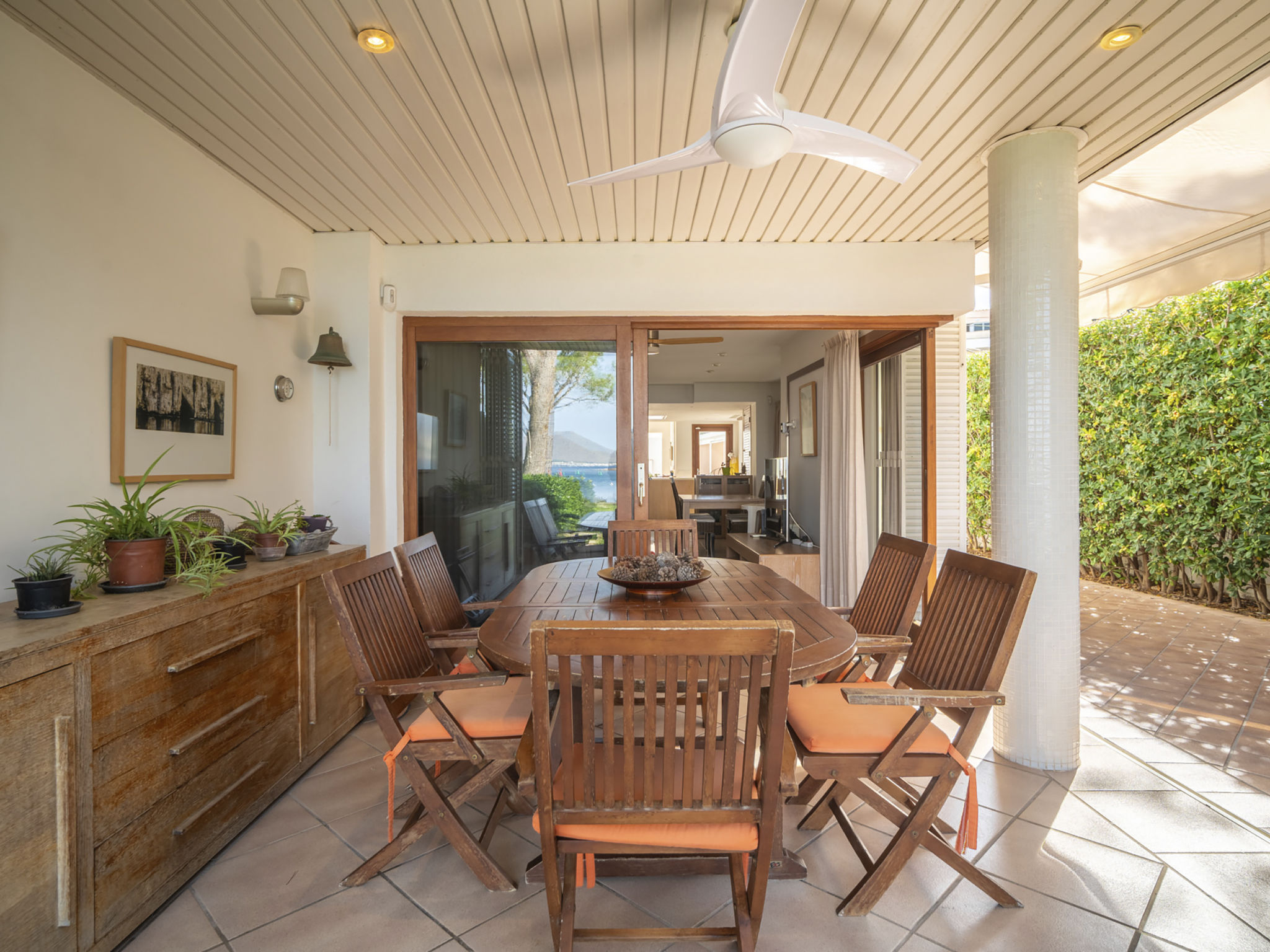 "Es Clot", 5-Zimmer-Doppelhaushälfte 125 m2 auf 2 Stockwerken. Objekt geeignet für 8 Erwachsene. Geräumig und hell, sehr komfortabel und geschmackvoll eingerichtet: grosses Wohn-/Esszimmer mit Schiebetür, Panoramafenster mit Esstisch, Sat-TV, Klimaanlage und Warmluftheizung. Ausgang zum Gartensitzplatz. Küche (Backofen, Geschirrspüler, 3 Glaskeramikherd Platten, Toaster, Wasserkocher, Mikrowelle, Tiefkühler, elektrische Kaffeemaschine) mit Esstisch. Bad/WC. Obergeschoss: 1 grosses Doppelzimmer mit Schiebetür, Panoramafenster mit 1 franz. Bett, Bad/Dusche/WC, Klimaanlage und Warmluftheizung. Ausgang zum Balkon. 1 Doppelzimmer mit Panoramafenster mit 1 x 2 Etagenbetten (90 cm), Klimaanlage und Warmluftheizung. 2 Zimmer mit Panoramafenster, jedes Zimmer mit 1 Ausziehbett (2 Pers. 2 x 90 cm), Klimaanlage und Warmluftheizung. Bad/WC mit Eckbadewanne. Gartensitzplatz, Rasen. Terrassenmöbel, Gartengrill, Liegestühle, Loggia. Herrliche Sicht auf das Meer und die Berge. Zur Verfügung: Waschmaschine, Bügeleisen, Kinderhochstuhl, Babybett, Haartrockner. Internet (Wireless LAN, gratis). Parkplatz (eingezäunt), Garage. Geeignet für Familien. L95E21742