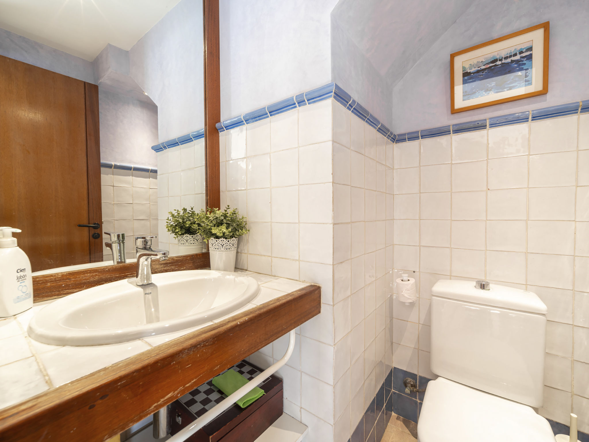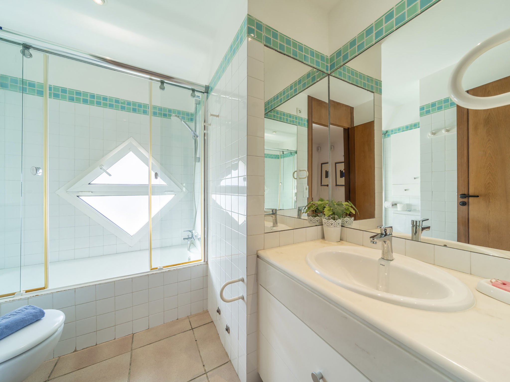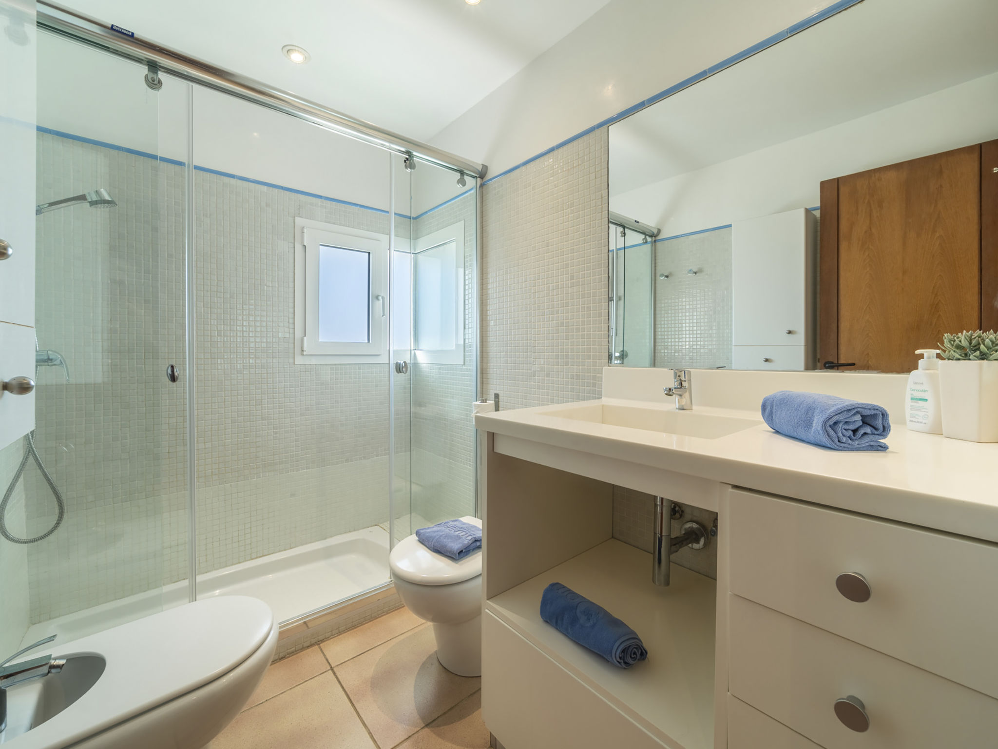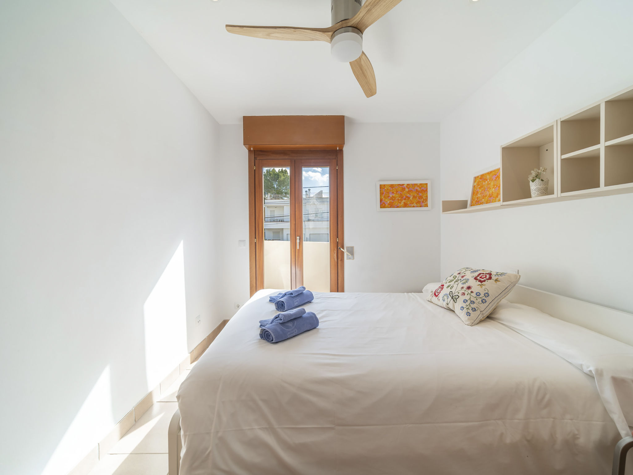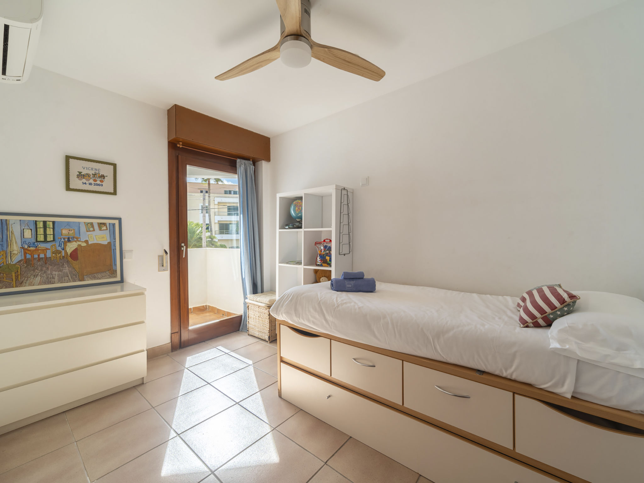 "Es Clot", 5-Zimmer-Doppelhaushälfte 125 m2 auf 2 Stockwerken. Objekt geeignet für 8 Erwachsene. Geräumig und hell, sehr komfortabel und geschmackvoll eingerichtet: grosses Wohn-/Esszimmer mit Schiebetür, Panoramafenster mit Esstisch, Sat-TV, Klimaanlage und Warmluftheizung. Ausgang zum Gartensitzplatz. Küche (Backofen, Geschirrspüler, 3 Glaskeramikherd Platten, Toaster, Wasserkocher, Mikrowelle, Tiefkühler, elektrische Kaffeemaschine) mit Esstisch. Bad/WC. Obergeschoss: 1 grosses Doppelzimmer mit Schiebetür, Panoramafenster mit 1 franz. Bett, Bad/Dusche/WC, Klimaanlage und Warmluftheizung. Ausgang zum Balkon. 1 Doppelzimmer mit Panoramafenster mit 1 x 2 Etagenbetten (90 cm), Klimaanlage und Warmluftheizung. 2 Zimmer mit Panoramafenster, jedes Zimmer mit 1 Ausziehbett (2 Pers. 2 x 90 cm), Klimaanlage und Warmluftheizung. Bad/WC mit Eckbadewanne. Gartensitzplatz, Rasen. Terrassenmöbel, Gartengrill, Liegestühle, Loggia. Herrliche Sicht auf das Meer und die Berge. Zur Verfügung: Waschmaschine, Bügeleisen, Kinderhochstuhl, Babybett, Haartrockner. Internet (Wireless LAN, gratis). Parkplatz (eingezäunt), Garage. Geeignet für Familien. L95E21742