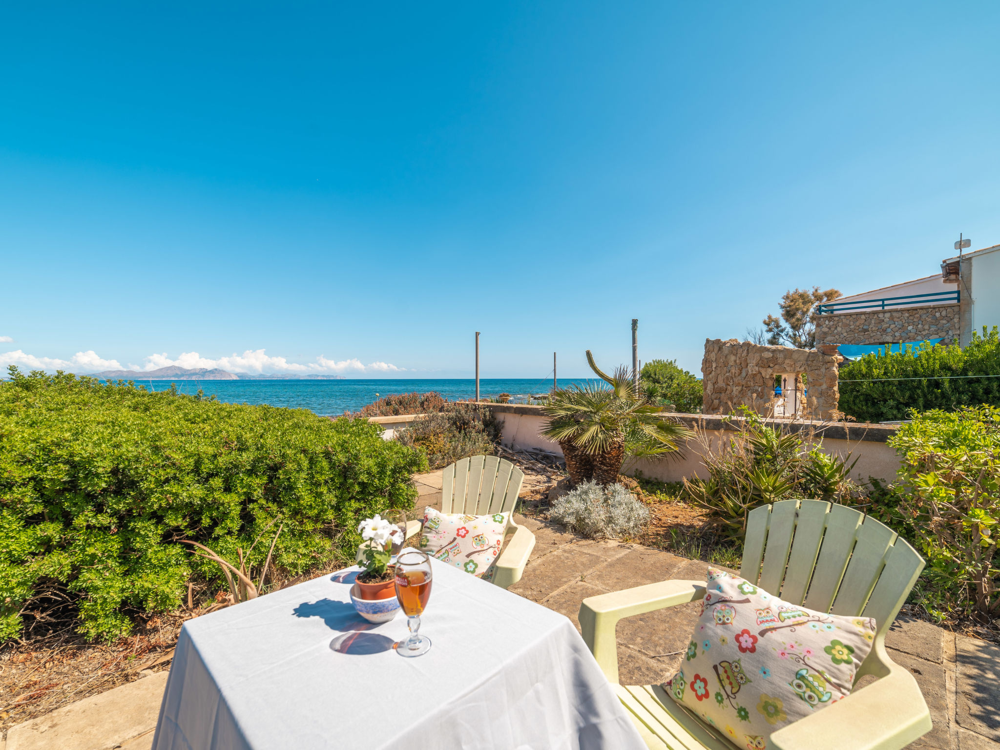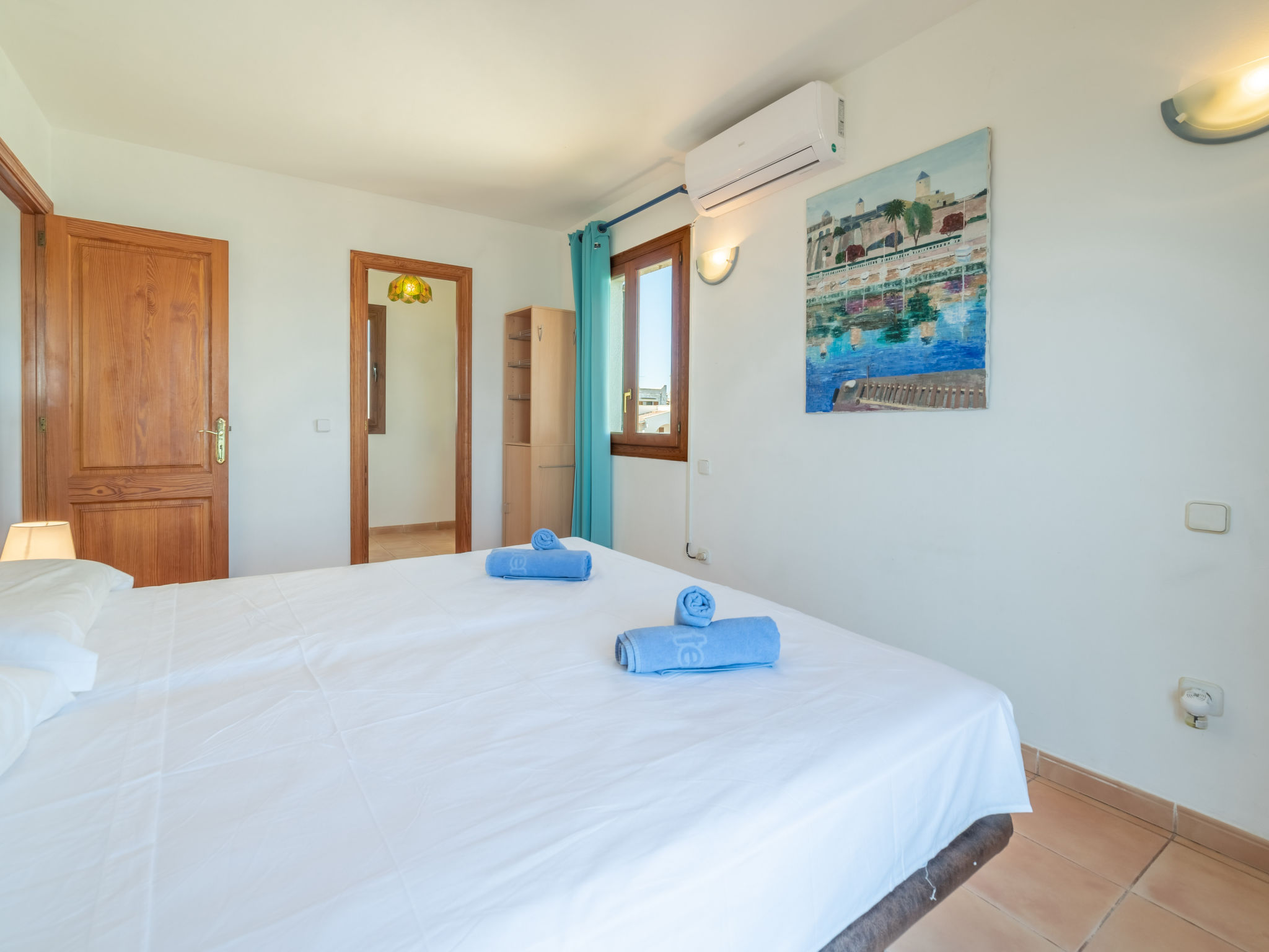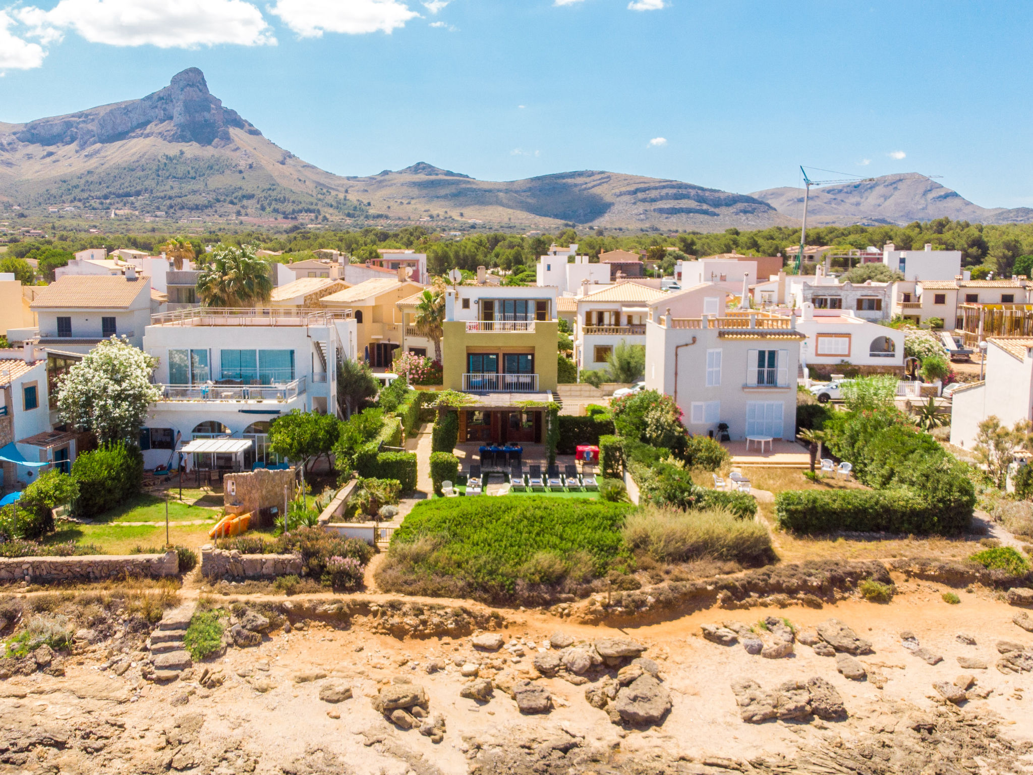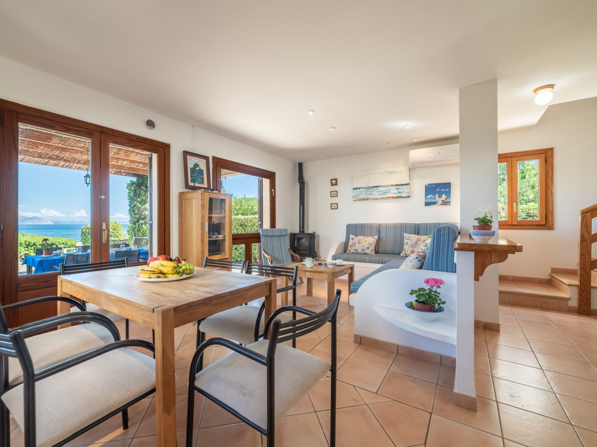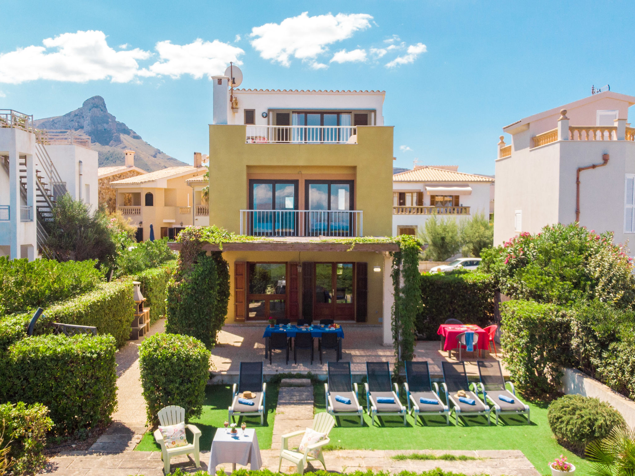 "Ran de Mar", 4-Zimmer-Haus 120 m2 auf 3 Stockwerken. Objekt geeignet für 6 Erwachsene. Geräumig und hell, sehr zweckmässig und gemütlich eingerichtet: Wohn-/Esszimmer mit Panoramafenster mit Digital-TV, Internationale TV-Sender, Holzofen, Klimaanlage und Warmluftheizung. Ausgang zum Gartensitzplatz. Offene Küche (Backofen, Geschirrspüler, 3 Glaskeramikherd Platten, Toaster, Wasserkocher, Mikrowelle, Tiefkühler, elektrische Kaffeemaschine) mit Bar. Dusche/WC. Obergeschoss: 1 grosses Doppelzimmer mit Schiebetür begehbarer Kleiderschrank mit 1 franz. Bett (180 cm, Länge 200 cm), Klimaanlage und Warmluftheizung. Ausgang zum Balkon. 1 Doppelzimmer mit Schiebetür mit 2 Betten (90 cm, Länge 190 cm), Klimaanlage und Warmluftheizung. Ausgang zum Balkon. Dusche/WC. 2. Obergeschoss: 1 abgeschrägtes grosses Doppelzimmer mit Schiebetür, Panoramafenster mit 2 Betten (90 cm, Länge 190 cm), Klimaanlage und Warmluftheizung. Ausgang zur Terrasse. Balkon, Terrasse, grosser Gartensitzplatz, Rasen, Laube. Terrassenmöbel, Balkonmöbel, Gartengrill, Liegestühle, Loggia. Herrliche Panoramasicht auf das Meer, die Berge und die Bucht. Zur Verfügung: Waschmaschine, Bügeleisen, Kinderhochstuhl, Babybett, Haartrockner. Internet (Wireless LAN, gratis). Geeignet für Familien. ETV1056