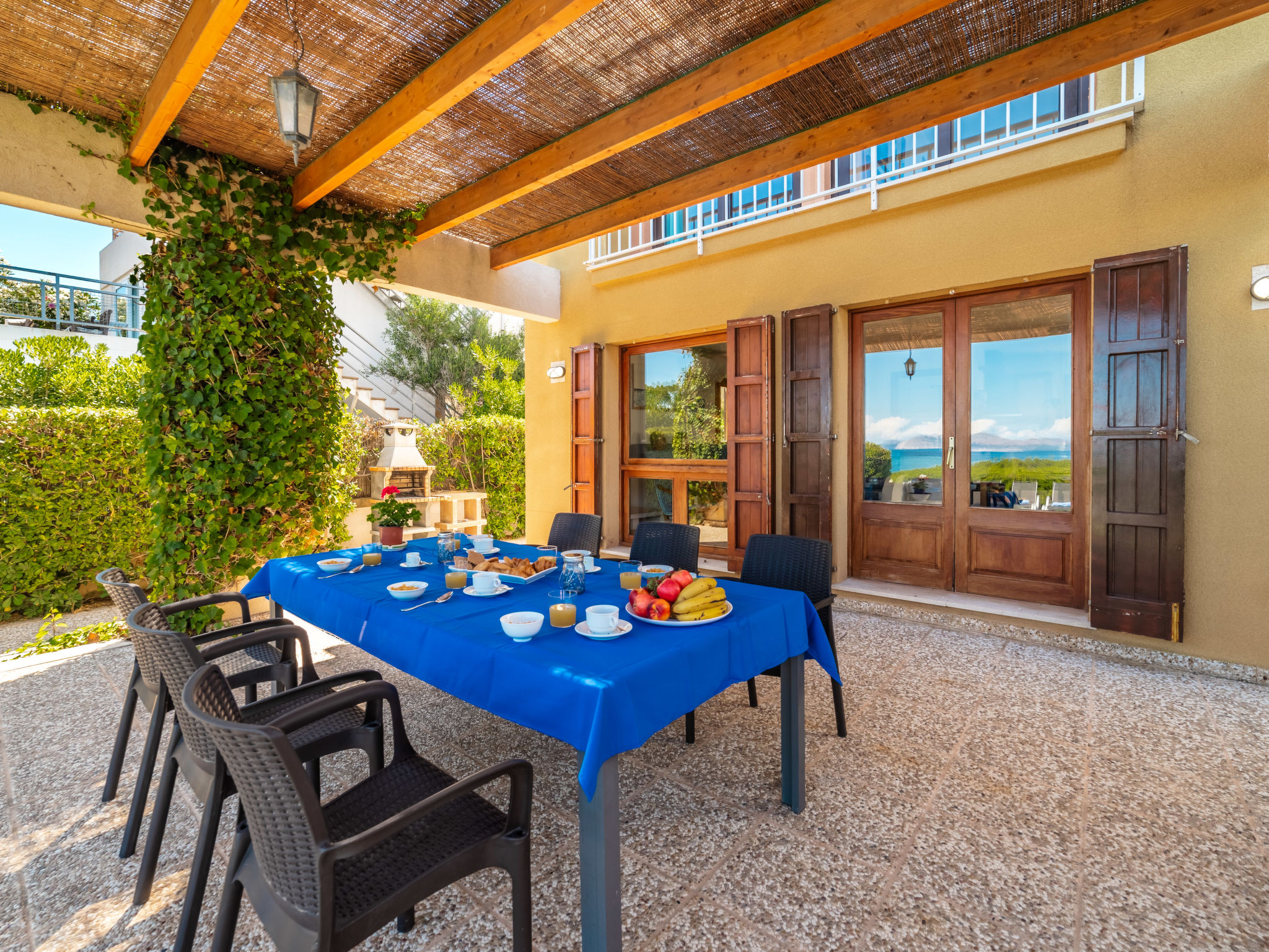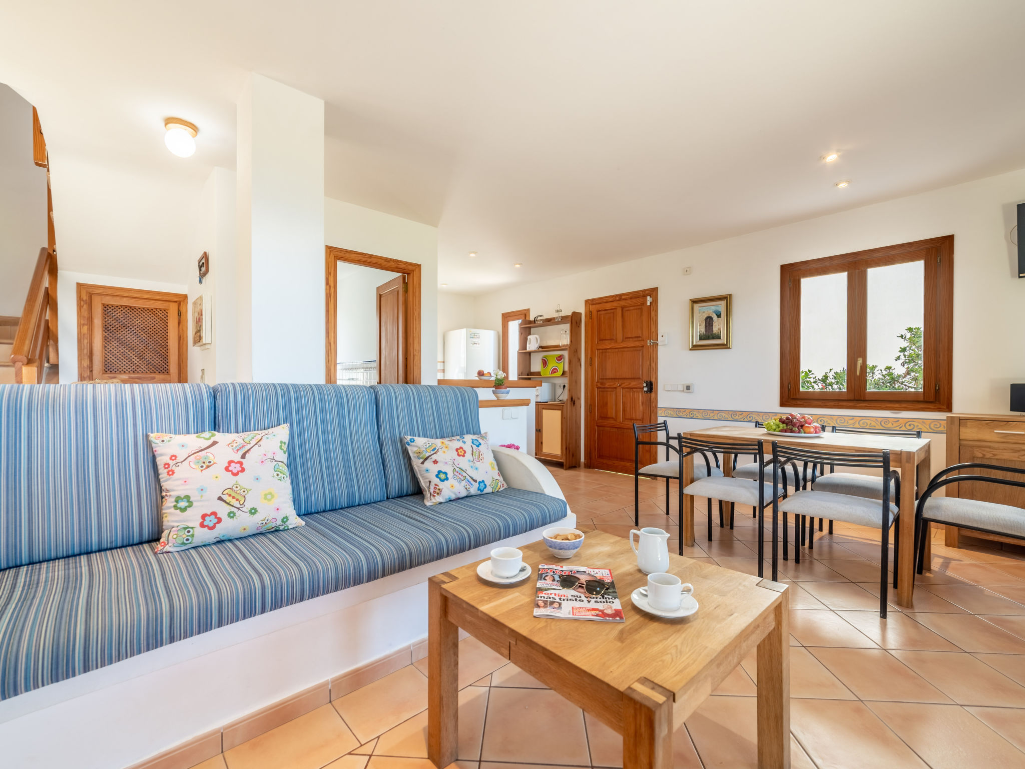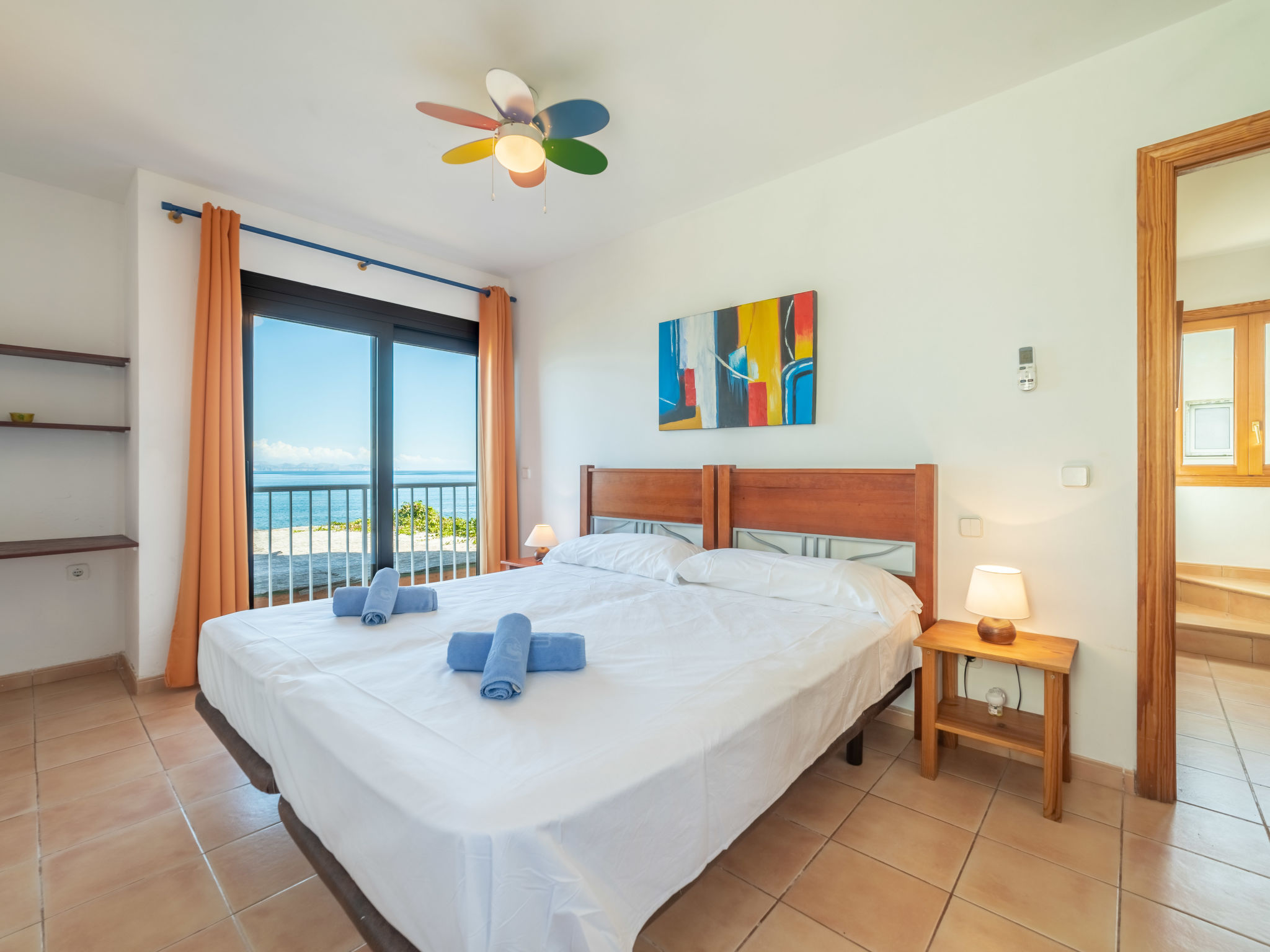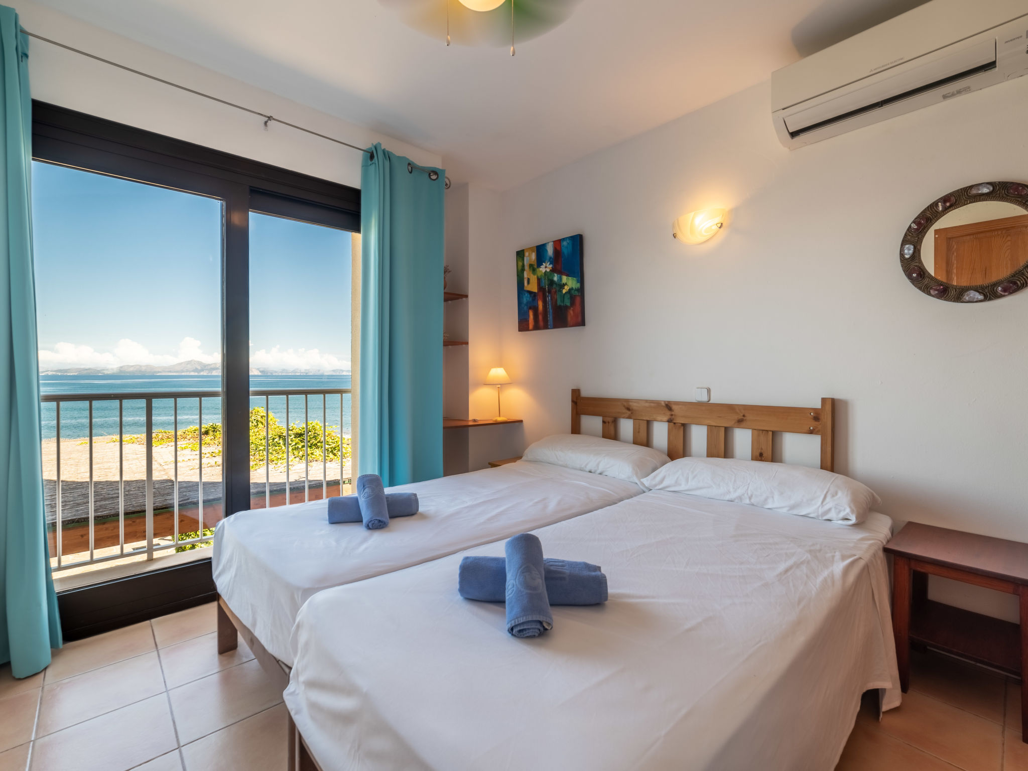 "Ran de Mar", 4-Zimmer-Haus 120 m2 auf 3 Stockwerken. Objekt geeignet für 6 Erwachsene. Geräumig und hell, sehr zweckmässig und gemütlich eingerichtet: Wohn-/Esszimmer mit Panoramafenster mit Digital-TV, Internationale TV-Sender, Holzofen, Klimaanlage und Warmluftheizung. Ausgang zum Gartensitzplatz. Offene Küche (Backofen, Geschirrspüler, 3 Glaskeramikherd Platten, Toaster, Wasserkocher, Mikrowelle, Tiefkühler, elektrische Kaffeemaschine) mit Bar. Dusche/WC. Obergeschoss: 1 grosses Doppelzimmer mit Schiebetür begehbarer Kleiderschrank mit 1 franz. Bett (180 cm, Länge 200 cm), Klimaanlage und Warmluftheizung. Ausgang zum Balkon. 1 Doppelzimmer mit Schiebetür mit 2 Betten (90 cm, Länge 190 cm), Klimaanlage und Warmluftheizung. Ausgang zum Balkon. Dusche/WC. 2. Obergeschoss: 1 abgeschrägtes grosses Doppelzimmer mit Schiebetür, Panoramafenster mit 2 Betten (90 cm, Länge 190 cm), Klimaanlage und Warmluftheizung. Ausgang zur Terrasse. Balkon, Terrasse, grosser Gartensitzplatz, Rasen, Laube. Terrassenmöbel, Balkonmöbel, Gartengrill, Liegestühle, Loggia. Herrliche Panoramasicht auf das Meer, die Berge und die Bucht. Zur Verfügung: Waschmaschine, Bügeleisen, Kinderhochstuhl, Babybett, Haartrockner. Internet (Wireless LAN, gratis). Geeignet für Familien. ETV1056
