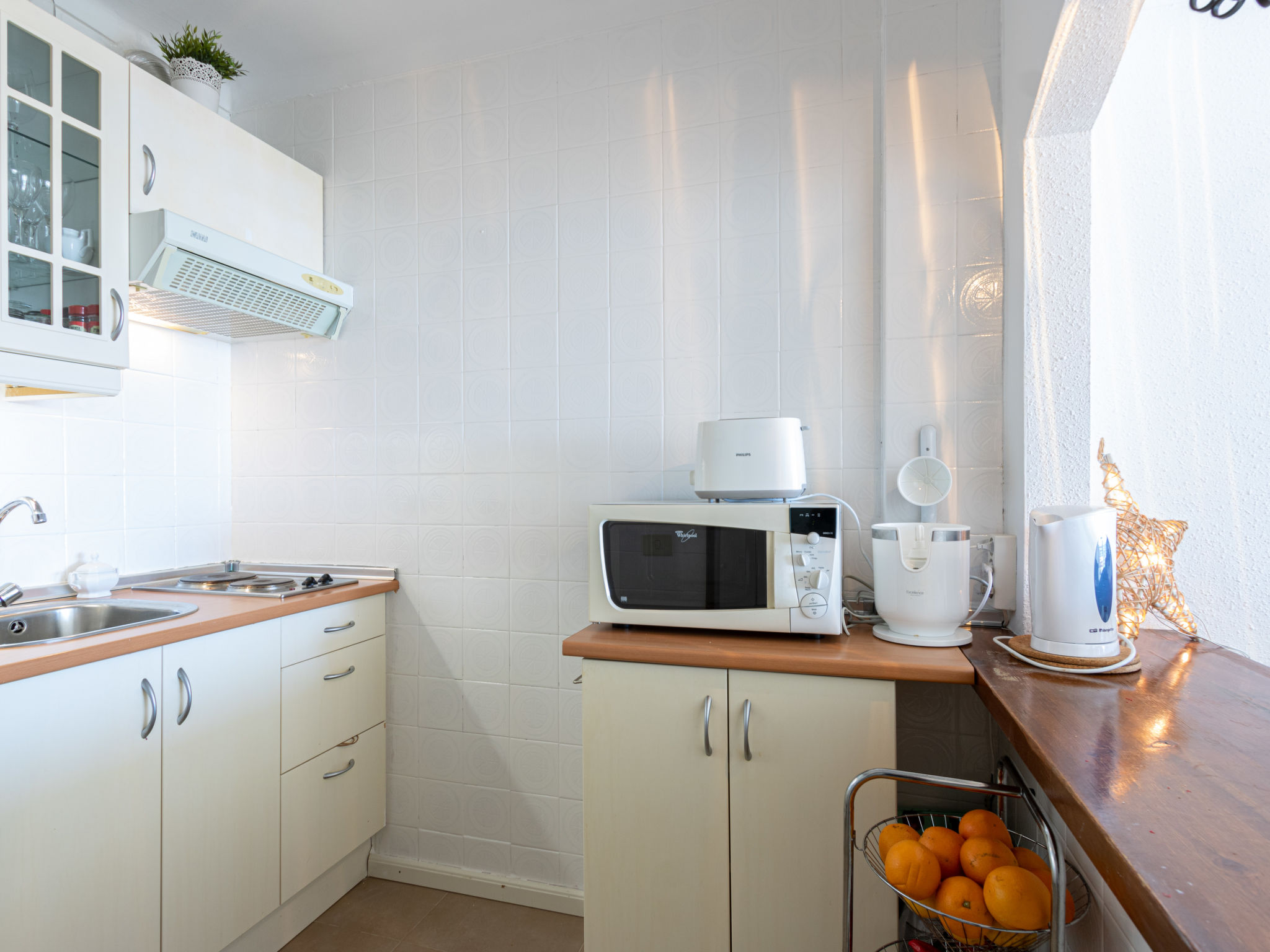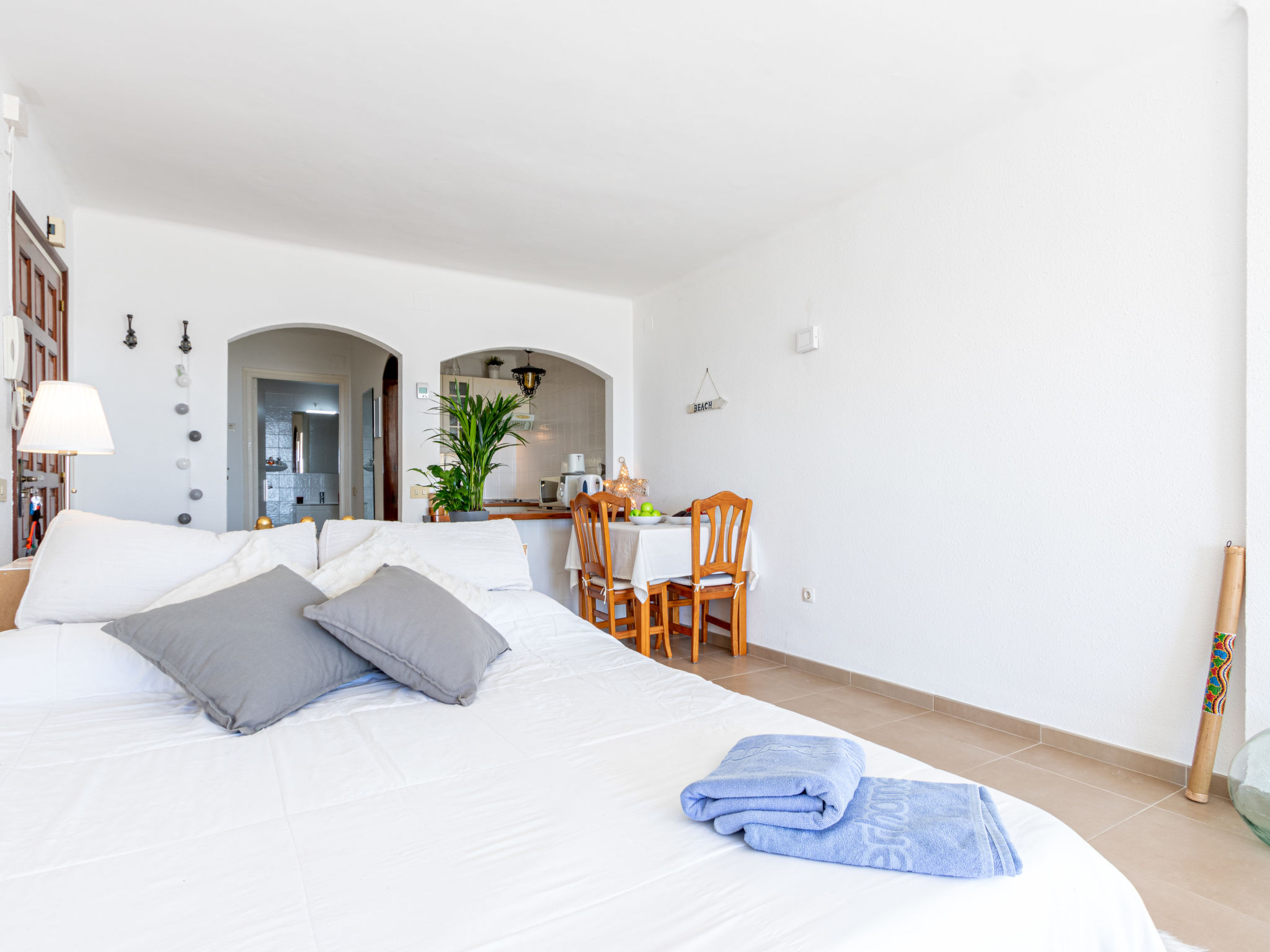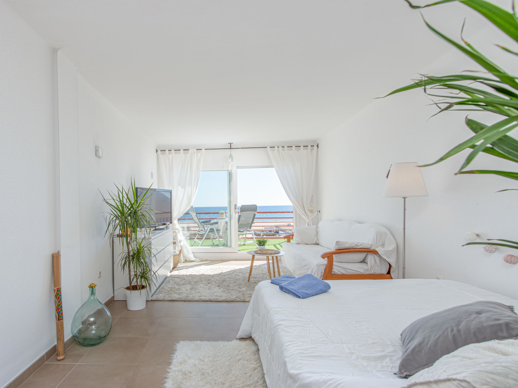 1-Zimmer-Studio 40 m2, Südostlage. Hell, zweckmässig eingerichtet: Wohn-/Schlafzimmer mit 1 franz. Bett (140 cm, Länge 190 cm), Esstisch und Ventilator. Ausgang zum Balkon, Richtung Süden und Richtung Osten. Kleine Küche (2 Kochplatten, Toaster, Wasserkocher, Mikrowelle, elektrische Kaffeemaschine). Dusche/WC. Terrasse 8 m2. Terrassenmöbel. Panoramasicht auf das Meer. Zur Verfügung: Waschmaschine, Bügeleisen, Haartrockner. Internet (Wireless LAN, gratis). Bitte beachten: Kühlschrank ohne Gefrierfach, Nichtraucher-Unterkunft. 1 kleines Haustier/Hund erlaubt. TV nur DE, ES, FR. HUTG018788
