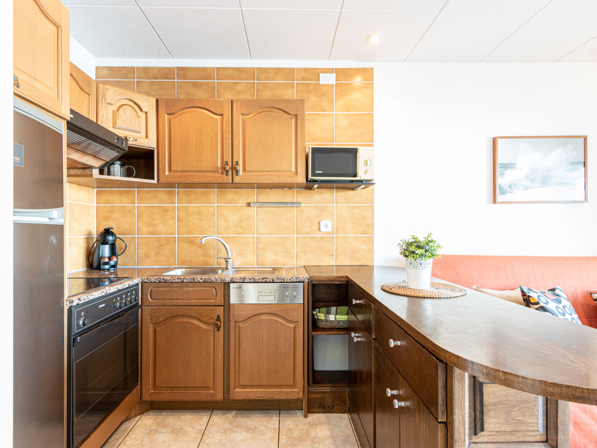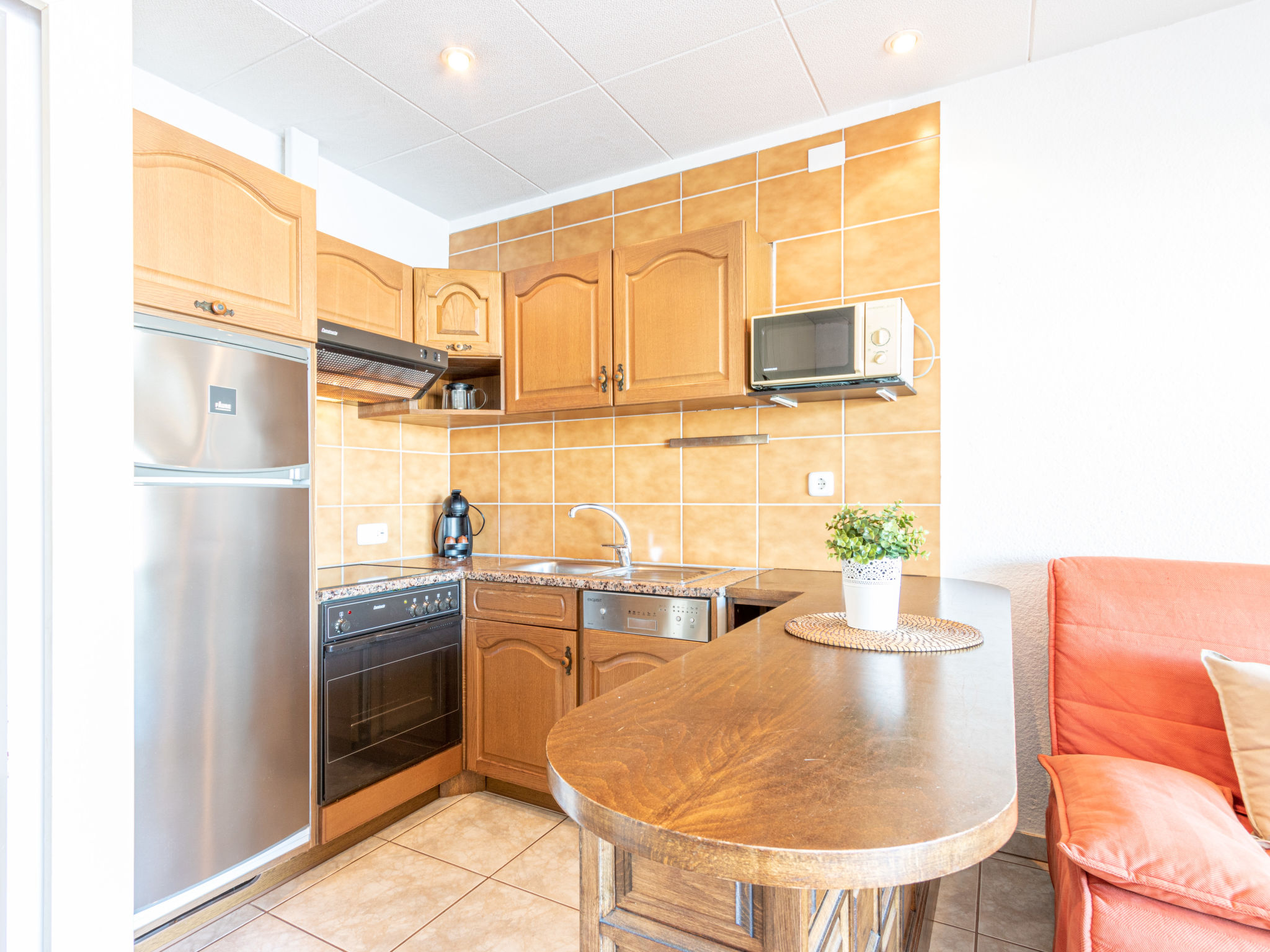 2-Zimmer-Wohnung 50 m2, im Erdgeschoss. Wohn-/Esszimmer mit 1 Diwanbett, TV, Sat-TV, Klimaanlage und Warmluftheizung. Ausgang zur Terrasse. 1 Zimmer mit 1 Doppelbett (2 x 80 cm, Länge 190 cm). Kochnische (Backofen, Geschirrspüler, 4 Glaskeramikherd Platten, Toaster, Wasserkocher, Mikrowelle, Tiefkühler, elektrische Kaffeemaschine, Kapseln für die Kaffeemaschine (Dolce Gusto) extra). Dusche/WC. Terrasse 15 m2, Nordlage, kleine Terrasse 8 m2, Südlage. Balkonmöbel. Schöne Sicht auf den Kanal. Zur Verfügung: Waschmaschine, Bügeleisen, Kinderhochstuhl, Babybett, Haartrockner. Internet (Wireless LAN, gratis). Bitte beachten: Nichtraucher-Unterkunft. 1 Haustier/Hund erlaubt. TV nur FR, DE, ES. HUTG008723