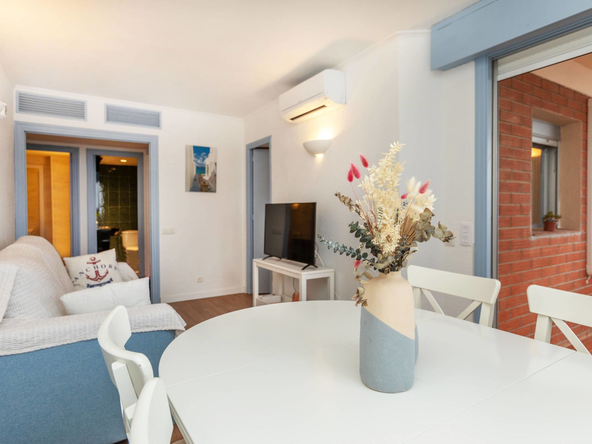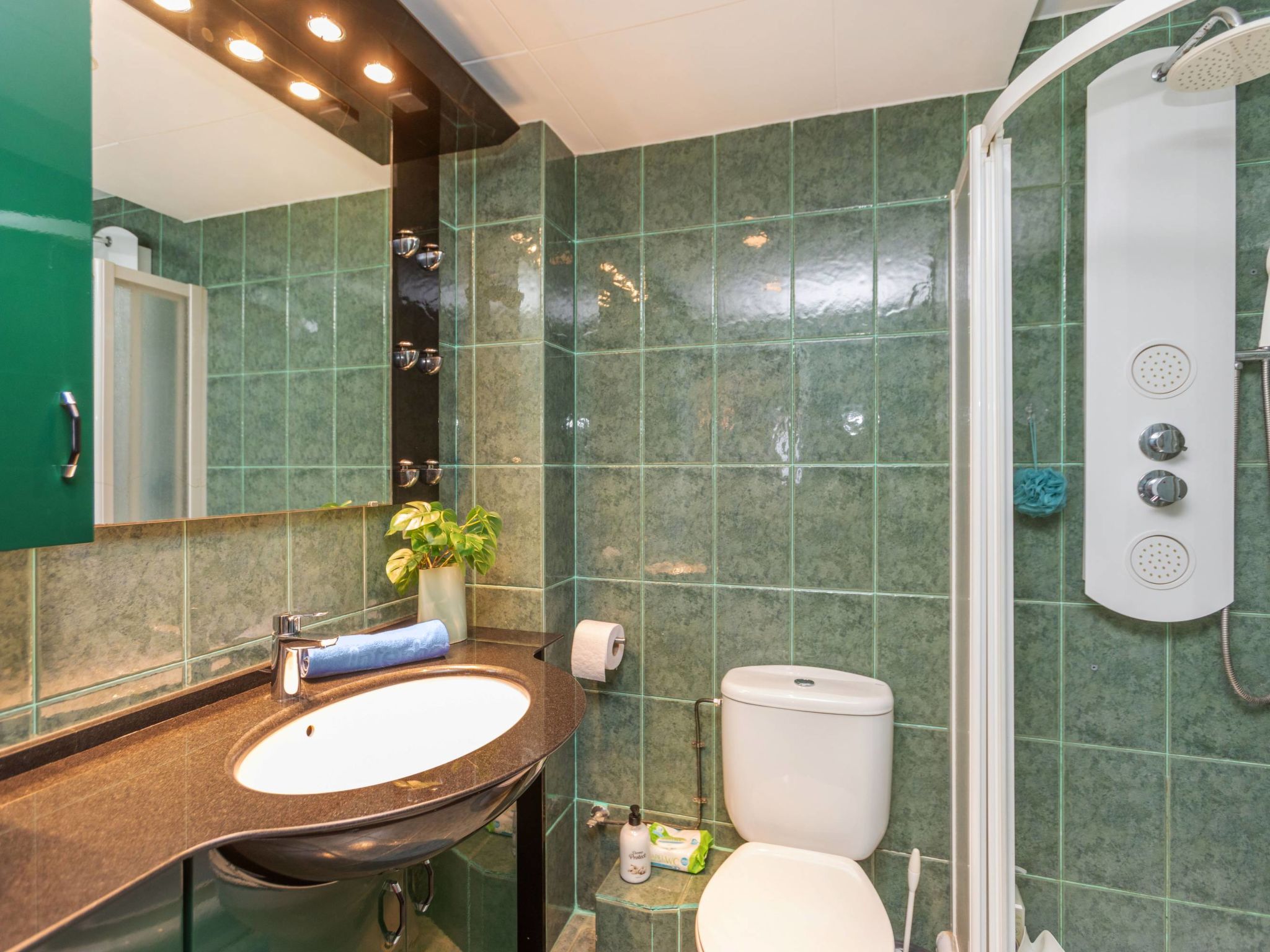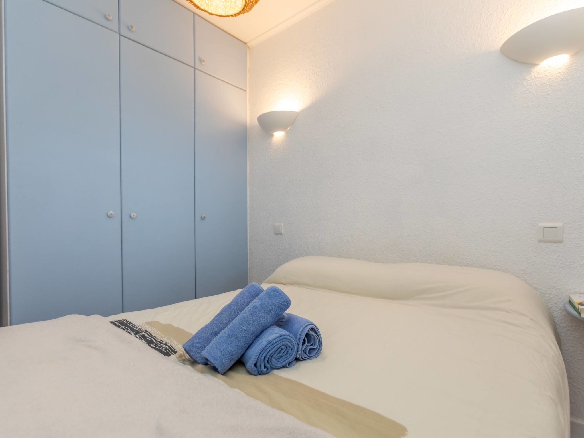 "Residencial Cap Salou", 2-Zimmer-Wohnung 69 m2 im 3. Stock. Zweckmässig und komfortabel eingerichtet: Wohn-/Esszimmer mit 1 Doppeldiwanbett (1 x 135 cm, Länge 190 cm), Esstisch und Digital-TV. Ausgang zur Loggia. 1 Zimmer mit 1 Doppelbett (135 cm, Länge 190 cm). Küche (4 Kochplatten, Backofen, Toaster, Wasserkocher, Mikrowelle, elektrische Kaffeemaschine). Dusche/WC. Grosse Terrasse. Terrassenmöbel. Sehr schöne Sicht auf das Meer. Zur Verfügung: Waschmaschine, Bügeleisen, Haartrockner. Internet (Wireless LAN). R000000001