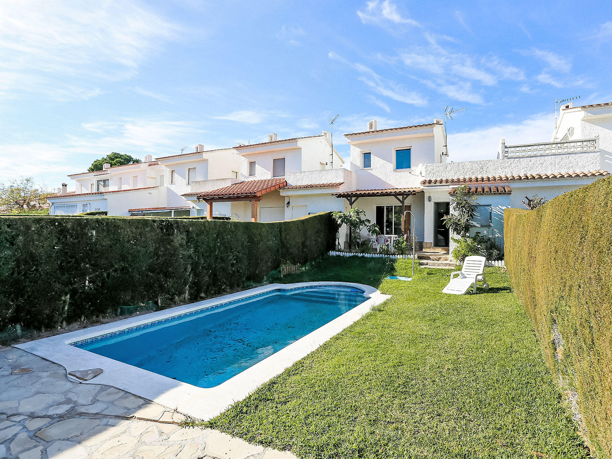 Urb El Casalot 3 km von Miami: Gemütliches Reihenhaus "Montalt VIII", auf 2 Stockwerken. Sonnige Lage, 3.8 km vom Meer, 3.8 km vom Strand. Zur Alleinbenutzung: Garten 50 m2, Schwimmbad eckig (6 x 3 m, 80 - 190 cm tief, 01.06.-30.09.). Terrasse (10 m2), Gartenmöbel, Grill, Poolpflege durch den Besitzer/Gärtner Parkplatz (beschränkte Anzahl). Supermarkt 3 km, Bar 500 m, Bahnstation "Hospitalet" 6 km, Sandstrand 3 km. Golfplatz 2 km. Nahe gelegene Sehenswürdigkeiten: Parque Portaventura 28 km, parque acuático Aquopolis 31 km, parque Natural del Delta del Ebro 53 km, Tarragona 37 km, Reus 30 km, Barcelona 132 km. Bitte beachten: Fahrzeug empfohlen. Jugendgruppen nur auf Anfrage.