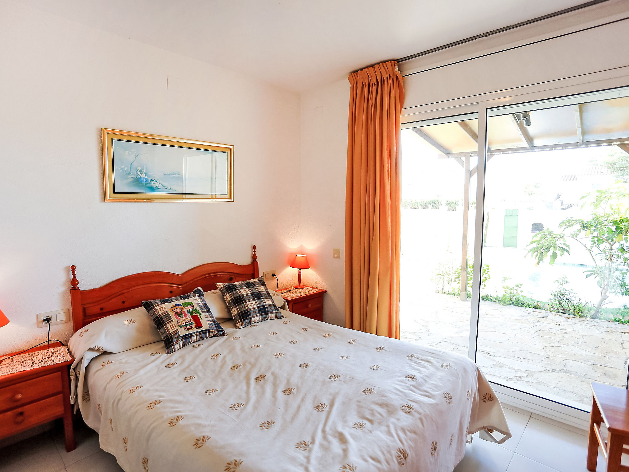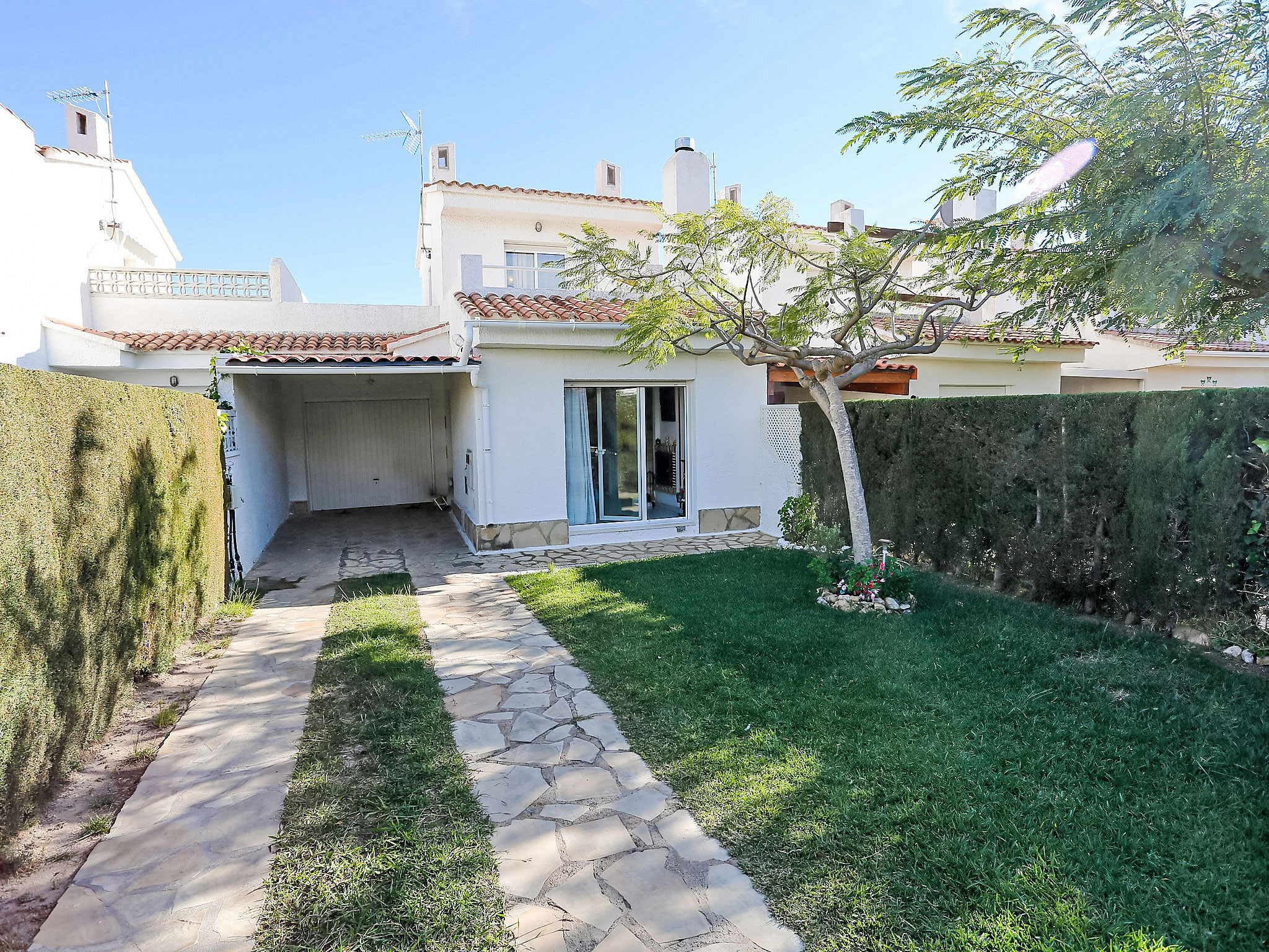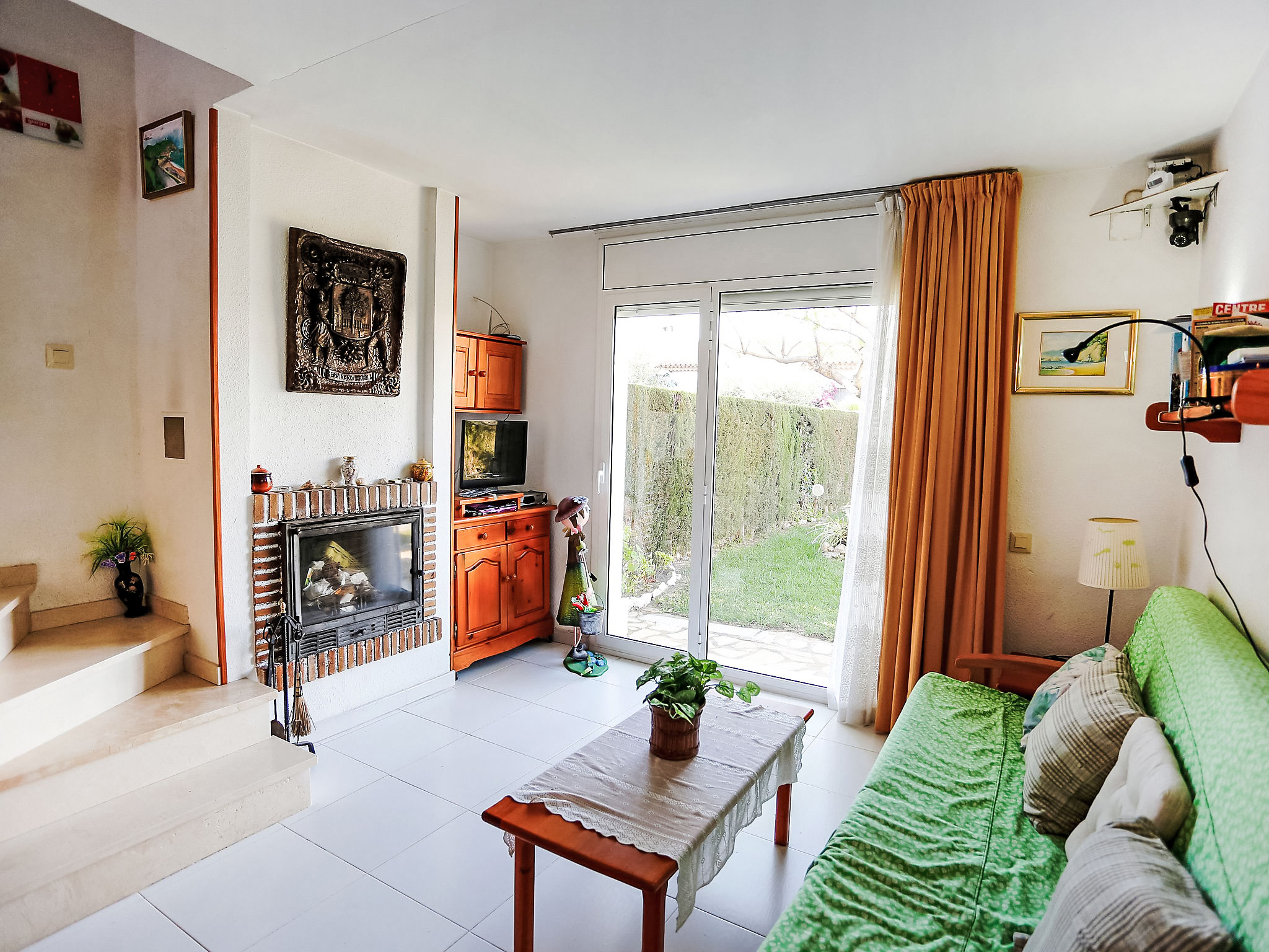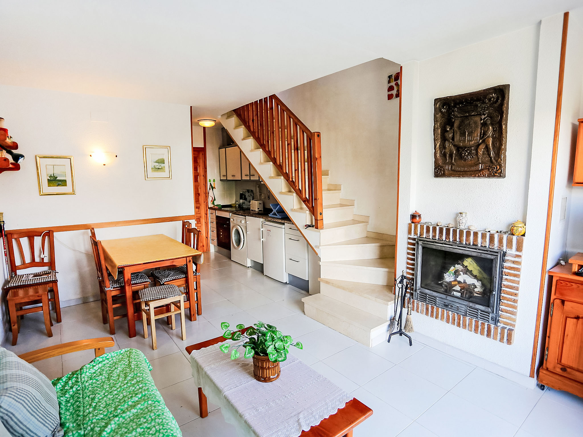 4-Zimmer-Reihenhaus 65 m2 auf 2 Stockwerken. Einfach eingerichtet: Wohn-/Esszimmer mit offenem Kamin, Esstisch, Sat-TV und Digital-TV. Ausgang zum Garten. 1 Zimmer 12 m2 mit 1 franz. Bett (135 cm), Bad/Bidet/WC. Ausgang zum Gartensitzplatz, zum Schwimmbad. Kochnische (Backofen, 4 Glaskeramikherd Platten, Toaster, Wasserkocher, Mikrowelle). Obergeschoss: 1 offenes Zimmer mit 1 Ausziehbett (2 Pers. 2 x 80 cm). Ausgang zur Terrasse. 1 Zimmer 10 m2 mit 2 Betten (90 cm). Ausgang zur Terrasse. Dusche/WC. Terrasse 6 m2, Terrasse 10 m2. Terrassenmöbel, Gartengrill. Zur Verfügung: Waschmaschine, Bügeleisen, Haartrockner. Internet (Wireless LAN, gratis). Parkplatz (eingezäunt, 2 Autos), Garage. Bitte beachten: Maximal 1 Haustier/Hund erlaubt. TV nur ES, DE, FR. HUTT004608