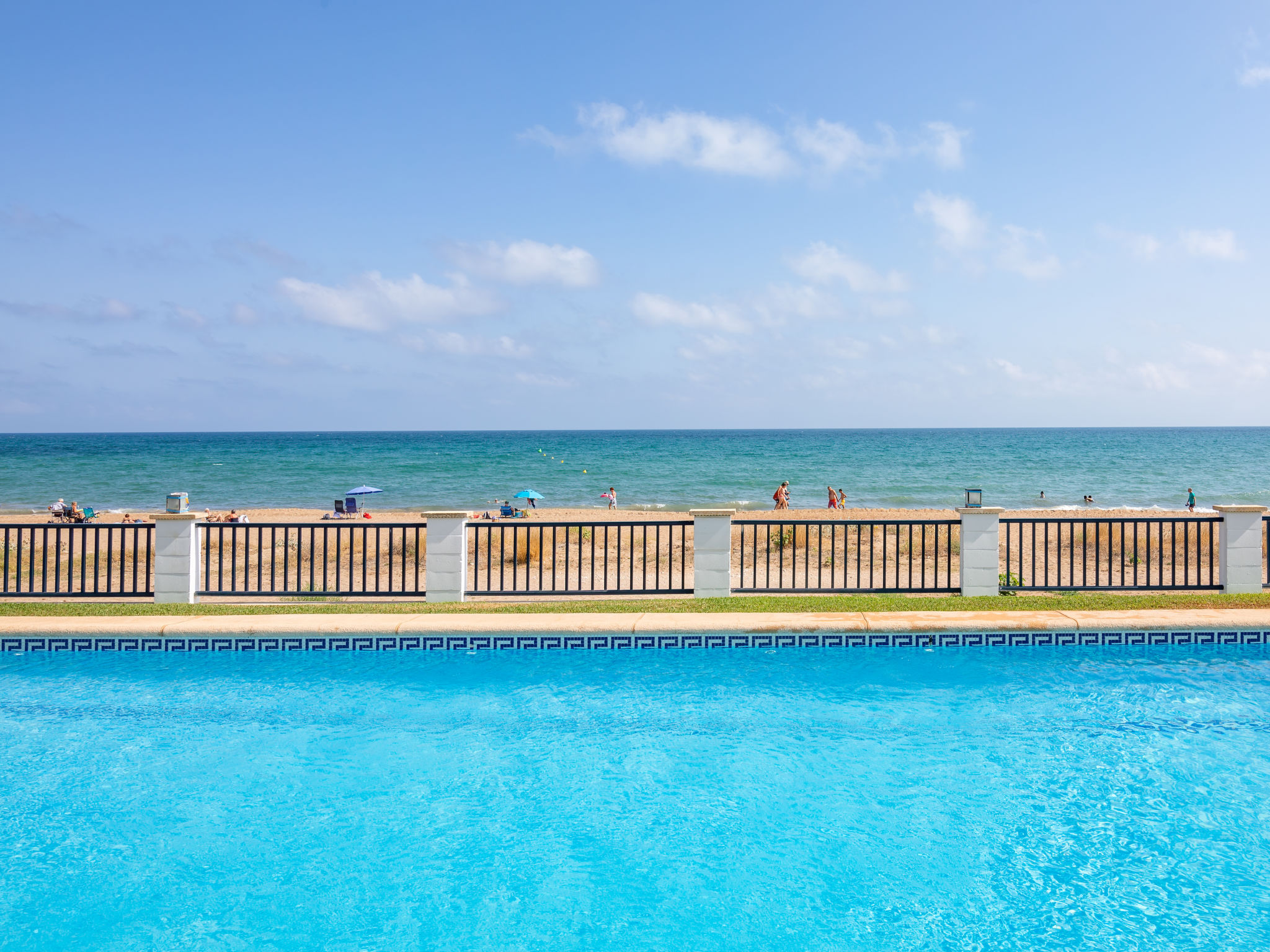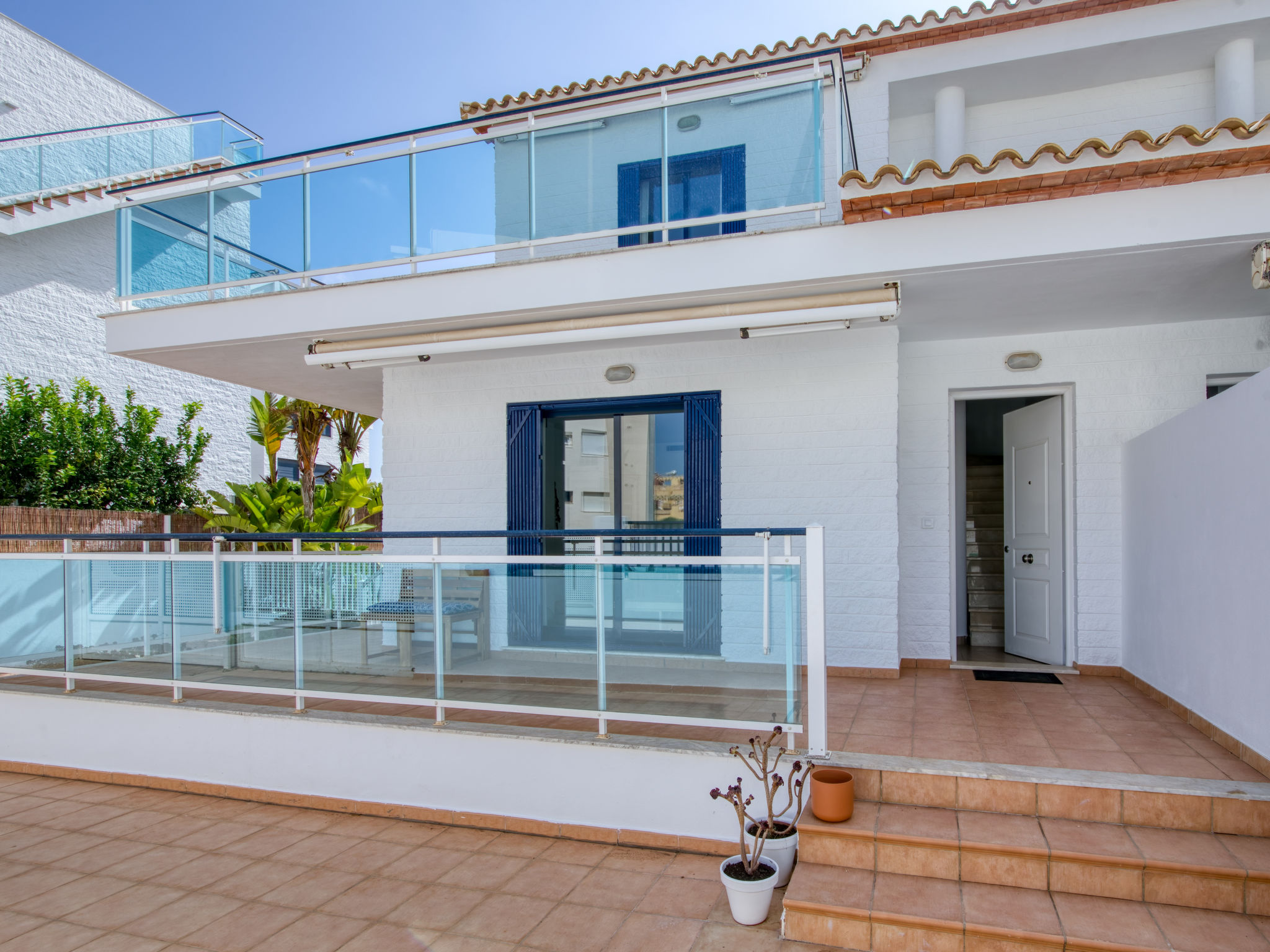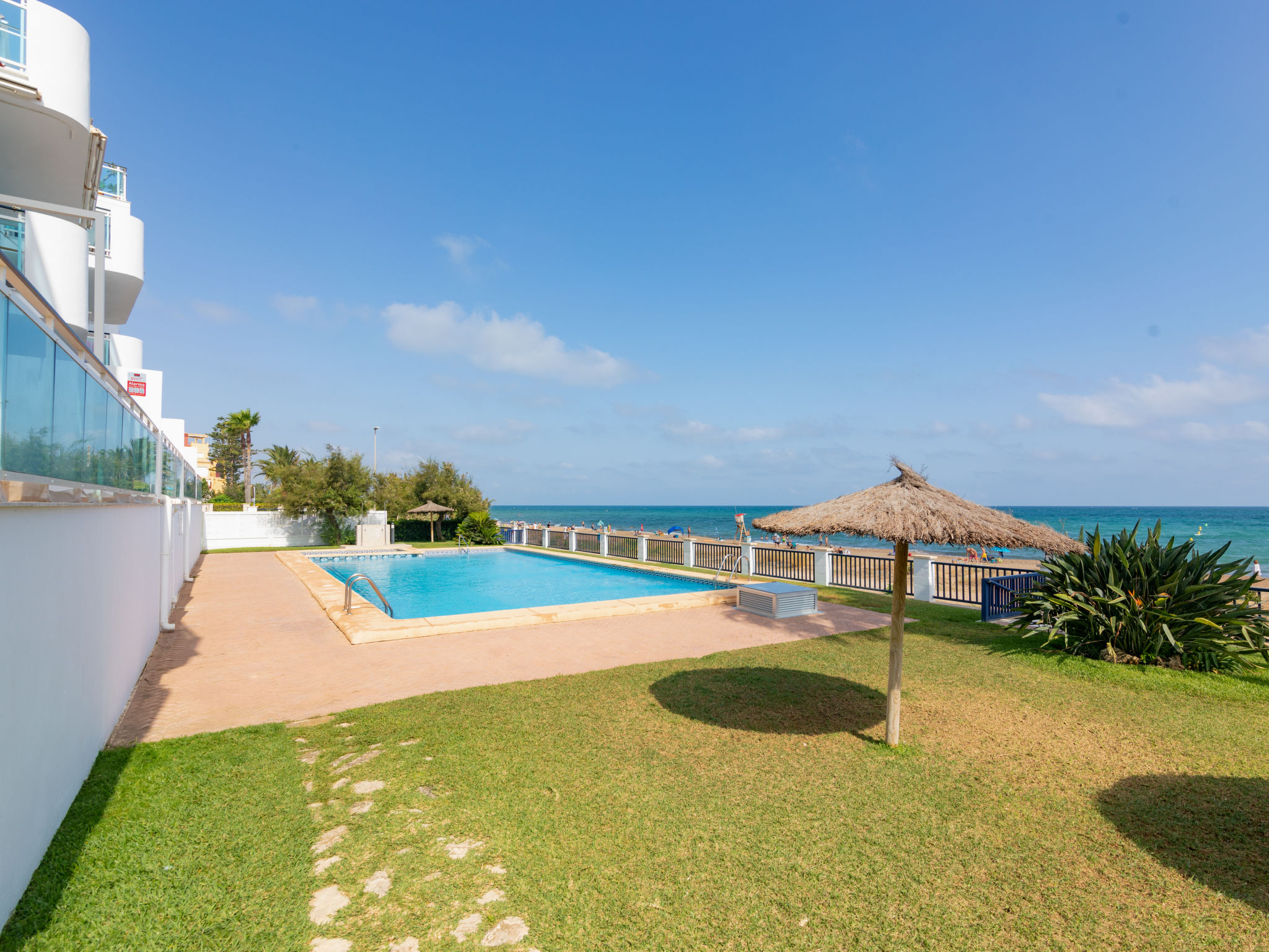 Grosses, sehr schönes, sehr komfortables Doppelhaus "Jardines de Denia V", auf 2 Stockwerken. Les Marines, 7 km vom Zentrum von Denia, ruhige, sonnige Lage, 50 m vom Meer, 50 m vom Strand, direkter Zugang zum Strand. Zur Mitbenutzung: Grundstück (eingezäunt) mit Rasen und Bäumen, Schwimmbad (15 x 7 m, 110 - 210 cm tief, saisonale Verfügbarkeit: 01.Jan.-31.Dez.) mit Innentreppe. Kinderbecken, Aussendusche. Zur Alleinbenutzung: mit Rasen und Bäumen. Gartenmöbel, Grill, Parkplatz auf dem Grundstück. Supermarkt 1.2 km, Restaurant, Café 450 m, Sandstrand "Platja de l'Estanyó" 50 m. Sporthafen 7.5 km, Jacht-Hafen 7.5 km, Surfschule 3 km, Segelschule 3 km, Tennis 6 km. Der Besitzer akzeptiert keine Jugendgruppen.
