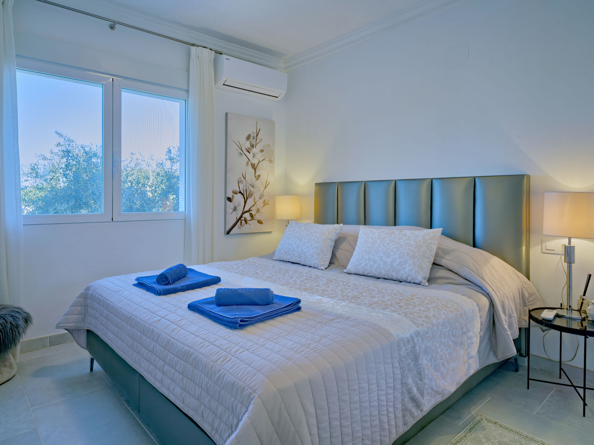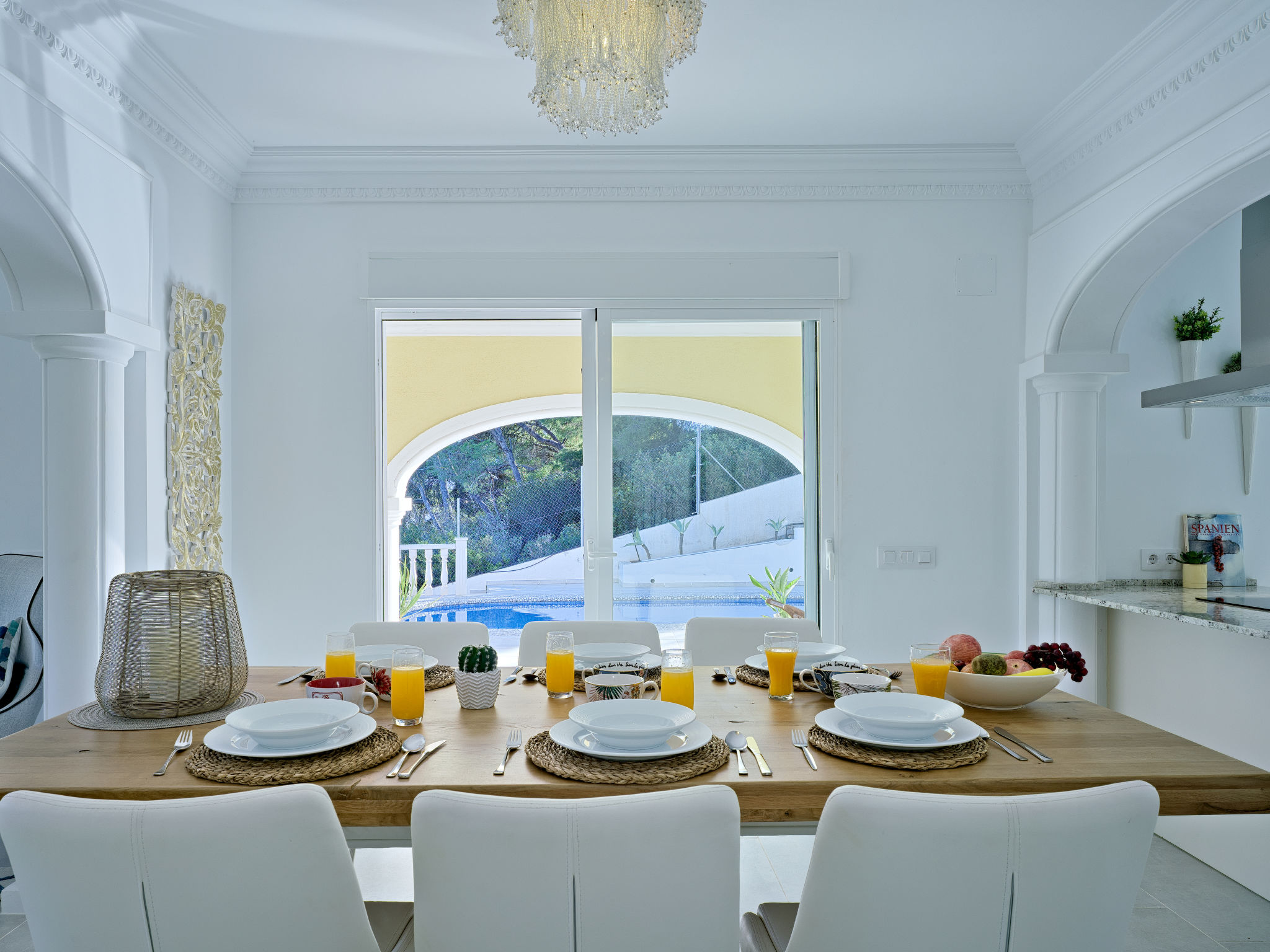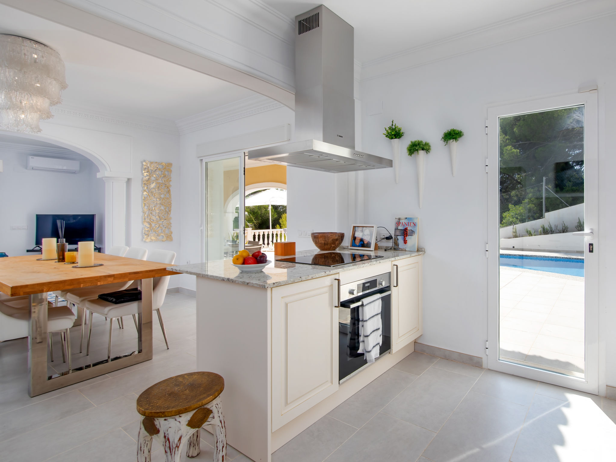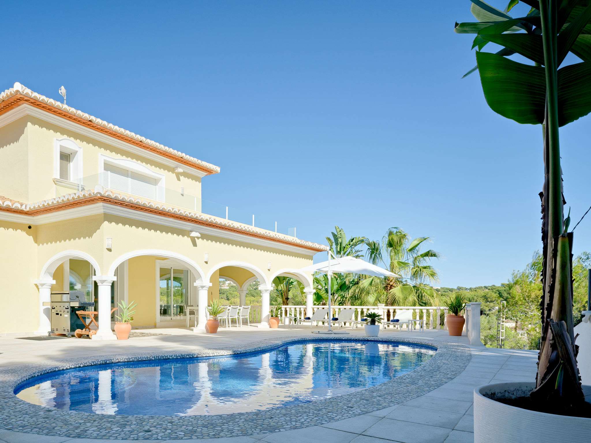 "Villa Ewa", 4-Zimmer-Villa 200 m2. Geräumig und hell, sehr schön und luxuriös eingerichtet: Wohn-/Esszimmer mit Sat-TV, Klimaanlage und Warmluftheizung. Ausgang zur Terrasse, zum Schwimmbad. 1 Zimmer mit 1 franz. Bett (2 x 90 cm, Länge 200 cm), Dusche/Bidet/WC, Klimaanlage und Warmluftheizung. 1 Zimmer mit 1 franz. Bett (150 cm, Länge 200 cm), Klimaanlage und Warmluftheizung mit 1 franz. Bett (2 x 90 cm, Länge 200 cm), Klimaanlage und Warmluftheizung. Offene Küche (Backofen, Geschirrspüler, 3 Glaskeramikherd Platten, Toaster, Tiefkühler, elektrische Kaffeemaschine) mit Klimaanlage und Warmluftheizung. Ausgang zur Terrasse, zum Schwimmbad. Dusche/Bidet/WC, sep. WC. Grosse Terrasse. Terrassenmöbel, Gartengrill, Liegestühle, Loggia. Zur Verfügung: Waschmaschine, Bügeleisen, Kinderhochstuhl, Babybett, Haartrockner. Internet (Wireless LAN, gratis). VT487795A