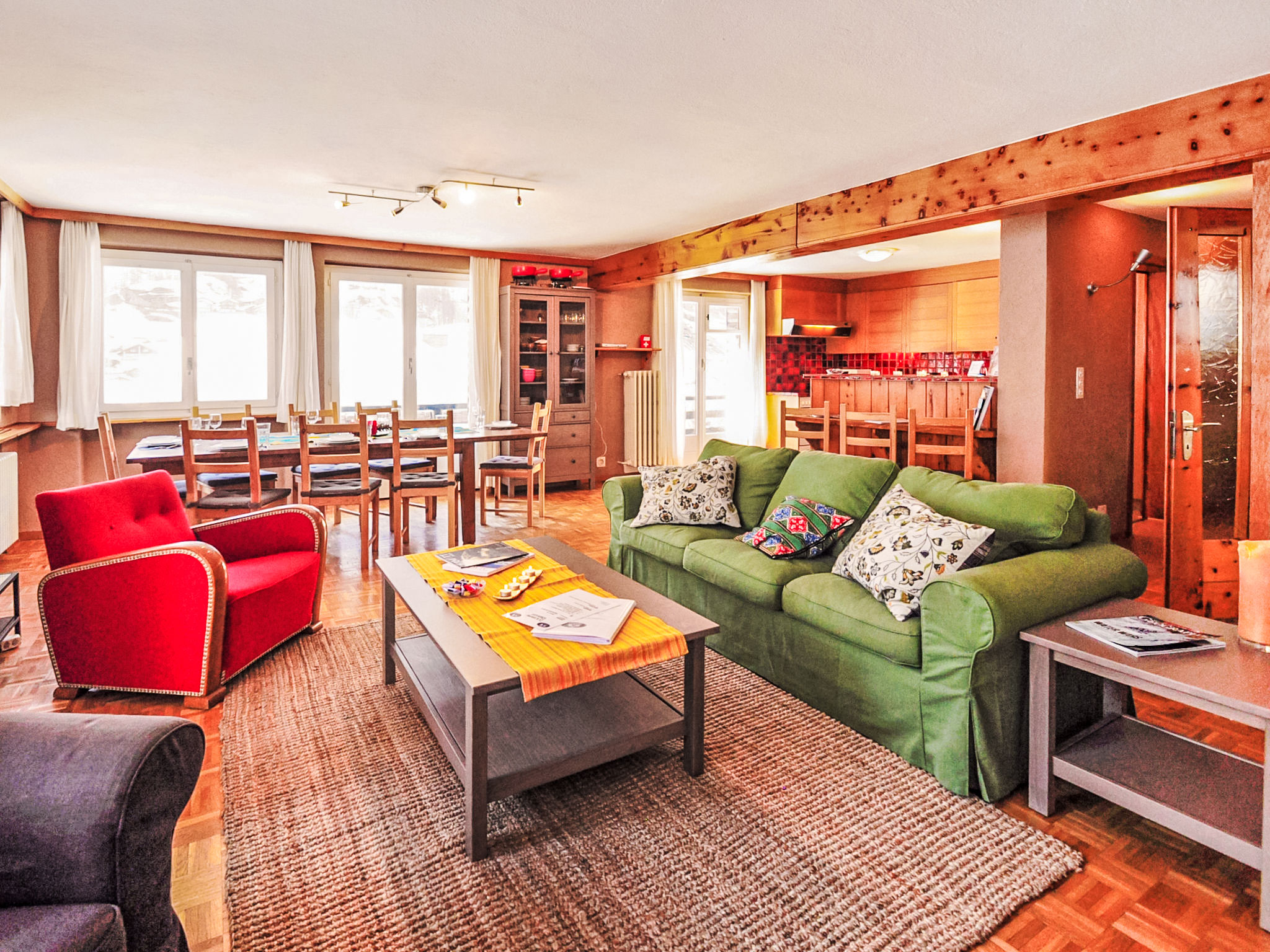 6-Zimmer-Wohnung 200 m2 auf 2 Stockwerken im 1. Stock, Südwestlage. Geräumig, komfortabel und geschmackvoll eingerichtet: Wohn-/Esszimmer mit offenem Kamin, Esstisch, TV, Stereoanlage und DVD. Ausgang zum Balkon. 1 Zimmer mit Schiebetür mit 1 x 2 Etagenbetten (90 cm, Länge 200 cm), 1 Doppelbett (160 cm, Länge 200 cm), Bad/Bidet/WC. Offene Küche (Backofen, Geschirrspüler, 4 Glaskeramikherd Platten, Toaster, Wasserkocher, Mikrowelle, Tiefkühler, elektrische Kaffeemaschine, Racletteofen, Fondue Set (Chinoise, Käse)). Sep. WC. Unteres Geschoss: (Wendeltreppe) 1 Zimmer, ohne Fenster mit 1 x 2 Etagenbetten (90 cm, Länge 200 cm). 1 Zimmer mit 1 Doppelbett (2 x 90 cm, Länge 200 cm). 1 Zimmer mit 1 Doppelbett (2 x 90 cm, Länge 200 cm). 1 Zimmer mit 1 Doppelbett (2 x 90 cm, Länge 200 cm). Bad/Bidet/WC. Grosser Balkon, Südlage und Westlage. Balkonmöbel. Sicht auf das Matterhorn. Zur Verfügung: Haartrockner. Internet (Wireless LAN, gratis). Bitte beachten: Nichtraucher-Unterkunft.