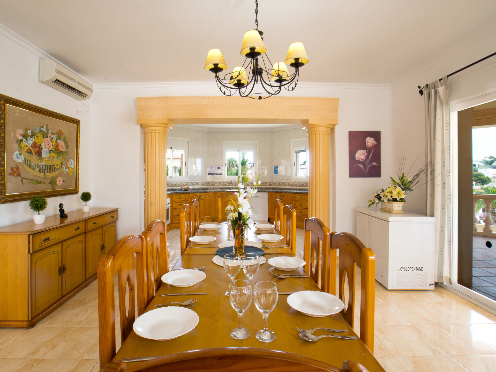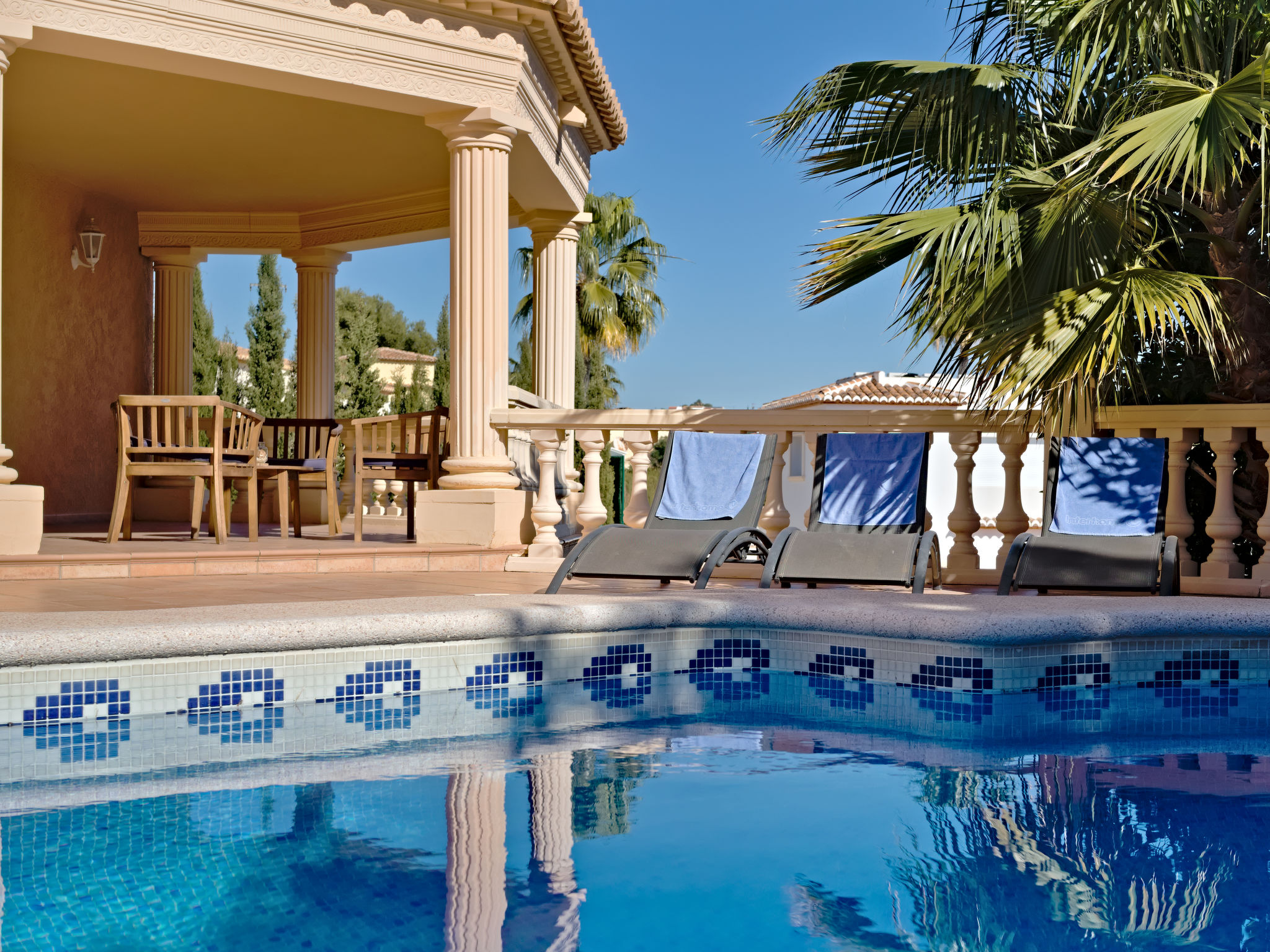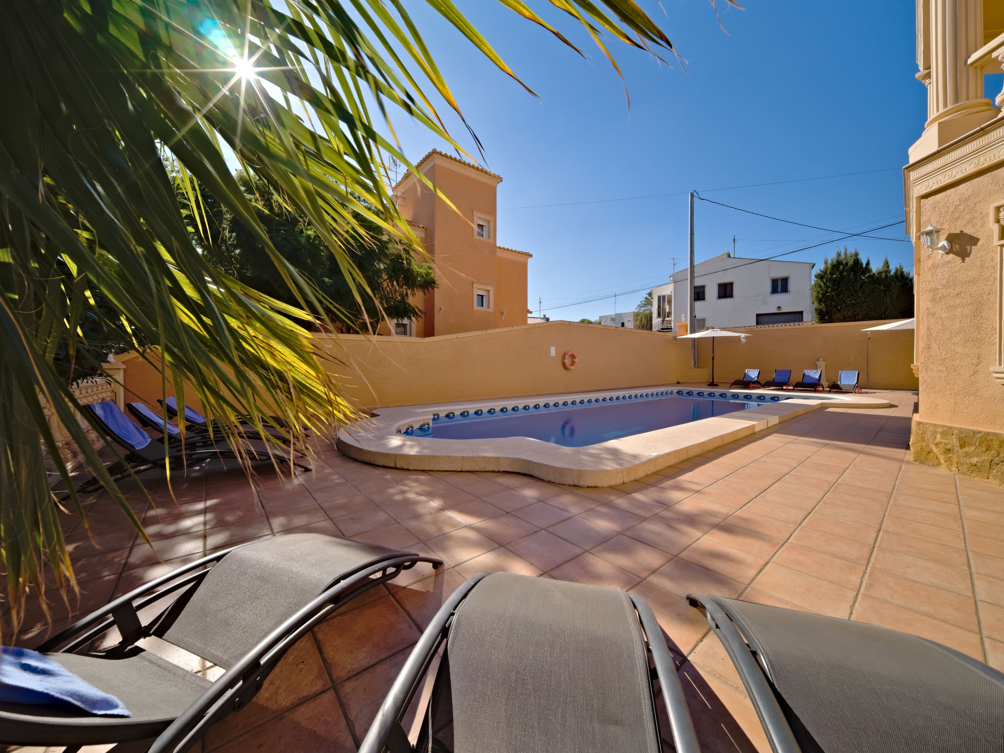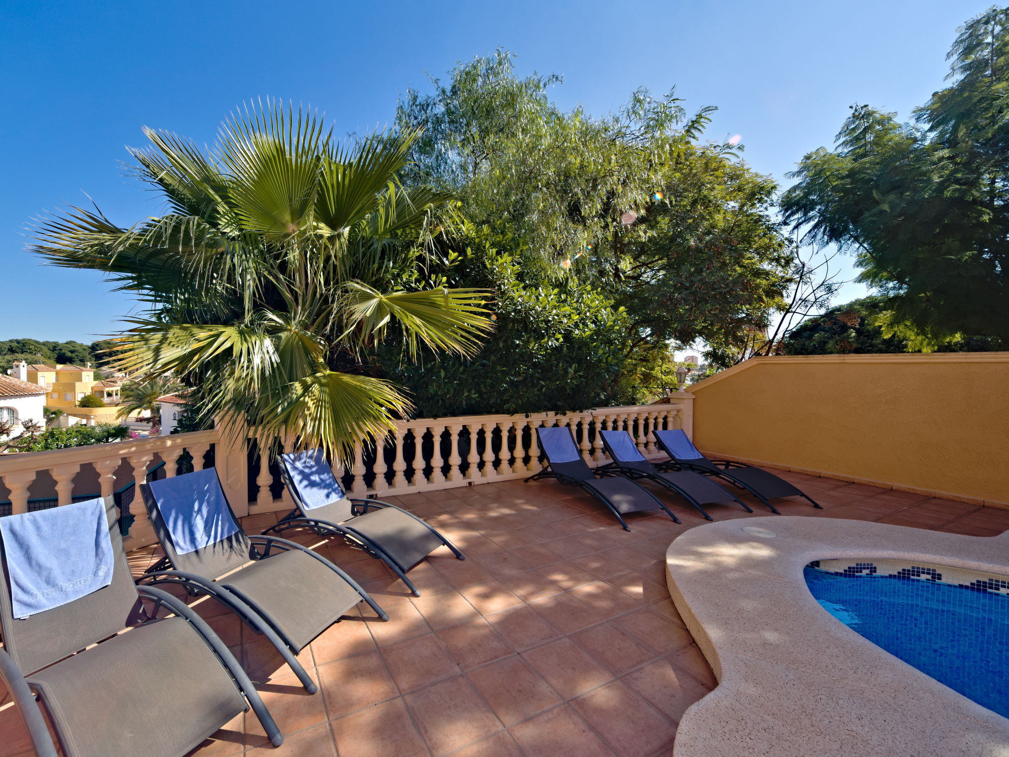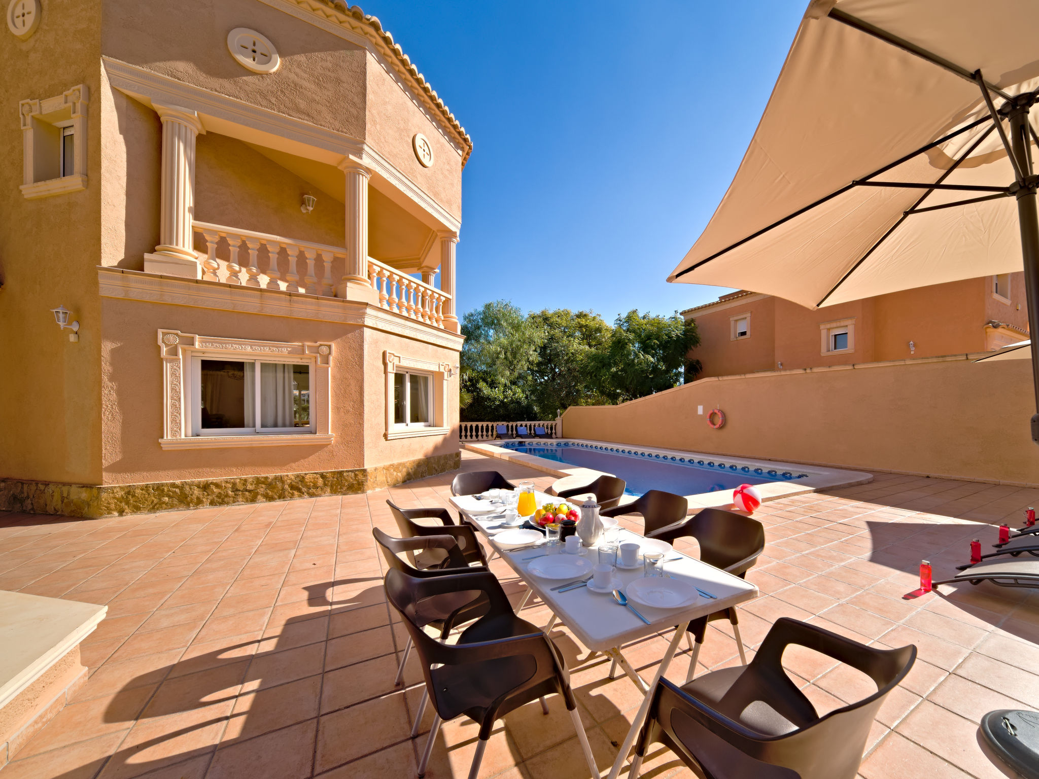 "Calpetenis", 5-Zimmer-Villa 311 m2. Wohn-/Esszimmer mit Esstisch, Sat-TV, Internationale TV-Sender und Klimaanlage. 2 Zimmer, jedes Zimmer mit 1 franz. Bett und Klimaanlage. 3 Zimmer, jedes Zimmer mit 2 Betten und Klimaanlage. Küche (Backofen, Geschirrspüler, 4 Glaskeramikherd Platten, Toaster, Wasserkocher, Mikrowelle, Tiefkühler, elektrische Kaffeemaschine). Bad/Bidet/WC, 3 Duschen/WC. Gartensitzplatz. Terrassenmöbel, Gartengrill. Sicht auf das Schwimmbad. Zur Verfügung: Waschmaschine, Bügeleisen. Internet (Wireless LAN, gratis). Garage auf dem Grundstück. AT-456320-A