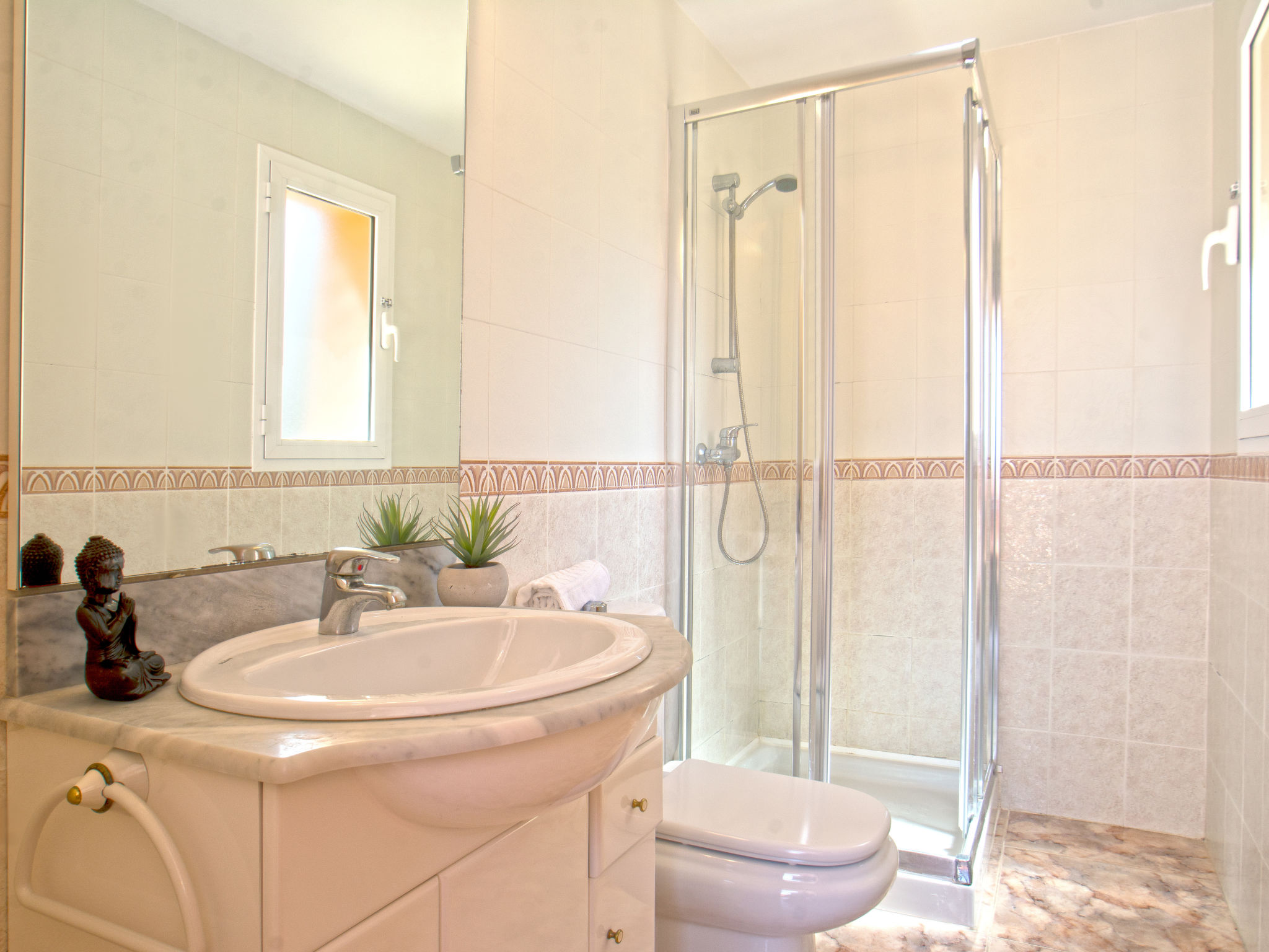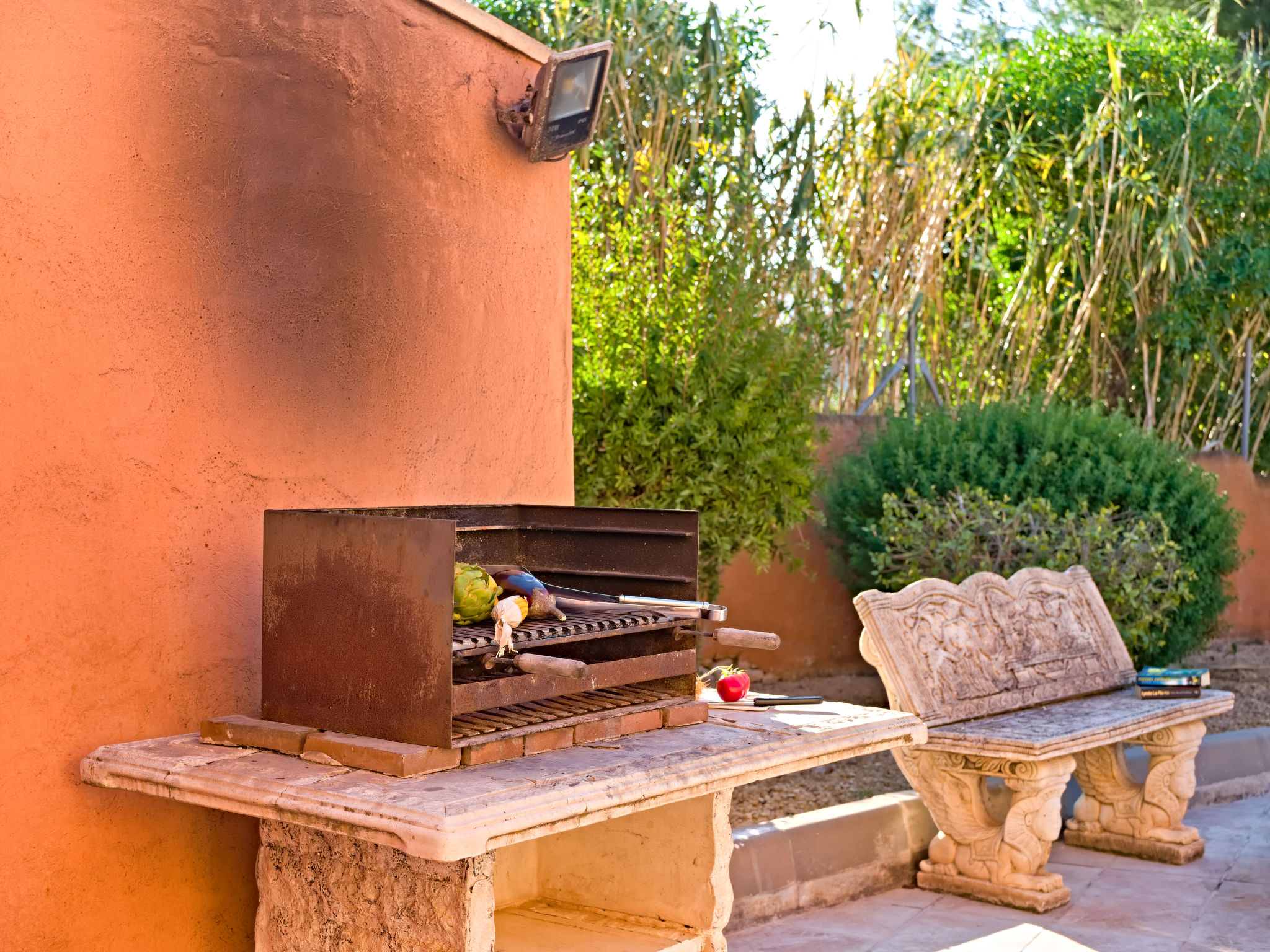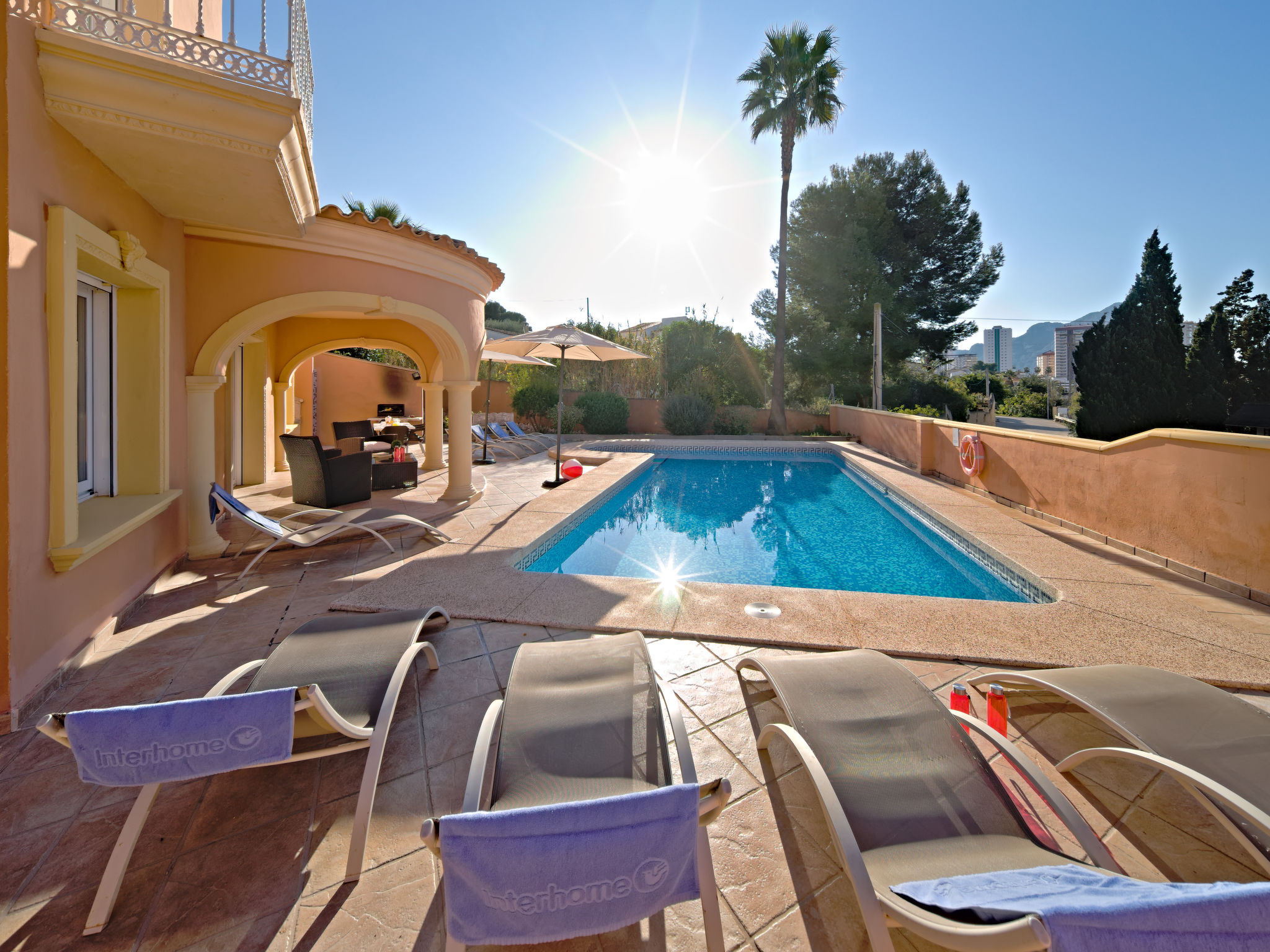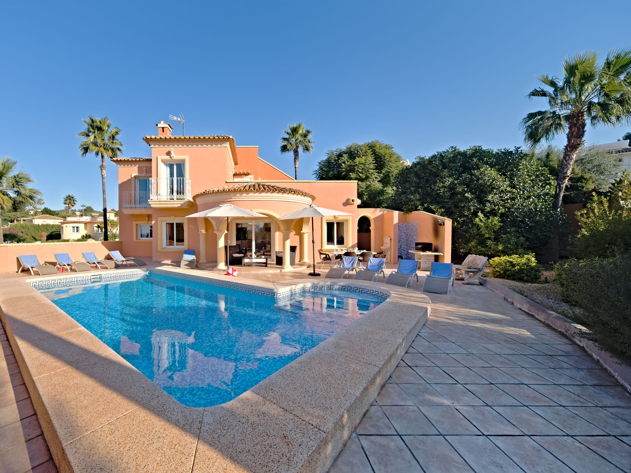 "Gardenia", 5-Zimmer-Villa 218 m2. Geräumig, komfortabel eingerichtet: Wohn-/Esszimmer mit Esstisch, Sat-TV, Internationale TV-Sender und Klimaanlage. 1 Zimmer mit 1 franz. Bett und Klimaanlage. 1 Zimmer mit 2 Betten und Klimaanlage. Küche (Backofen, Geschirrspüler, 4 Glaskeramikherd Platten, Toaster, Wasserkocher, Mikrowelle, Tiefkühler, elektrische Kaffeemaschine). Bad/WC, sep. WC. Obergeschoss: 3 Zimmer, jedes Zimmer mit 2 Betten und Klimaanlage. Bad/WC, Dusche/WC. Terrasse, Gartensitzplatz. Terrassenmöbel. Sicht auf die Berge und das Schwimmbad. Zur Verfügung: Waschmaschine, Bügeleisen. Internet (Wireless LAN, gratis). Garage auf dem Grundstück. AT-456321-A