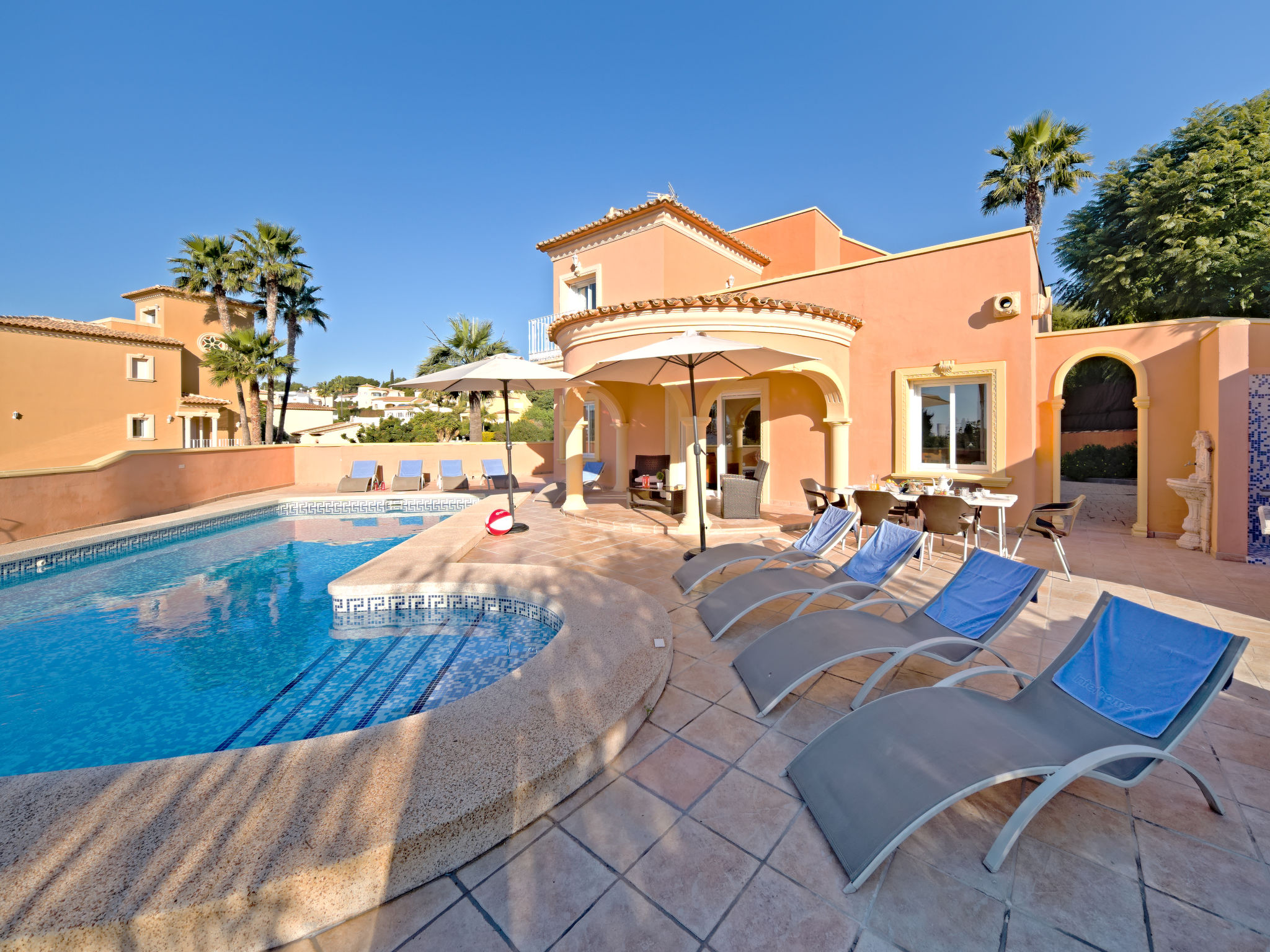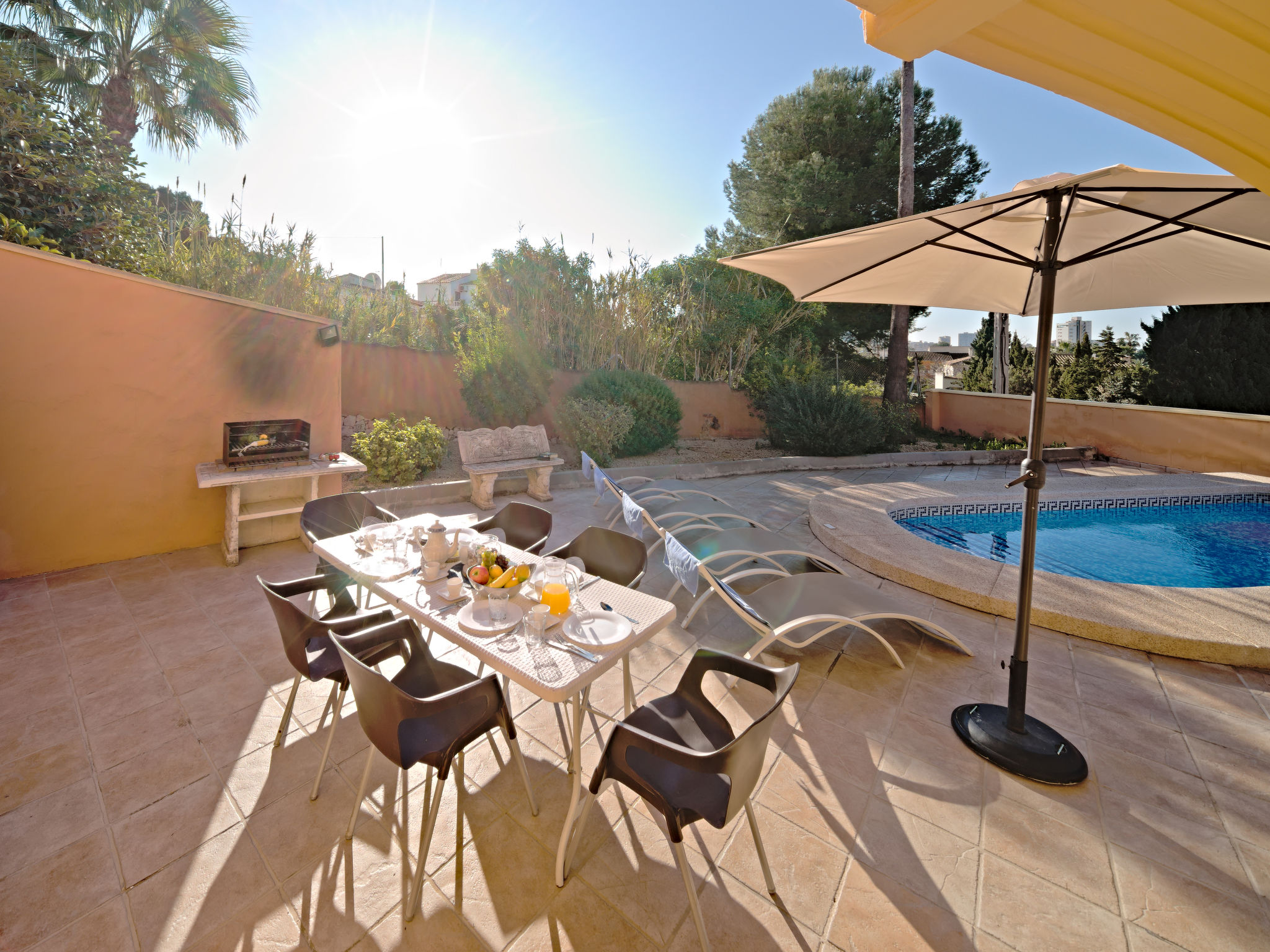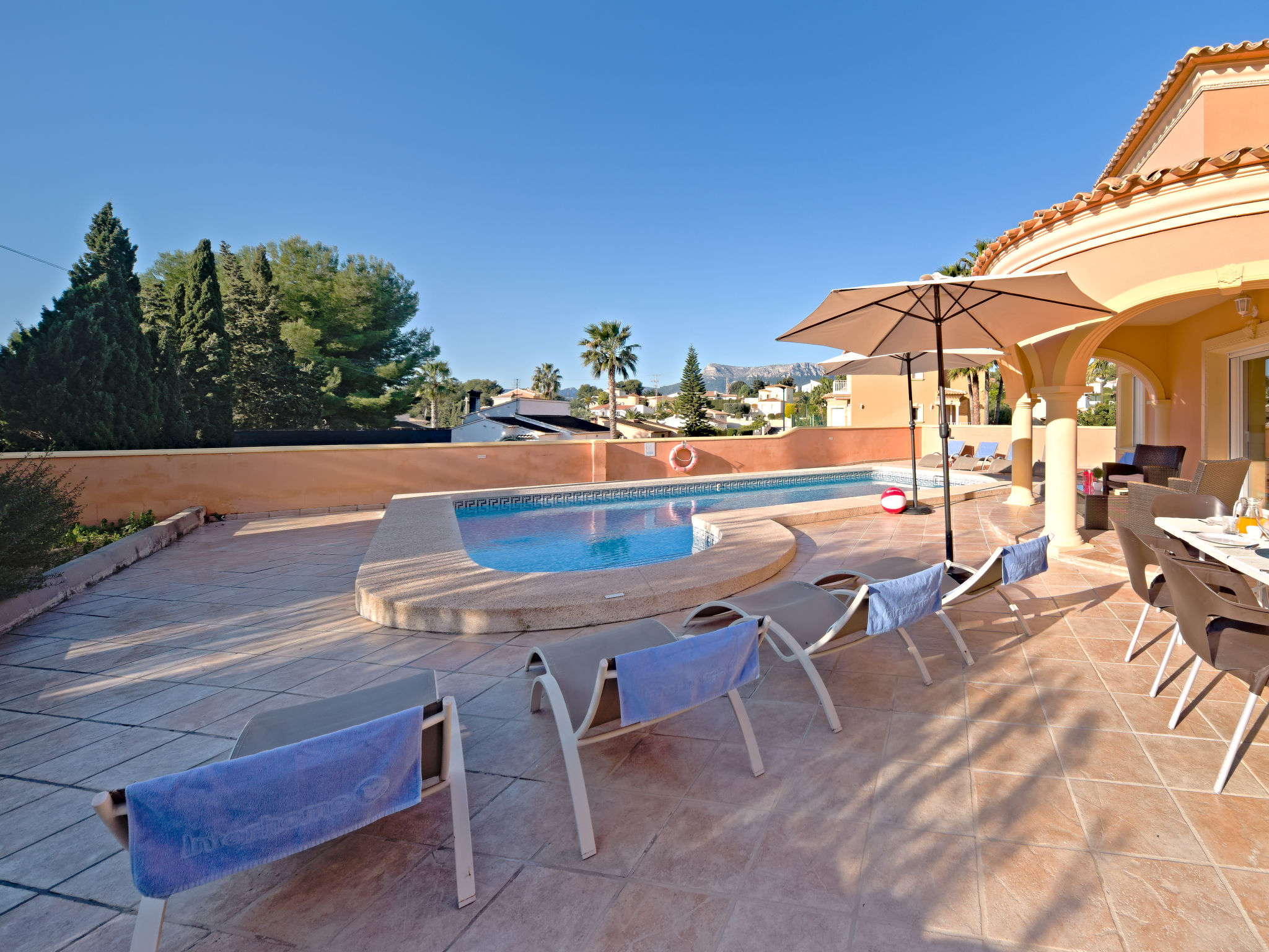 Villa. 1 km vom Meer, 1 km vom Strand. Zur Alleinbenutzung: Garten (eingezäunt), Schwimmbad eckig (8 x 4 m, 125 - 175 cm tief, 01.01.-31.12.). Gartenmöbel, Parkplatz auf dem Grundstück. Supermarkt 1 km, Sandstrand "La Fossa" 1 km. Nahe gelegene Sehenswürdigkeiten: Peñon de Ifach 2 km, Aqualandia 25 km, Terra Mitica 35 km, Aeropuerto El Altet Alicante-Elche 75 km. Der Besitzer akzeptiert keine Jugendgruppen.