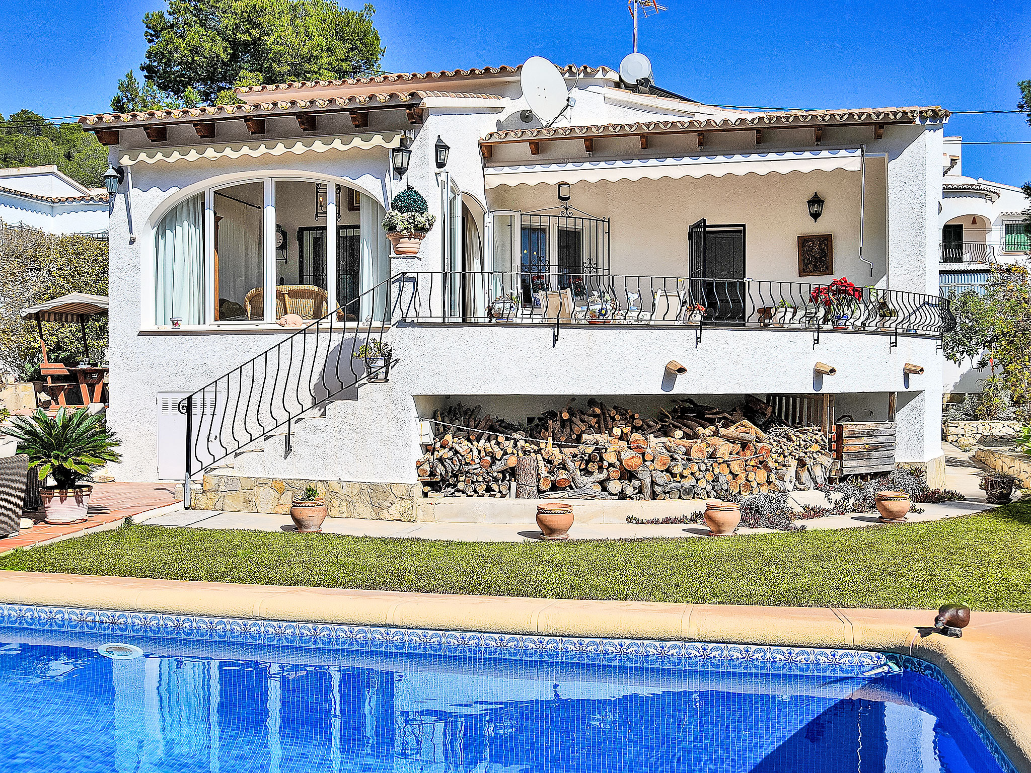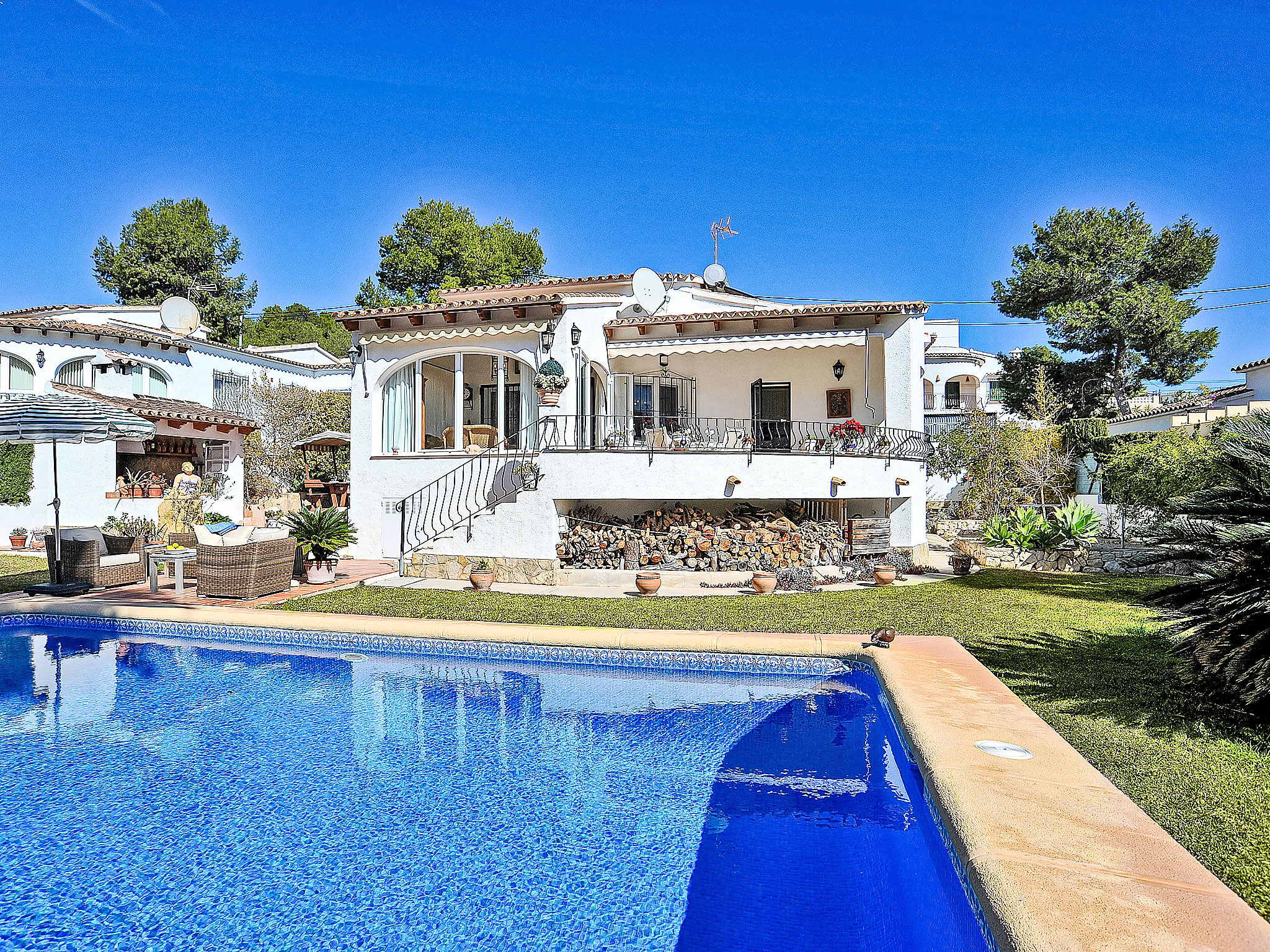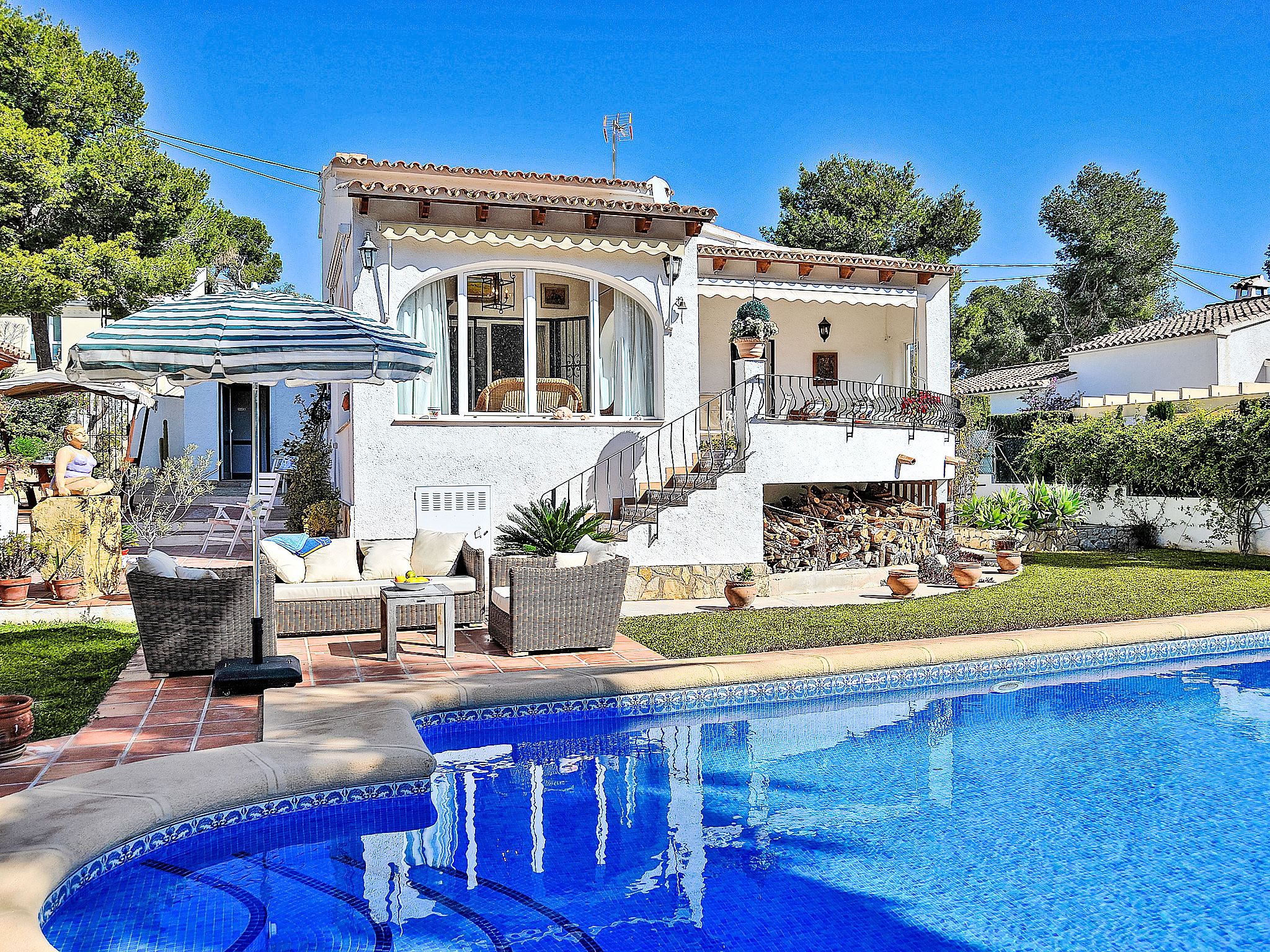 Pinar de l'Advocat: Schönes Haus "El sueno de Jeanne-Marie". 1 km vom Zentrum von Moraira, 1 km vom Meer, 1 km vom Strand. Zur Alleinbenutzung: schöner, gepflegter Garten (eingezäunt) mit Rasen, Schwimmbad eckig (4 x 8 m, 01.01.-31.12.) mit Innentreppe. Terrasse, Grill. Im Hause: Zentralheizung, Klimaanlage. Wohnungsreinigung 1 mal wöchentlich. Parkplatz auf dem Grundstück. Einkaufsgeschäft 1 km, Supermarkt 1 km, Restaurant 50 m, Bar 1 km, Sandstrand 1 km. Golfplatz 5 km. Bitte beachten: geeignet für Familien, geeignet für Senioren.