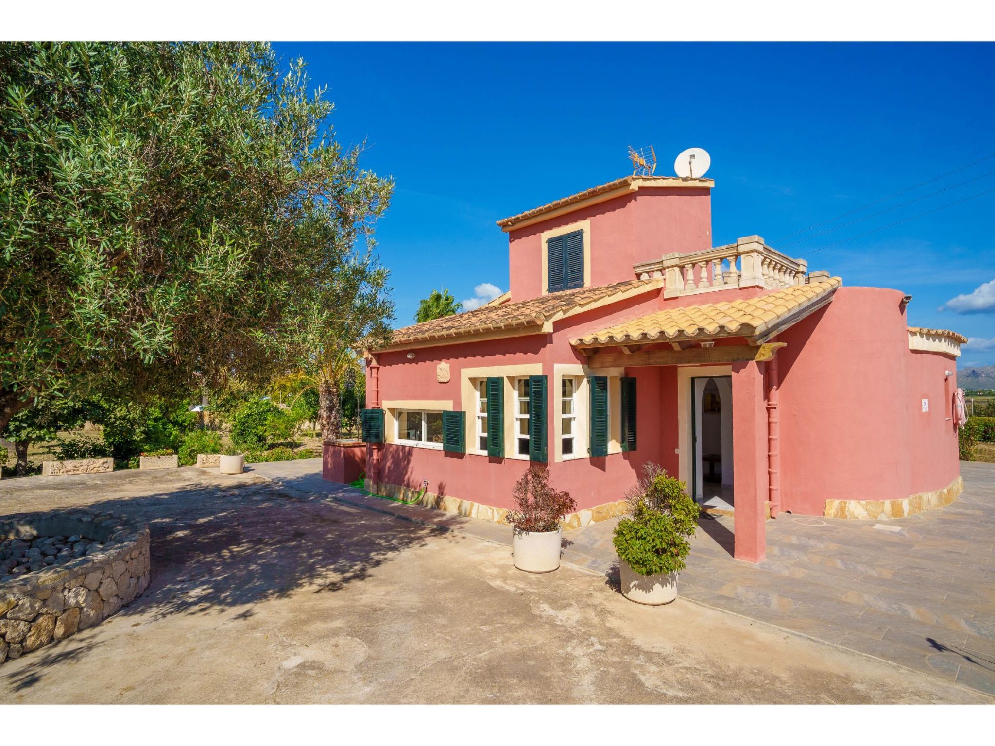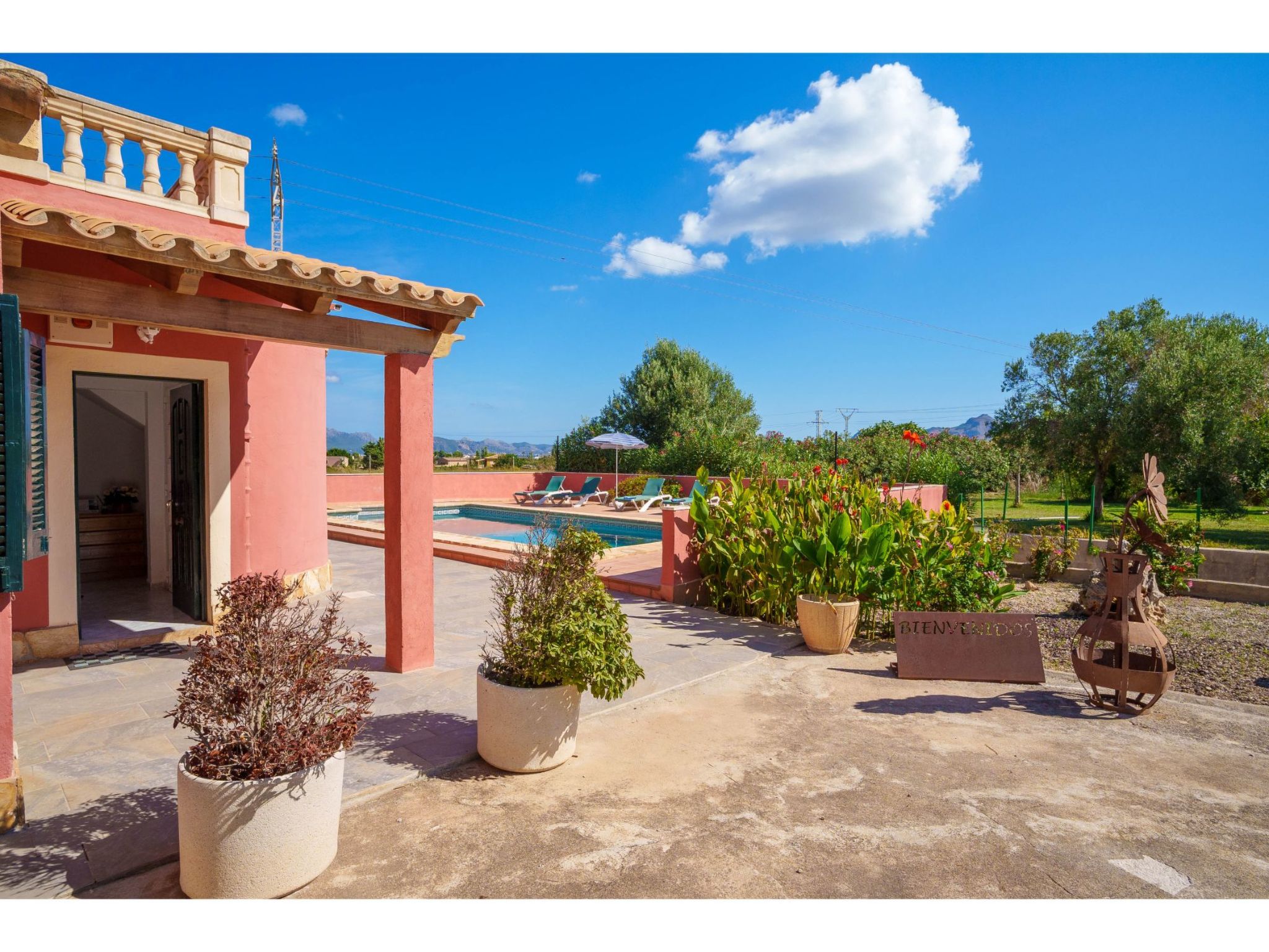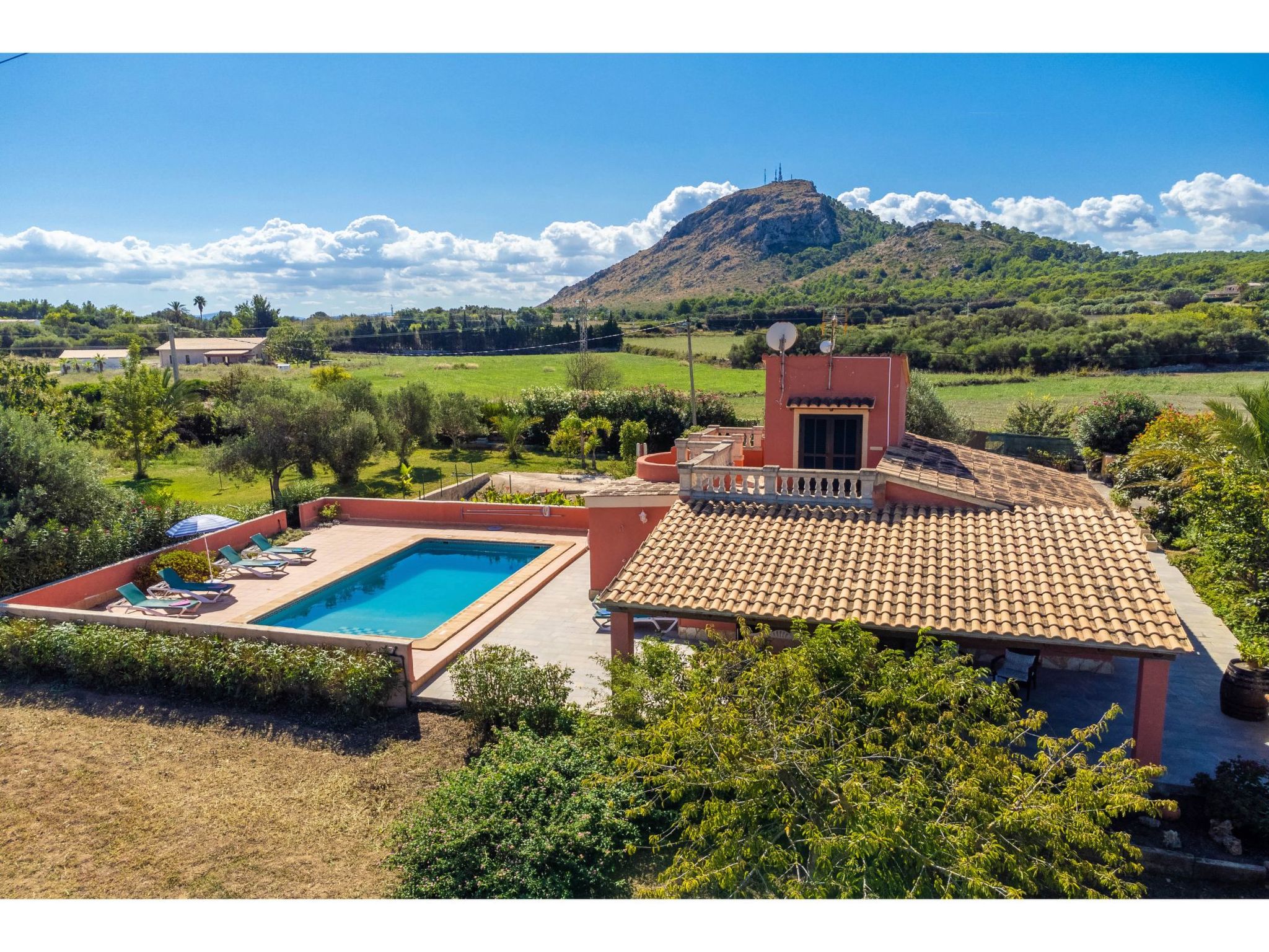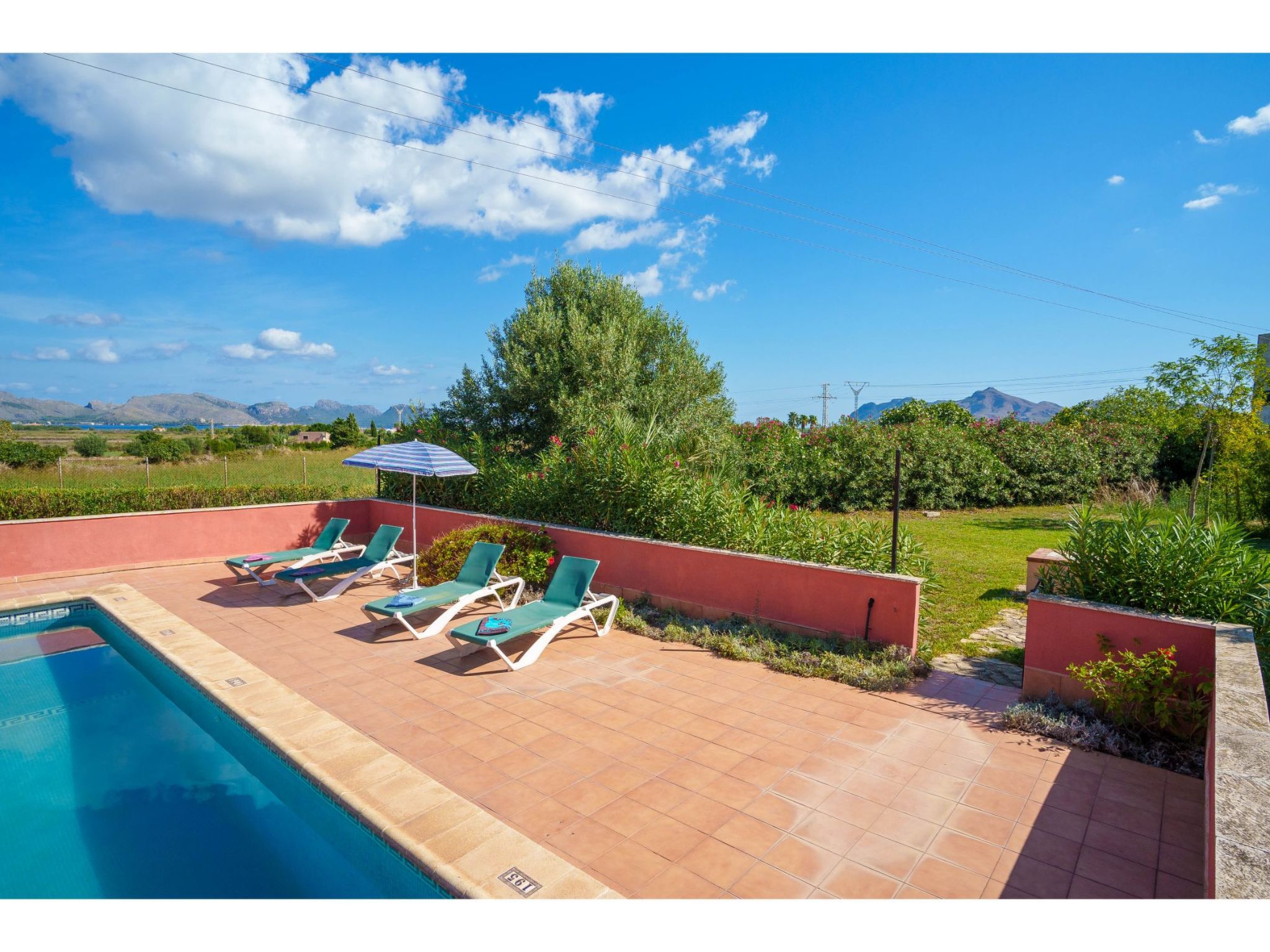 Das hübsche Ferienhaus steht 3 km südwestlich von Alcúdia im Hinterland der Bucht von Pollença. Sowohl die Strände von Alcúdia (4 km) als auch die der Bucht von Pollença (5 km) sind schnell erreicht. Kleine geteerte Straßen, ideal zum Fahrradfahren, durchziehen dieses locker bebaute Gebiet. Das ca. 1000 m² große, umzäunte Grundstück ist teils mit Rasen, teils mit naturbelassener Wiese angelegt. Vorplatz mit altem Olivenbaum. Oleanderbüsche umgeben die Sonnenterrasse des Pools (8 x 4 m, gesamte Saison geöffnet) mit Sonnenliegen, Sonnenschirm und Außendusche. Geflieste Terrassenflächen am Haus. Überdachte Terrasse (ca. 20 m²) mit Essplatz aus Stein und gemütlicher Kunstrattansitzgruppe. Gemauerte Grillstelle. In der 1. Etage weitere Terrasse (ca. 10 m²) mit Mobiliar und herrlicher Sicht auf das Meer und zum Cap Formentor. Parkmöglichkeit auf dem Grundstück. Feriengerechte Einrichtung. Fliesenböden. Sat-TV (deutsche Programme), DVD. Internetzugang (WLAN, inklusive). Waschmaschine, 2x Fön. Klimaanlage mit Kühl-/Heizfunktion im Wohnraum und in den Schlafzimmern im Erdgeschoss. Hinweis: Rauchen ist im Haus nicht gestattet.