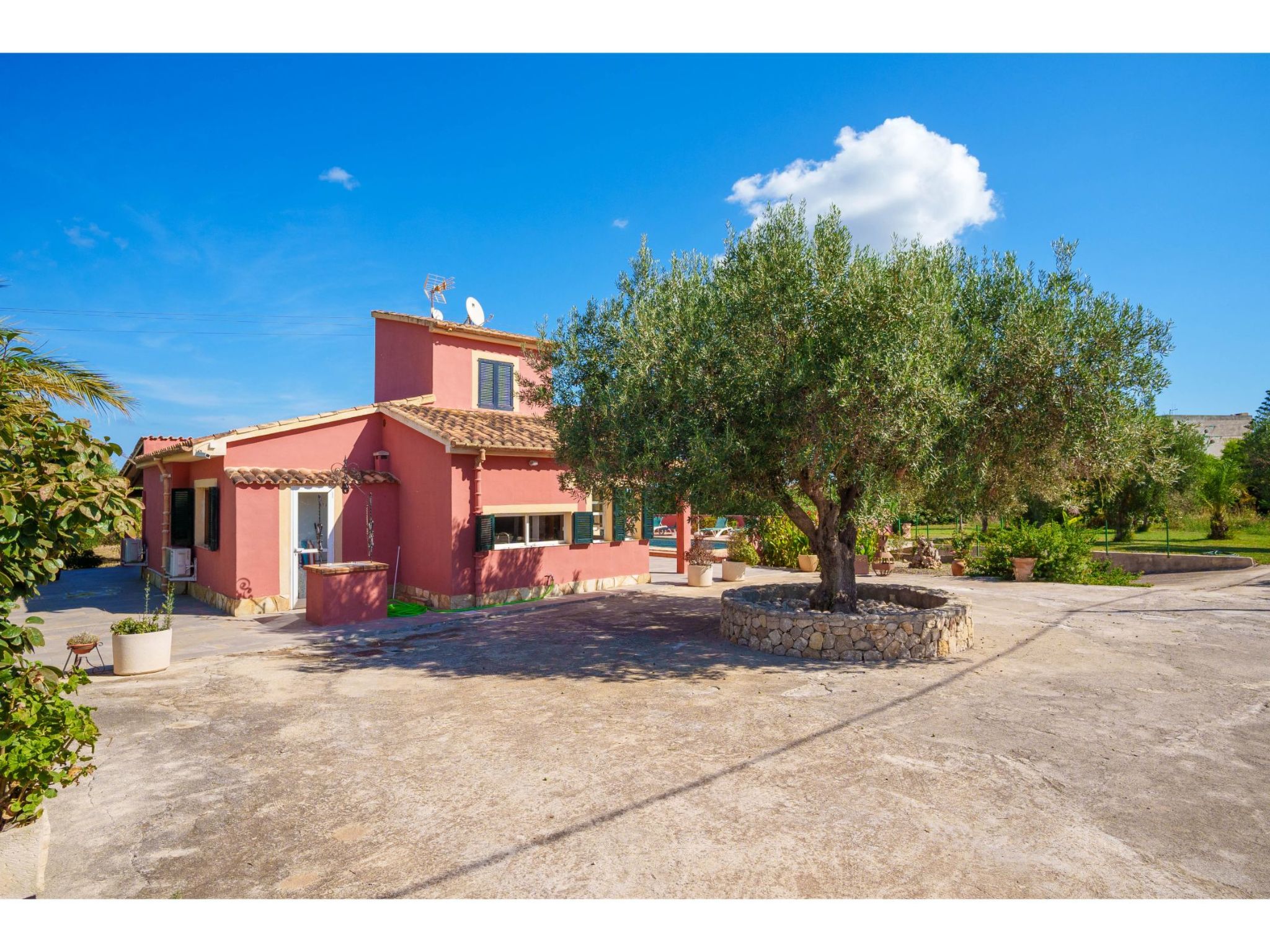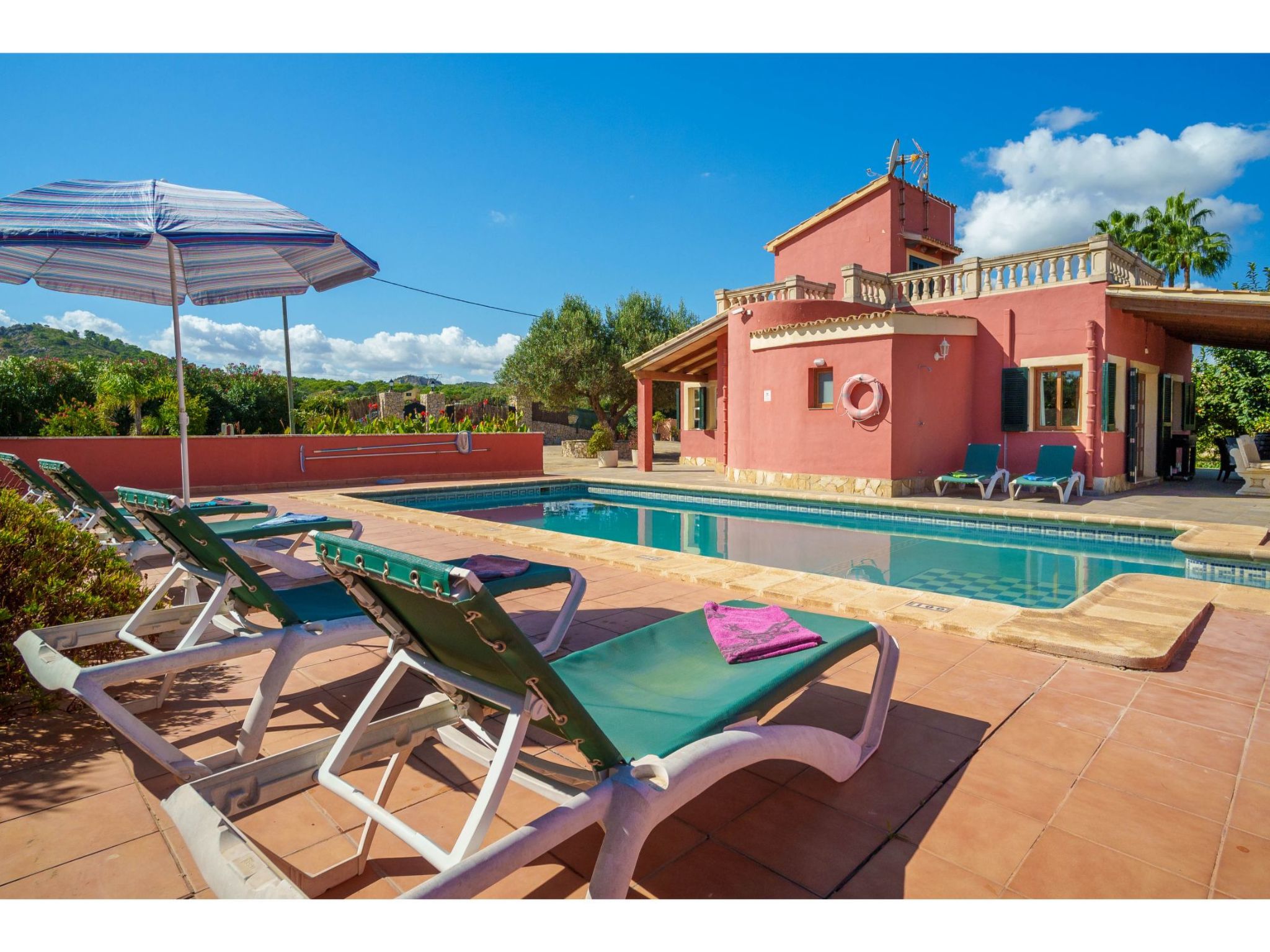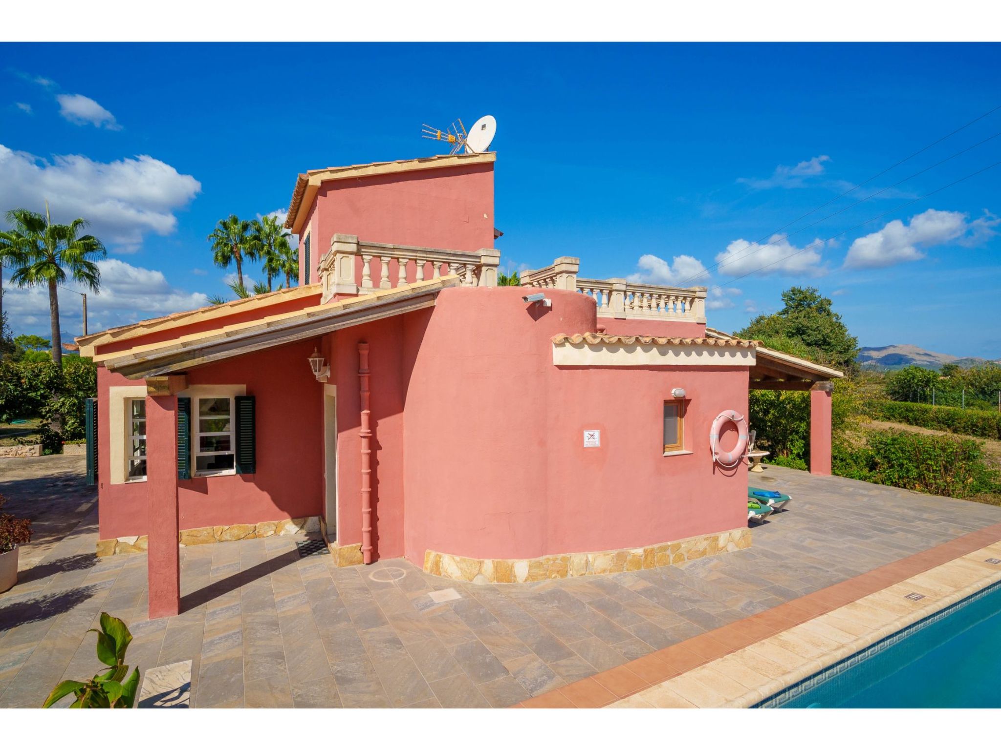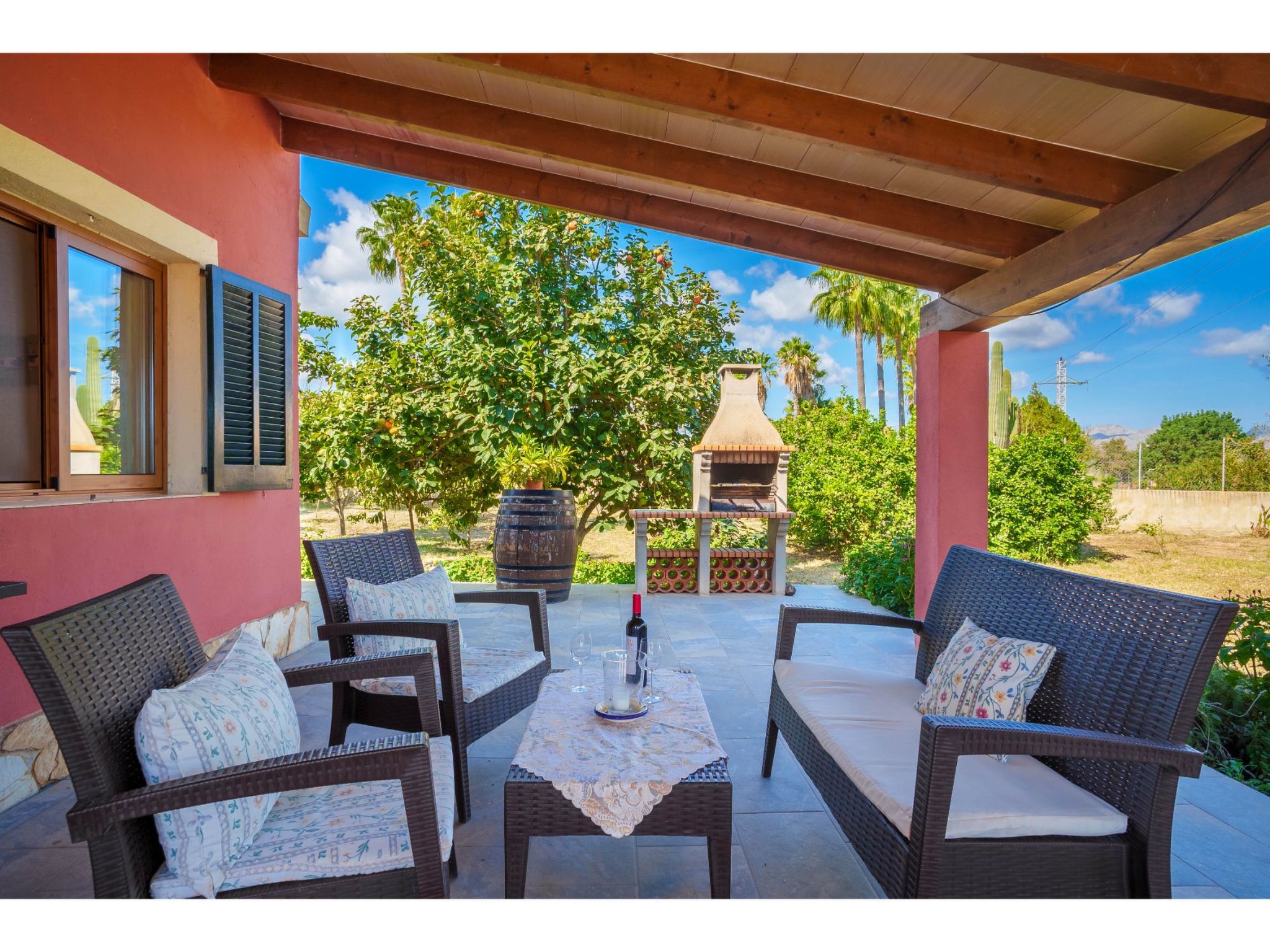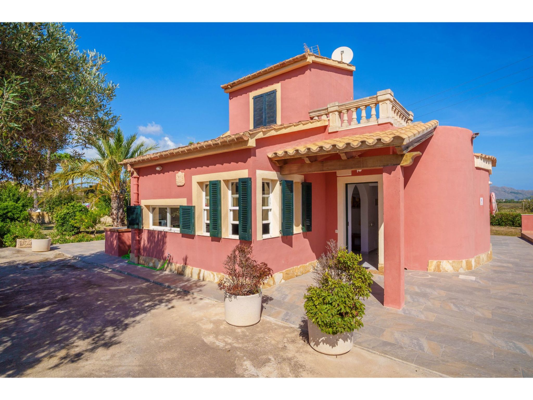 Das hübsche Ferienhaus steht 3 km südwestlich von Alcúdia im Hinterland der Bucht von Pollença. Sowohl die Strände von Alcúdia (4 km) als auch die der Bucht von Pollença (5 km) sind schnell erreicht. Kleine geteerte Straßen, ideal zum Fahrradfahren, durchziehen dieses locker bebaute Gebiet. Das ca. 1000 m² große, umzäunte Grundstück ist teils mit Rasen, teils mit naturbelassener Wiese angelegt. Vorplatz mit altem Olivenbaum. Oleanderbüsche umgeben die Sonnenterrasse des Pools (8 x 4 m, gesamte Saison geöffnet) mit Sonnenliegen, Sonnenschirm und Außendusche. Geflieste Terrassenflächen am Haus. Überdachte Terrasse (ca. 20 m²) mit Essplatz aus Stein und gemütlicher Kunstrattansitzgruppe. Gemauerte Grillstelle. In der 1. Etage weitere Terrasse (ca. 10 m²) mit Mobiliar und herrlicher Sicht auf das Meer und zum Cap Formentor. Parkmöglichkeit auf dem Grundstück. Feriengerechte Einrichtung. Fliesenböden. Sat-TV (deutsche Programme), DVD. Internetzugang (WLAN, inklusive). Waschmaschine, 2x Fön. Klimaanlage mit Kühl-/Heizfunktion im Wohnraum und in den Schlafzimmern im Erdgeschoss. Hinweis: Rauchen ist im Haus nicht gestattet.