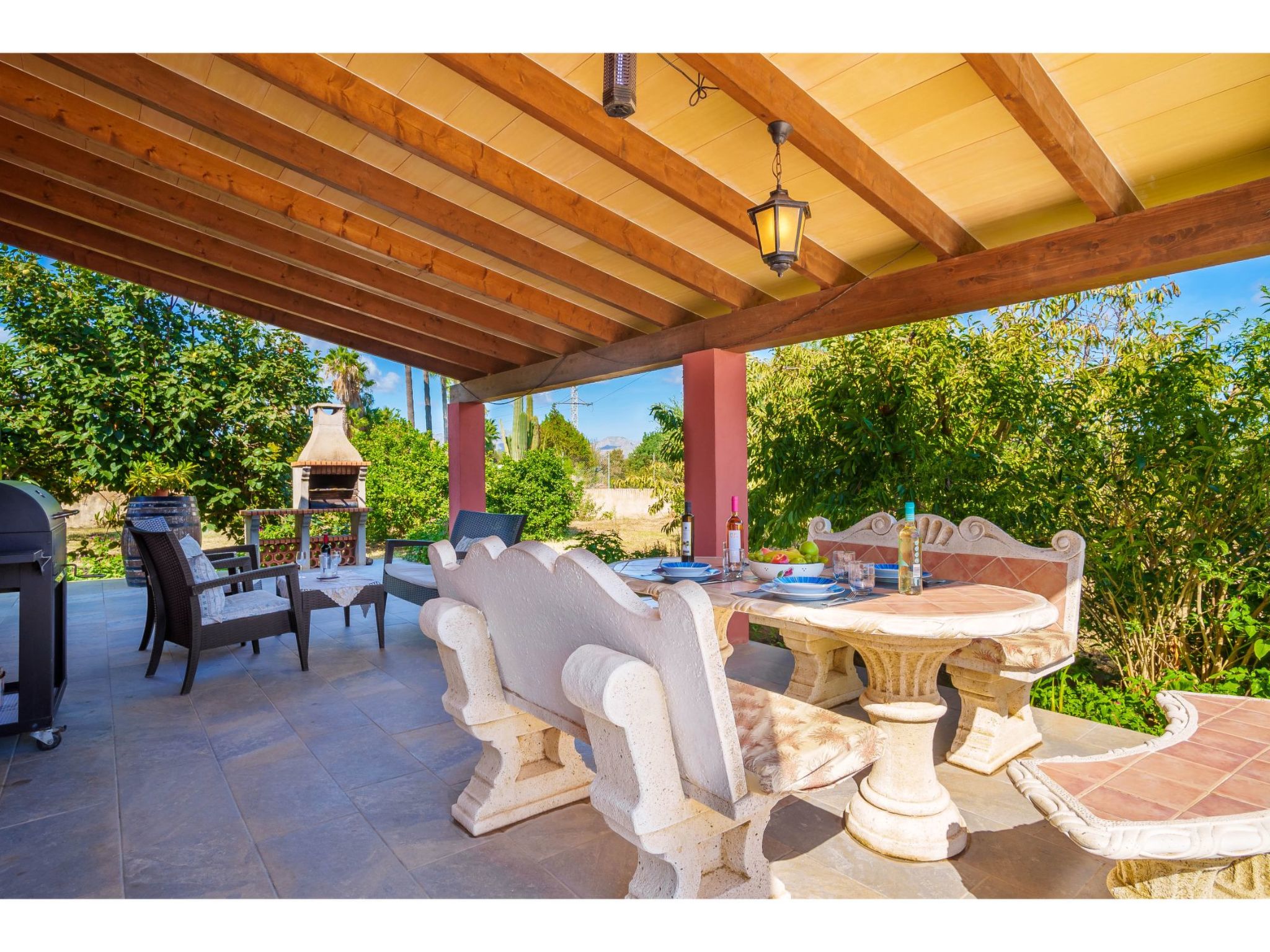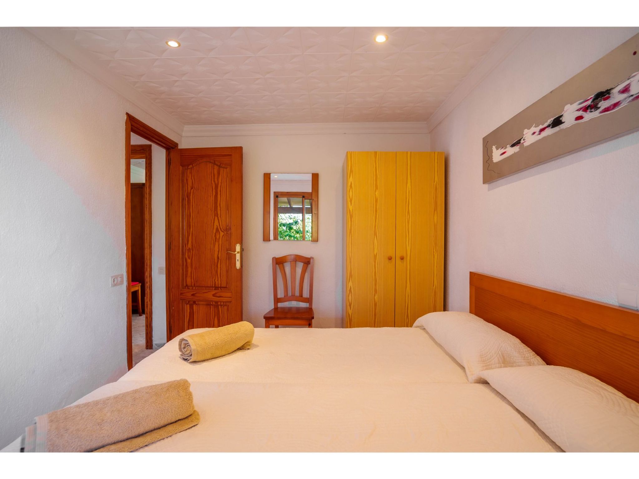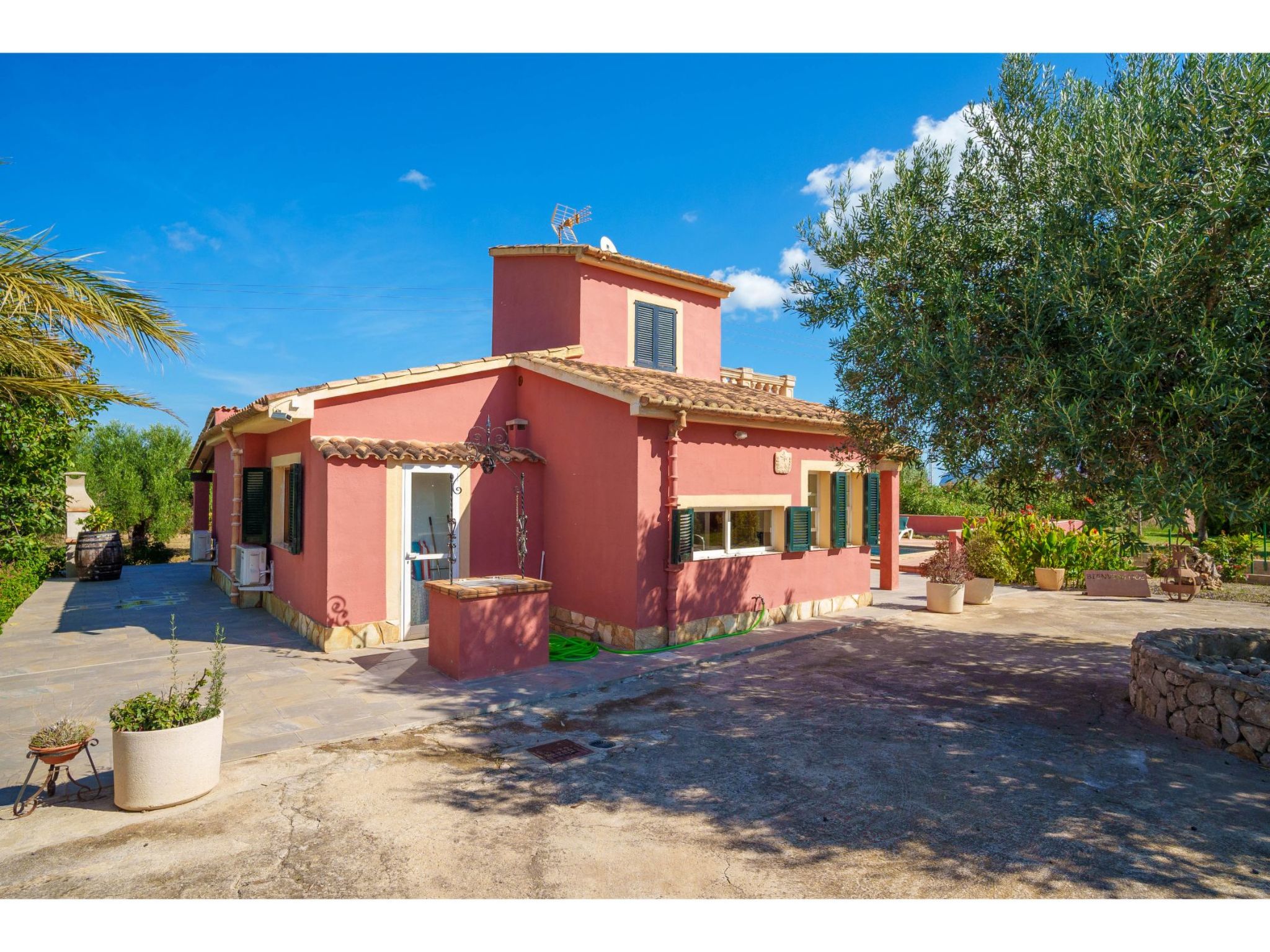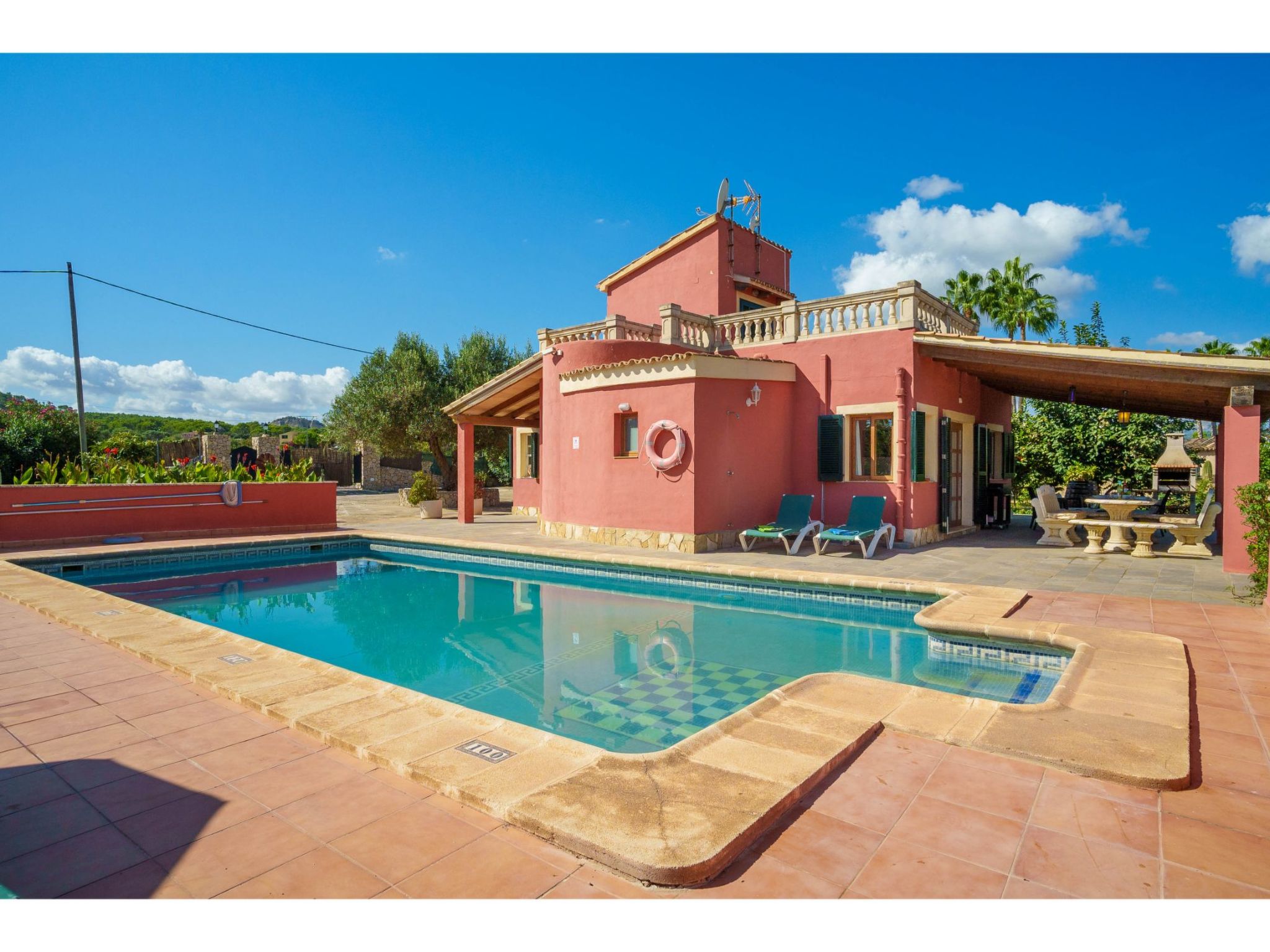 Das hübsche Ferienhaus steht 3 km südwestlich von Alcúdia im Hinterland der Bucht von Pollença. Sowohl die Strände von Alcúdia (4 km) als auch die der Bucht von Pollença (5 km) sind schnell erreicht. Kleine geteerte Straßen, ideal zum Fahrradfahren, durchziehen dieses locker bebaute Gebiet. Das ca. 1000 m² große, umzäunte Grundstück ist teils mit Rasen, teils mit naturbelassener Wiese angelegt. Vorplatz mit altem Olivenbaum. Oleanderbüsche umgeben die Sonnenterrasse des Pools (8 x 4 m, gesamte Saison geöffnet) mit Sonnenliegen, Sonnenschirm und Außendusche. Geflieste Terrassenflächen am Haus. Überdachte Terrasse (ca. 20 m²) mit Essplatz aus Stein und gemütlicher Kunstrattansitzgruppe. Gemauerte Grillstelle. In der 1. Etage weitere Terrasse (ca. 10 m²) mit Mobiliar und herrlicher Sicht auf das Meer und zum Cap Formentor. Parkmöglichkeit auf dem Grundstück. Feriengerechte Einrichtung. Fliesenböden. Sat-TV (deutsche Programme), DVD. Internetzugang (WLAN, inklusive). Waschmaschine, 2x Fön. Klimaanlage mit Kühl-/Heizfunktion im Wohnraum und in den Schlafzimmern im Erdgeschoss. Hinweis: Rauchen ist im Haus nicht gestattet.