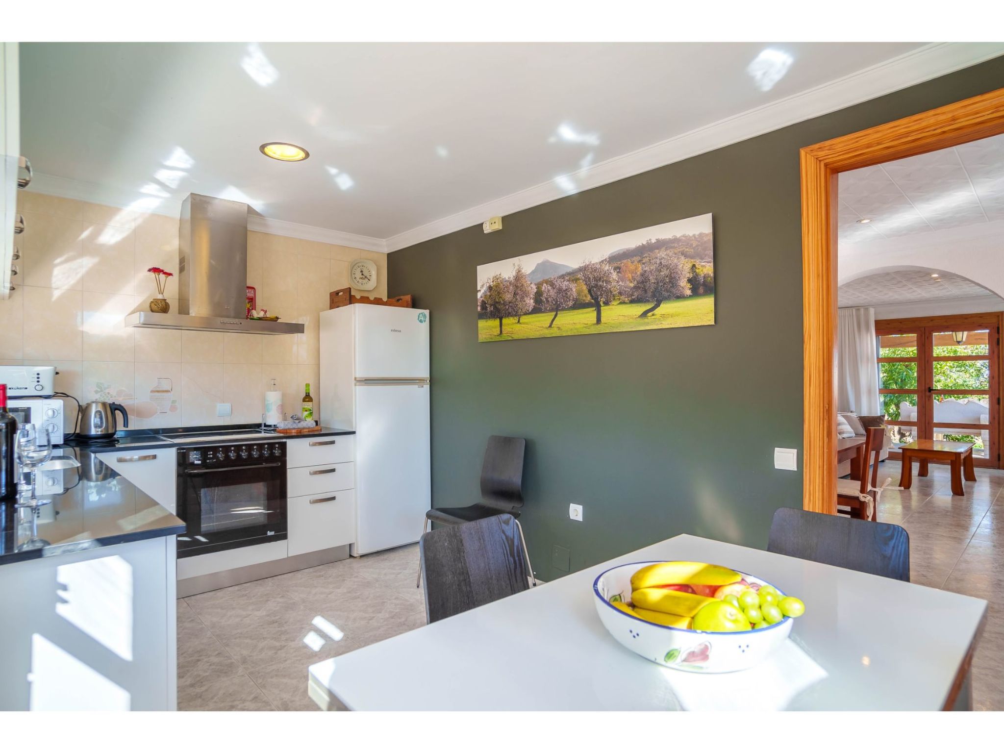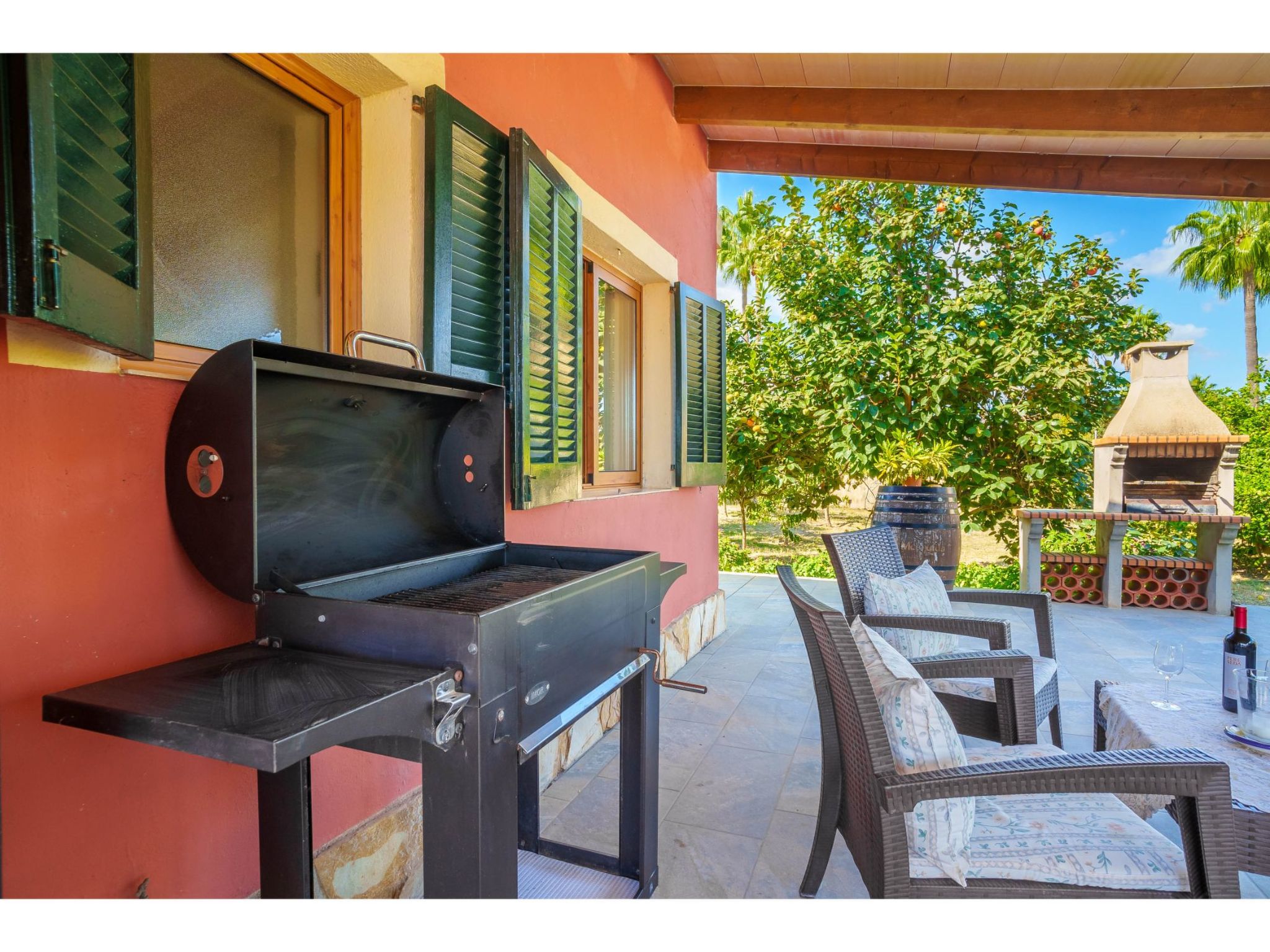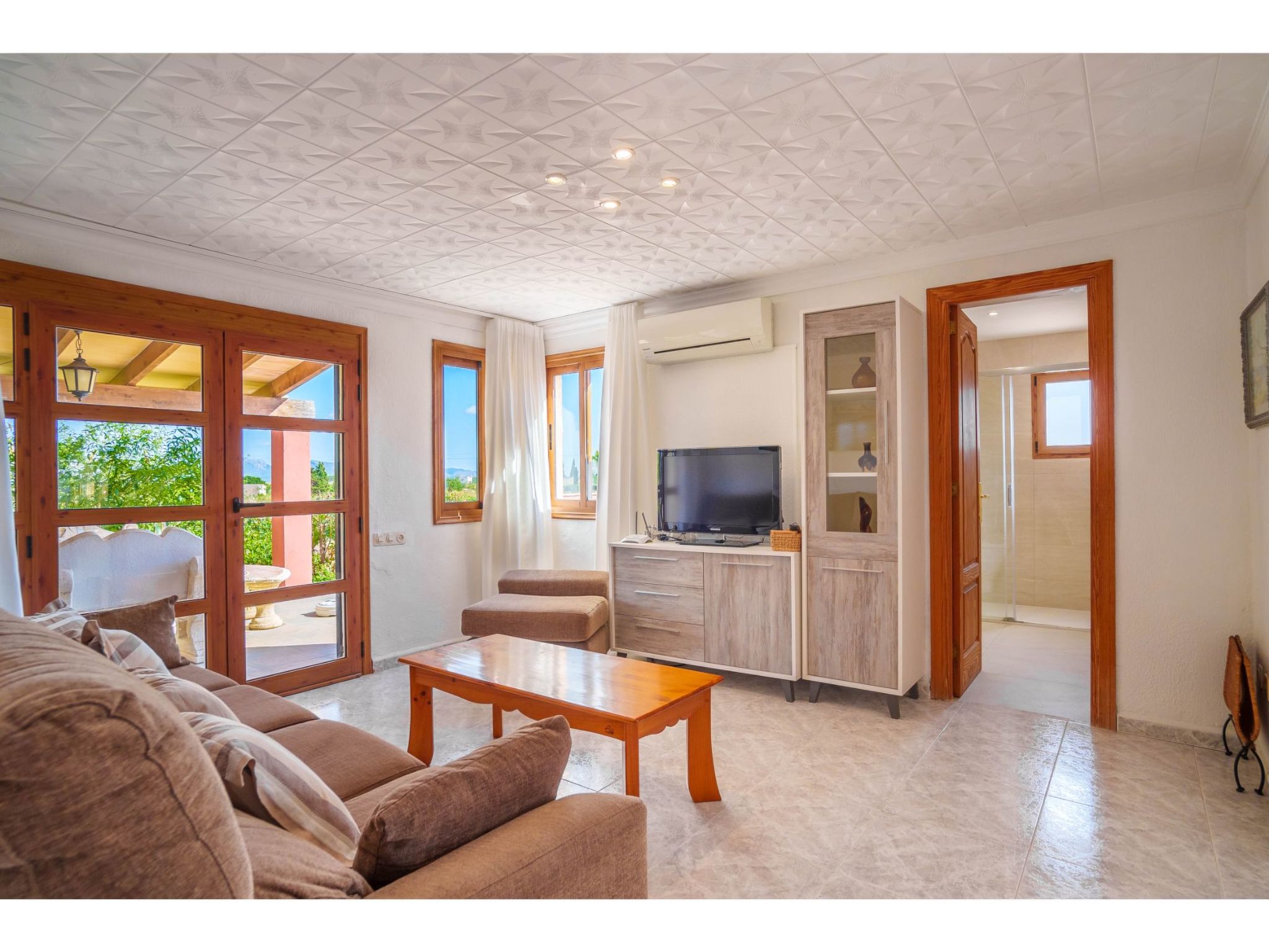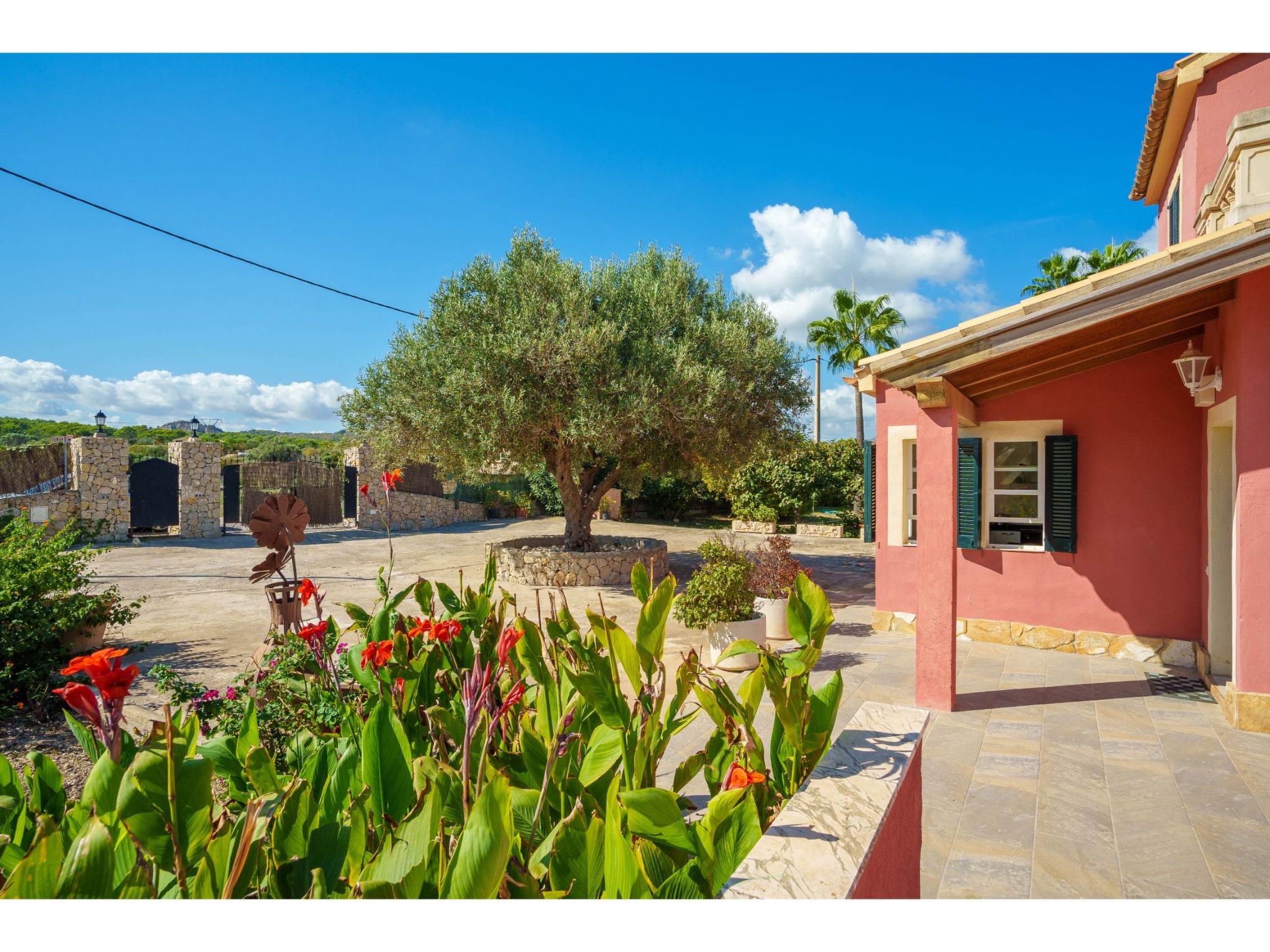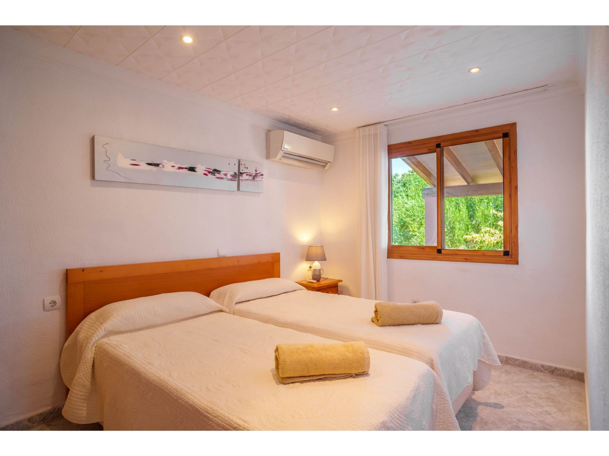 Das hübsche Ferienhaus steht 3 km südwestlich von Alcúdia im Hinterland der Bucht von Pollença. Sowohl die Strände von Alcúdia (4 km) als auch die der Bucht von Pollença (5 km) sind schnell erreicht. Kleine geteerte Straßen, ideal zum Fahrradfahren, durchziehen dieses locker bebaute Gebiet. Das ca. 1000 m² große, umzäunte Grundstück ist teils mit Rasen, teils mit naturbelassener Wiese angelegt. Vorplatz mit altem Olivenbaum. Oleanderbüsche umgeben die Sonnenterrasse des Pools (8 x 4 m, gesamte Saison geöffnet) mit Sonnenliegen, Sonnenschirm und Außendusche. Geflieste Terrassenflächen am Haus. Überdachte Terrasse (ca. 20 m²) mit Essplatz aus Stein und gemütlicher Kunstrattansitzgruppe. Gemauerte Grillstelle. In der 1. Etage weitere Terrasse (ca. 10 m²) mit Mobiliar und herrlicher Sicht auf das Meer und zum Cap Formentor. Parkmöglichkeit auf dem Grundstück. Feriengerechte Einrichtung. Fliesenböden. Sat-TV (deutsche Programme), DVD. Internetzugang (WLAN, inklusive). Waschmaschine, 2x Fön. Klimaanlage mit Kühl-/Heizfunktion im Wohnraum und in den Schlafzimmern im Erdgeschoss. Hinweis: Rauchen ist im Haus nicht gestattet.