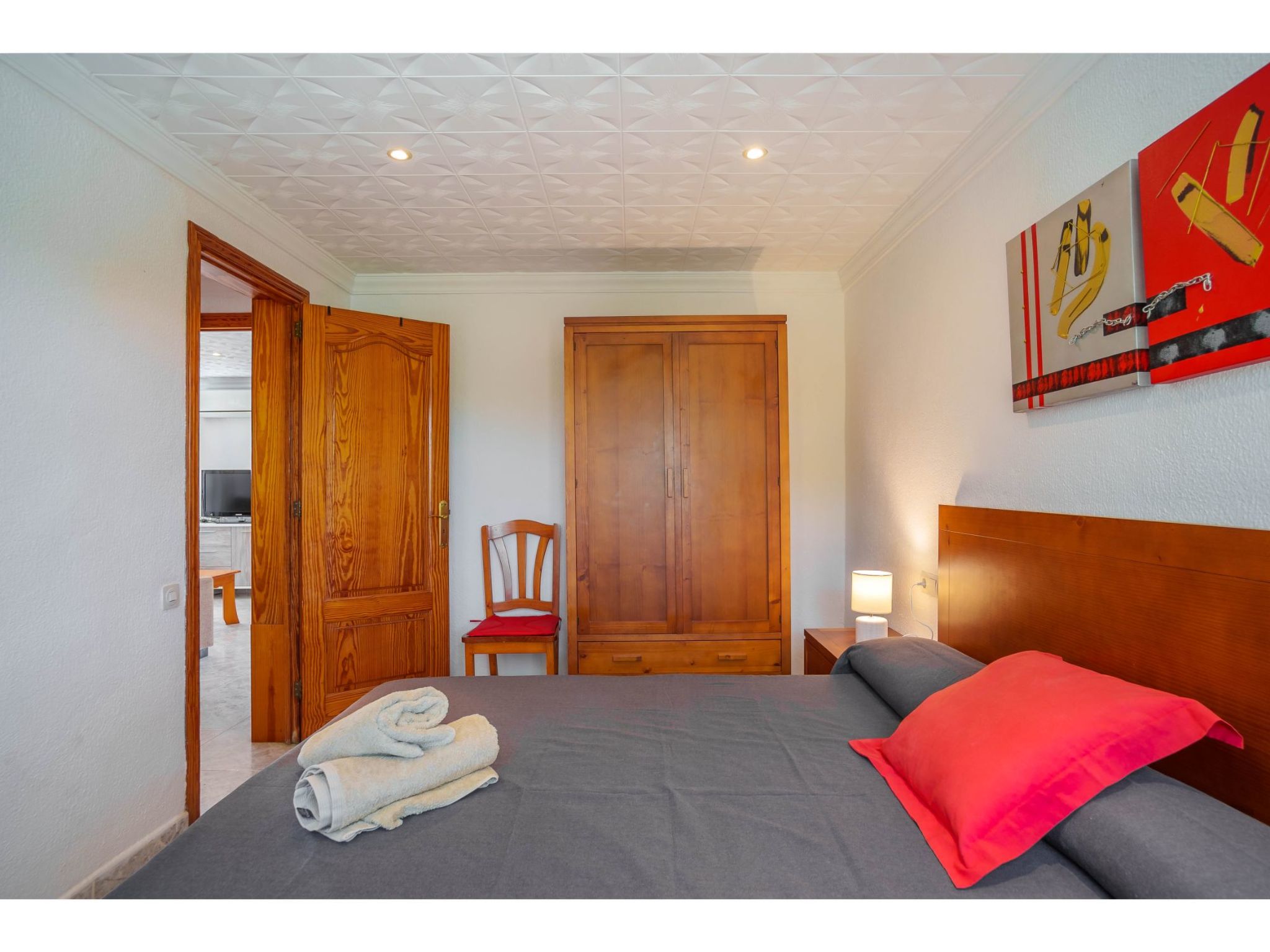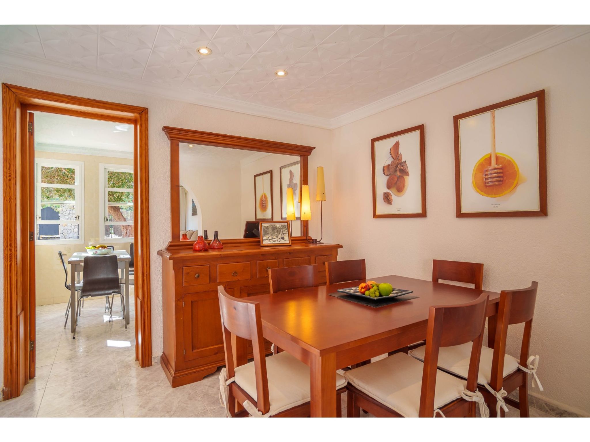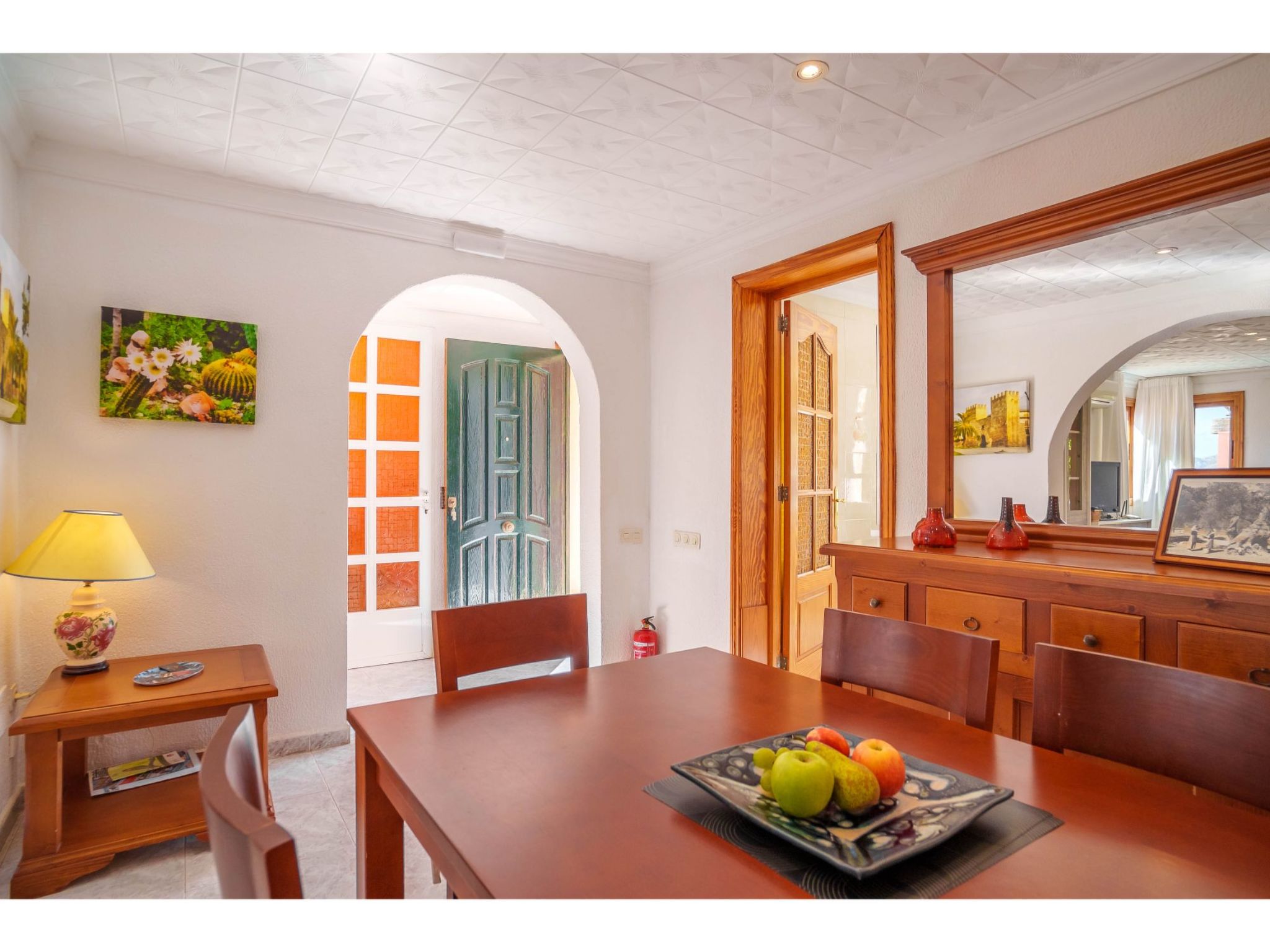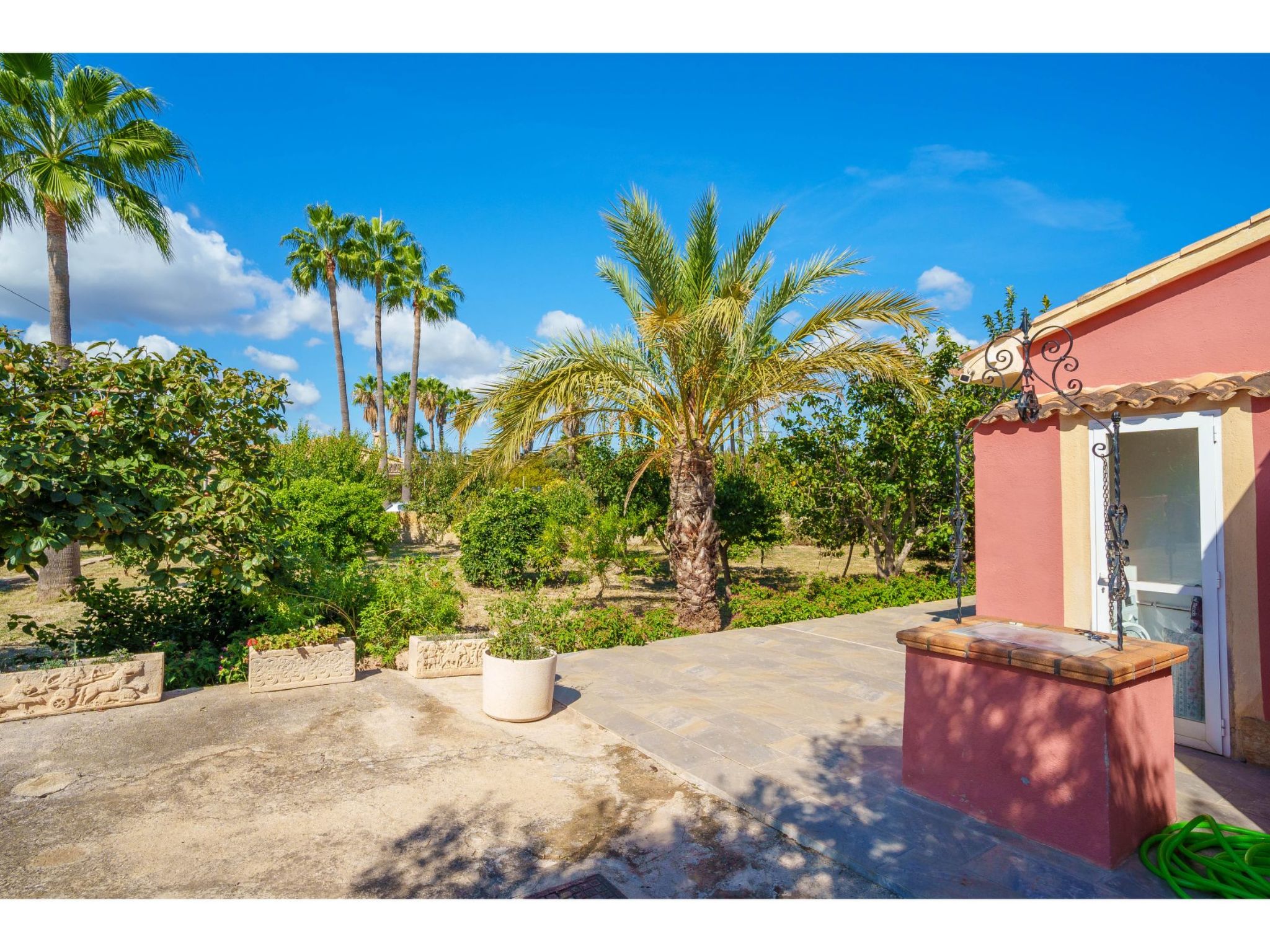 Das hübsche Ferienhaus steht 3 km südwestlich von Alcúdia im Hinterland der Bucht von Pollença. Sowohl die Strände von Alcúdia (4 km) als auch die der Bucht von Pollença (5 km) sind schnell erreicht. Kleine geteerte Straßen, ideal zum Fahrradfahren, durchziehen dieses locker bebaute Gebiet. Das ca. 1000 m² große, umzäunte Grundstück ist teils mit Rasen, teils mit naturbelassener Wiese angelegt. Vorplatz mit altem Olivenbaum. Oleanderbüsche umgeben die Sonnenterrasse des Pools (8 x 4 m, gesamte Saison geöffnet) mit Sonnenliegen, Sonnenschirm und Außendusche. Geflieste Terrassenflächen am Haus. Überdachte Terrasse (ca. 20 m²) mit Essplatz aus Stein und gemütlicher Kunstrattansitzgruppe. Gemauerte Grillstelle. In der 1. Etage weitere Terrasse (ca. 10 m²) mit Mobiliar und herrlicher Sicht auf das Meer und zum Cap Formentor. Parkmöglichkeit auf dem Grundstück. Feriengerechte Einrichtung. Fliesenböden. Sat-TV (deutsche Programme), DVD. Internetzugang (WLAN, inklusive). Waschmaschine, 2x Fön. Klimaanlage mit Kühl-/Heizfunktion im Wohnraum und in den Schlafzimmern im Erdgeschoss. Hinweis: Rauchen ist im Haus nicht gestattet.