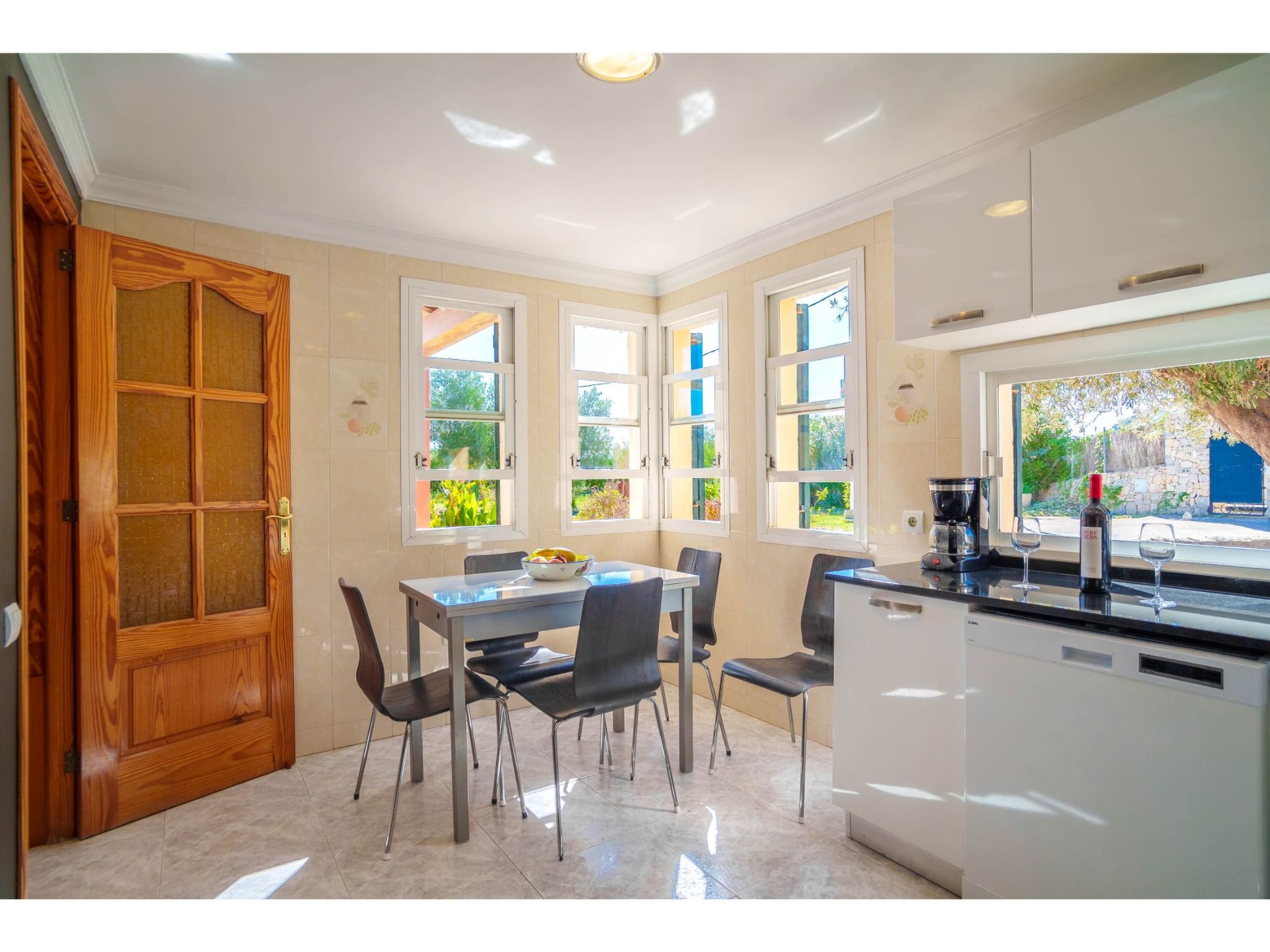 3-Zimmer-Haus, 2 Etagen, ca. 80 m². Erdgeschoss: Wohnraum mit Sitzgruppe, Essplatz für 4 Personen und Terrassenausgang. Küche (4 Ceranfelder, Backofen, Mikrowelle, Geschirrspüler, Kühl-/Gefrierkombination, Kaffeemaschine, Wasserkocher, Toaster) mit Essplatz für 4 Personen. Zweibettzimmer. Schlafzimmer mit franz. Bett (1,80 m breit). Bad/WC. Dusche/WC. Vom Flur erreicht man über eine Treppe (geht nach außen und ist nicht überdacht) das Turmzimmer: Kleines Zweibettzimmer, Deckenventilator, Terrassenausgang (als Zusatzbetten, siehe Nebenkosten). ET/2356