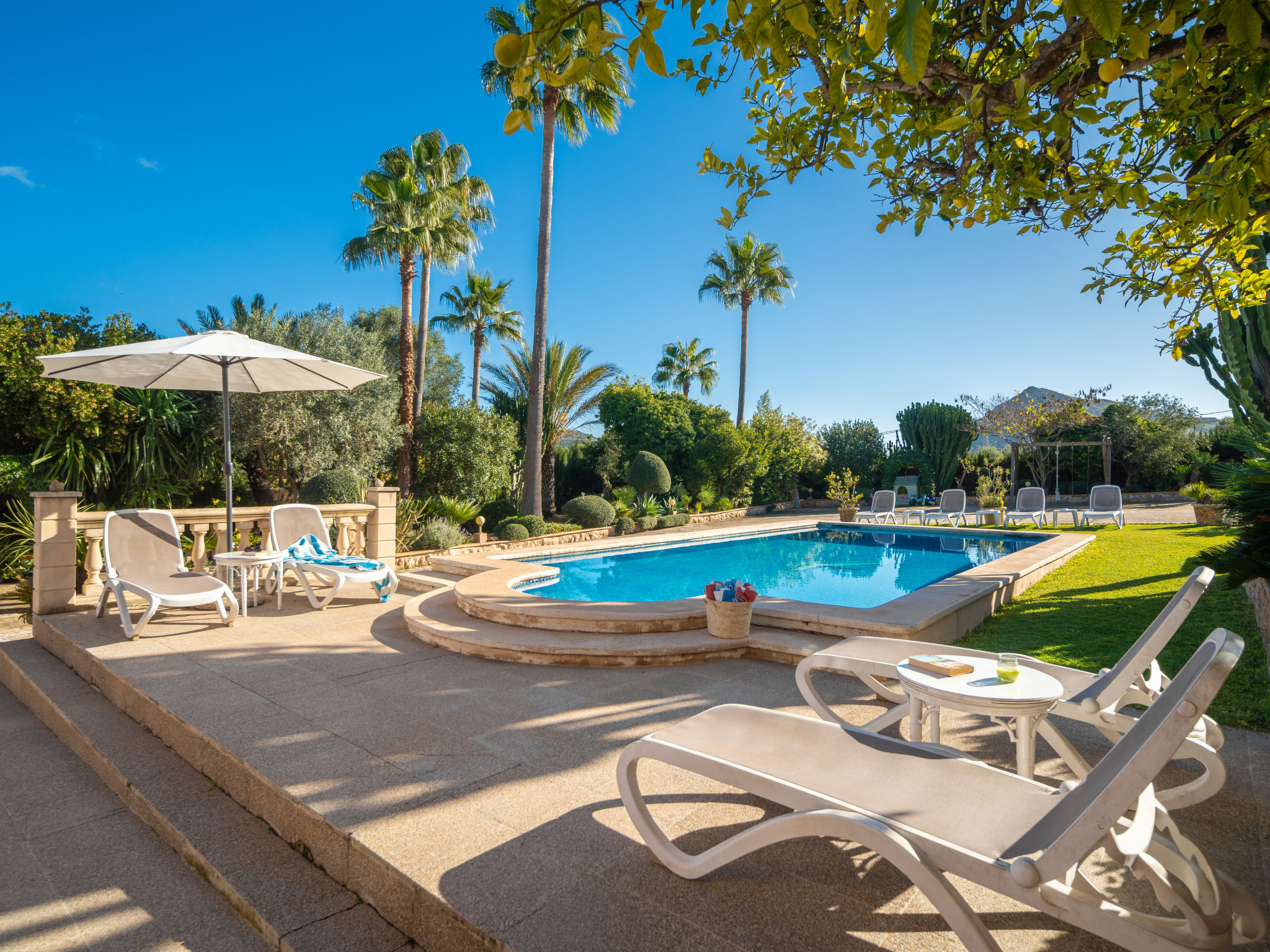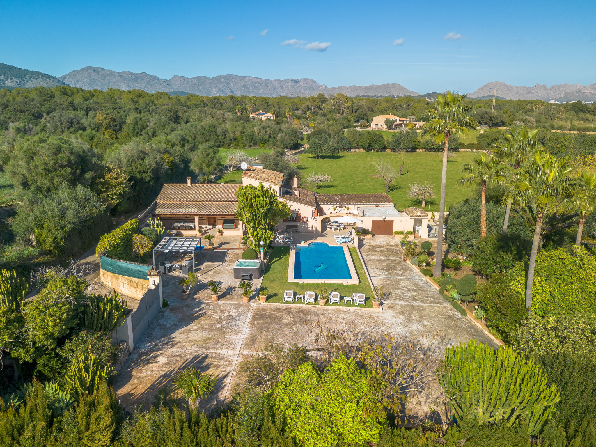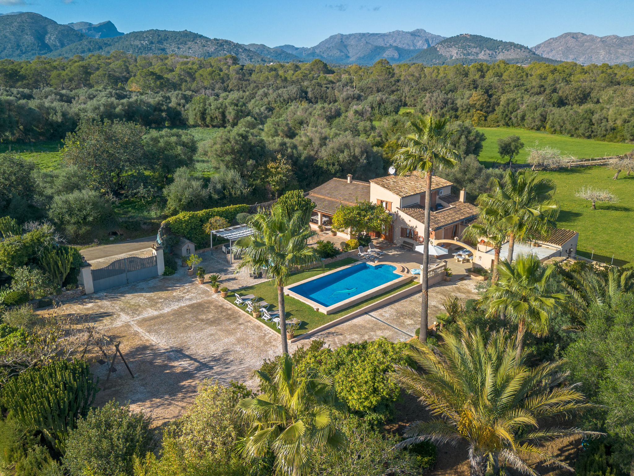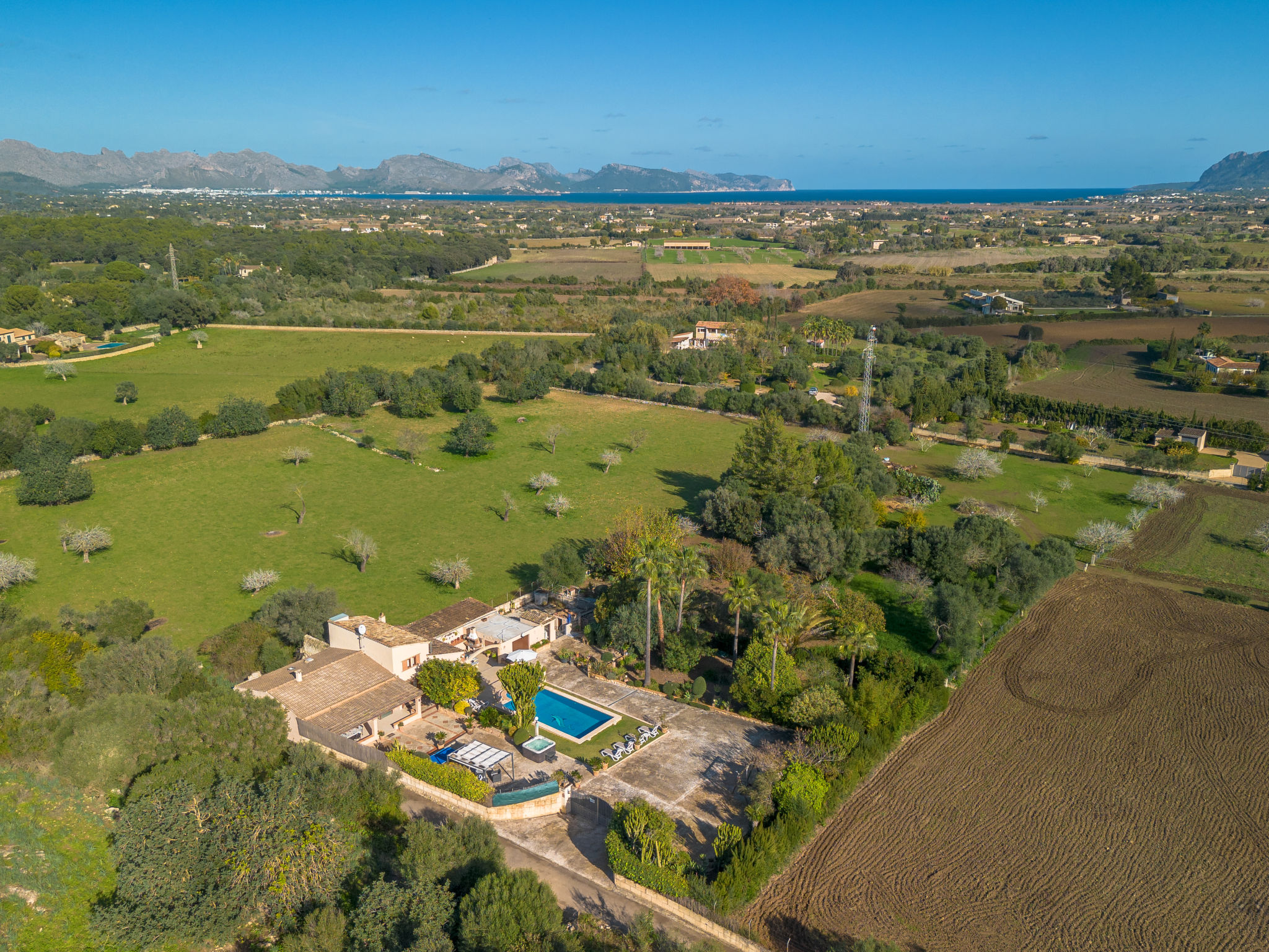 4 km von Alcúdia: Rustikaler, komfortabler Finca "Ca Na Guerrera", auf 2 Stockwerken, renoviert im Jahre 2018, umgeben von Bäumen und Feldern. Ausserhalb des Ortes, 4 km vom Zentrum von Alcudia, ruhige, sonnige Lage, 7 km vom Meer, an einer Strasse. Zur Alleinbenutzung: Grundstück 13'000 m2 (eingezäunt) mit Rasen und Pflanzen, Obstgarten (eingezäunt), wunderschöner Garten zum Entspannen, Schwimmbad eckig (9 x 4 m, 20.03.-07.11.). Dusche/WC im Poolbereich, Aussendusche, Sprudelbad, Sitzplatz (500 m2), Pergola (15 m2), Gartenmöbel, Grill (Schaukel). Im Hause: Internetzugang, Wireless LAN, Klimaanlage, Waschmaschine. Schmale Zufahrt. Parkplatz beim Haus auf dem Grundstück. Einkaufsgeschäft 6 km, Lebensmittelgeschäft 6 km, Restaurant 6 km, Bushaltestelle "Alcudia" 6 km, Bahnstation 10 km, Sandstrand "Bahia de Alcudia" 7 km, Kieselstrand 8 km, Felsstrand 8 km. Sporthafen 6 km, Jacht-Hafen 6 km, Golfplatz (18 Loch) 6 km, Tennis 8 km, Reitstall 5 km. Bitte beachten: Fahrzeug empfohlen. Geeignet für Familien, geeignet für Senioren. Objekt geeignet für 7 Erwachsene Jugendgruppen nur auf Anfrage. Be- und Entladen am Ferienhaus möglich. Hinter dem Haus werden in einem Gehege mit direktem Zugang zum Garten 5 Ponies gehalten.