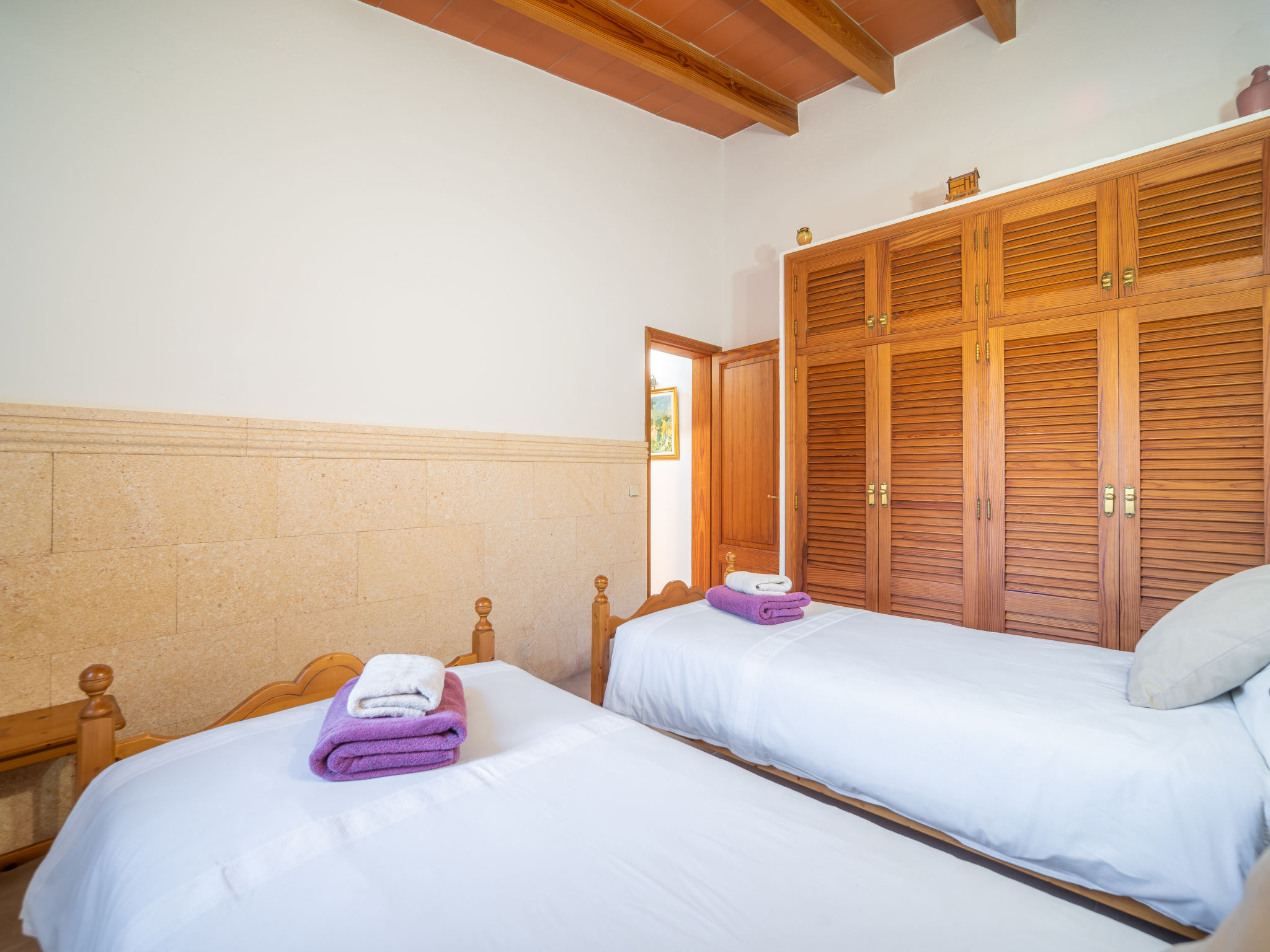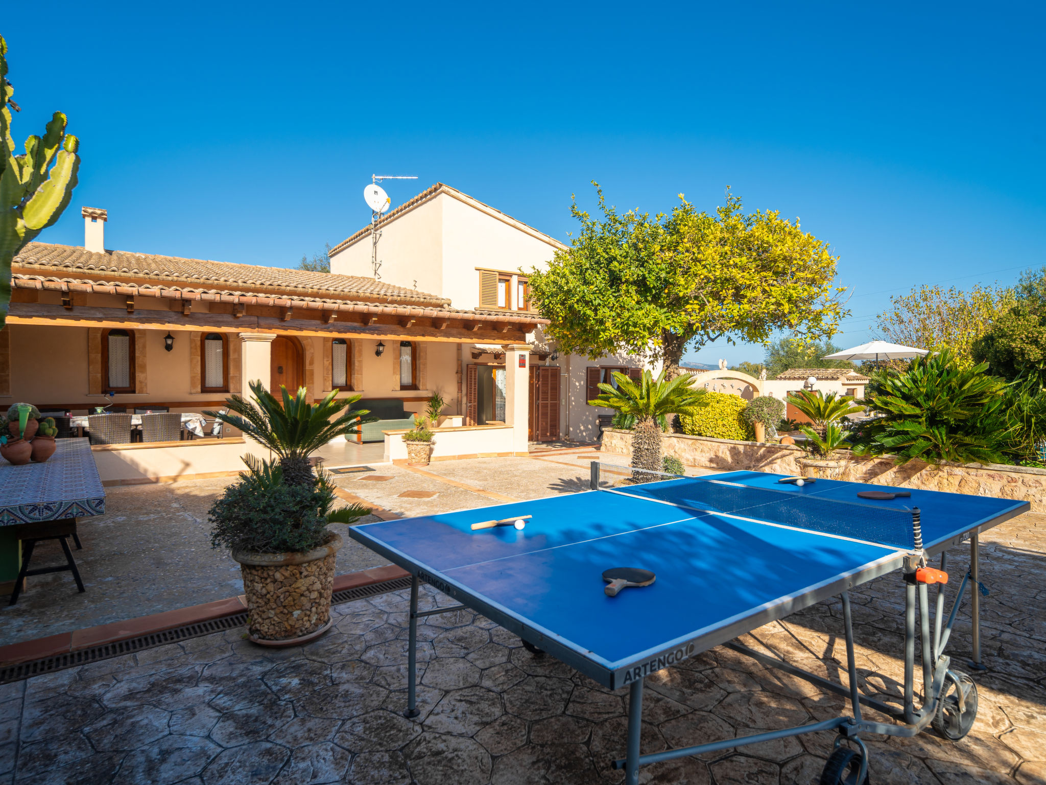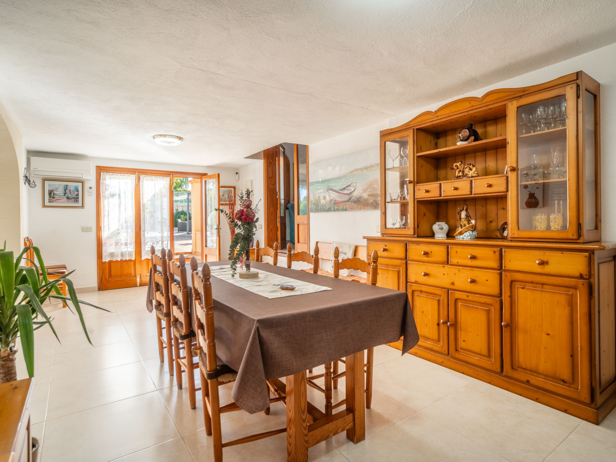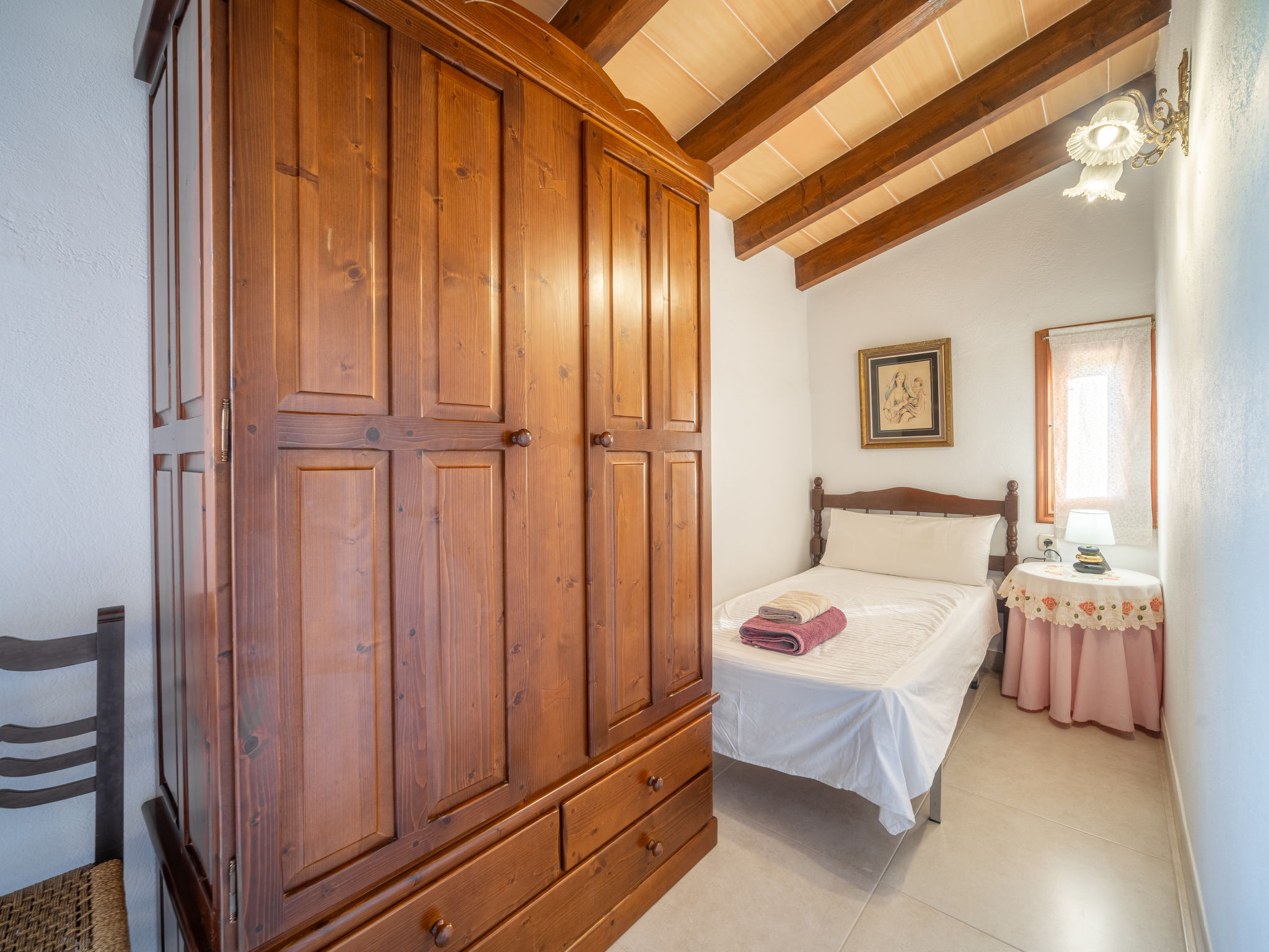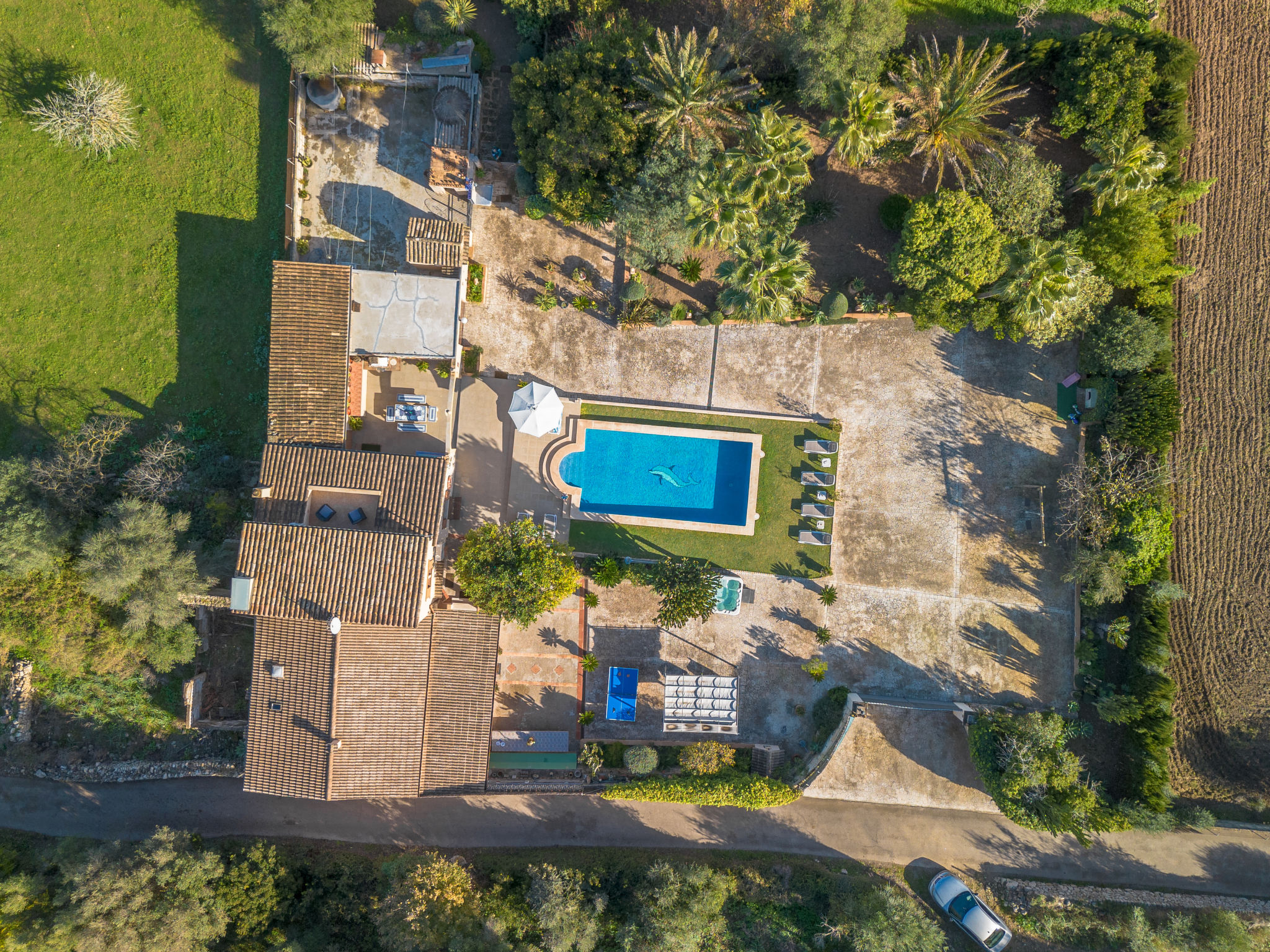4 km von Alcúdia: Rustikaler, komfortabler Finca "Ca Na Guerrera", auf 2 Stockwerken, renoviert im Jahre 2018, umgeben von Bäumen und Feldern. Ausserhalb des Ortes, 4 km vom Zentrum von Alcudia, ruhige, sonnige Lage, 7 km vom Meer, an einer Strasse. Zur Alleinbenutzung: Grundstück 13'000 m2 (eingezäunt) mit Rasen und Pflanzen, Obstgarten (eingezäunt), wunderschöner Garten zum Entspannen, Schwimmbad eckig (9 x 4 m, 20.03.-07.11.). Dusche/WC im Poolbereich, Aussendusche, Sprudelbad, Sitzplatz (500 m2), Pergola (15 m2), Gartenmöbel, Grill (Schaukel). Im Hause: Internetzugang, Wireless LAN, Klimaanlage, Waschmaschine. Schmale Zufahrt. Parkplatz beim Haus auf dem Grundstück. Einkaufsgeschäft 6 km, Lebensmittelgeschäft 6 km, Restaurant 6 km, Bushaltestelle "Alcudia" 6 km, Bahnstation 10 km, Sandstrand "Bahia de Alcudia" 7 km, Kieselstrand 8 km, Felsstrand 8 km. Sporthafen 6 km, Jacht-Hafen 6 km, Golfplatz (18 Loch) 6 km, Tennis 8 km, Reitstall 5 km. Bitte beachten: Fahrzeug empfohlen. Geeignet für Familien, geeignet für Senioren. Objekt geeignet für 7 Erwachsene Jugendgruppen nur auf Anfrage. Be- und Entladen am Ferienhaus möglich. Hinter dem Haus werden in einem Gehege mit direktem Zugang zum Garten 5 Ponies gehalten.