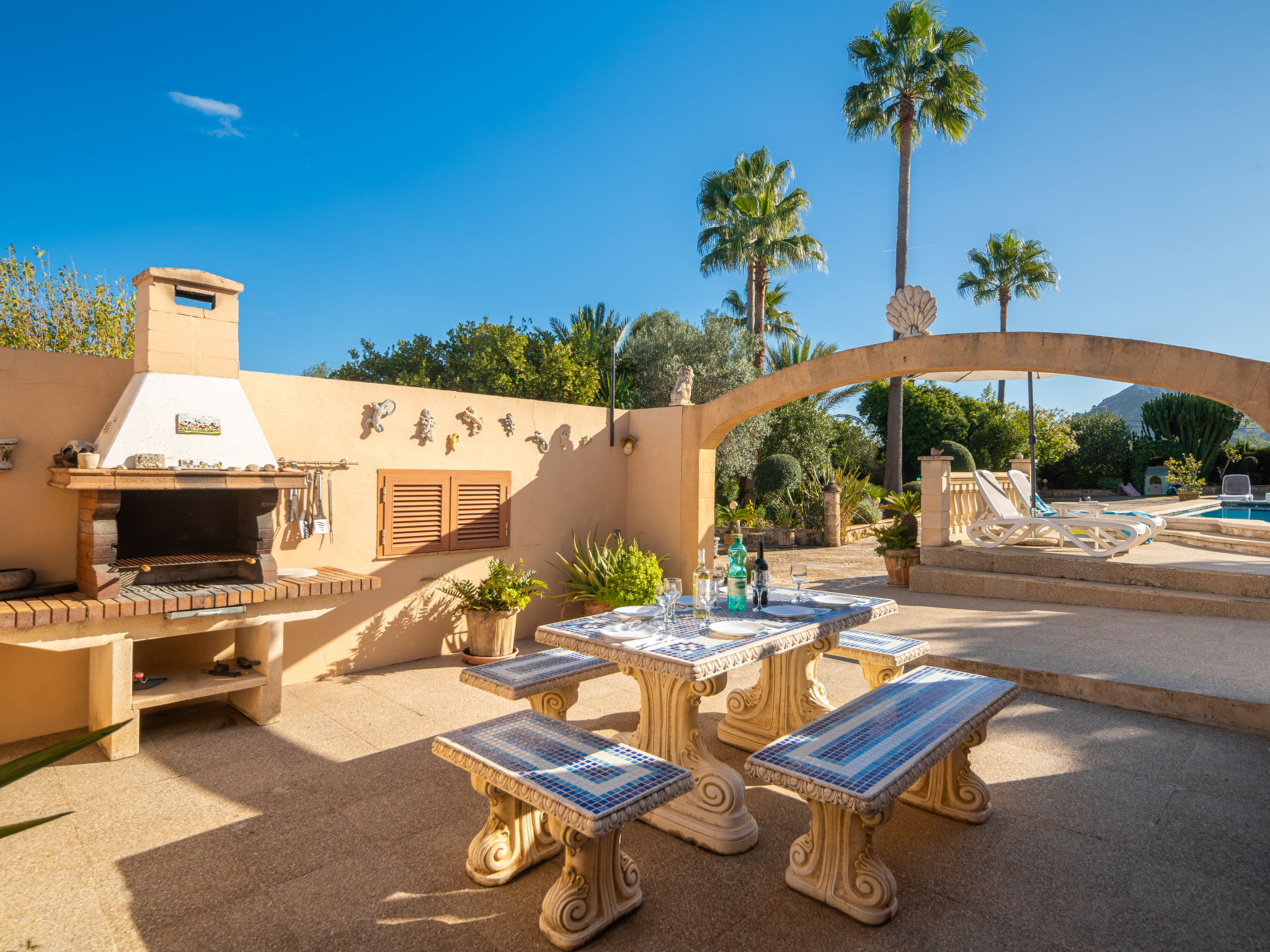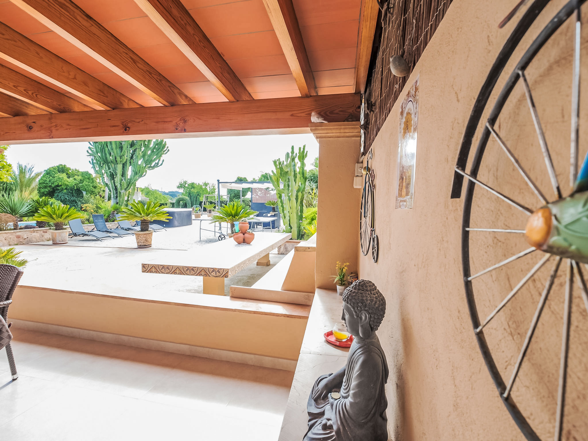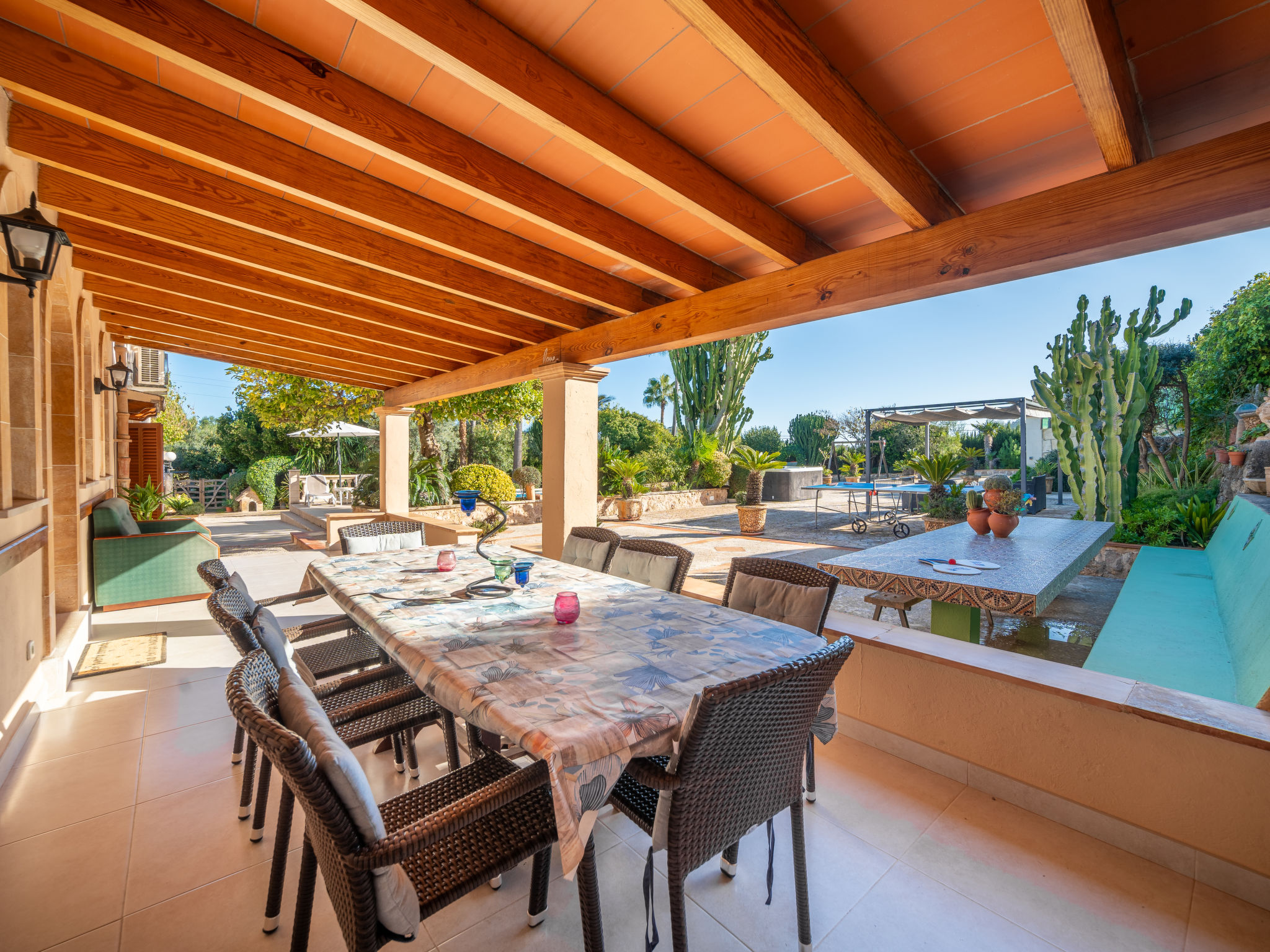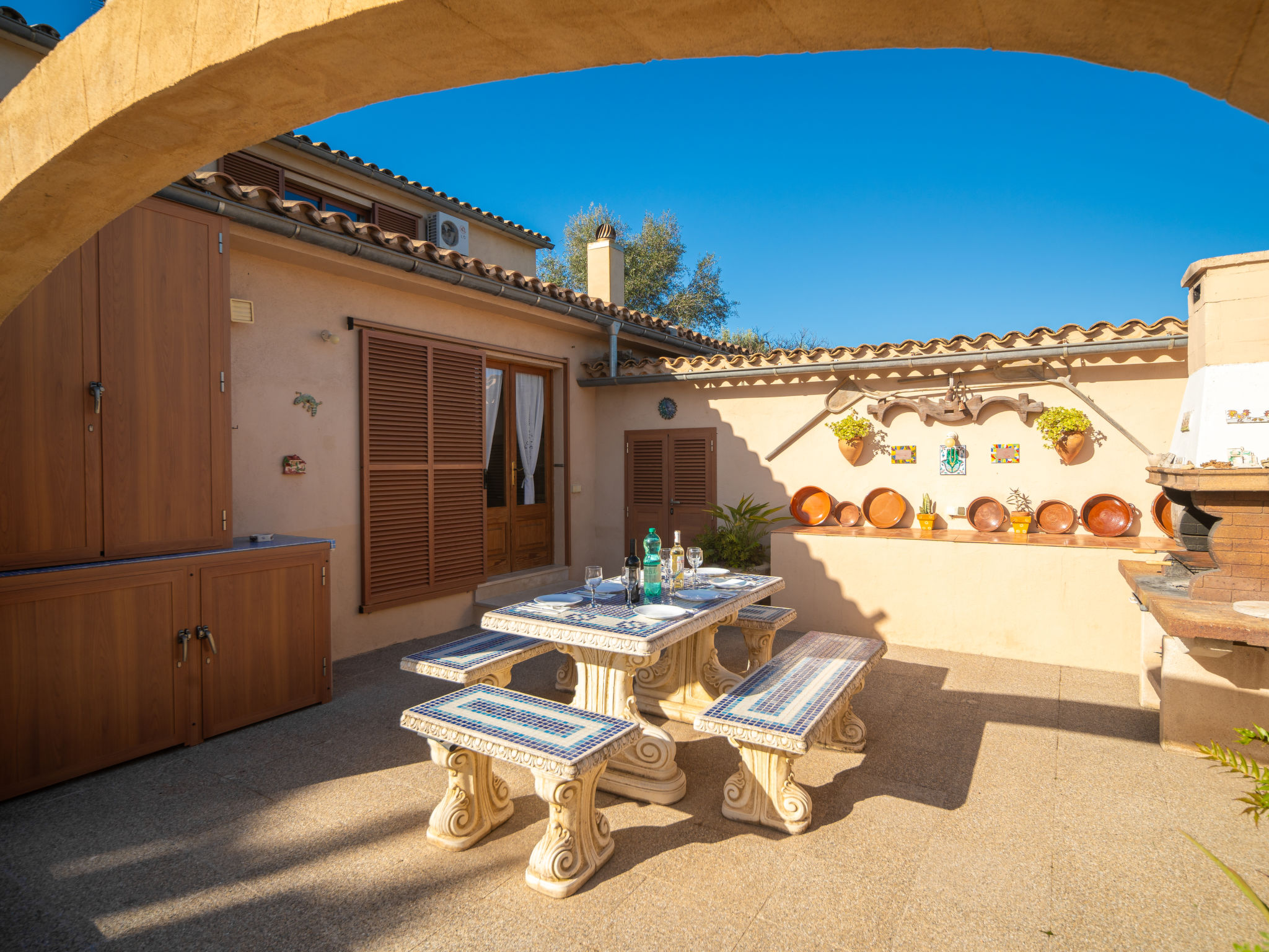 4 km von Alcúdia: Rustikaler, komfortabler Finca "Ca Na Guerrera", auf 2 Stockwerken, renoviert im Jahre 2018, umgeben von Bäumen und Feldern. Ausserhalb des Ortes, 4 km vom Zentrum von Alcudia, ruhige, sonnige Lage, 7 km vom Meer, an einer Strasse. Zur Alleinbenutzung: Grundstück 13'000 m2 (eingezäunt) mit Rasen und Pflanzen, Obstgarten (eingezäunt), wunderschöner Garten zum Entspannen, Schwimmbad eckig (9 x 4 m, 20.03.-07.11.). Dusche/WC im Poolbereich, Aussendusche, Sprudelbad, Sitzplatz (500 m2), Pergola (15 m2), Gartenmöbel, Grill (Schaukel). Im Hause: Internetzugang, Wireless LAN, Klimaanlage, Waschmaschine. Schmale Zufahrt. Parkplatz beim Haus auf dem Grundstück. Einkaufsgeschäft 6 km, Lebensmittelgeschäft 6 km, Restaurant 6 km, Bushaltestelle "Alcudia" 6 km, Bahnstation 10 km, Sandstrand "Bahia de Alcudia" 7 km, Kieselstrand 8 km, Felsstrand 8 km. Sporthafen 6 km, Jacht-Hafen 6 km, Golfplatz (18 Loch) 6 km, Tennis 8 km, Reitstall 5 km. Bitte beachten: Fahrzeug empfohlen. Geeignet für Familien, geeignet für Senioren. Objekt geeignet für 7 Erwachsene Jugendgruppen nur auf Anfrage. Be- und Entladen am Ferienhaus möglich. Hinter dem Haus werden in einem Gehege mit direktem Zugang zum Garten 5 Ponies gehalten.
