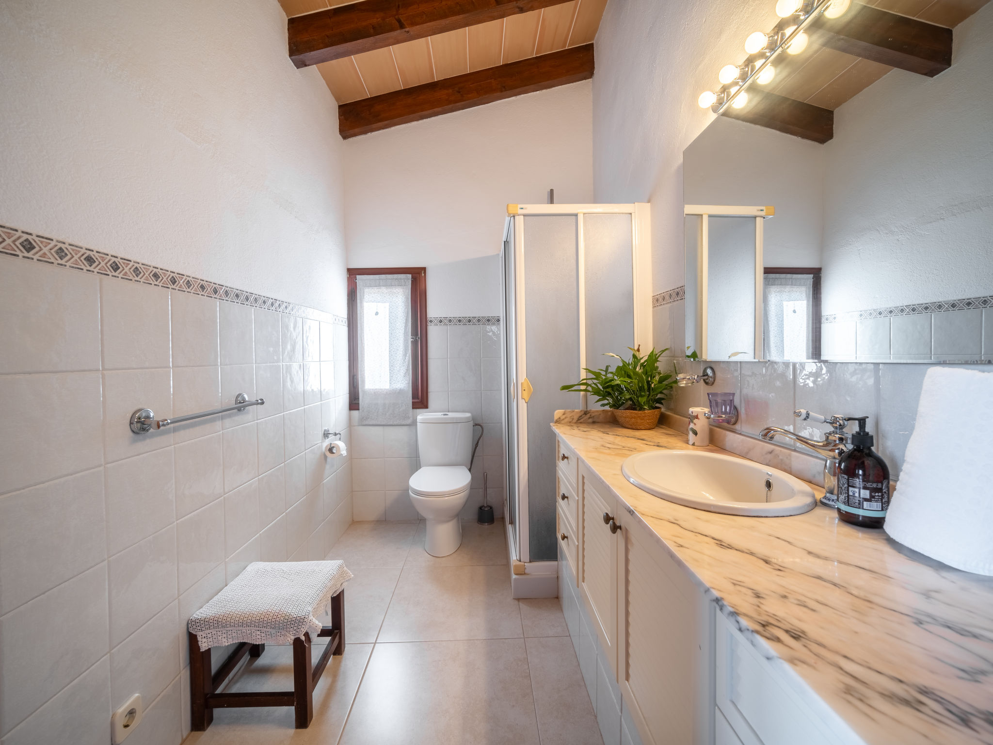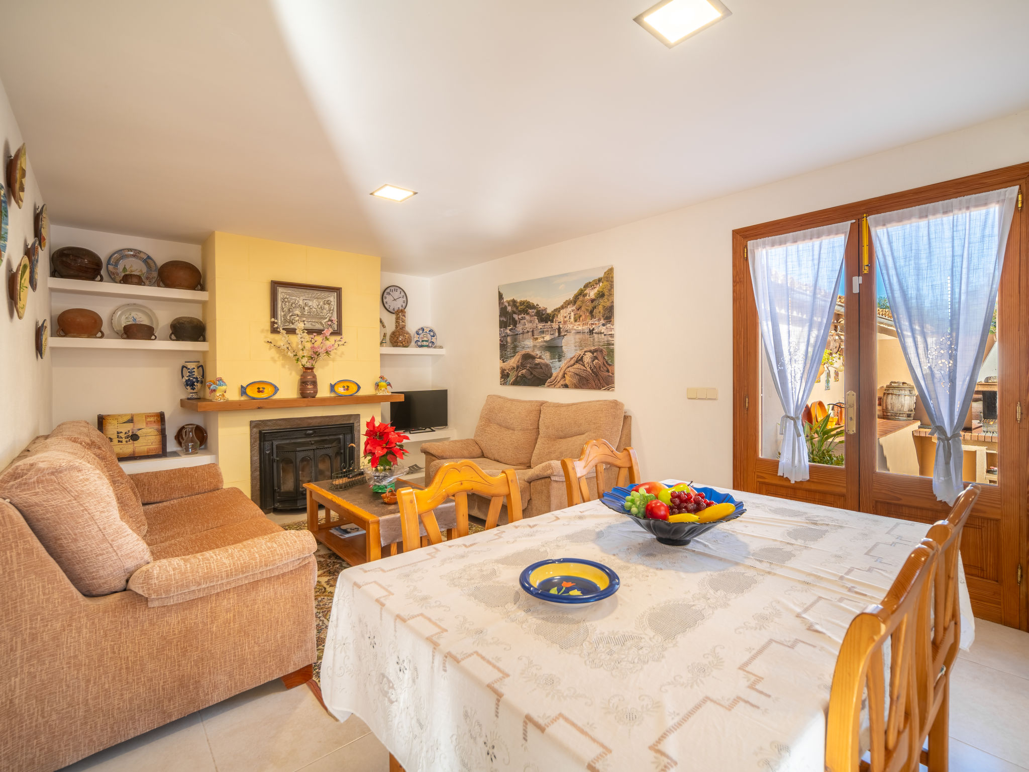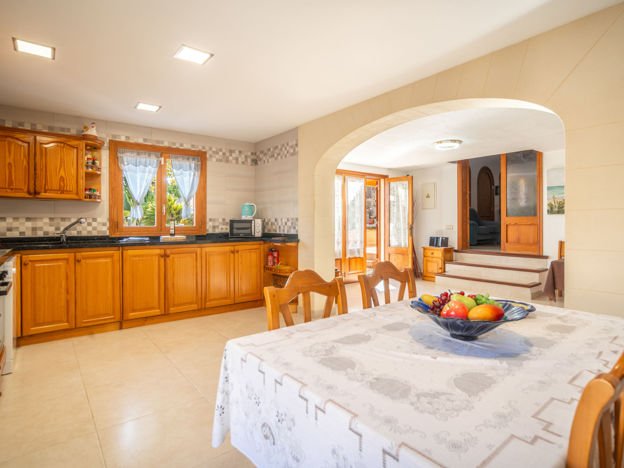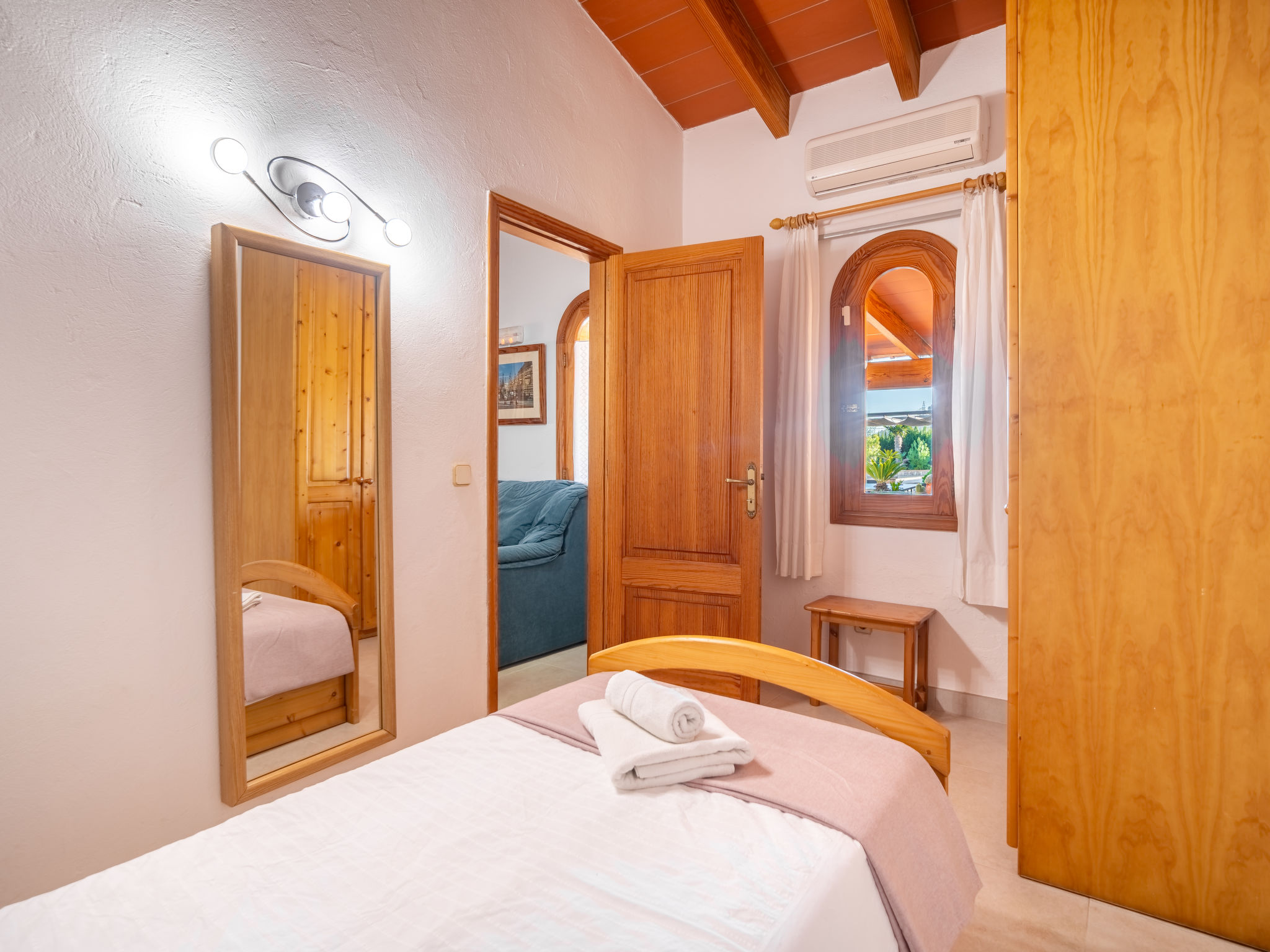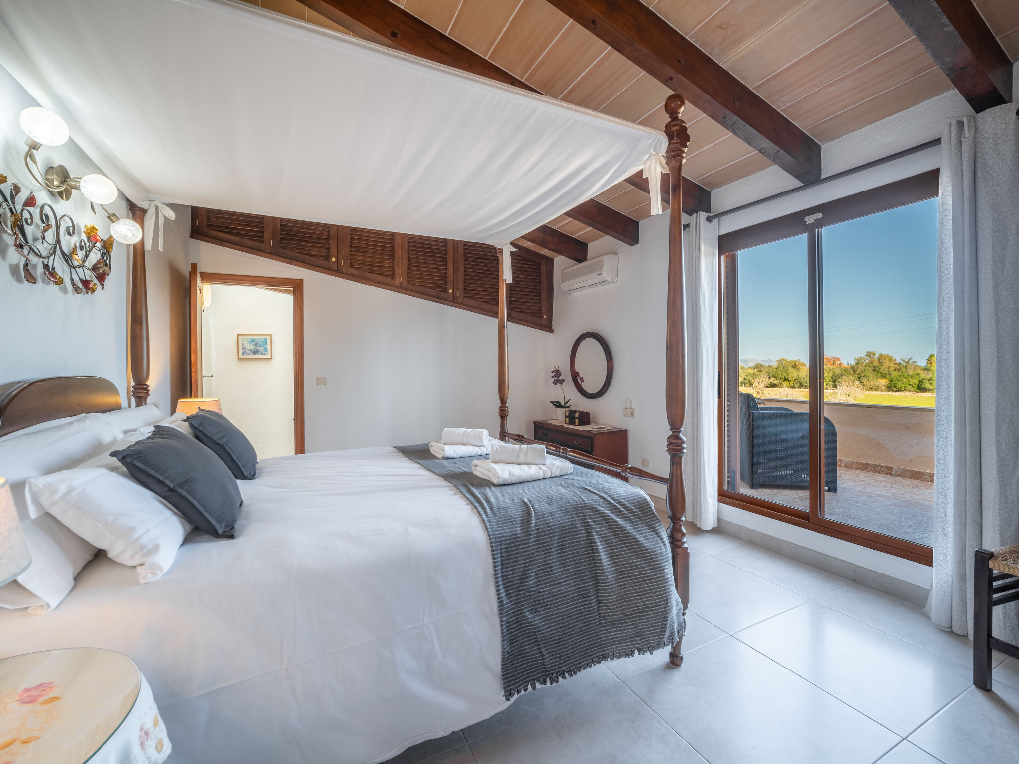 4 km von Alcúdia: Rustikaler, komfortabler Finca "Ca Na Guerrera", auf 2 Stockwerken, renoviert im Jahre 2018, umgeben von Bäumen und Feldern. Ausserhalb des Ortes, 4 km vom Zentrum von Alcudia, ruhige, sonnige Lage, 7 km vom Meer, an einer Strasse. Zur Alleinbenutzung: Grundstück 13'000 m2 (eingezäunt) mit Rasen und Pflanzen, Obstgarten (eingezäunt), wunderschöner Garten zum Entspannen, Schwimmbad eckig (9 x 4 m, 20.03.-07.11.). Dusche/WC im Poolbereich, Aussendusche, Sprudelbad, Sitzplatz (500 m2), Pergola (15 m2), Gartenmöbel, Grill (Schaukel). Im Hause: Internetzugang, Wireless LAN, Klimaanlage, Waschmaschine. Schmale Zufahrt. Parkplatz beim Haus auf dem Grundstück. Einkaufsgeschäft 6 km, Lebensmittelgeschäft 6 km, Restaurant 6 km, Bushaltestelle "Alcudia" 6 km, Bahnstation 10 km, Sandstrand "Bahia de Alcudia" 7 km, Kieselstrand 8 km, Felsstrand 8 km. Sporthafen 6 km, Jacht-Hafen 6 km, Golfplatz (18 Loch) 6 km, Tennis 8 km, Reitstall 5 km. Bitte beachten: Fahrzeug empfohlen. Geeignet für Familien, geeignet für Senioren. Objekt geeignet für 7 Erwachsene Jugendgruppen nur auf Anfrage. Be- und Entladen am Ferienhaus möglich. Hinter dem Haus werden in einem Gehege mit direktem Zugang zum Garten 5 Ponies gehalten.