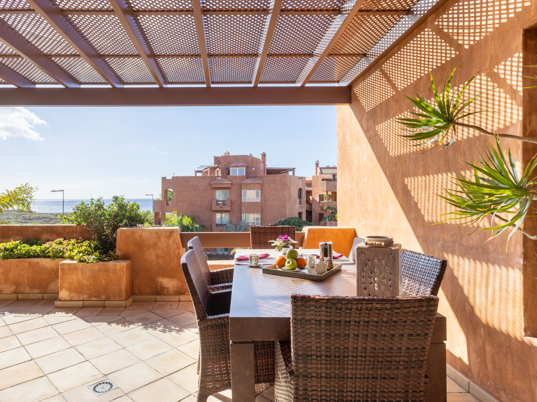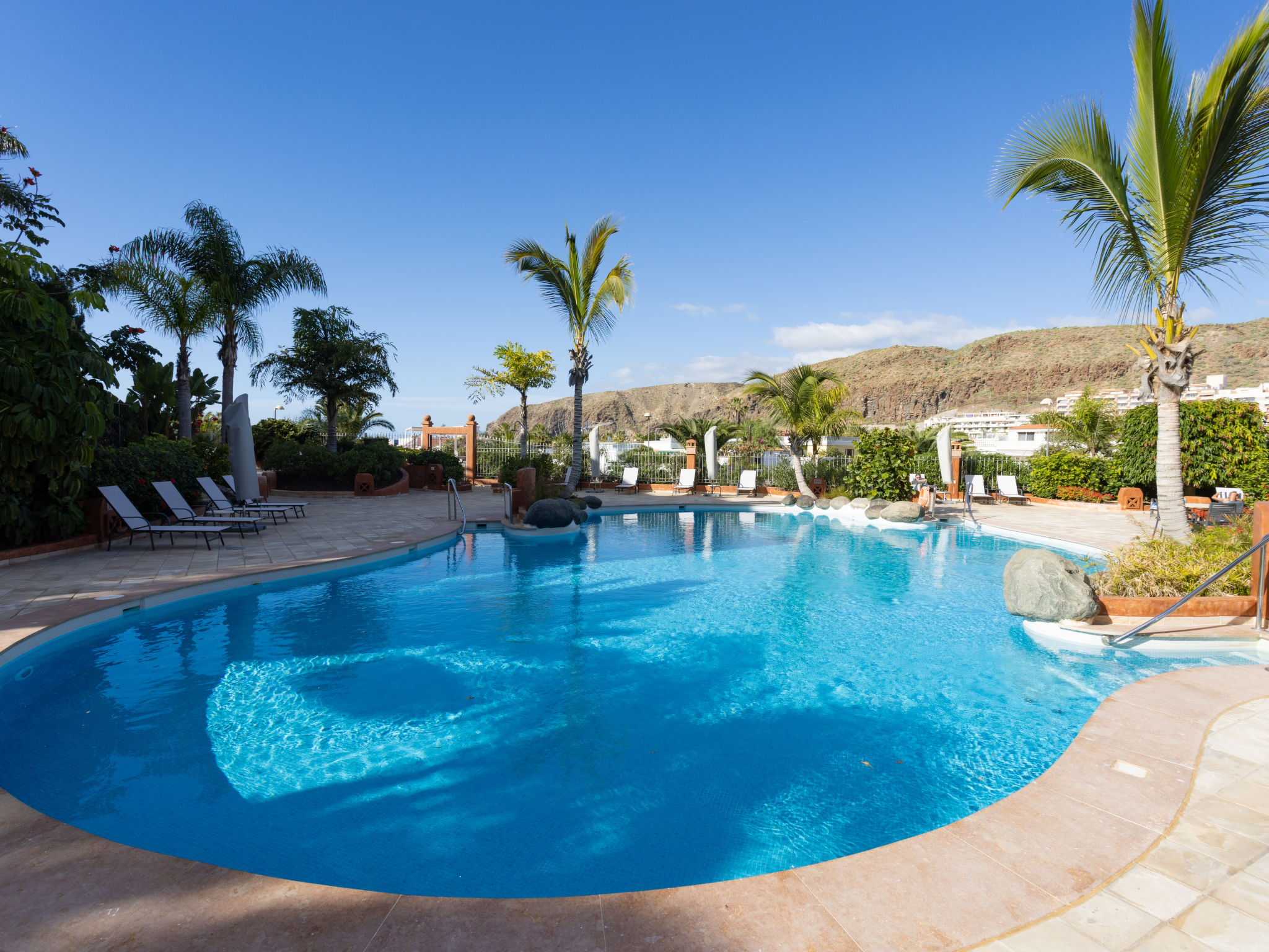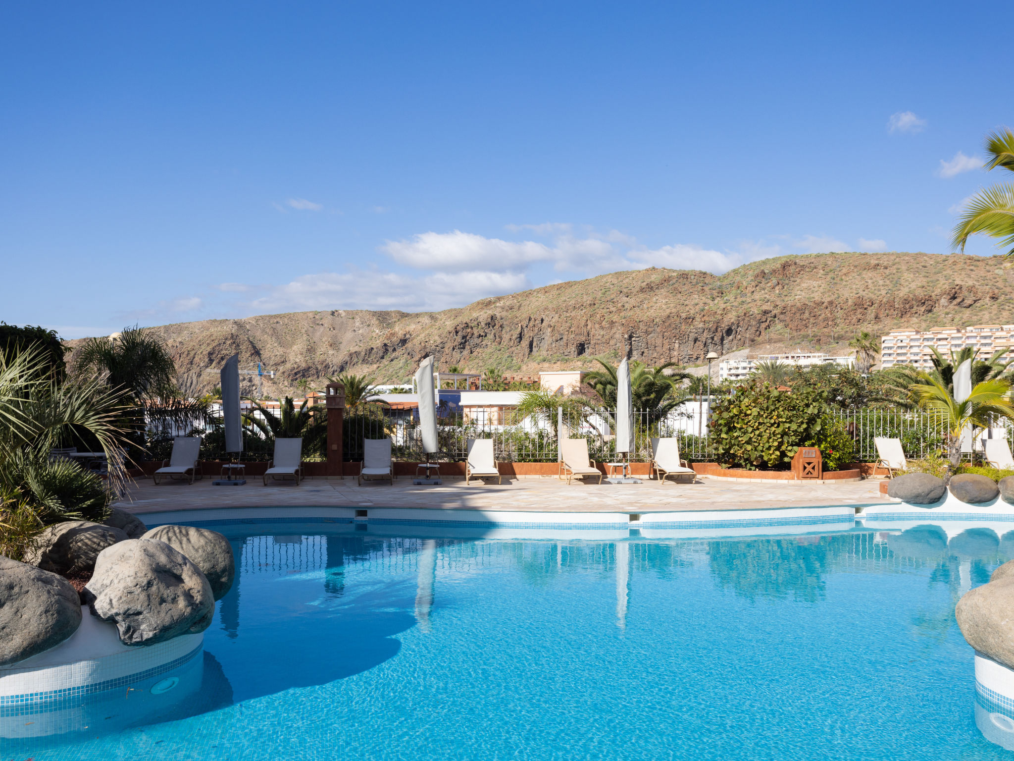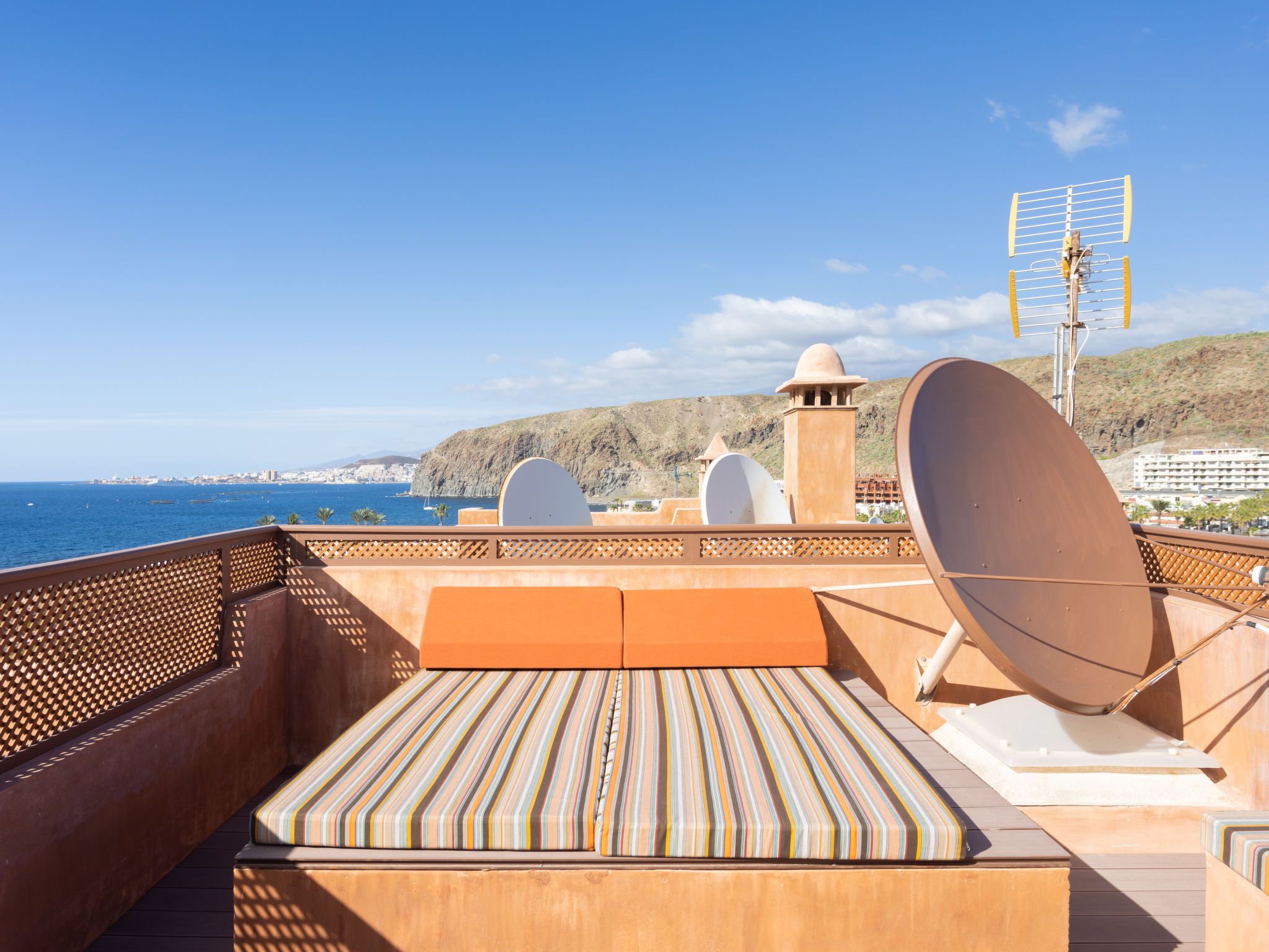 Modernes, gemütliches, komfortables Appartementhaus "Duplex Bencomo", auf 2 Stockwerken, Baujahr 2006. Im Ort, ruhige, sonnige Lage, 200 m vom Meer, 200 m vom Strand. Zur Mitbenutzung: schöner, gepflegter Terrassengarten, 3 Schwimmbäder beheizt (120 - 160 cm tief, saisonale Verfügbarkeit: 01.Jan.-31.Dez.). Dusche/WC im Poolbereich, Kinderbecken. Im Hause: Fahrstuhl. Parkplatz (für 2 Autos, überdacht). Supermarkt, Restaurant, Bushaltestelle 300 m, Steinstrand 200 m. Bewachte Residenz.
