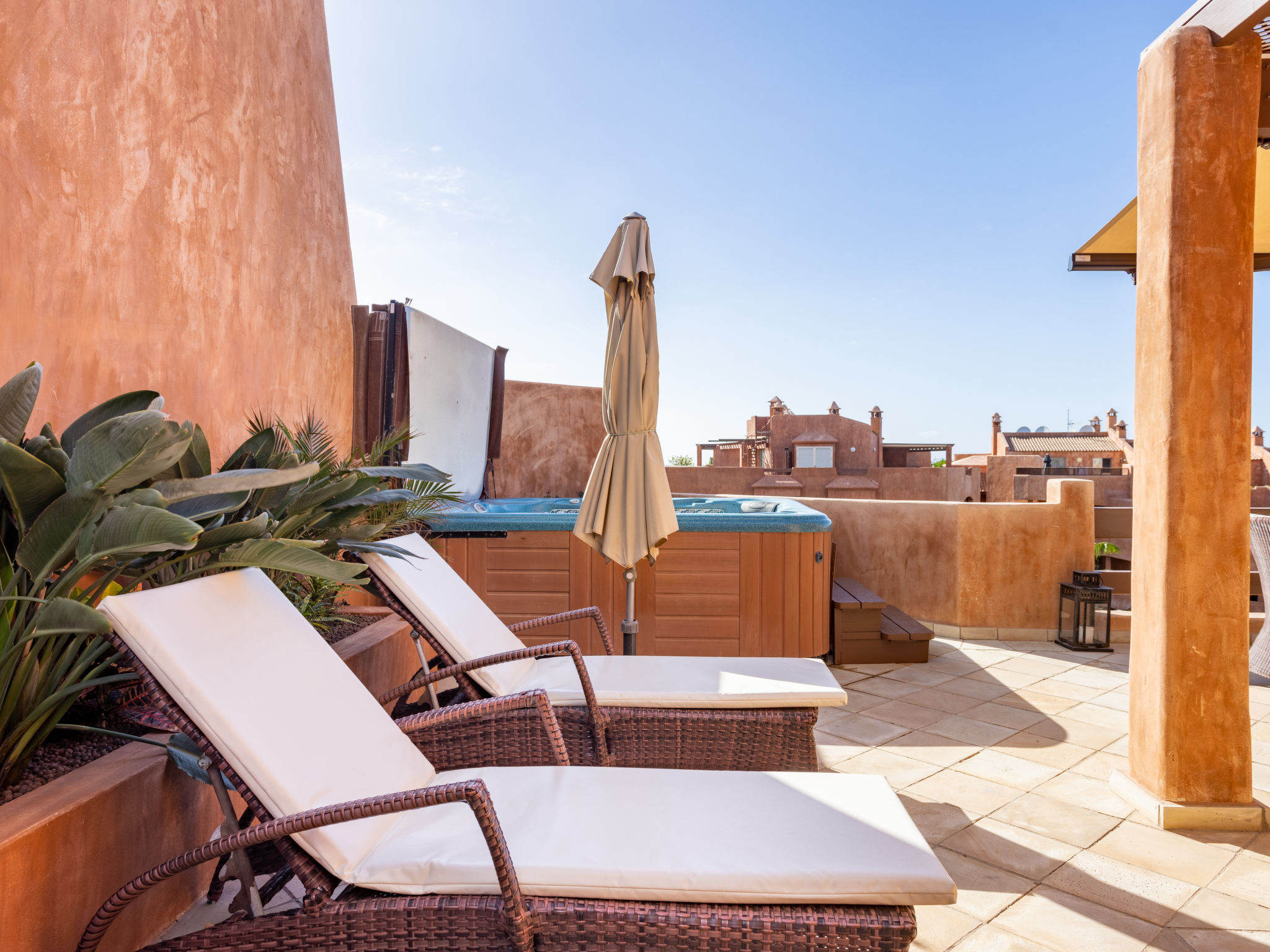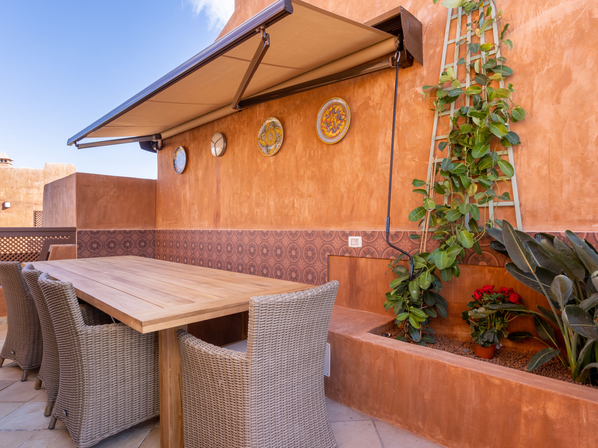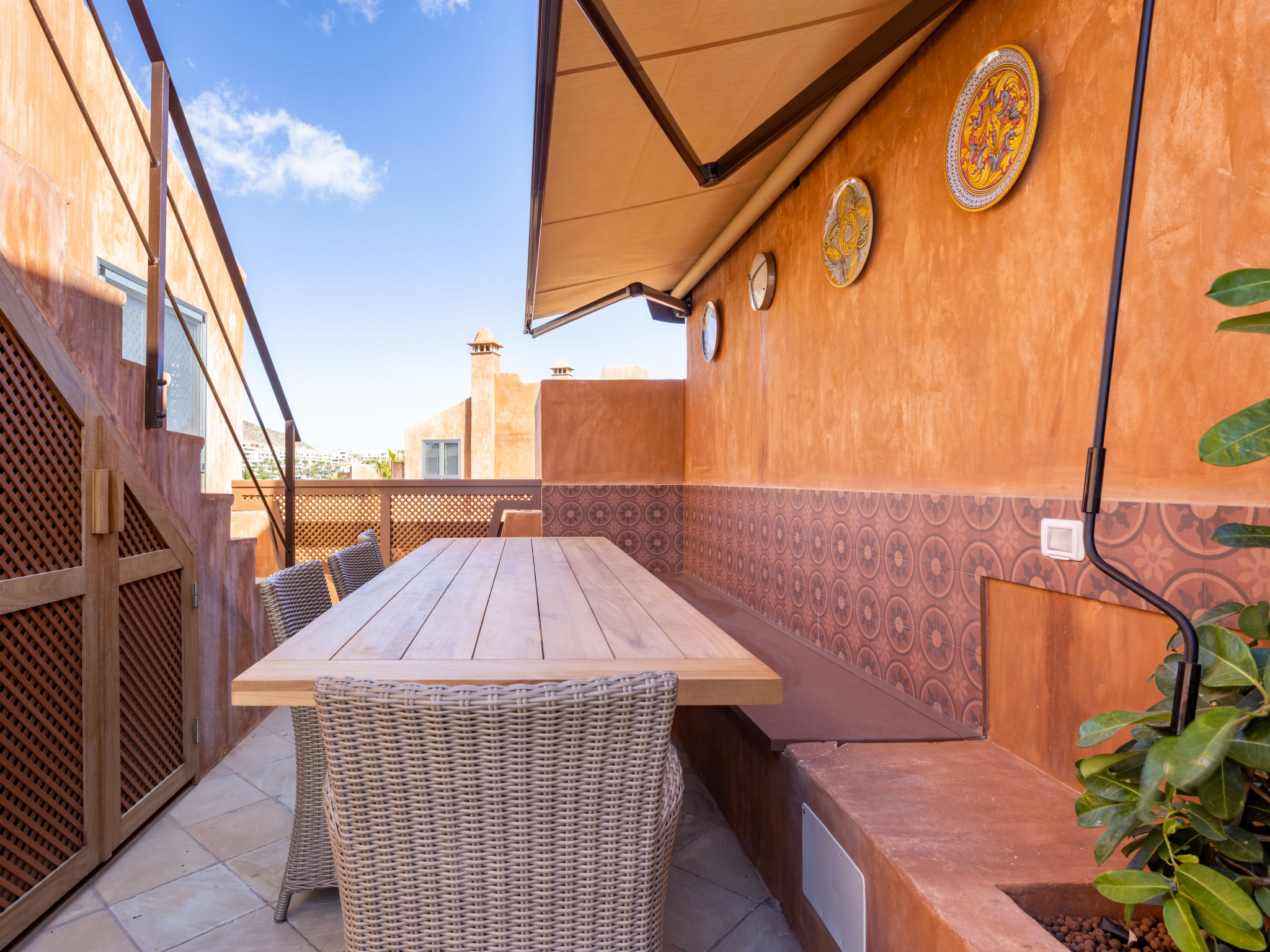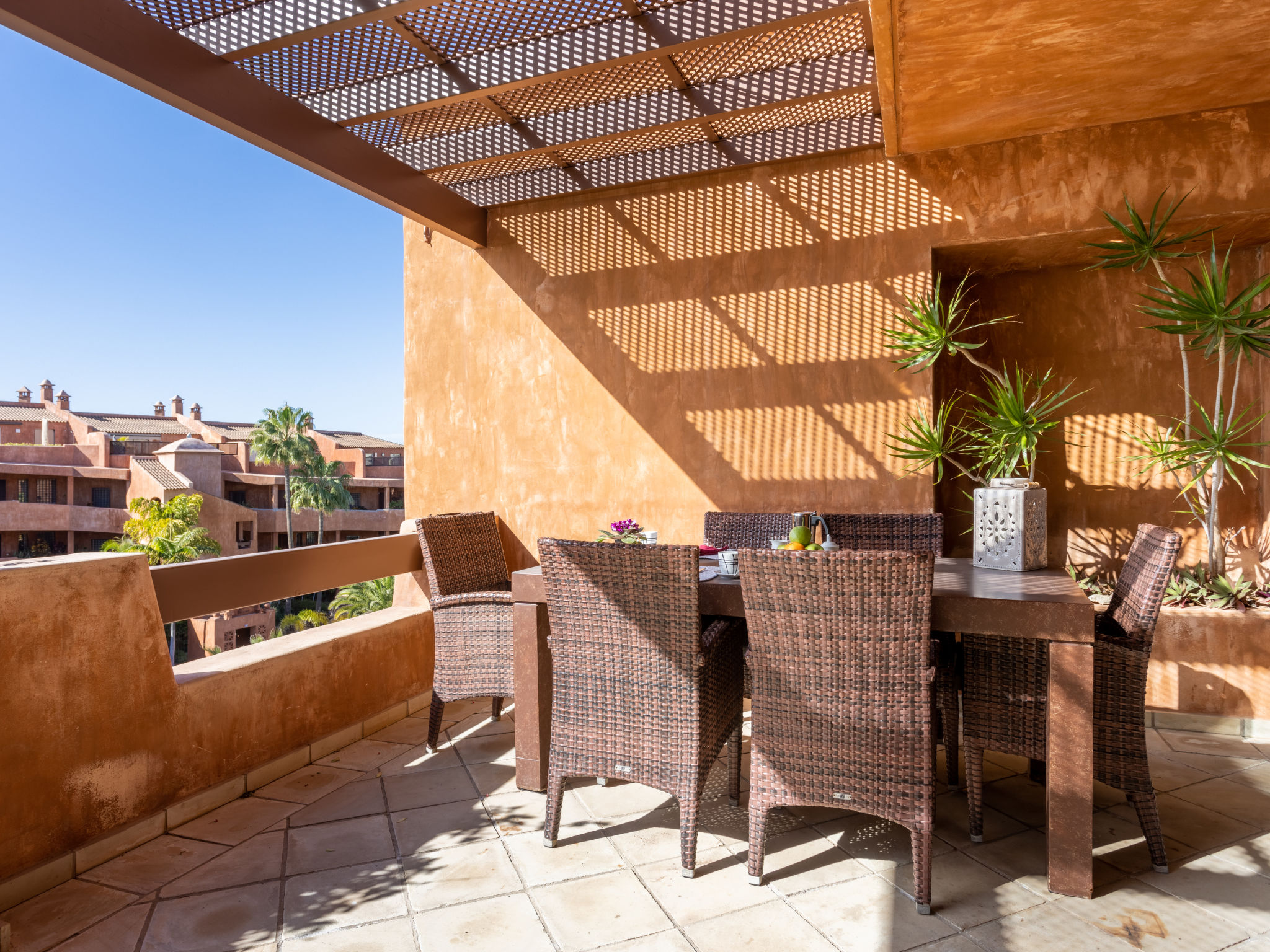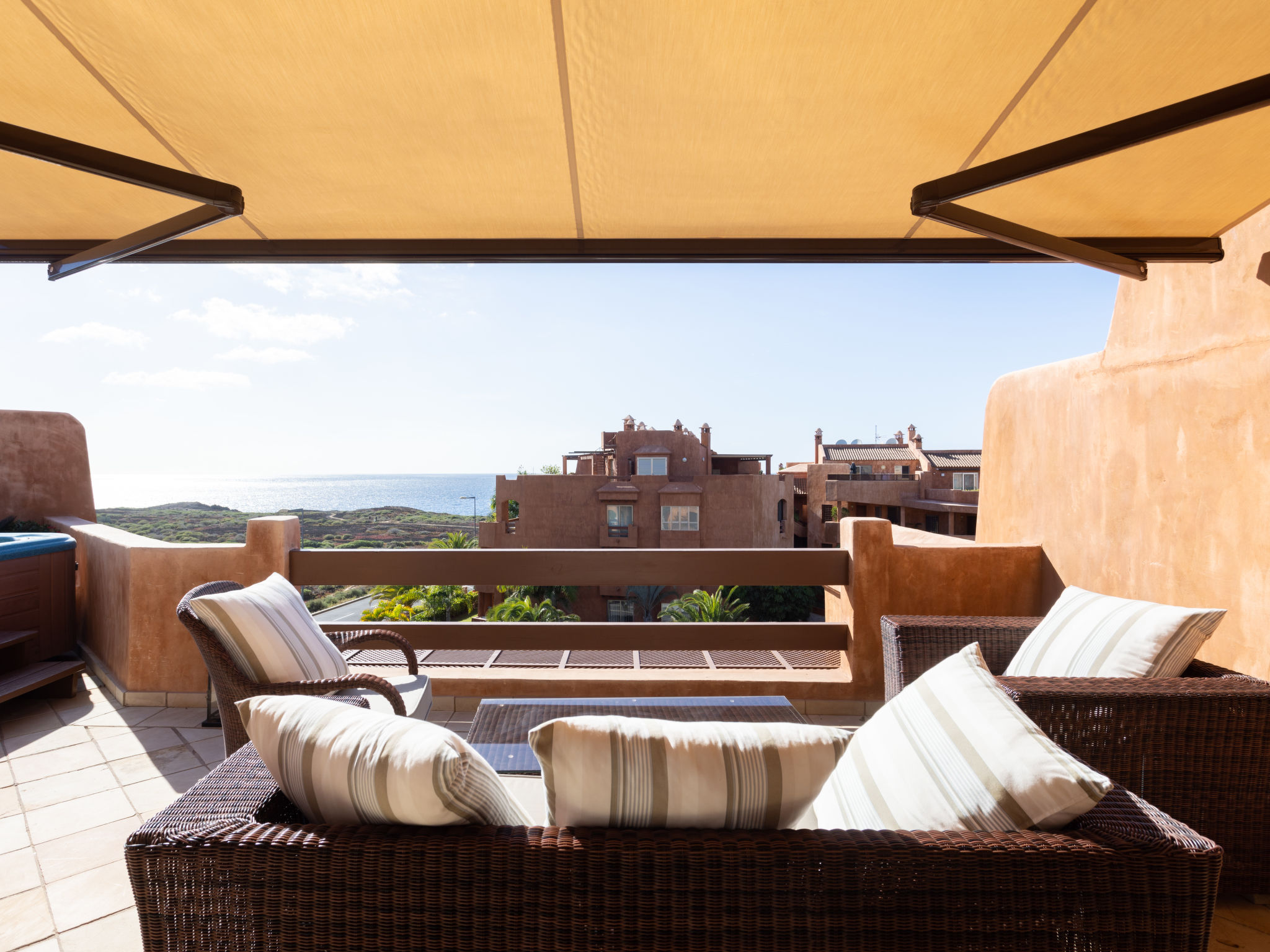 Modernes, gemütliches, komfortables Appartementhaus "Duplex Bencomo", auf 2 Stockwerken, Baujahr 2006. Im Ort, ruhige, sonnige Lage, 200 m vom Meer, 200 m vom Strand. Zur Mitbenutzung: schöner, gepflegter Terrassengarten, 3 Schwimmbäder beheizt (120 - 160 cm tief, saisonale Verfügbarkeit: 01.Jan.-31.Dez.). Dusche/WC im Poolbereich, Kinderbecken. Im Hause: Fahrstuhl. Parkplatz (für 2 Autos, überdacht). Supermarkt, Restaurant, Bushaltestelle 300 m, Steinstrand 200 m. Bewachte Residenz.