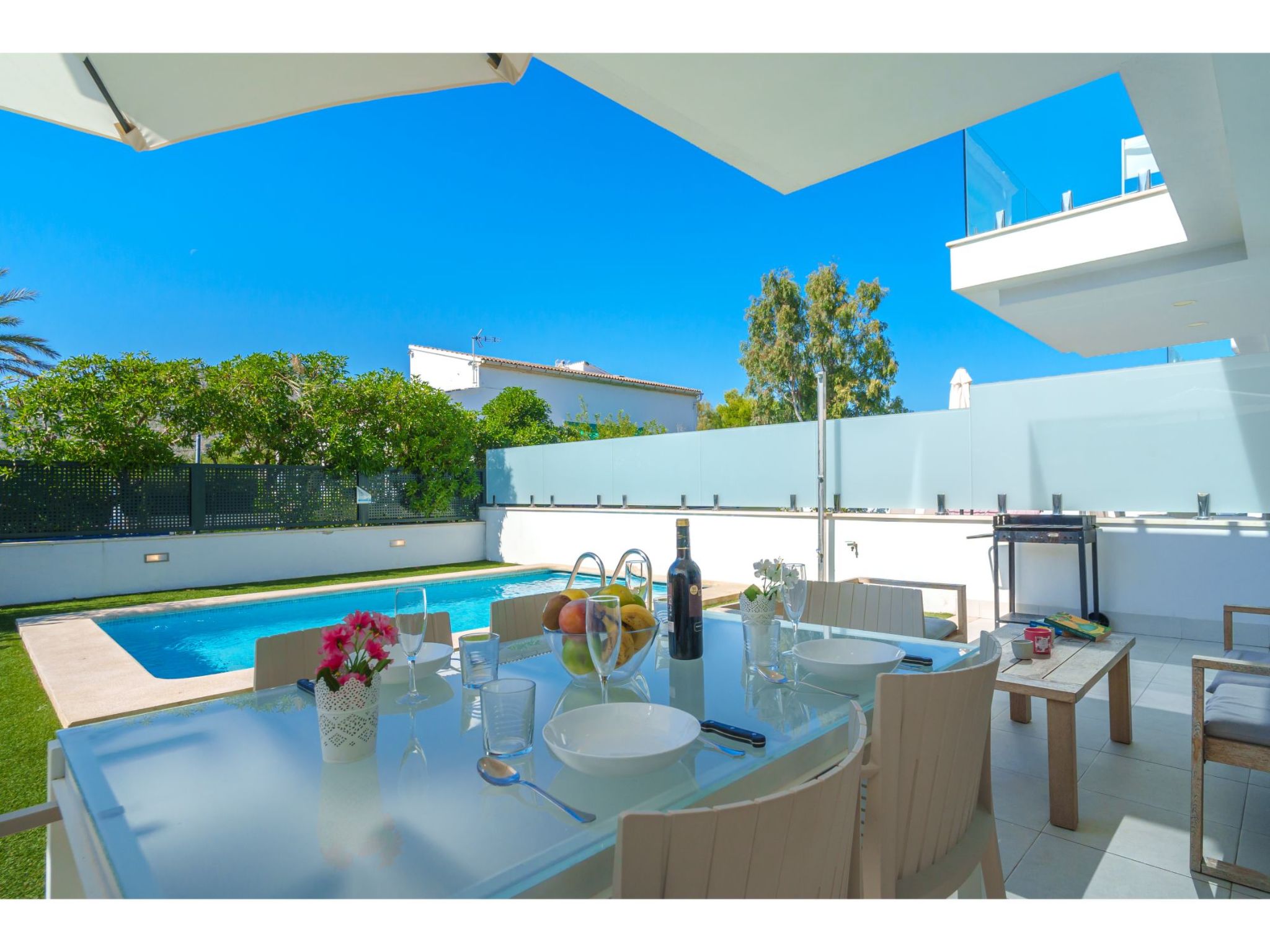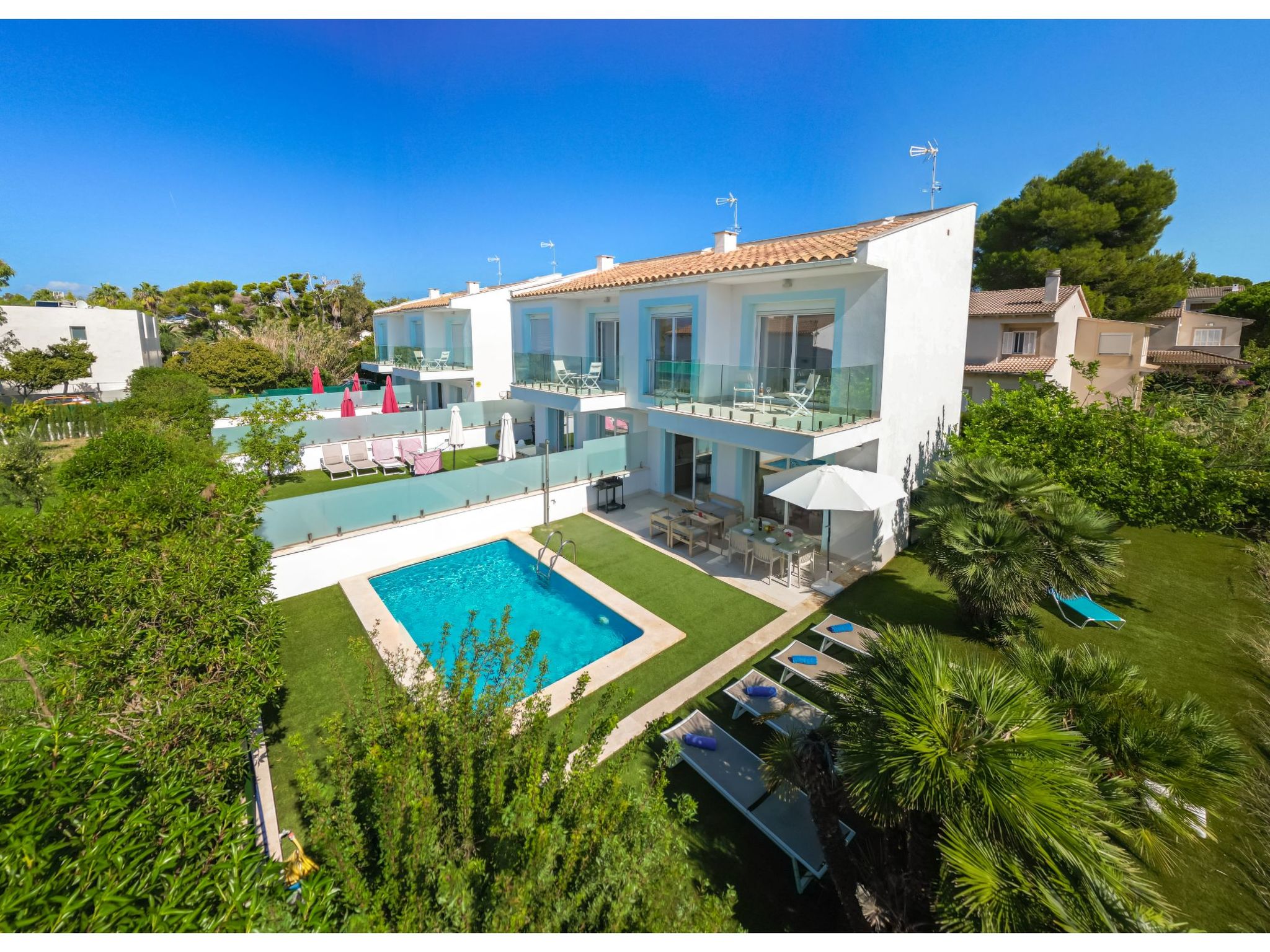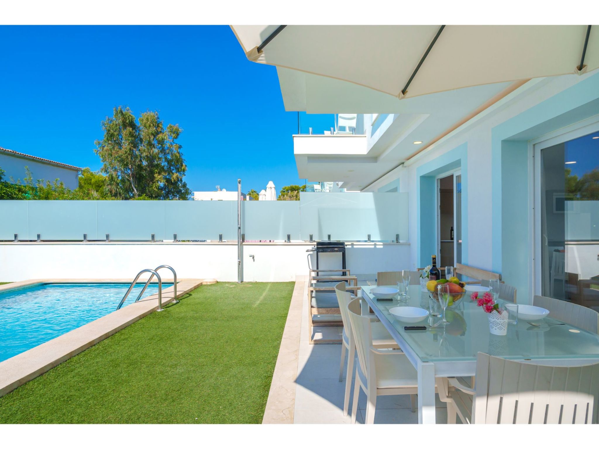Port d'alcúdia: Das Haus kann vorübergehend gemietet werden, gesetzlich geregelt 29/ 24. November 1994, städtische Mieten. In diesem Haus werden keine touristischen Dienstleistungen angeboten. Sehr modernes, schönes Doppelhaus "Villa del Lago 4", auf 2 Stockwerken, einseitig angebaut, Baujahr 2017. 4 Häuser im Ferienresort. Im Ort, ruhige, sonnige Lage, 900 m vom Waldrand, 100 m vom Meer, 3 m vom See, 120 m vom Strand, 1 m direkt am Kanal, direkter Zugang zur Lagune. Zur Alleinbenutzung: schöner Garten mit Rasen und Pflanzen, Schwimmbad eckig (6 x 4 m, 01.01.-31.12.). Aussendusche, Sitzplatz, Gartenmöbel. Im Hause: Wireless LAN, Zentralheizung, Klimaanlage, Waschmaschine, Wäschetrockner. Einkaufsgeschäft, Lebensmittelgeschäft, Supermarkt, Restaurant, Bar 300 m, Zentrum zu Fuss in 15 Minuten erreichbar, Bushaltestelle 200 m, Sandstrand 120 m, Felsstrand 3 km, Badesee 3 m. Sporthafen 4.5 km, Jacht-Hafen 4.5 km, Golfplatz (18 Loch) 7 km, Tennis 1 km, Reitstall 2 km. Bitte beachten: geeignet für Familien, geeignet für Senioren. Objekt geeignet für 6 Erwachsene Jugendgruppen nur auf Anfrage. Flugplatz 50 km vom Haus. In dieser Anlage zusätzlich mietbar: 4 Häuser.
