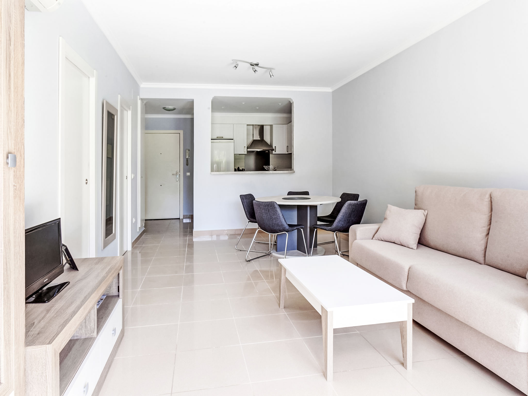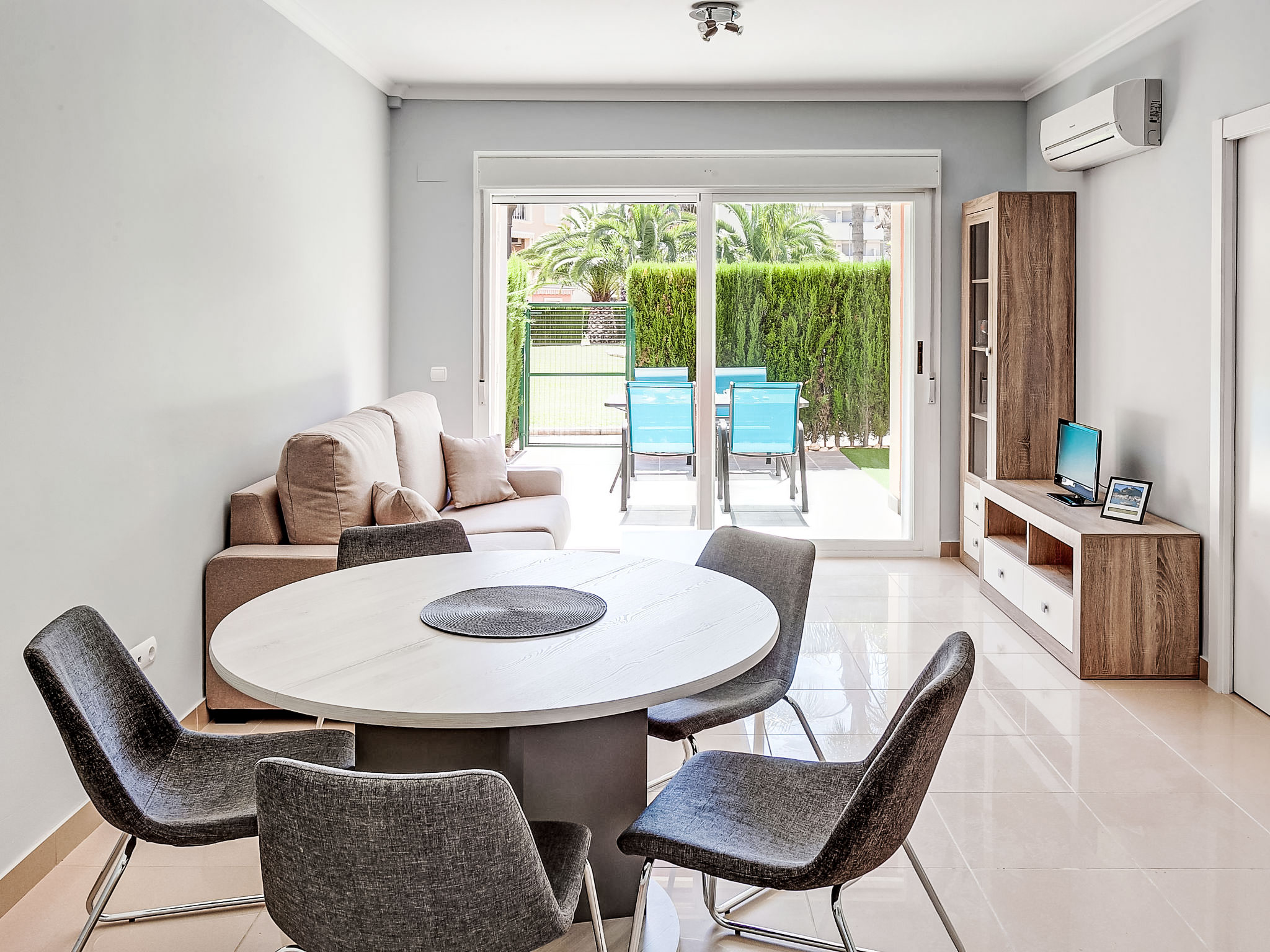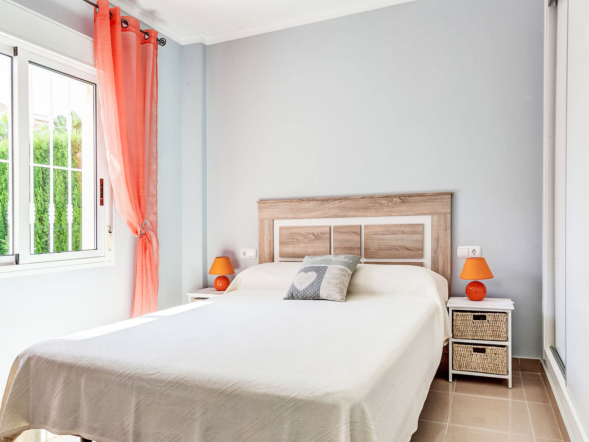 "Rincón del Mediterráneo", 3-Zimmer-Wohnung 47 m2, im Erdgeschoss. Komfortabel und gemütlich eingerichtet: Wohn-/Esszimmer mit Digital-TV, Flachbildschirm, Klimaanlage und Warmluftheizung. Ausgang zur Terrasse, zum Schwimmbad. 1 Zimmer mit 1 franz. Bett (150 cm, Länge 190 cm), Klimaanlage und Warmluftheizung. 1 Zimmer mit 1 x 2 Etagenbetten (90 cm, Länge 200 cm), 1 Ausziehbett (1 Pers. 2 x 90 cm, Länge 200 cm). Offene Küche (Backofen, 4 Glaskeramikherd Platten, Mikrowelle, Tiefkühler, elektrische Kaffeemaschine) mit Klimaanlage und Warmluftheizung. Dusche/WC. Terrasse 15 m2. Terrassenmöbel. Sicht auf das Schwimmbad und den Garten. Zur Verfügung: Waschmaschine. Internet (Wireless LAN, gratis). Parkplatz Nr. 19 (überdacht). Bitte beachten: Nichtraucher-Haus. AT-458533-A