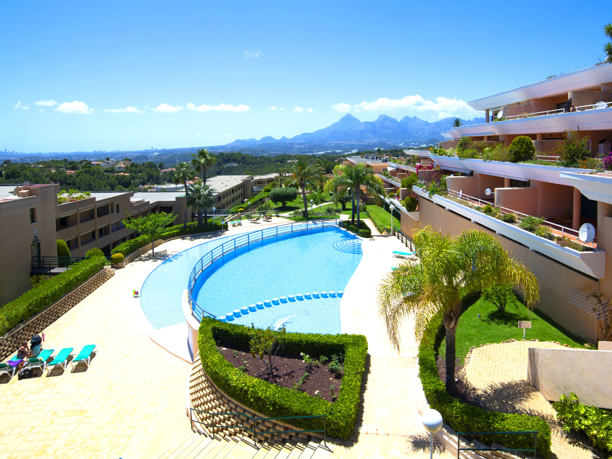 Sierra de Altea: Schönes Appartementhaus "Altea La Nova". 2.2 km vom Zentrum von Altea la Vieja, 6 km vom Zentrum von Altea, sonnige, erhöhte Lage, verkehrsberuhigte Zone, 3.5 km vom Meer, 3.5 km vom Strand. Zur Mitbenutzung: Grundstück (eingezäunt), Garten mit Rasen, Schwimmbad (saisonale Verfügbarkeit: 01.Mai.-30.Sep.) mit Innentreppe. Kinderbecken, Aussendusche, Terrasse. Im Hause: Empfang, Fahrstuhl. Einkaufsgeschäft 2.2 km, Lebensmittelgeschäft 2.2 km, Supermarkt 2.2 km, Restaurant 3 km, Bar 2.2 km, Bäckerei 2.2 km, Café 2.2 km, Internet-Café 2.2 km, Fußgängerzone 2.2 km, Fahrradverleih 2.2 km, Biergarten 2.2 km, Zentrum zu Fuss in 33 Minuten erreichbar, Sandstrand "Playa Puerto Blanco -Calpe-" 12 km, Badebucht 5 km. Sporthafen 7 km, Jacht-Hafen 7 km, Golfplatz (9 Loch) 1 km, Surfschule 7 km, Segelschule 7 km. Nahe gelegene Sehenswürdigkeiten: Aqualandia 20 km, Mundomar 20 km, Terra Mitica 25 km, Terra Natura 25 km, Fuentes del Algar 22 km, Guadalest 25 km. Wandergebiete: Peñon de Ifach 15 km. Der Besitzer akzeptiert keine Jugendgruppen.