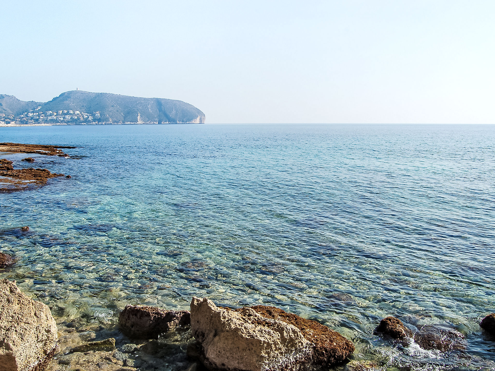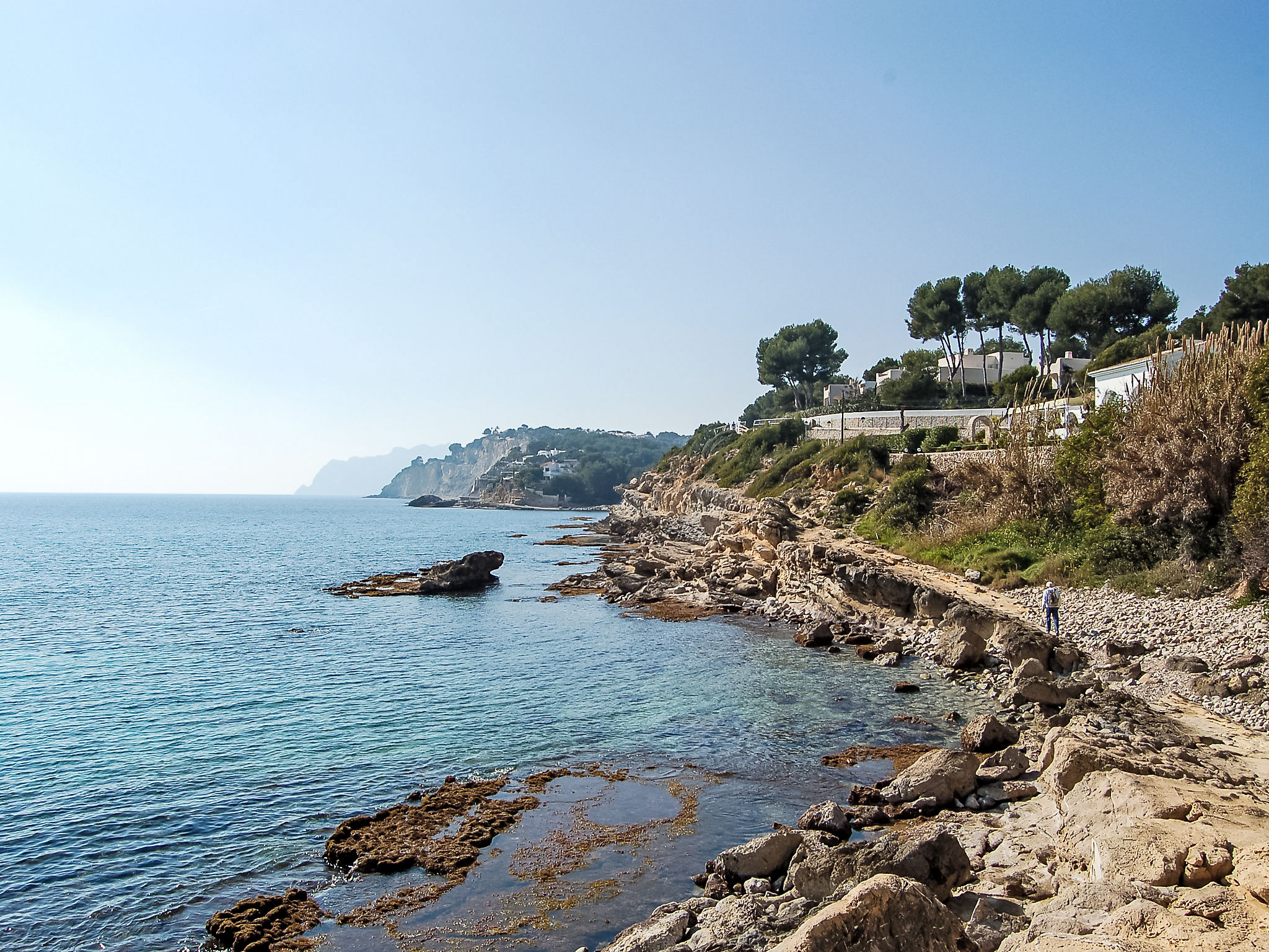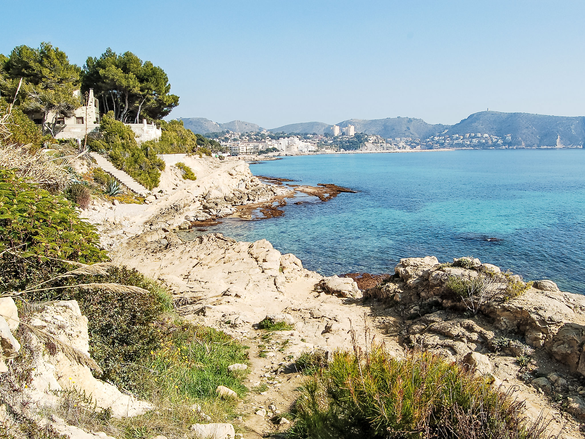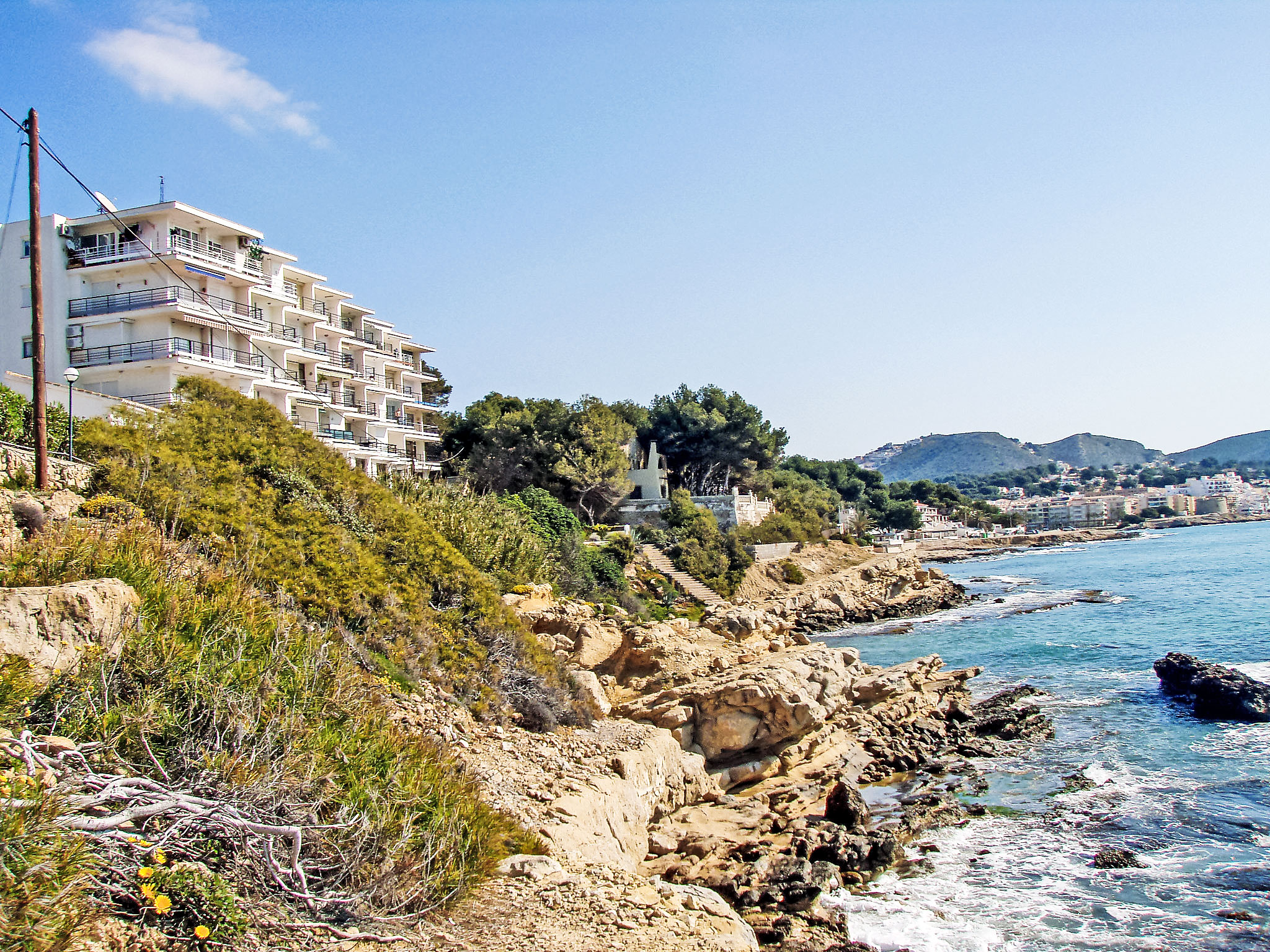 Cometa: Appartementhaus "Brisa al Mar". 1 km vom Zentrum von Moraira, 20 m vom Meer. Parkplatz auf dem Grundstück. Supermarkt 1.9 km, Restaurant 50 m, Sandstrand 500 m, Steinstrand 20 m. Golfplatz 3.4 km. Bitte beachten: geeignet für Familien, geeignet für Senioren.