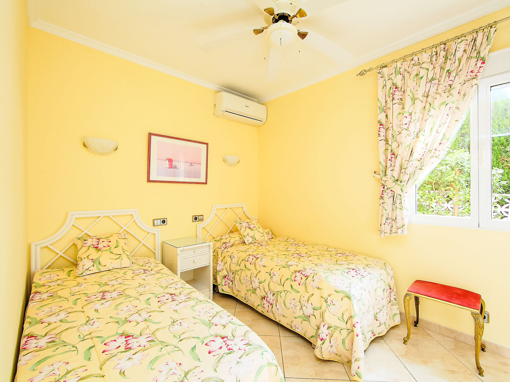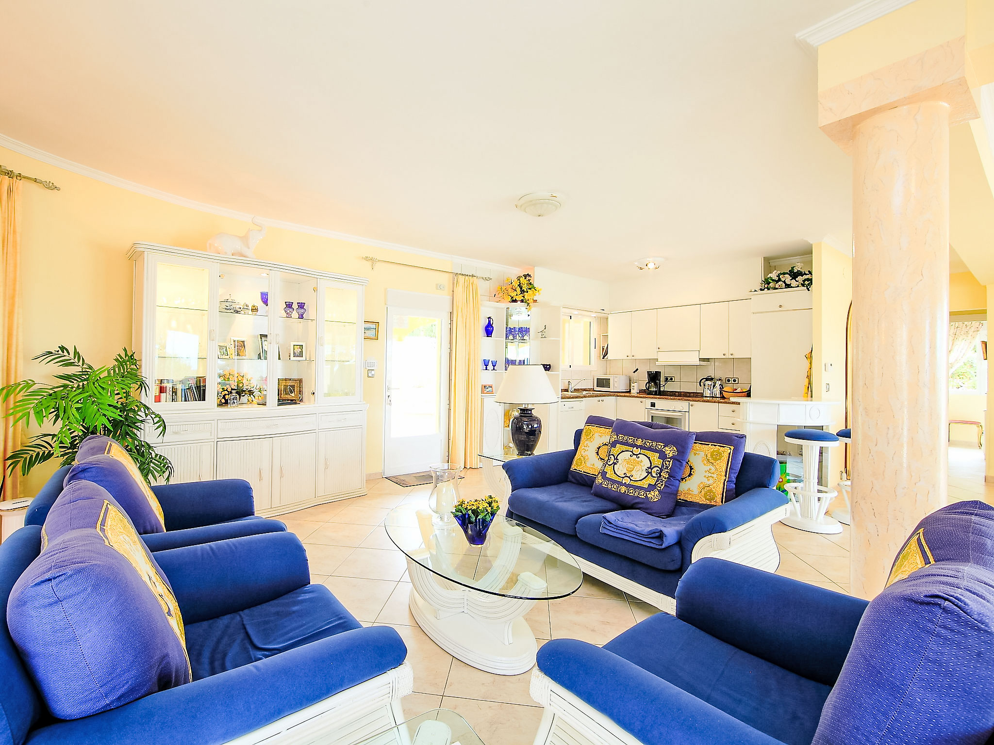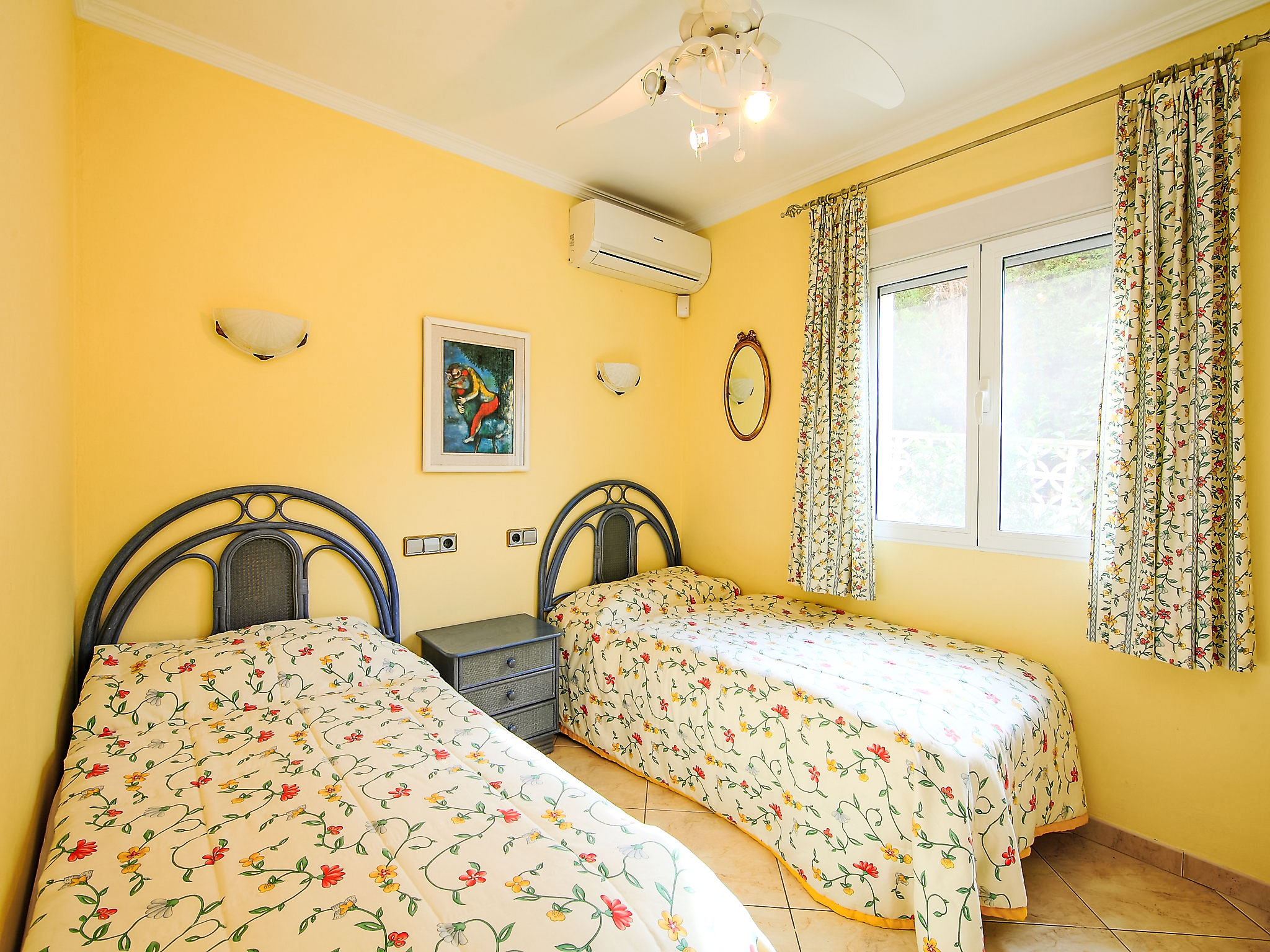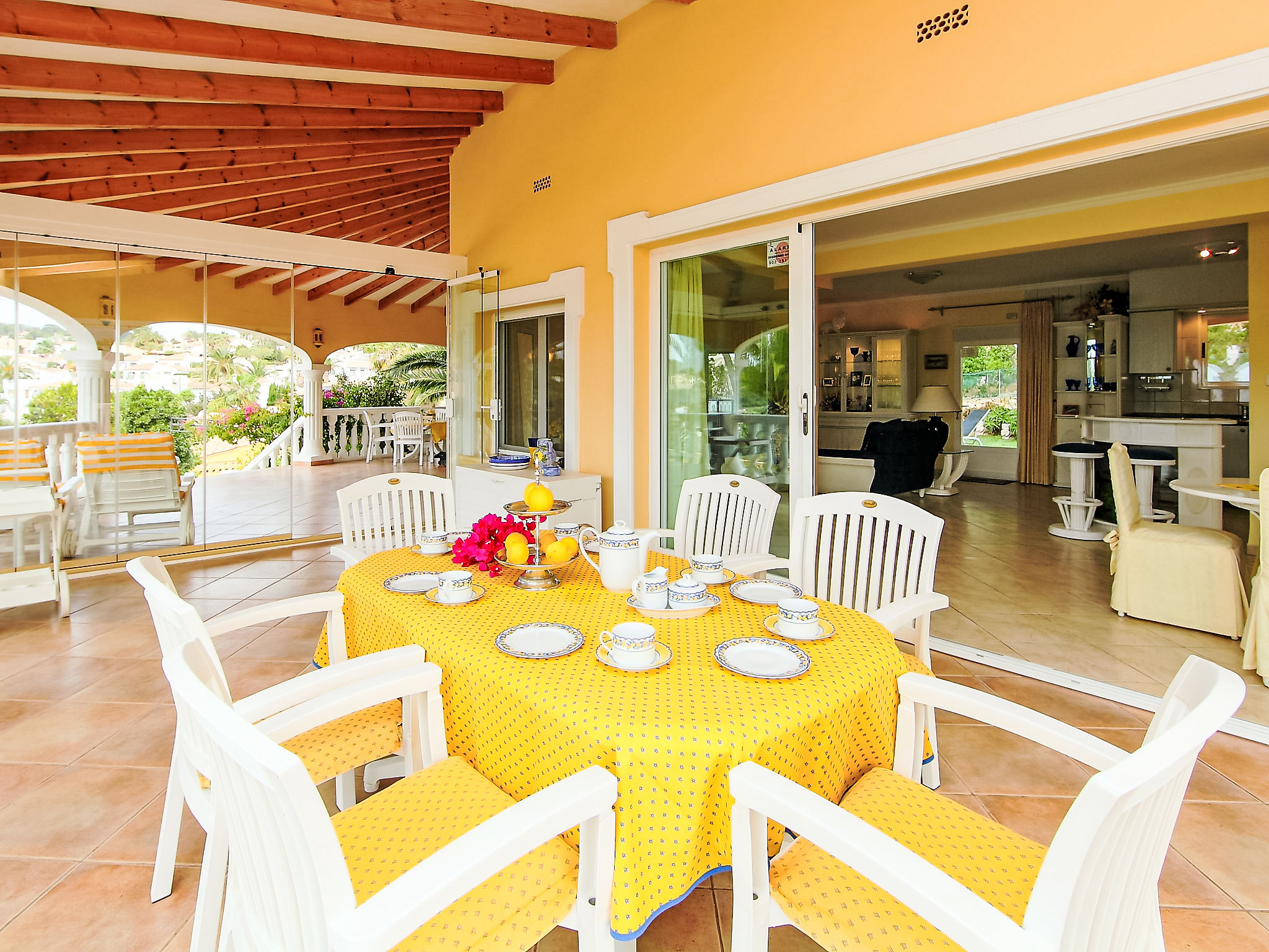 "Bombilla", 4-Zimmer-Villa 140 m2. Geräumig und hell, sehr schön eingerichtet: grosses Wohn-/Esszimmer mit Wintergarten mit Sat-TV und Klimaanlage. Ausgang zur Terrasse. 1 Doppelzimmer mit 1 franz. Bett (2 x 90 cm, Länge 200 cm), Dusche/WC und Klimaanlage. 1 Zimmer mit 2 Betten (90 cm, Länge 200 cm), Klimaanlage. 1 Zimmer mit 2 Betten (90 cm, Länge 200 cm), Klimaanlage. Grosse, offene Küche (Backofen, Geschirrspüler, 3 Glaskeramikherd Platten, Mikrowelle, Tiefkühler, elektrische Kaffeemaschine). Bad/WC. Grosse Terrasse überdacht, Gartensitzplatz. Terrassenmöbel, Gartengrill, Liegestühle (6), Wintergarten. Eingeschränkte Fernsicht auf das Meer. Zur Verfügung: Waschmaschine, Wäschetrockner, Bügeleisen. Internet (Wireless LAN, gratis). Parkplatz (eingezäunt), Garage. Geeignet für Familien. AT-440989-A