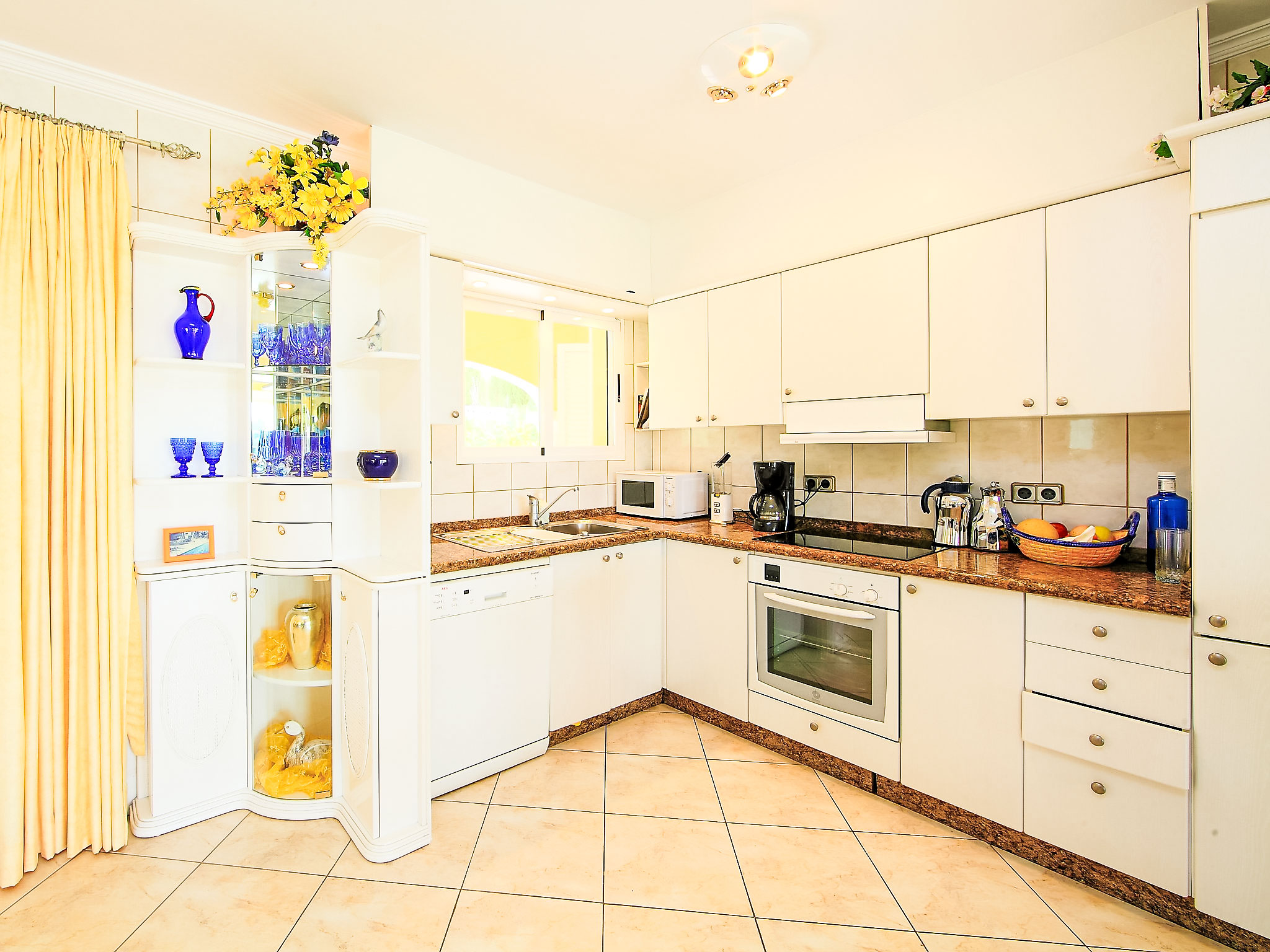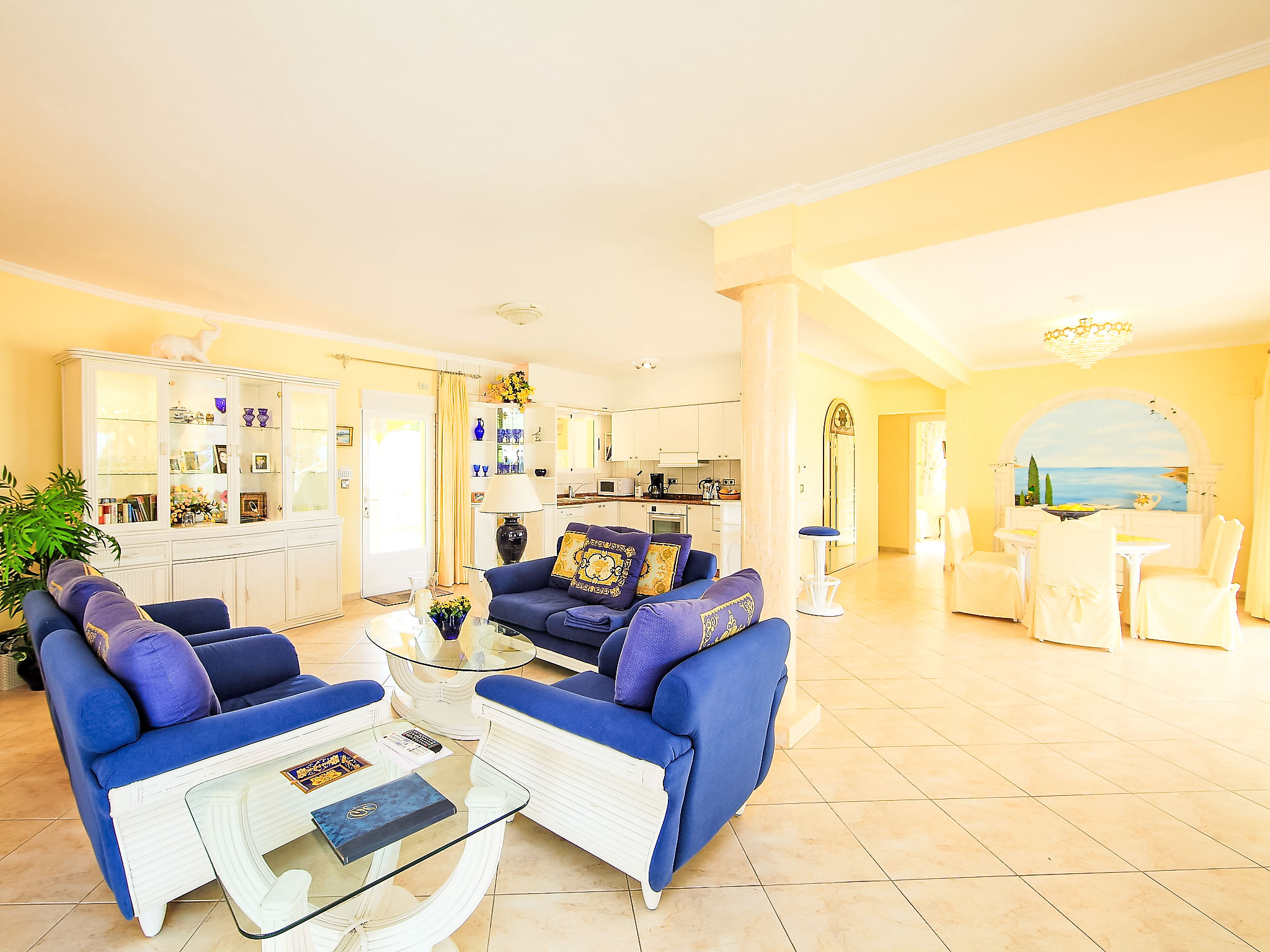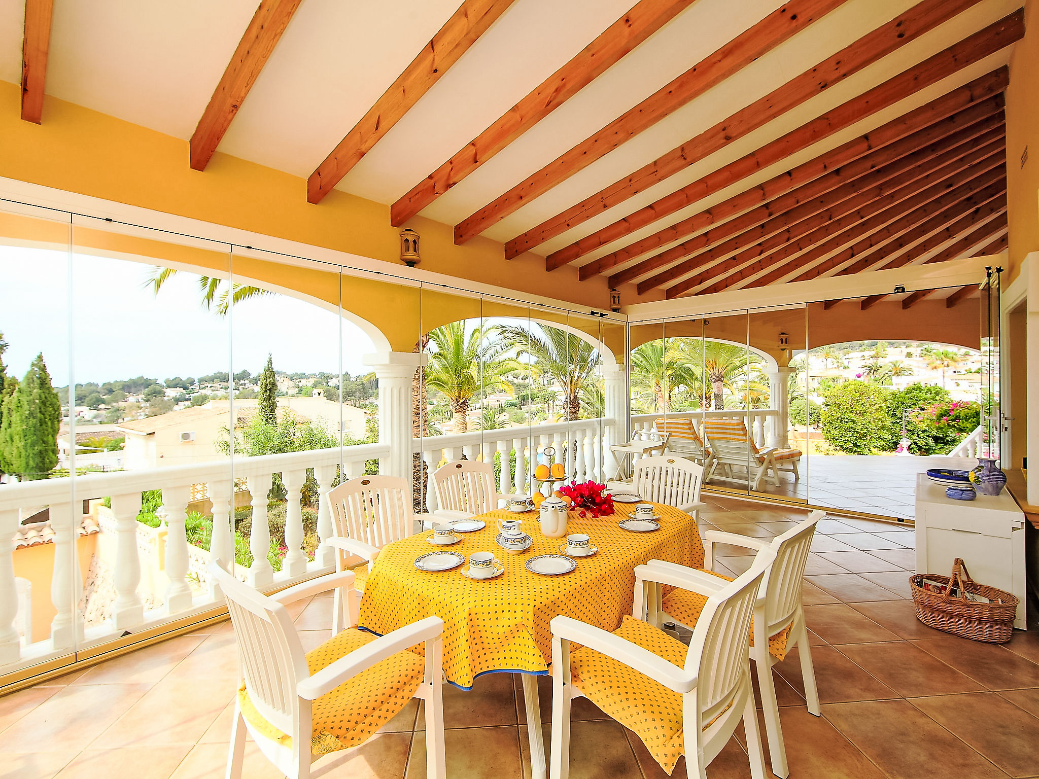 "Bombilla", 4-Zimmer-Villa 140 m2. Geräumig und hell, sehr schön eingerichtet: grosses Wohn-/Esszimmer mit Wintergarten mit Sat-TV und Klimaanlage. Ausgang zur Terrasse. 1 Doppelzimmer mit 1 franz. Bett (2 x 90 cm, Länge 200 cm), Dusche/WC und Klimaanlage. 1 Zimmer mit 2 Betten (90 cm, Länge 200 cm), Klimaanlage. 1 Zimmer mit 2 Betten (90 cm, Länge 200 cm), Klimaanlage. Grosse, offene Küche (Backofen, Geschirrspüler, 3 Glaskeramikherd Platten, Mikrowelle, Tiefkühler, elektrische Kaffeemaschine). Bad/WC. Grosse Terrasse überdacht, Gartensitzplatz. Terrassenmöbel, Gartengrill, Liegestühle (6), Wintergarten. Eingeschränkte Fernsicht auf das Meer. Zur Verfügung: Waschmaschine, Wäschetrockner, Bügeleisen. Internet (Wireless LAN, gratis). Parkplatz (eingezäunt), Garage. Geeignet für Familien. AT-440989-A