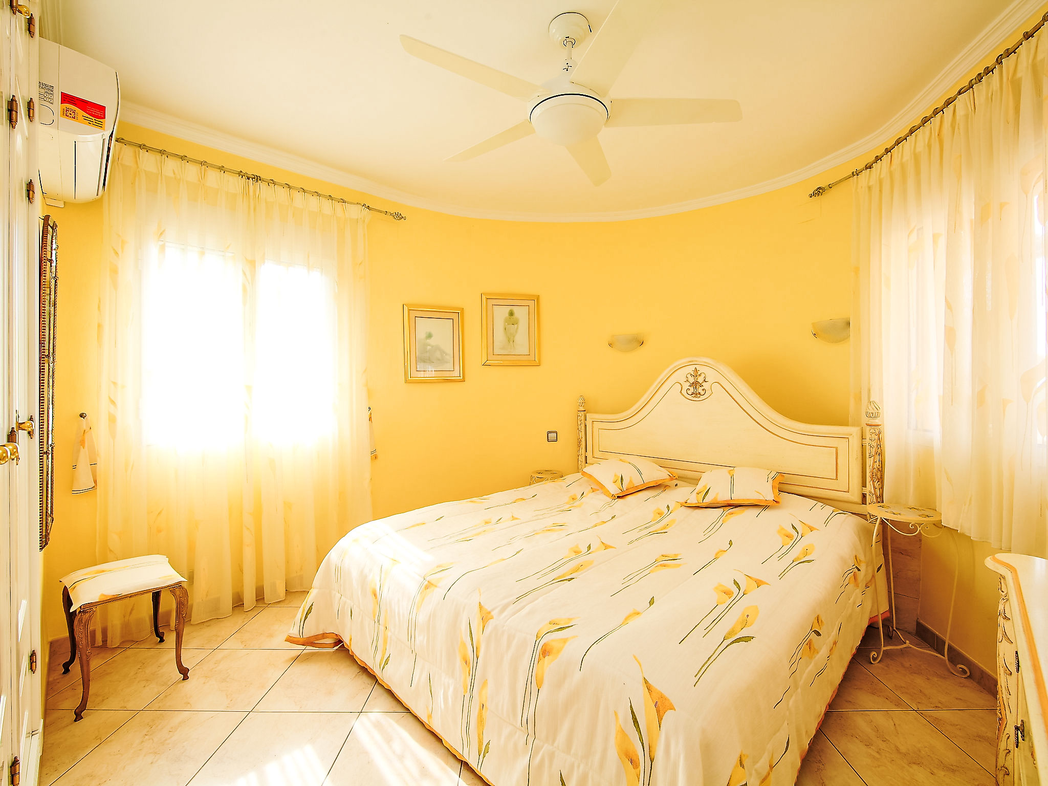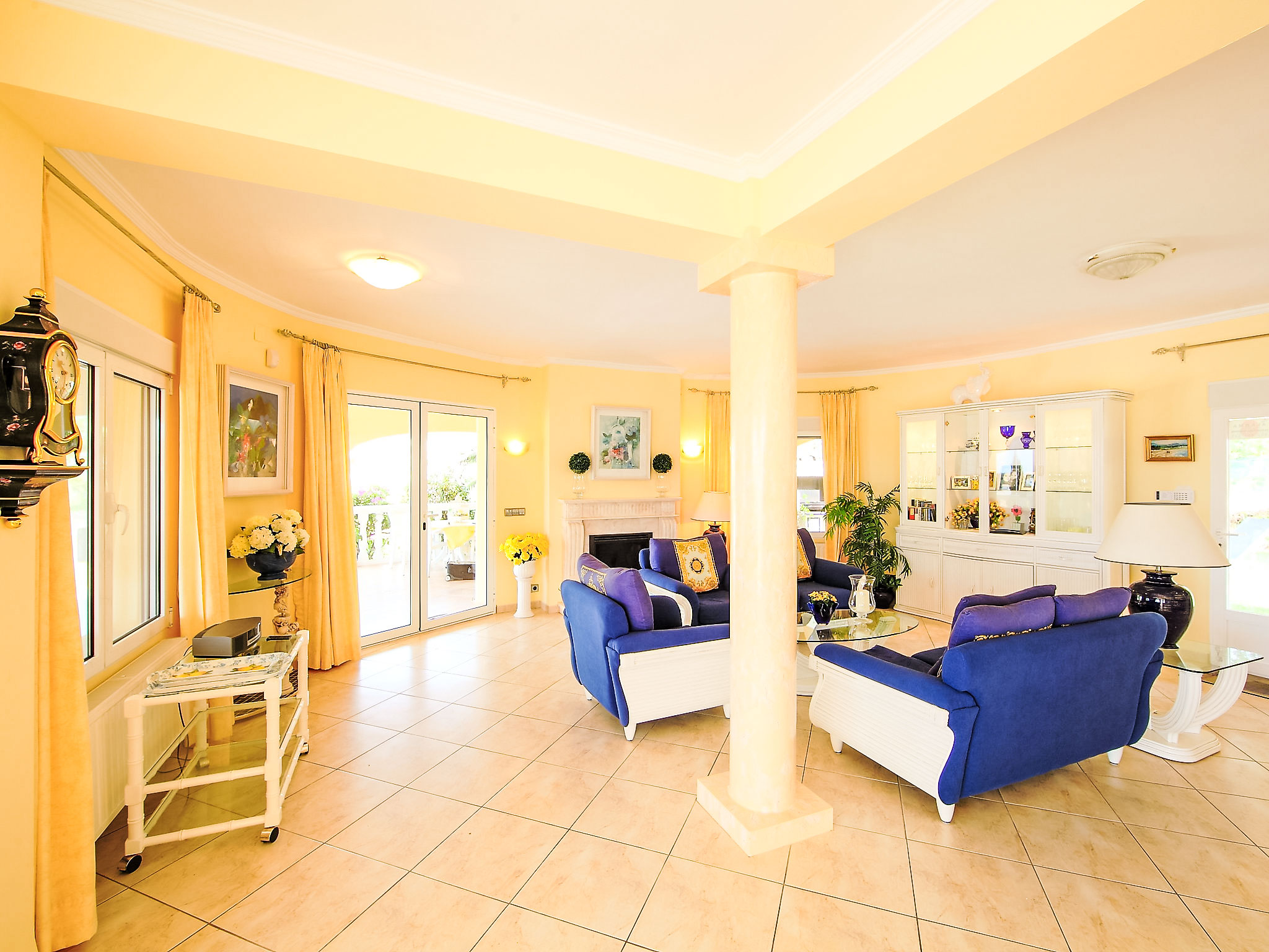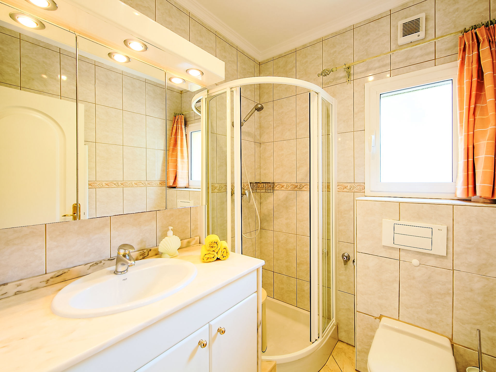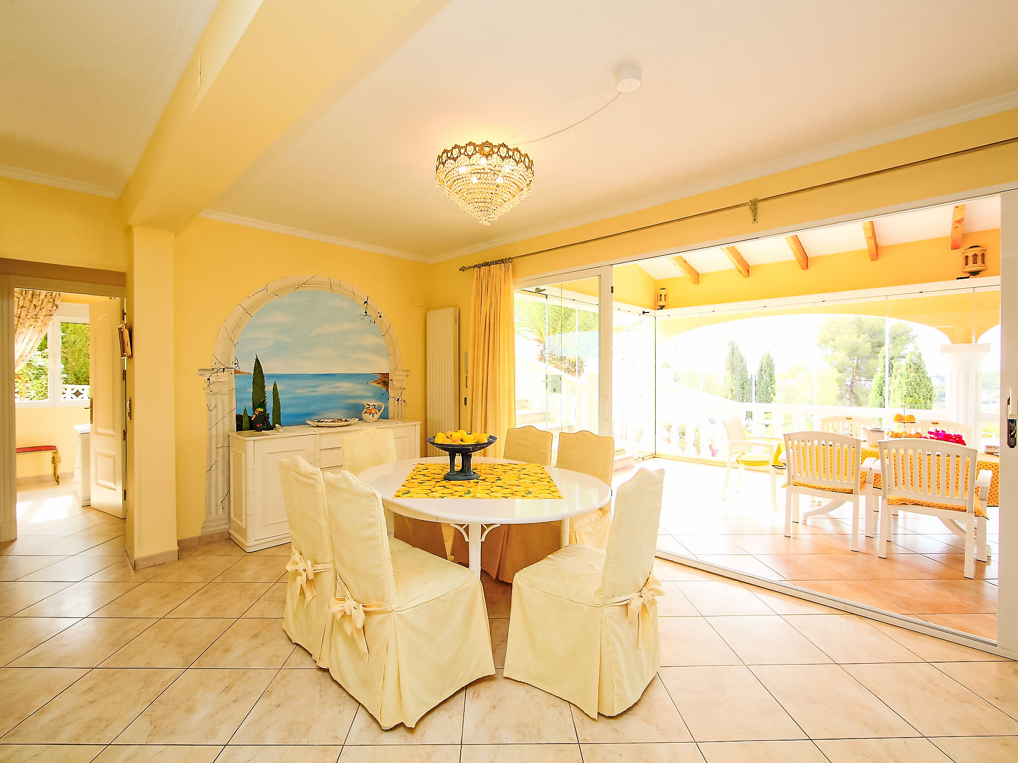 "Bombilla", 4-Zimmer-Villa 140 m2. Geräumig und hell, sehr schön eingerichtet: grosses Wohn-/Esszimmer mit Wintergarten mit Sat-TV und Klimaanlage. Ausgang zur Terrasse. 1 Doppelzimmer mit 1 franz. Bett (2 x 90 cm, Länge 200 cm), Dusche/WC und Klimaanlage. 1 Zimmer mit 2 Betten (90 cm, Länge 200 cm), Klimaanlage. 1 Zimmer mit 2 Betten (90 cm, Länge 200 cm), Klimaanlage. Grosse, offene Küche (Backofen, Geschirrspüler, 3 Glaskeramikherd Platten, Mikrowelle, Tiefkühler, elektrische Kaffeemaschine). Bad/WC. Grosse Terrasse überdacht, Gartensitzplatz. Terrassenmöbel, Gartengrill, Liegestühle (6), Wintergarten. Eingeschränkte Fernsicht auf das Meer. Zur Verfügung: Waschmaschine, Wäschetrockner, Bügeleisen. Internet (Wireless LAN, gratis). Parkplatz (eingezäunt), Garage. Geeignet für Familien. AT-440989-A