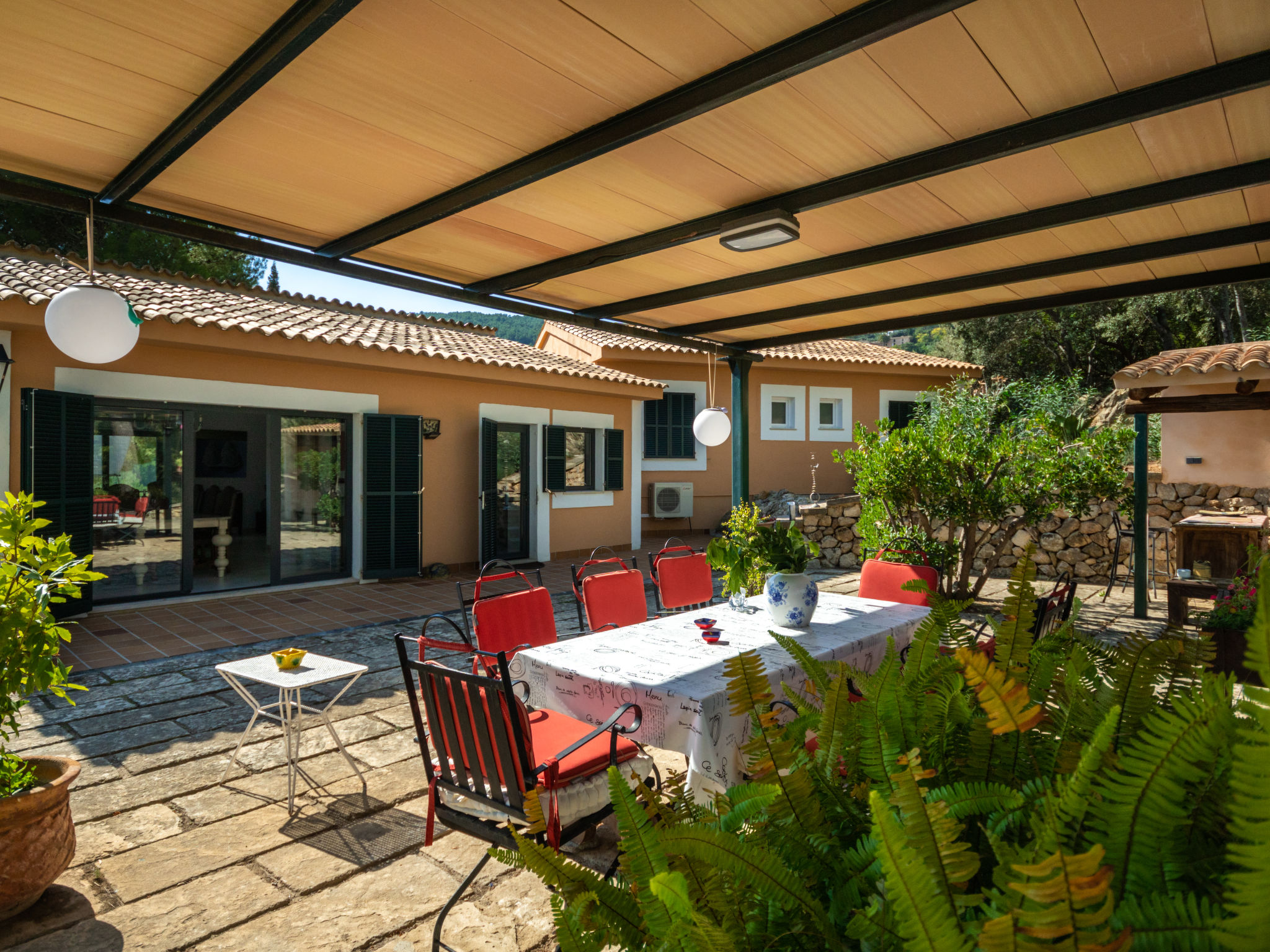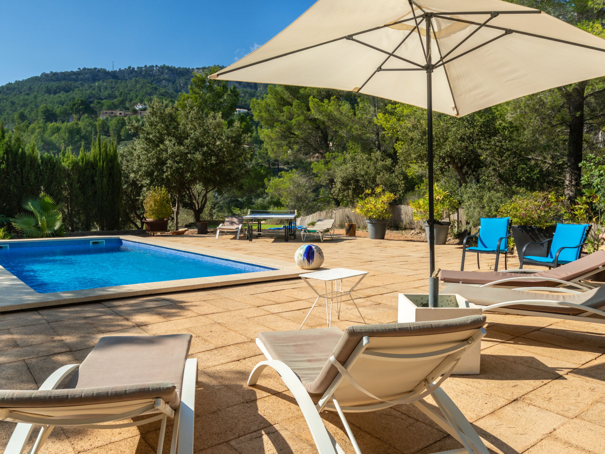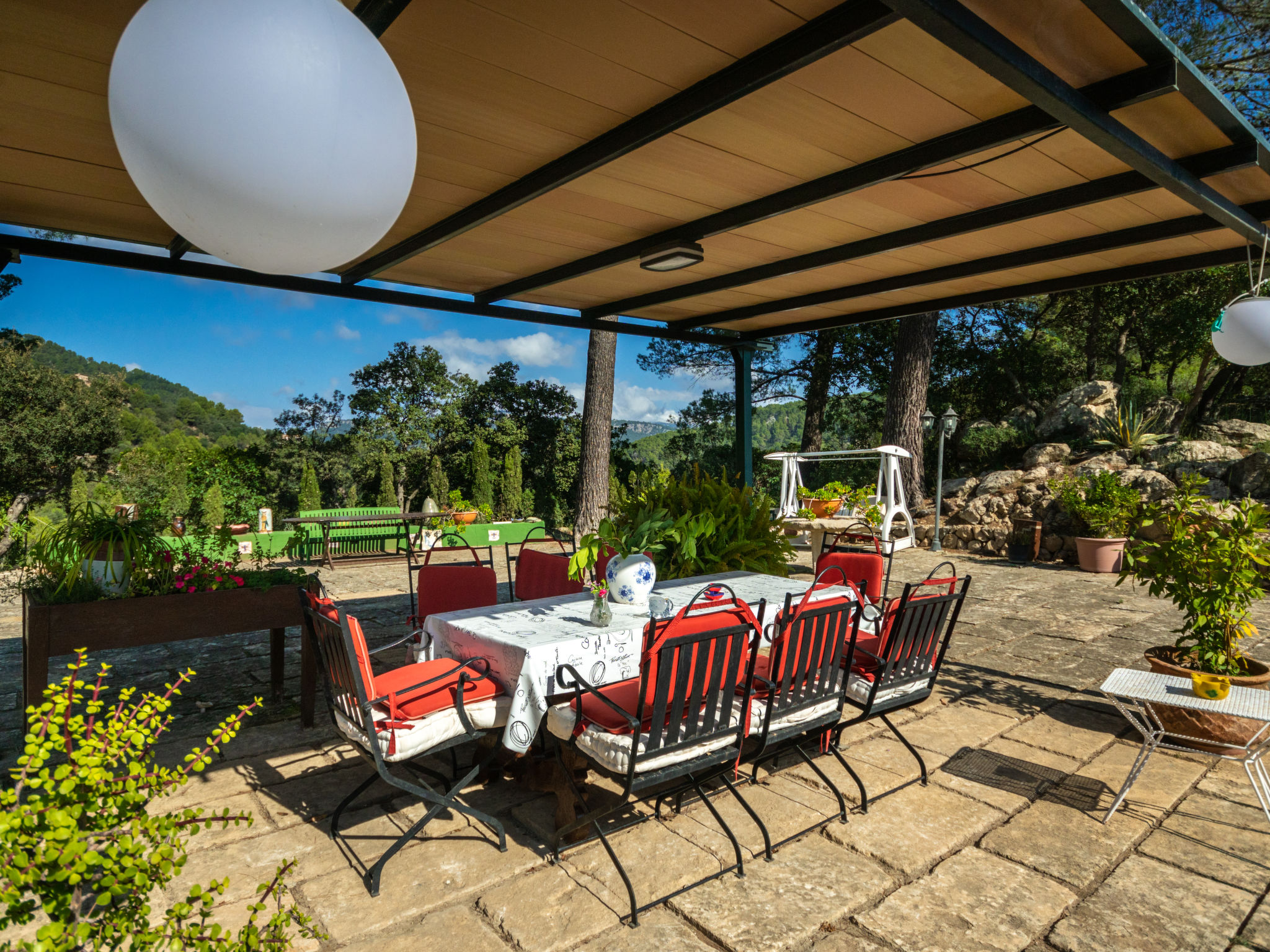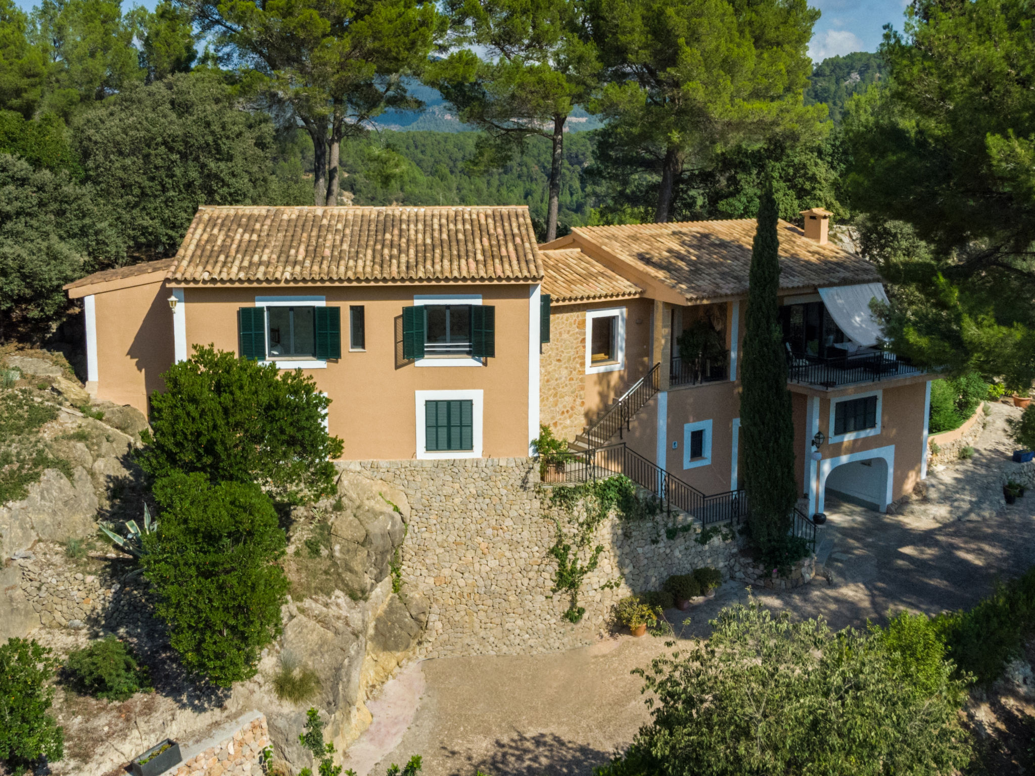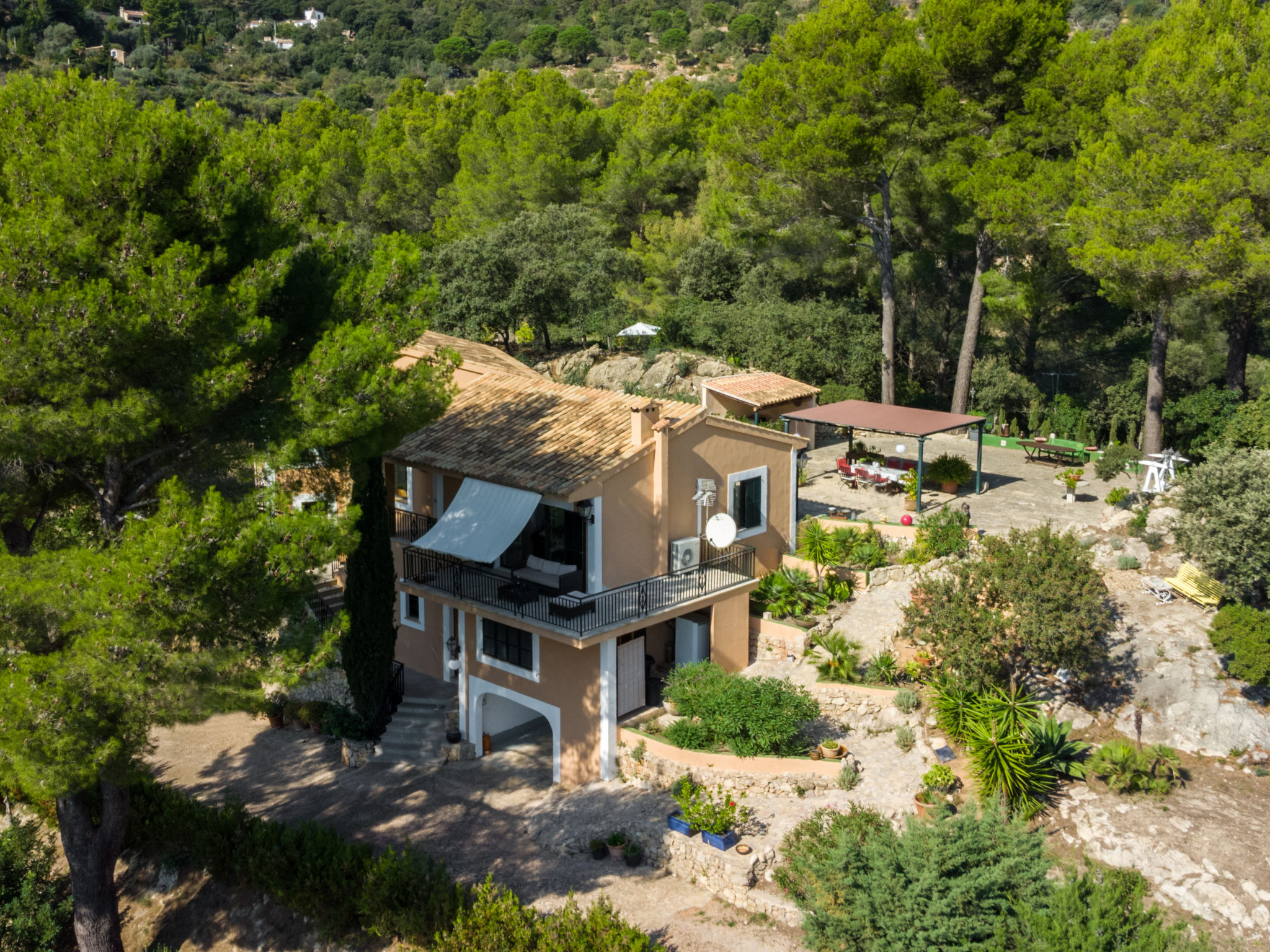 Das schön gelegene Haus steht auf einem Hanggrundstück, oberhalb von Esporles (4,5 km) in einer Naturoase mit ausgedehnten Pinienwäldern und schroff aufragenden Felsen. Wanderfreunde finden in der näheren Umgebung schöne Wanderwege. Ca. 15.000 m² großes, offenes Anwesen. Von der großzügigen Terrasse (ca. 130 m²) mit mehreren Sitzplätzen schöner Panoramablick. Hinter dem Haus liegt der Pool (10 x 4 m, gesamte Saison geöffnet, Salzelektrolyse) mit Sonnenterrasse, Sonnenschirm, Sonnenliegen, Außendusche und überdachtem Sitzplatz mit Sofa. Gasgrill. Am Haus teilüberdachter Balkon mit Mobiliar. Von hier aus gute Sicht bis hin zur Bucht von Palma. Im Untergeschoss des Hauses Tischtennisplatte. Parkmöglichkeit auf dem Grundstück. Verkauf von Wein und Öl auf dem ca. 50 m entfernten Weingut 'Es Verger', das vom Bruder der Besitzerin geführt wird. Geschmackvolle, gute Einrichtung und Dekoration mit Kunstgegenständen (eigene Werke der Hausbesitzerin). Fliesenböden. Sat-TV (deutsche Programme), DVD, Radio/CD. Internetzugang (WLAN, inklusive). Waschmaschine, Bügeleisen/-brett, 2x Fön. Safe. Klimaanlage, Öl-Zentralheizung. Hinweis: Rauchen ist im Haus nicht gestattet.