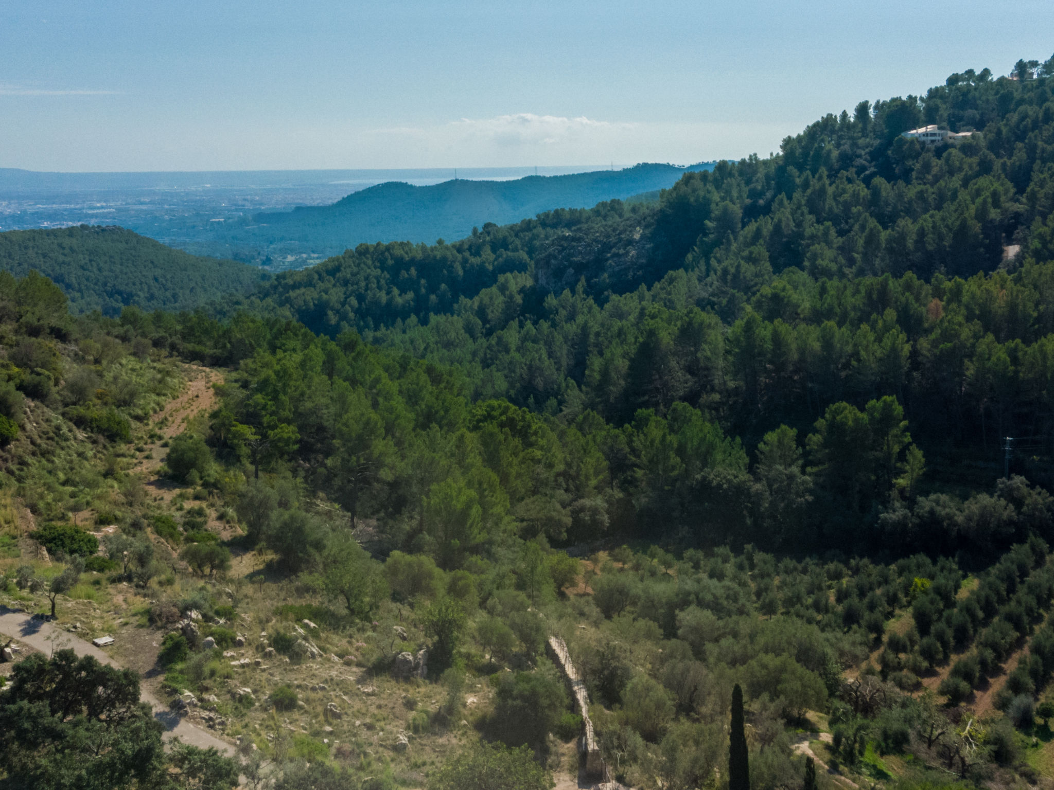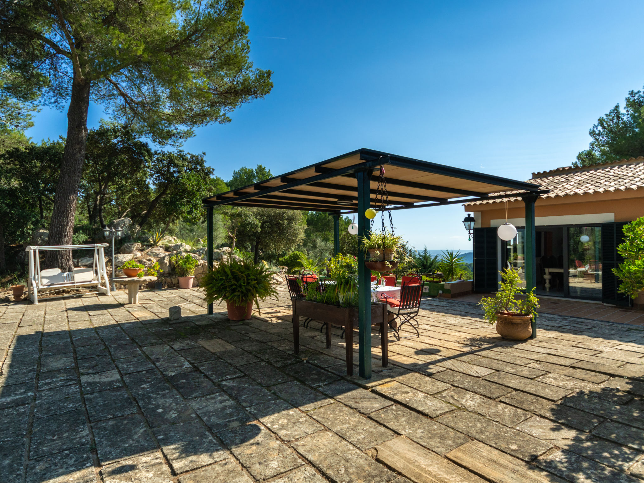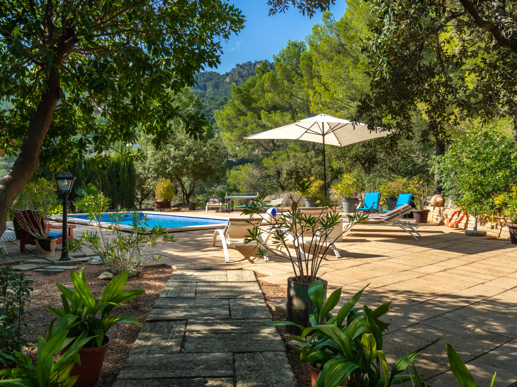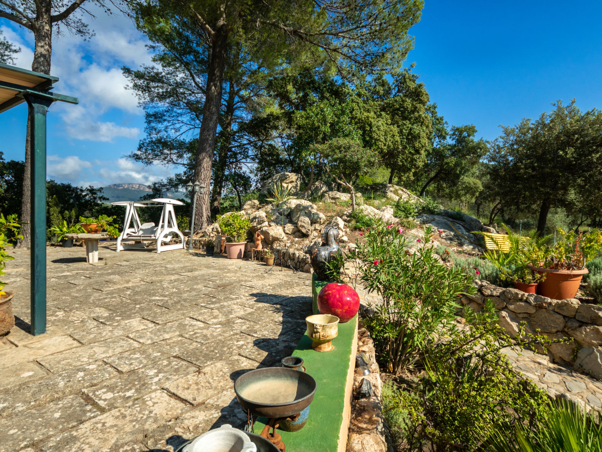 Das schön gelegene Haus steht auf einem Hanggrundstück, oberhalb von Esporles (4,5 km) in einer Naturoase mit ausgedehnten Pinienwäldern und schroff aufragenden Felsen. Wanderfreunde finden in der näheren Umgebung schöne Wanderwege. Ca. 15.000 m² großes, offenes Anwesen. Von der großzügigen Terrasse (ca. 130 m²) mit mehreren Sitzplätzen schöner Panoramablick. Hinter dem Haus liegt der Pool (10 x 4 m, gesamte Saison geöffnet, Salzelektrolyse) mit Sonnenterrasse, Sonnenschirm, Sonnenliegen, Außendusche und überdachtem Sitzplatz mit Sofa. Gasgrill. Am Haus teilüberdachter Balkon mit Mobiliar. Von hier aus gute Sicht bis hin zur Bucht von Palma. Im Untergeschoss des Hauses Tischtennisplatte. Parkmöglichkeit auf dem Grundstück. Verkauf von Wein und Öl auf dem ca. 50 m entfernten Weingut 'Es Verger', das vom Bruder der Besitzerin geführt wird. Geschmackvolle, gute Einrichtung und Dekoration mit Kunstgegenständen (eigene Werke der Hausbesitzerin). Fliesenböden. Sat-TV (deutsche Programme), DVD, Radio/CD. Internetzugang (WLAN, inklusive). Waschmaschine, Bügeleisen/-brett, 2x Fön. Safe. Klimaanlage, Öl-Zentralheizung. Hinweis: Rauchen ist im Haus nicht gestattet.
