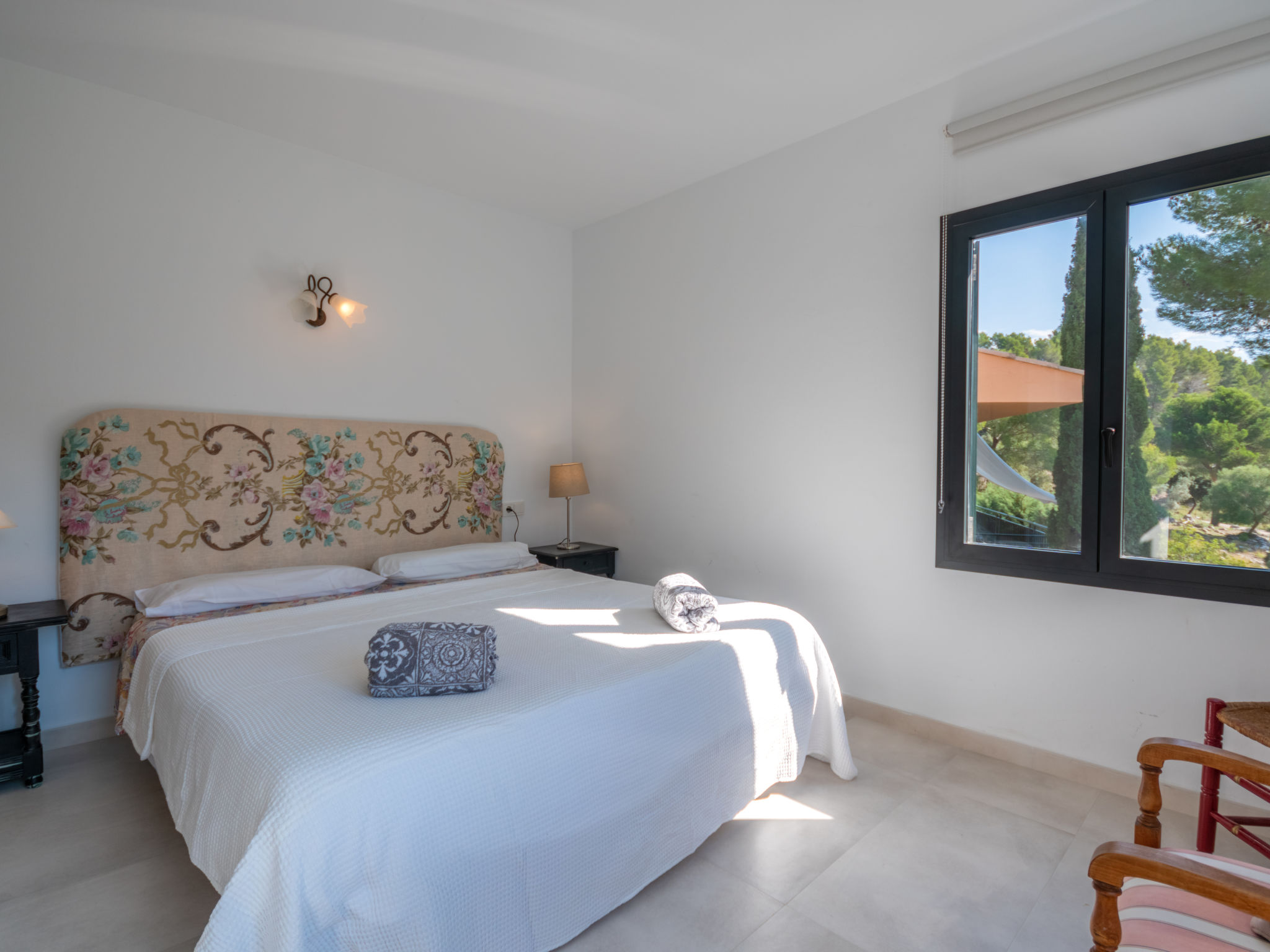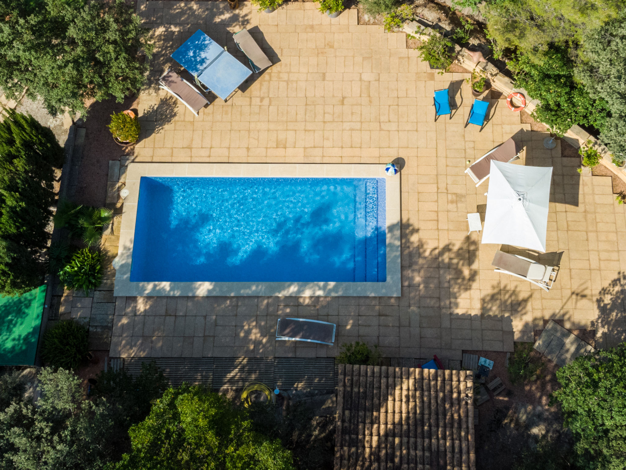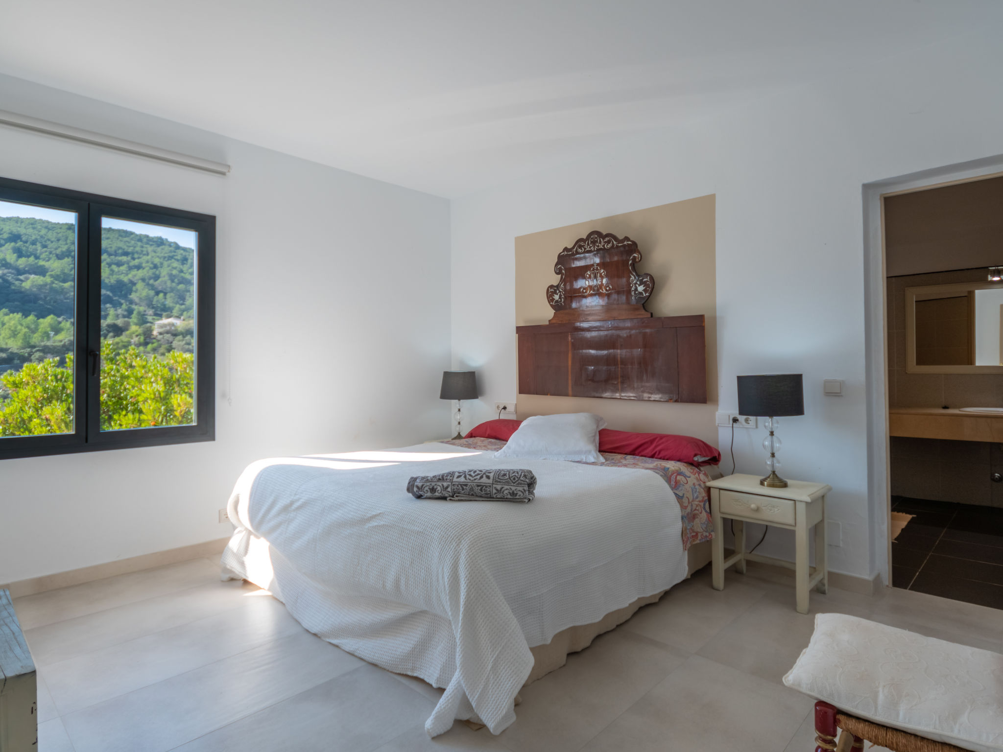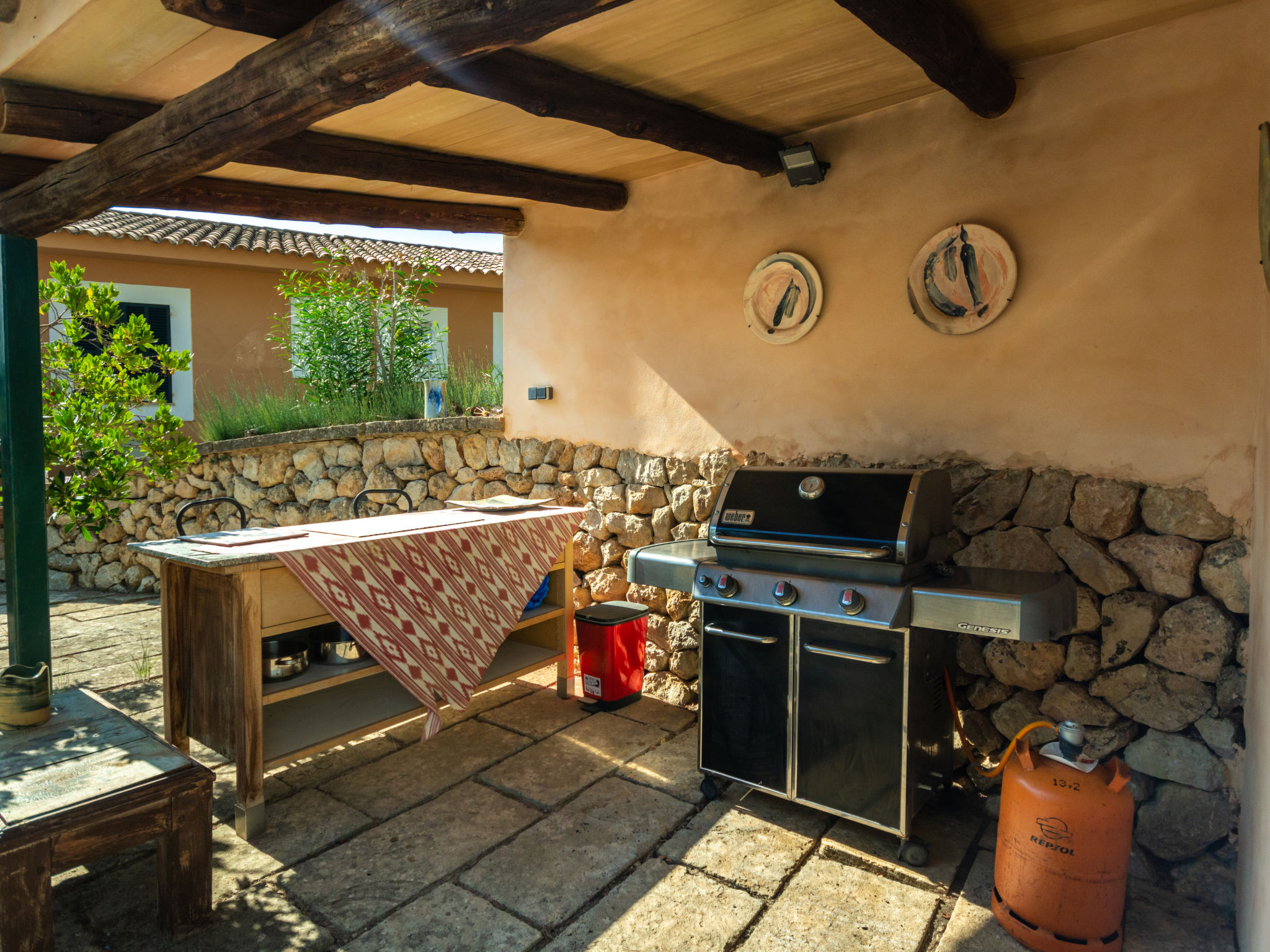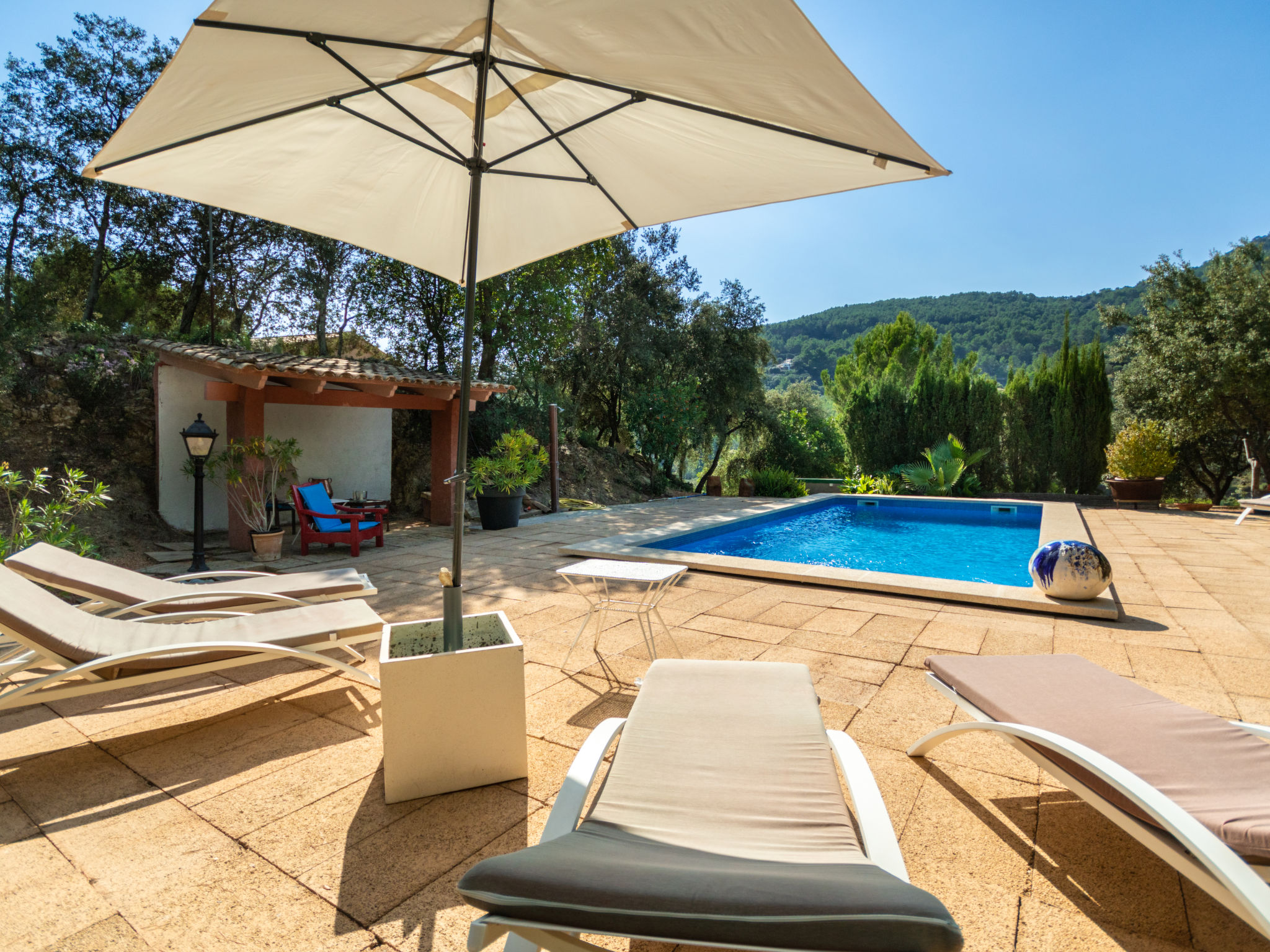 Das schön gelegene Haus steht auf einem Hanggrundstück, oberhalb von Esporles (4,5 km) in einer Naturoase mit ausgedehnten Pinienwäldern und schroff aufragenden Felsen. Wanderfreunde finden in der näheren Umgebung schöne Wanderwege. Ca. 15.000 m² großes, offenes Anwesen. Von der großzügigen Terrasse (ca. 130 m²) mit mehreren Sitzplätzen schöner Panoramablick. Hinter dem Haus liegt der Pool (10 x 4 m, gesamte Saison geöffnet, Salzelektrolyse) mit Sonnenterrasse, Sonnenschirm, Sonnenliegen, Außendusche und überdachtem Sitzplatz mit Sofa. Gasgrill. Am Haus teilüberdachter Balkon mit Mobiliar. Von hier aus gute Sicht bis hin zur Bucht von Palma. Im Untergeschoss des Hauses Tischtennisplatte. Parkmöglichkeit auf dem Grundstück. Verkauf von Wein und Öl auf dem ca. 50 m entfernten Weingut 'Es Verger', das vom Bruder der Besitzerin geführt wird. Geschmackvolle, gute Einrichtung und Dekoration mit Kunstgegenständen (eigene Werke der Hausbesitzerin). Fliesenböden. Sat-TV (deutsche Programme), DVD, Radio/CD. Internetzugang (WLAN, inklusive). Waschmaschine, Bügeleisen/-brett, 2x Fön. Safe. Klimaanlage, Öl-Zentralheizung. Hinweis: Rauchen ist im Haus nicht gestattet.