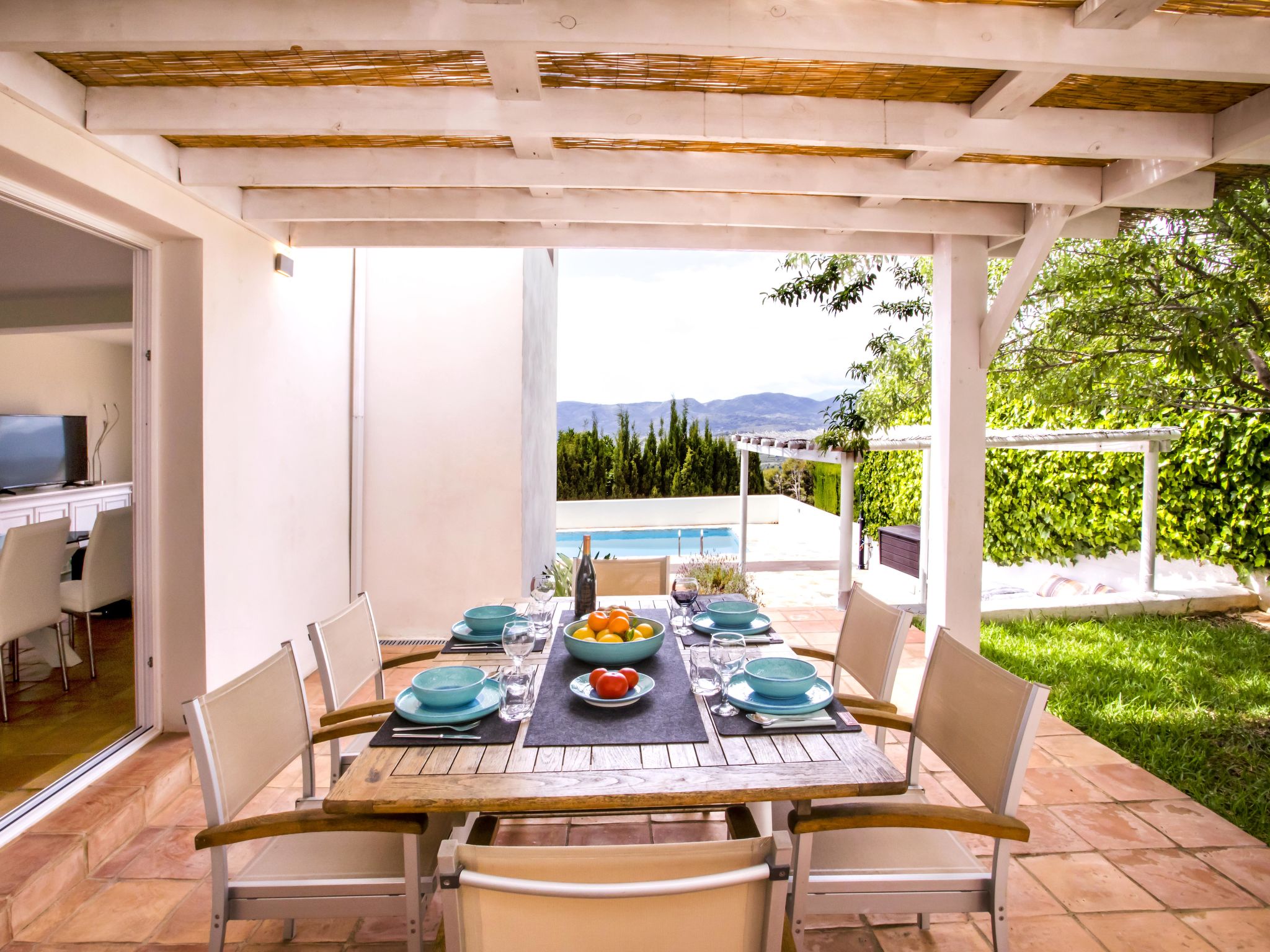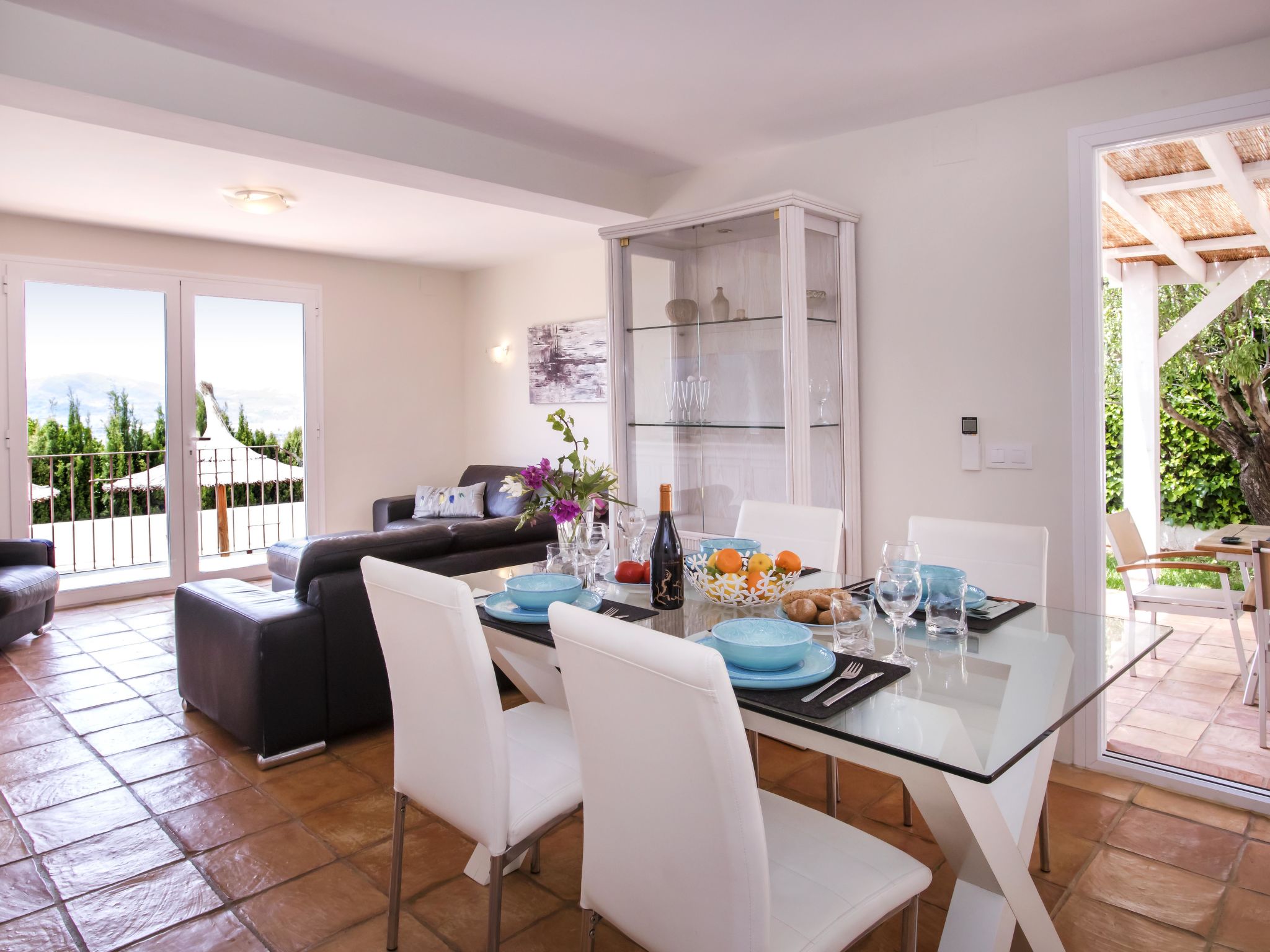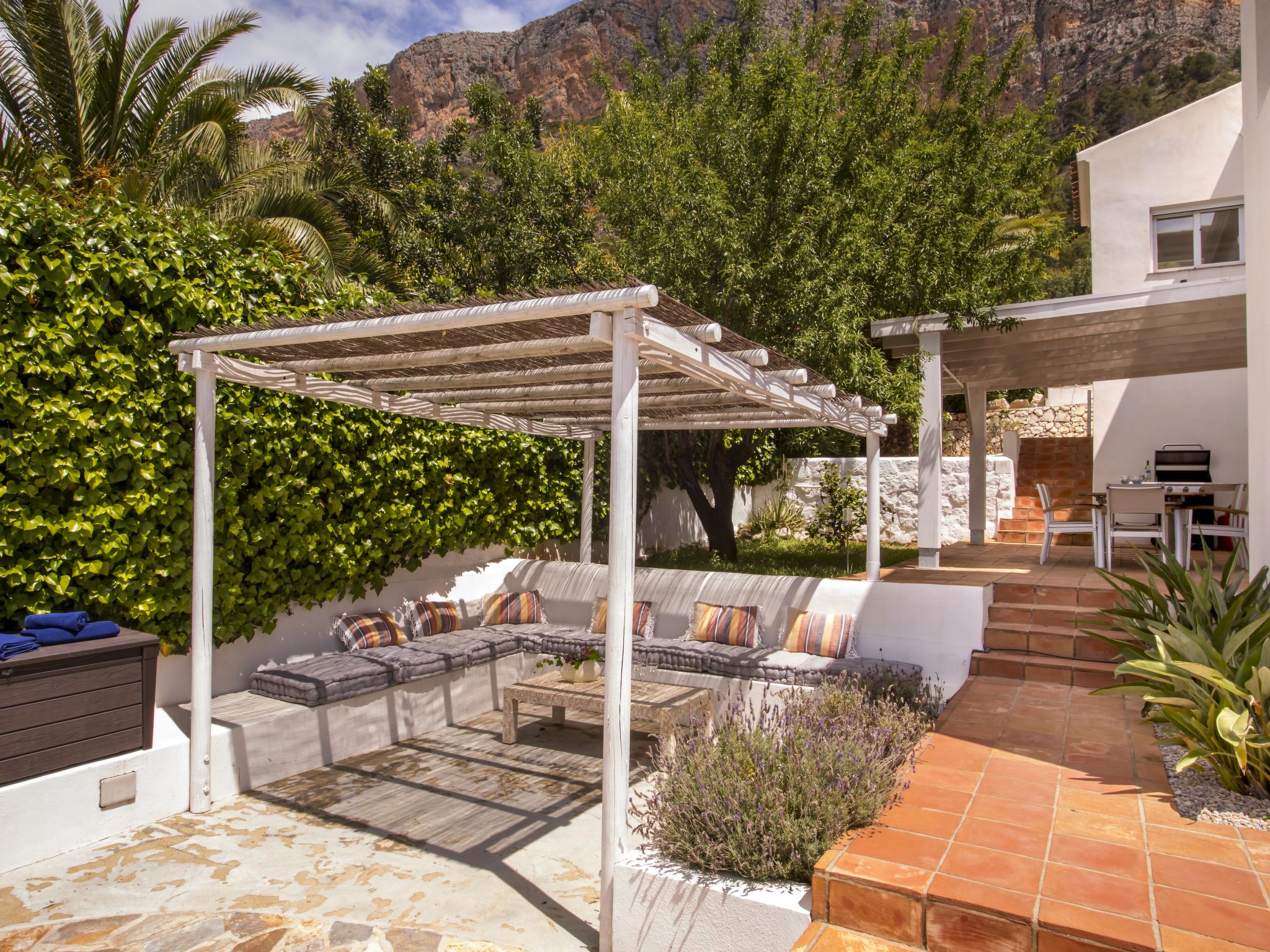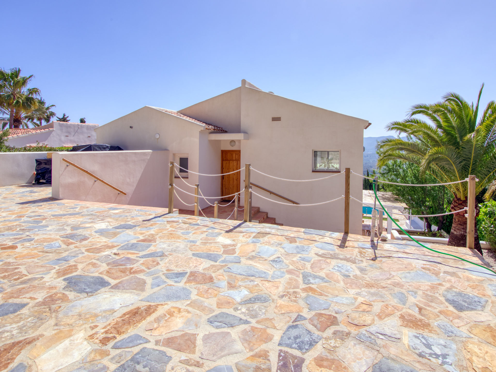 "Villa El Camino", 3-Zimmer-Haus 60 m2, im Erdgeschoss. Wohn-/Esszimmer mit Sat-TV, Digital-TV, Klimaanlage und Warmluftheizung. Ausgang zur Terrasse, zum Schwimmbad. 1 Zimmer mit 1 franz. Bett (160 cm, Länge 200 cm), Dusche/WC, Klimaanlage und Warmluftheizung. 1 Zimmer mit 2 Betten (90 cm, Länge 200 cm), Klimaanlage und Warmluftheizung. Offene Küche (Backofen, Geschirrspüler, 3 Glaskeramikherd Platten, Toaster, Wasserkocher, Mikrowelle, Tiefkühler, elektrische Kaffeemaschine). Dusche/WC. Grosse Terrasse, Südlage. Terrassenmöbel, Gartengrill (4). Herrliche Panoramasicht auf die Berge und das Tal. Zur Verfügung: Waschmaschine, Wäschetrockner, Bügeleisen, Kinderhochstuhl, Babybett, Haartrockner. Internet (Wireless LAN, gratis). Bitte beachten: TV nur DE, ES. VT-487018-A