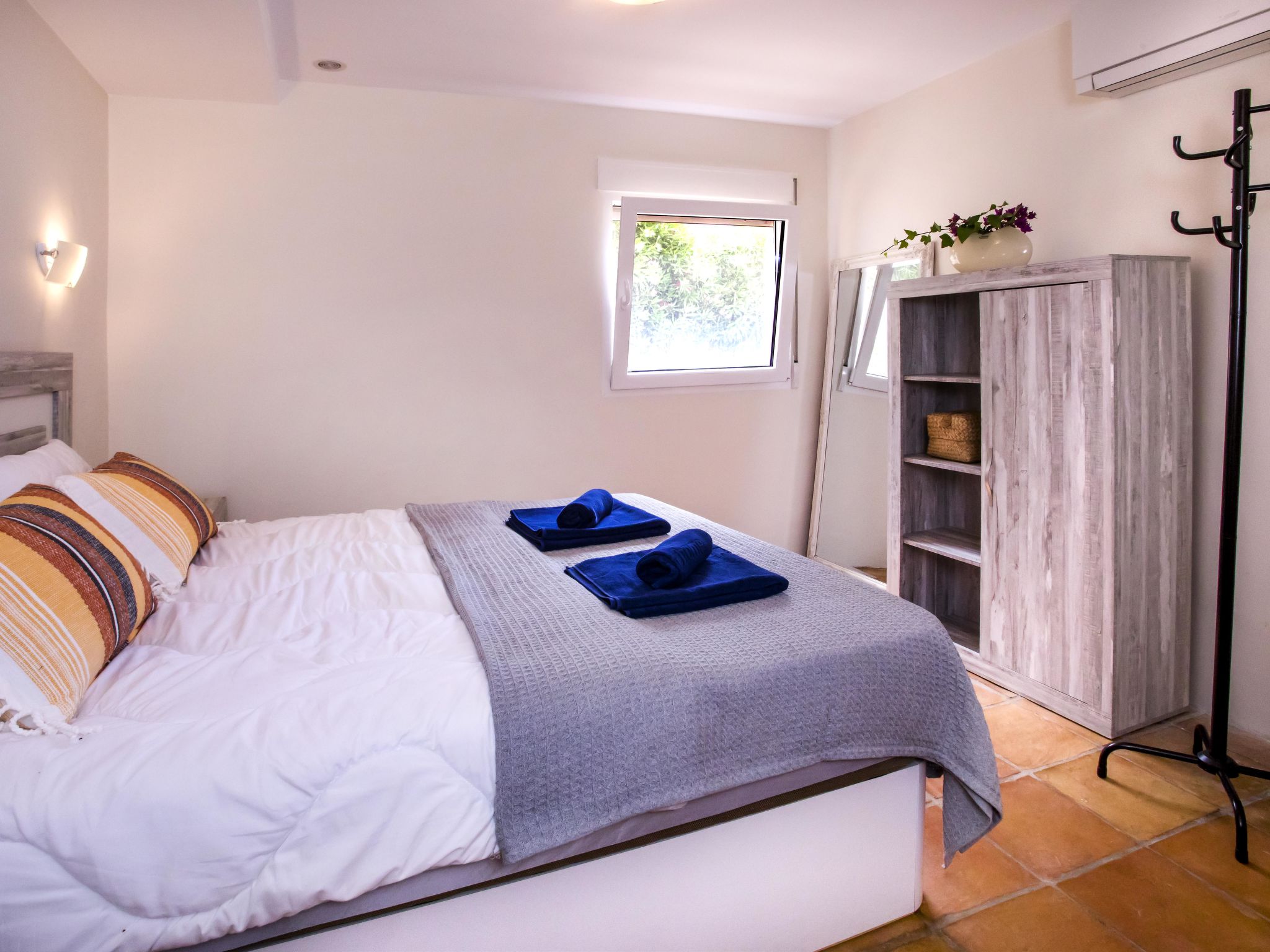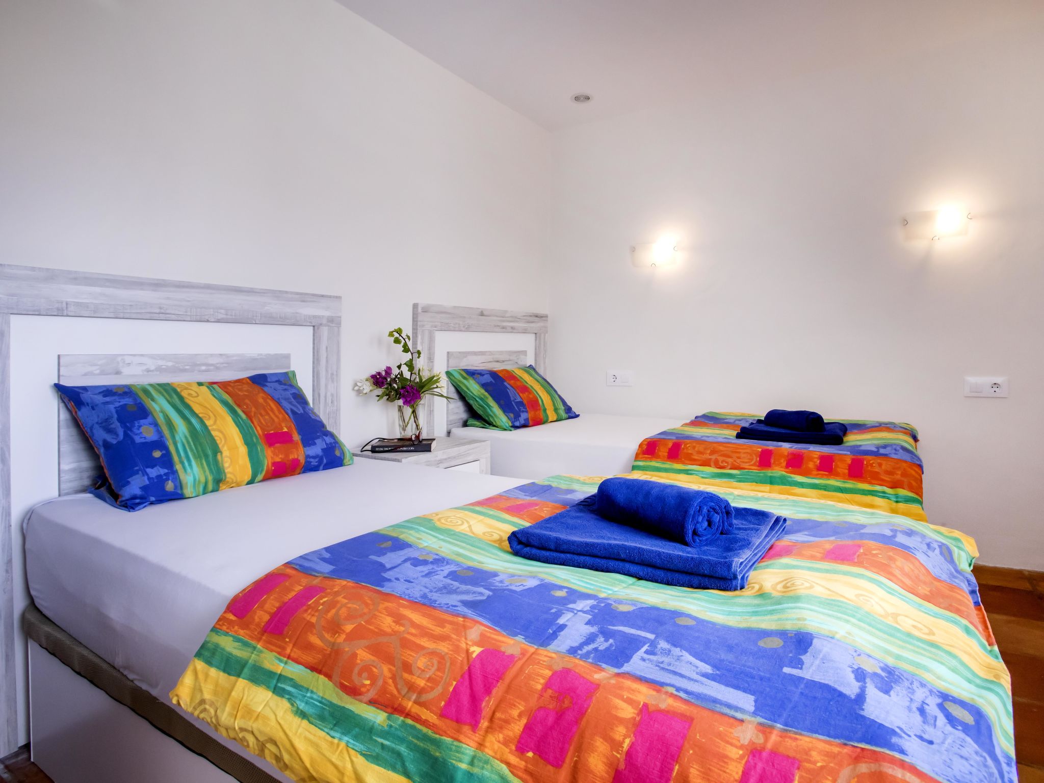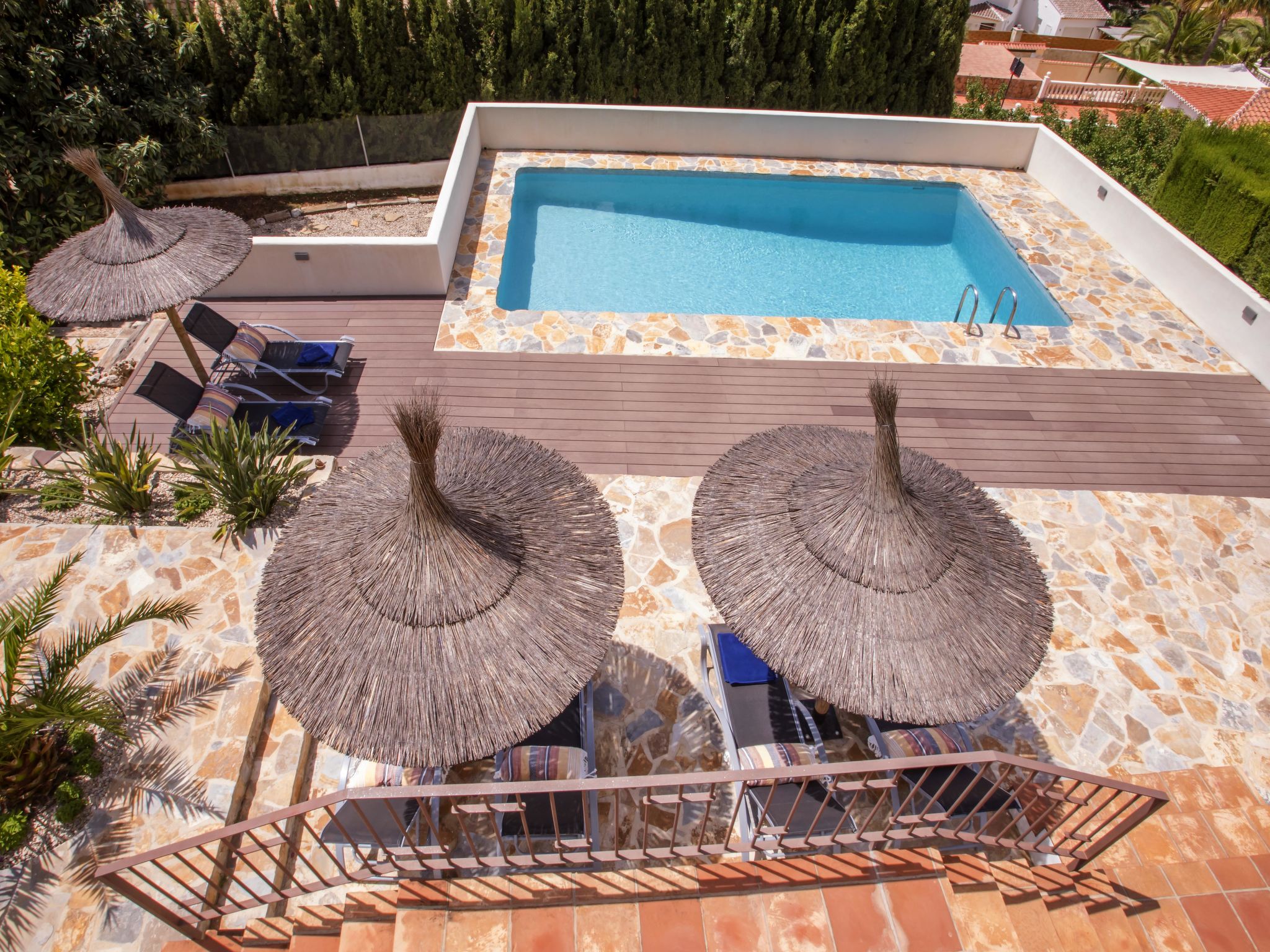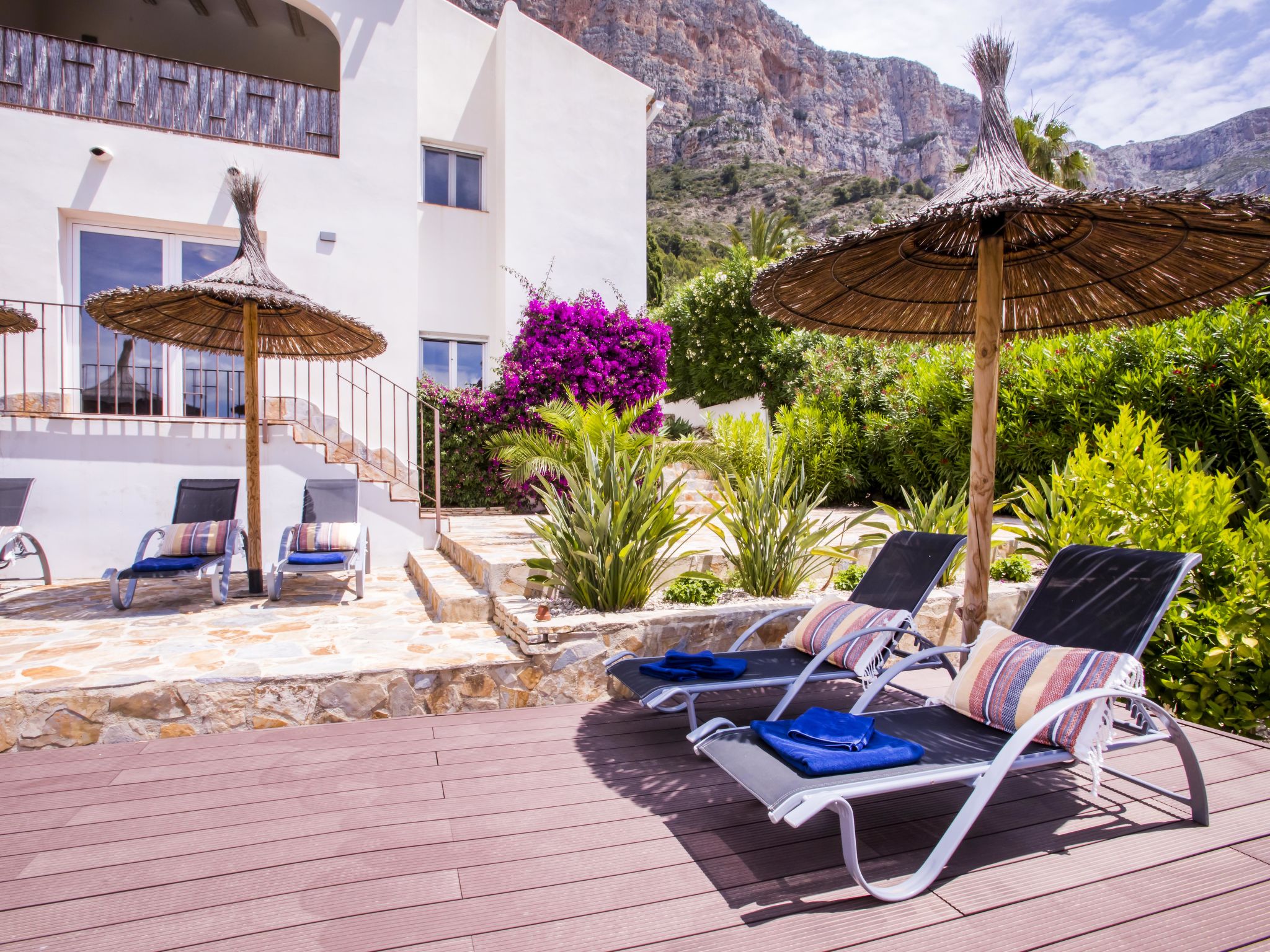 "Villa El Camino", 3-Zimmer-Haus 60 m2, im Erdgeschoss. Wohn-/Esszimmer mit Sat-TV, Digital-TV, Klimaanlage und Warmluftheizung. Ausgang zur Terrasse, zum Schwimmbad. 1 Zimmer mit 1 franz. Bett (160 cm, Länge 200 cm), Dusche/WC, Klimaanlage und Warmluftheizung. 1 Zimmer mit 2 Betten (90 cm, Länge 200 cm), Klimaanlage und Warmluftheizung. Offene Küche (Backofen, Geschirrspüler, 3 Glaskeramikherd Platten, Toaster, Wasserkocher, Mikrowelle, Tiefkühler, elektrische Kaffeemaschine). Dusche/WC. Grosse Terrasse, Südlage. Terrassenmöbel, Gartengrill (4). Herrliche Panoramasicht auf die Berge und das Tal. Zur Verfügung: Waschmaschine, Wäschetrockner, Bügeleisen, Kinderhochstuhl, Babybett, Haartrockner. Internet (Wireless LAN, gratis). Bitte beachten: TV nur DE, ES. VT-487018-A
